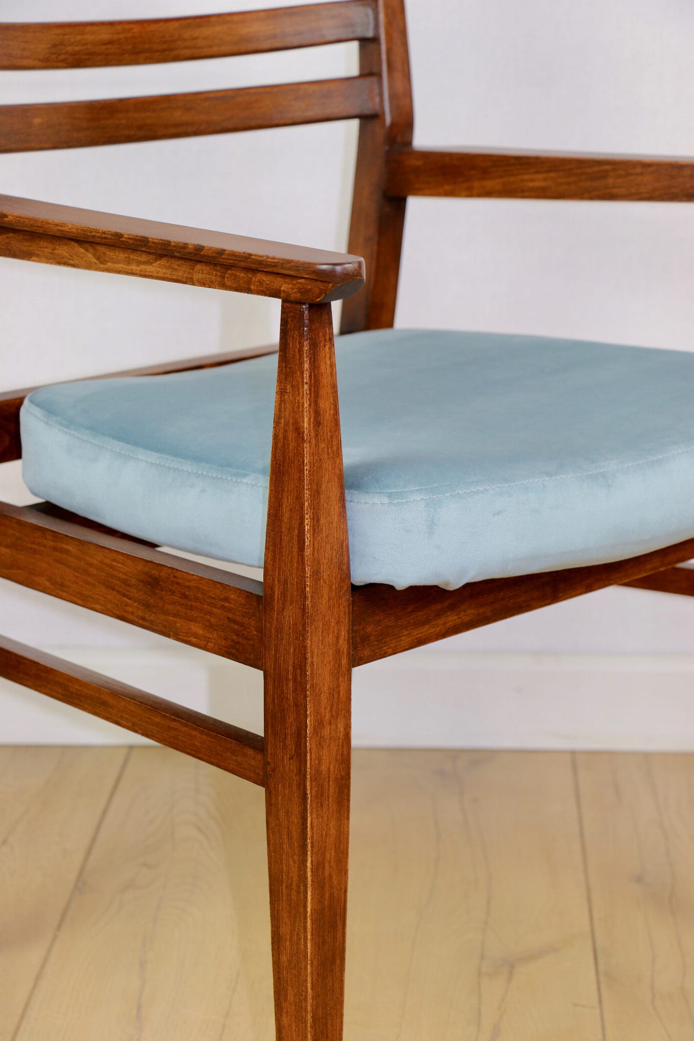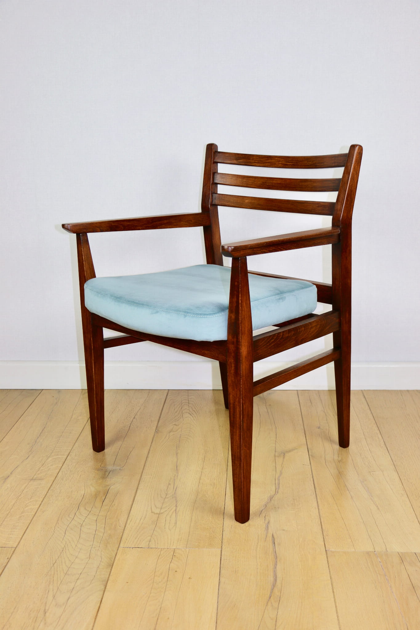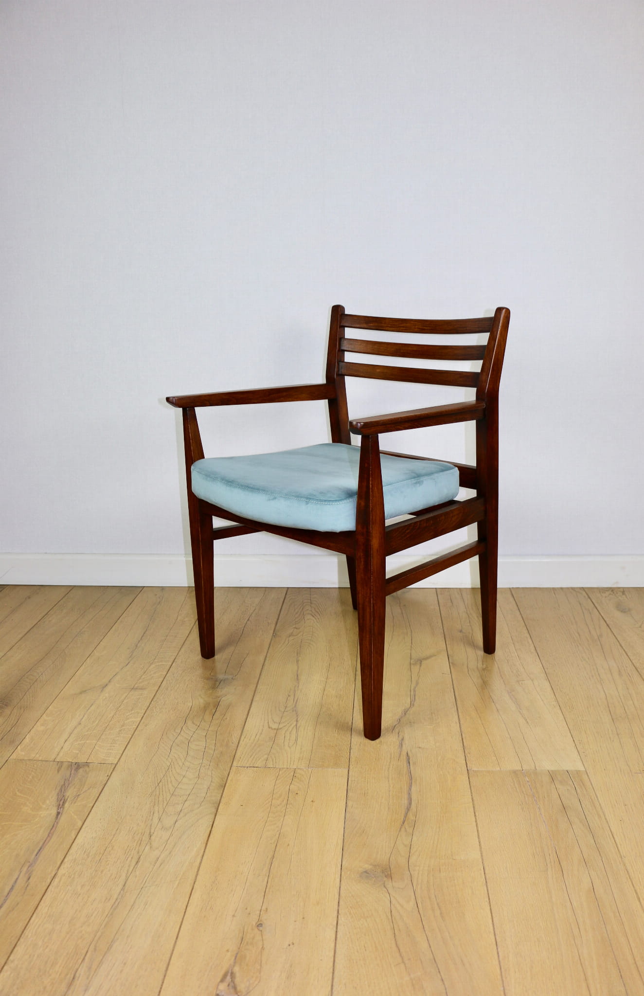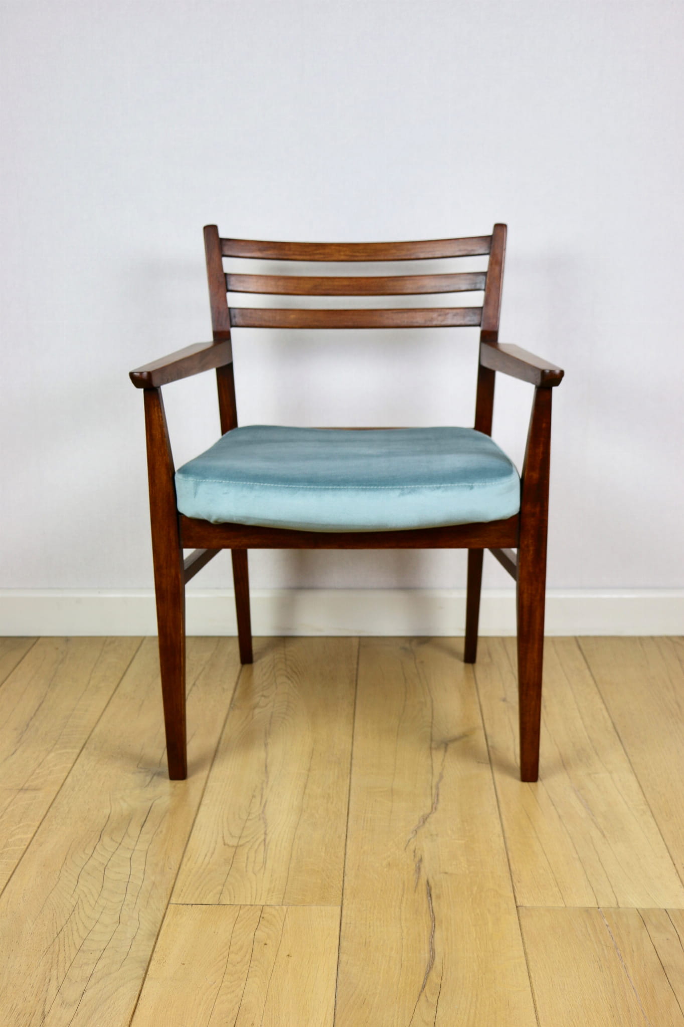 Fotel gabinetowy z lat 70 tych. Całkowicie odrestaurowany stelarz drewniany oraz siedzisko w którym wymieniono piankę oraz tkaninę tapicerską. Fotel posiada nowe obicie siedziska pokryte najwyższej jakości materiałem tapicerskim typu welwet w niebiesko turkusowym kolorze. Stelaż z drewna bukowego połączony jest z podłokietnikami w ciemnej kolorystyce drewna - kolor orzechowy.
