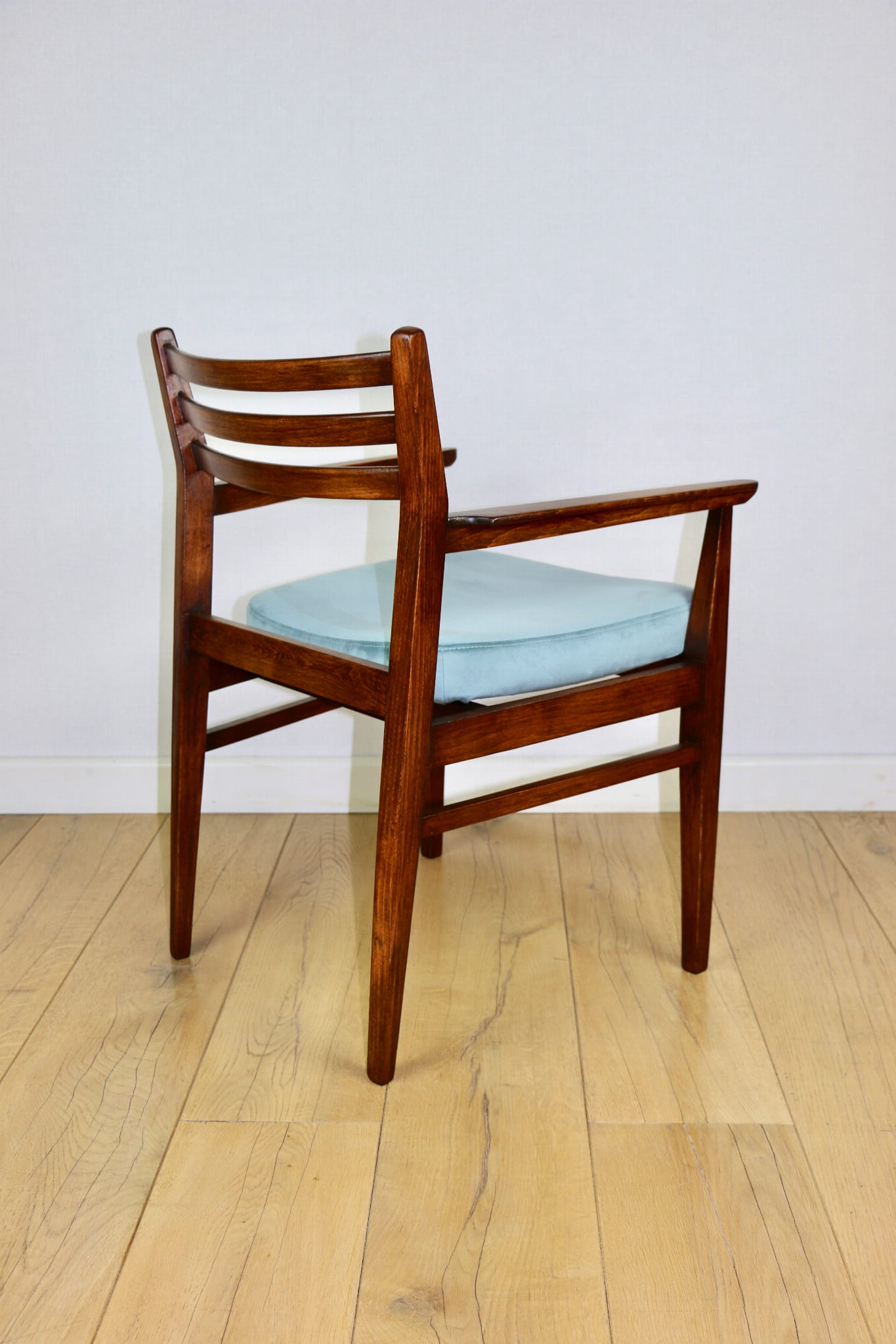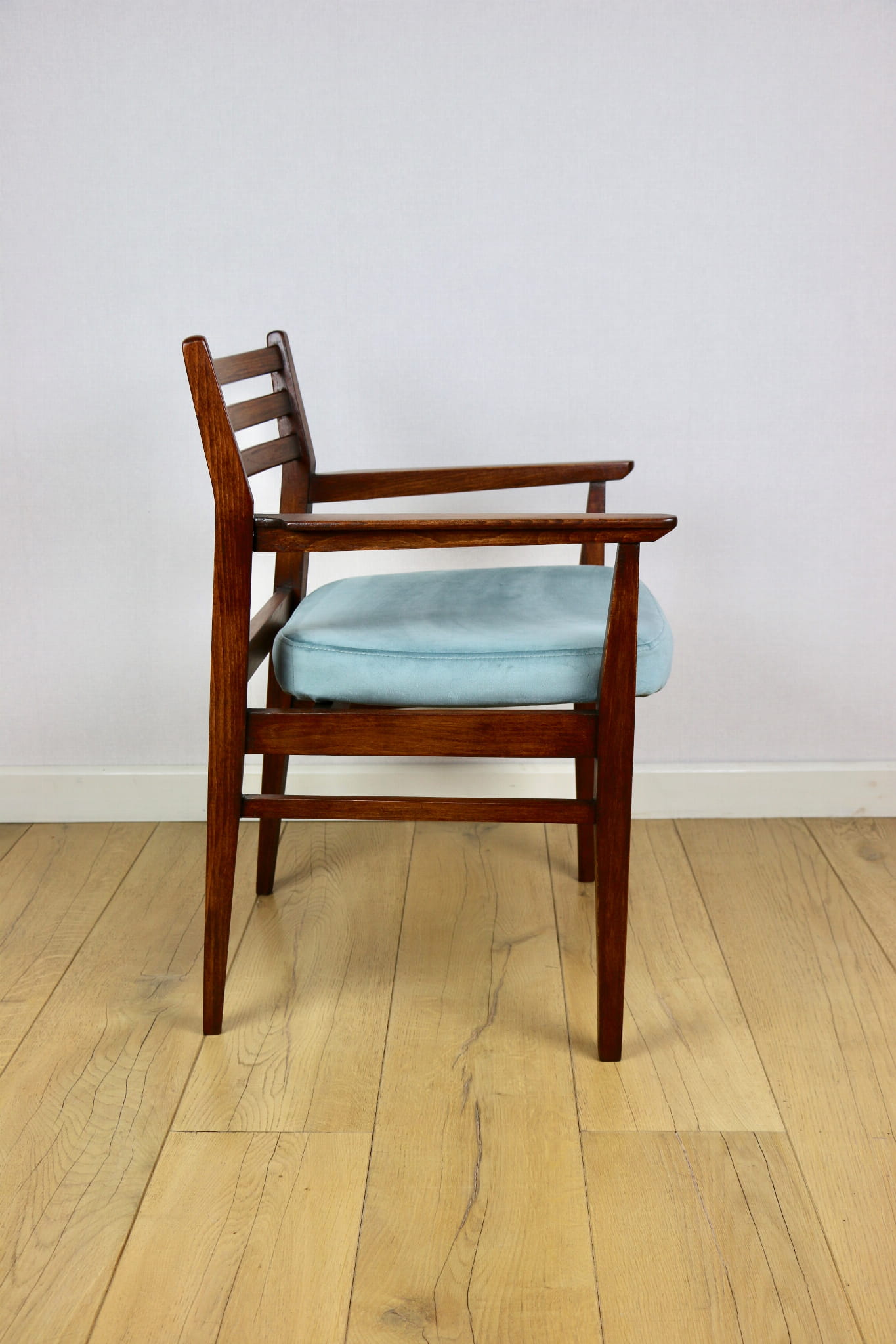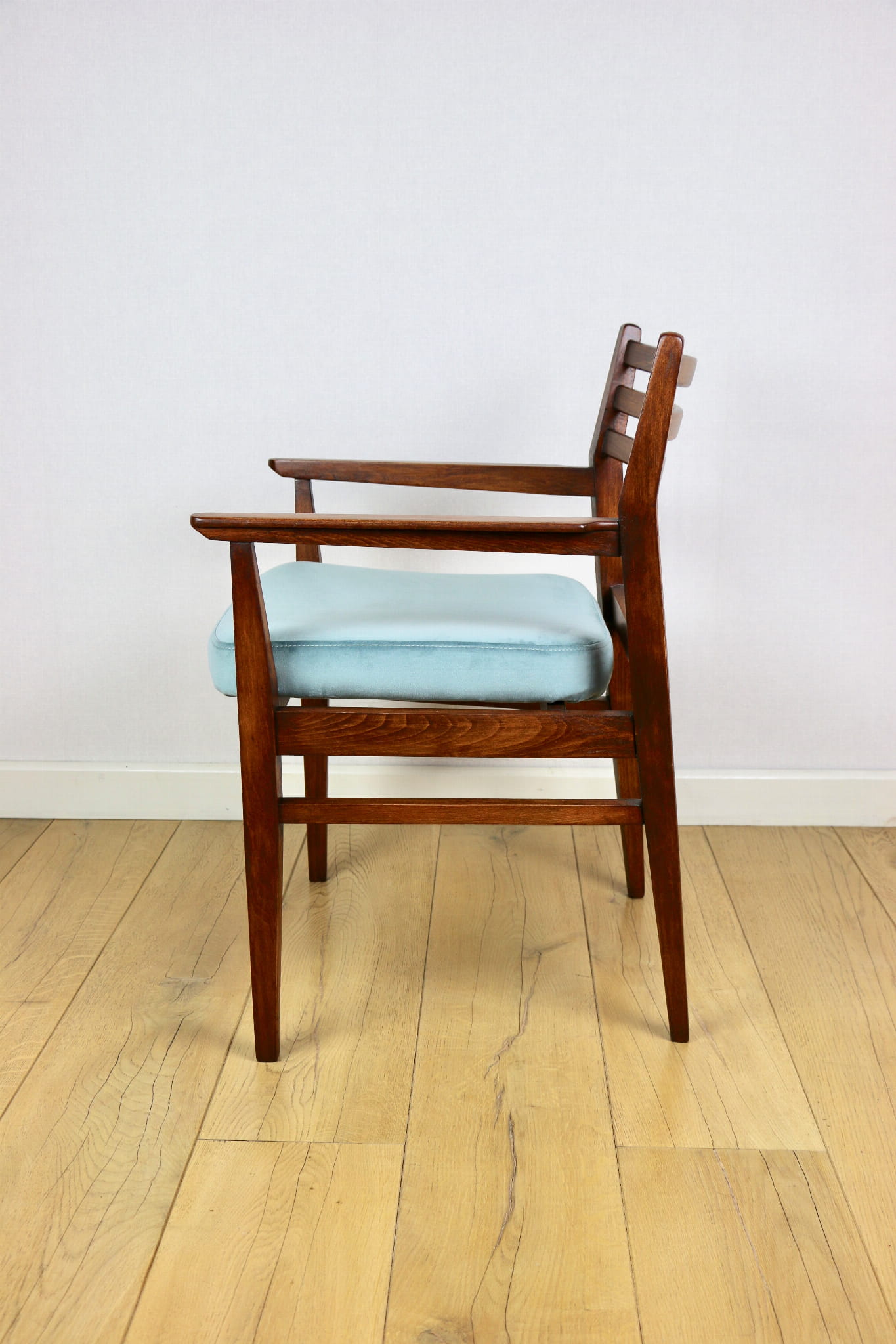 Fotel gabinetowy z lat 70 tych. Całkowicie odrestaurowany stelarz drewniany oraz siedzisko w którym wymieniono piankę oraz tkaninę tapicerską. Fotel posiada nowe obicie siedziska pokryte najwyższej jakości materiałem tapicerskim typu welwet w niebiesko turkusowym kolorze. Stelaż z drewna bukowego połączony jest z podłokietnikami w ciemnej kolorystyce drewna - kolor orzechowy.