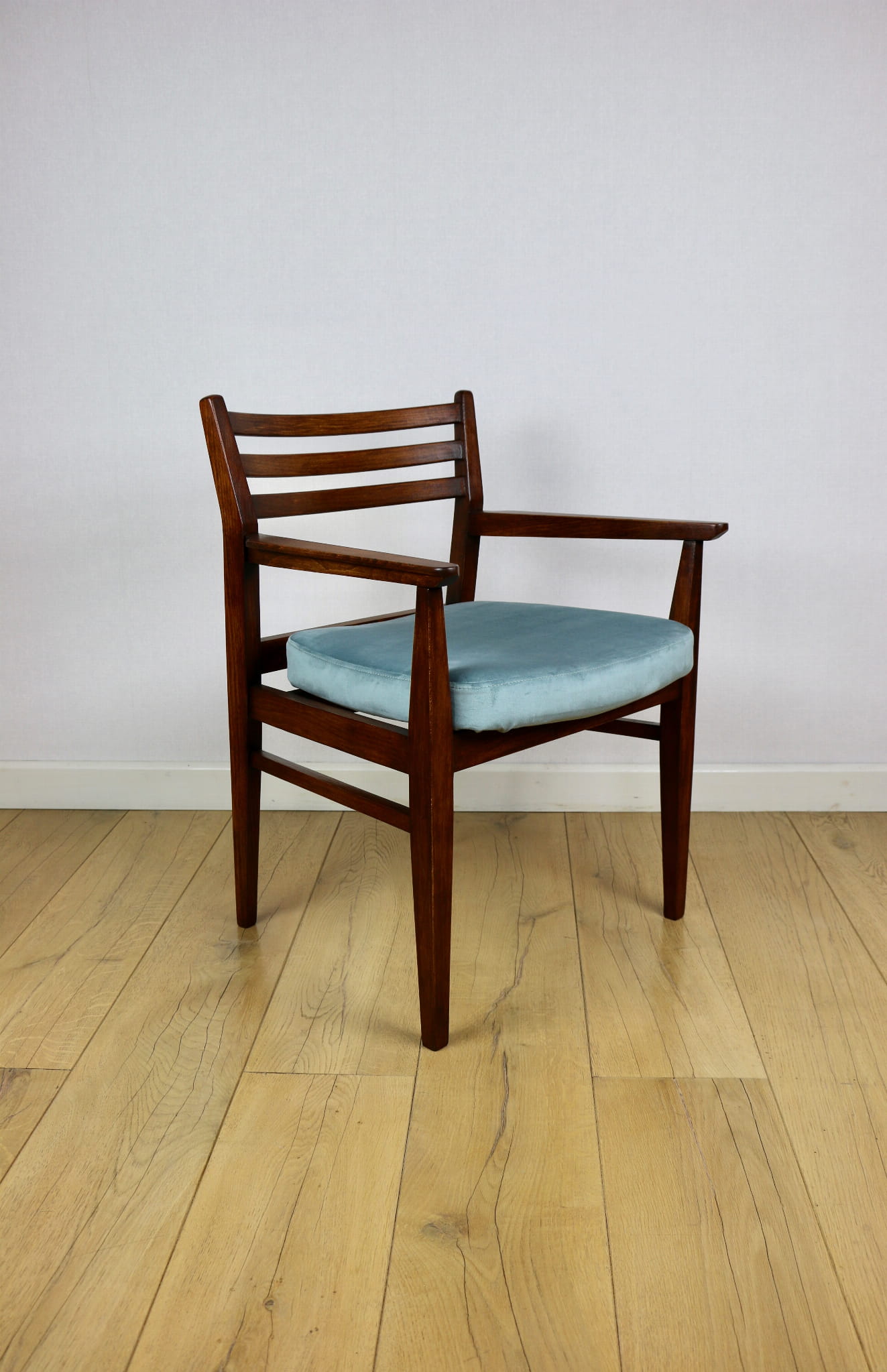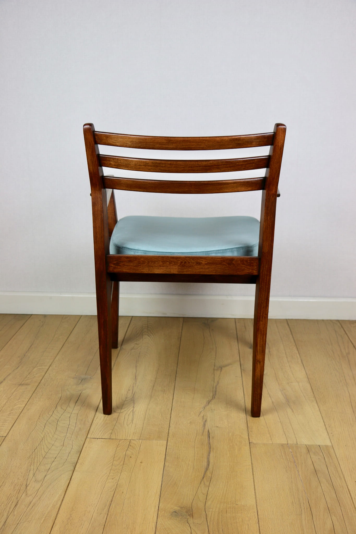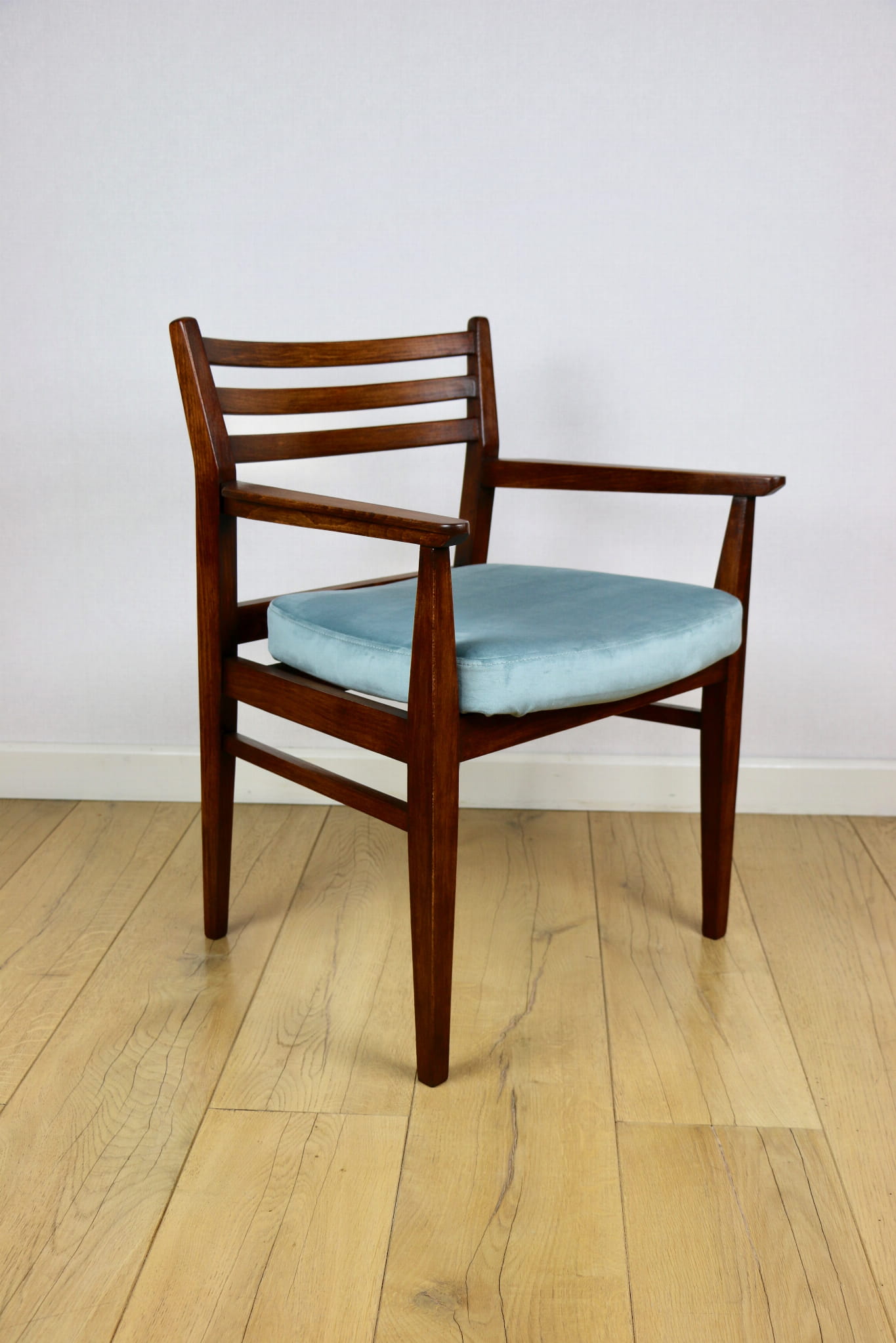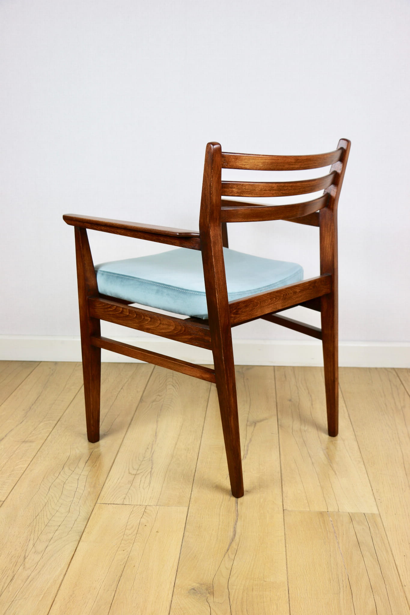 Fotel gabinetowy z lat 70 tych. Całkowicie odrestaurowany stelarz drewniany oraz siedzisko w którym wymieniono piankę oraz tkaninę tapicerską. Fotel posiada nowe obicie siedziska pokryte najwyższej jakości materiałem tapicerskim typu welwet w niebiesko turkusowym kolorze. Stelaż z drewna bukowego połączony jest z podłokietnikami w ciemnej kolorystyce drewna - kolor orzechowy.