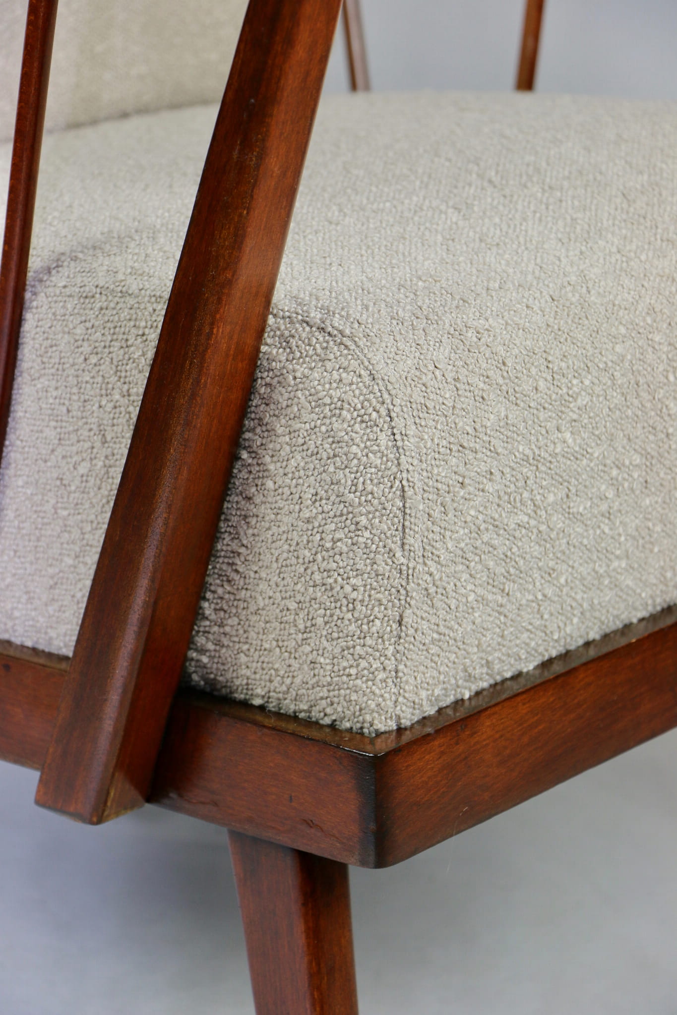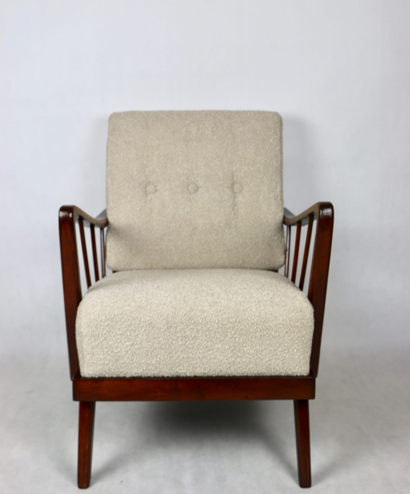 Fotel został całkowicie odrestaurowany – otrzymał nowe wypełnienie siedziska i oparcia, które zapewniają wyjątkowy komfort użytkowania. Całość pokryto modną i przyjemną w dotyku tkaniną Bouclé, cenioną za swoją miękkość i stylowy wygląd.