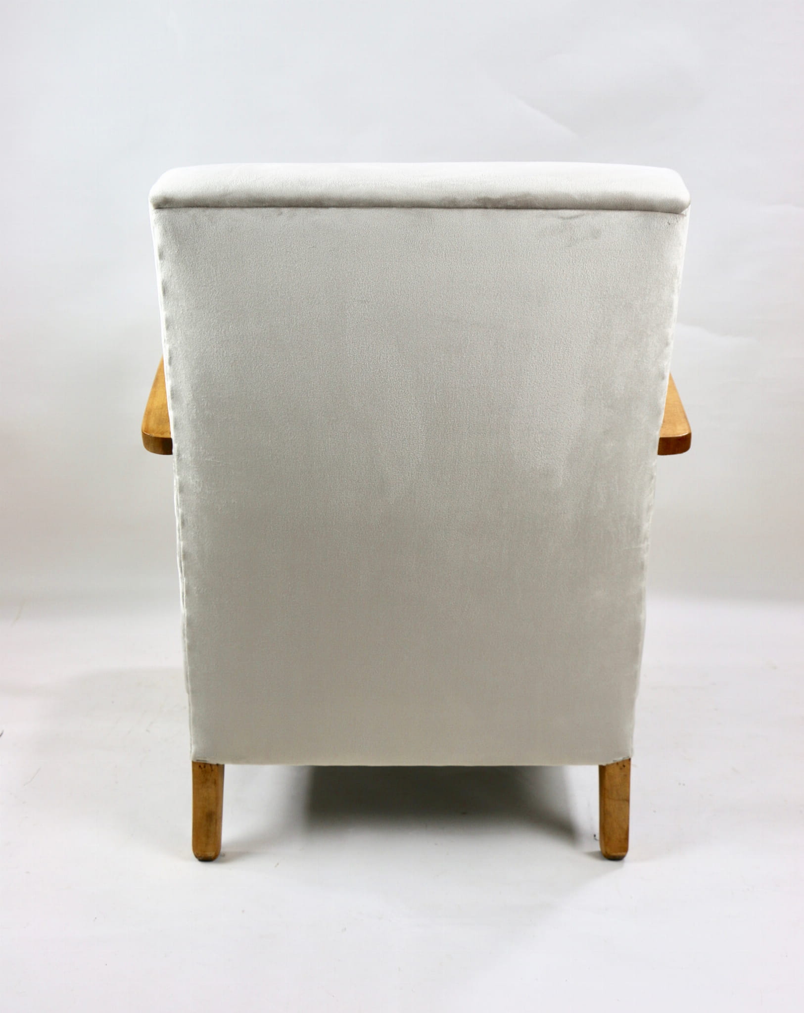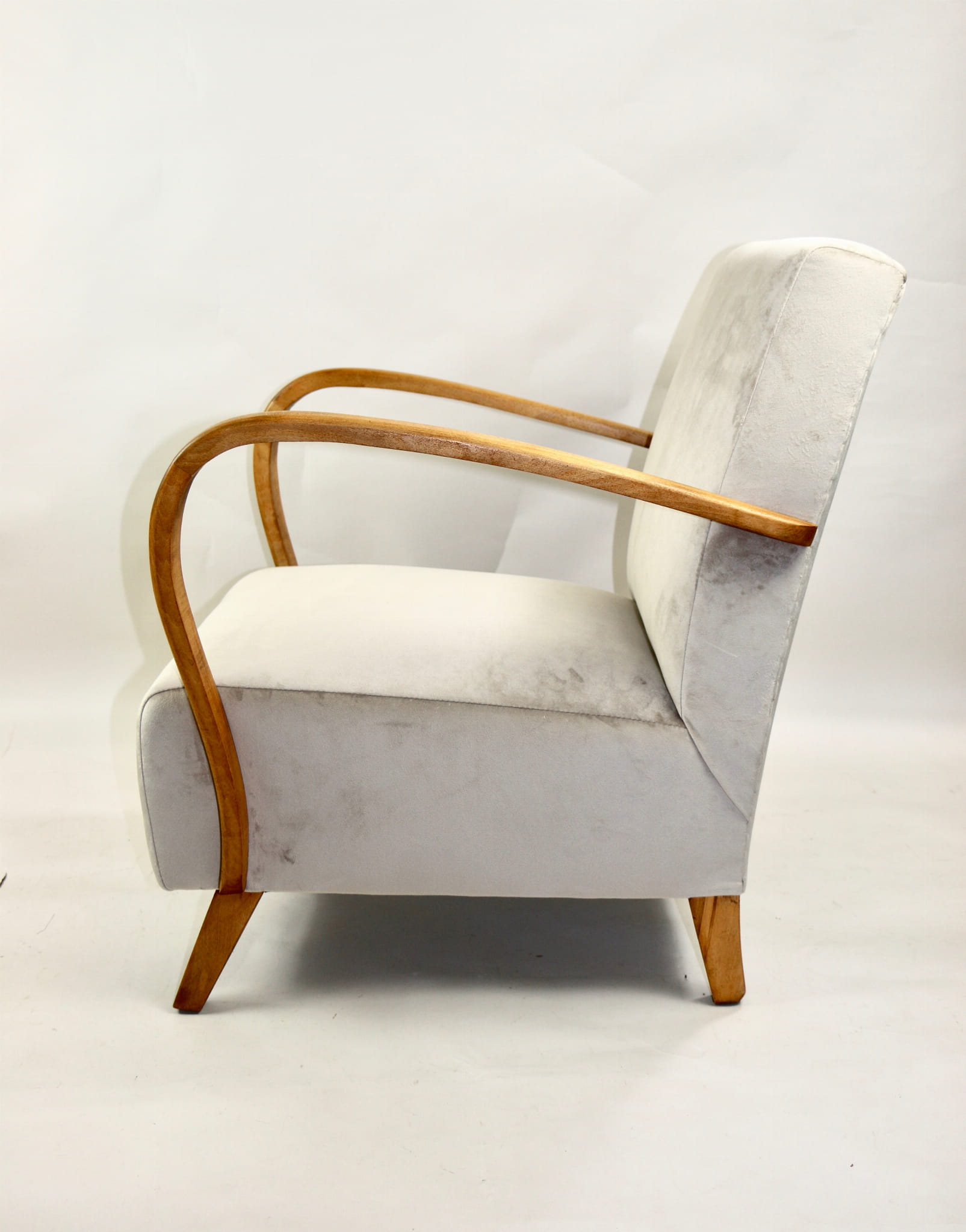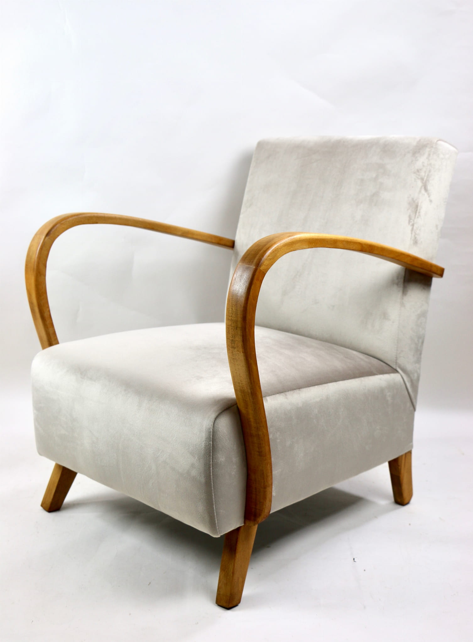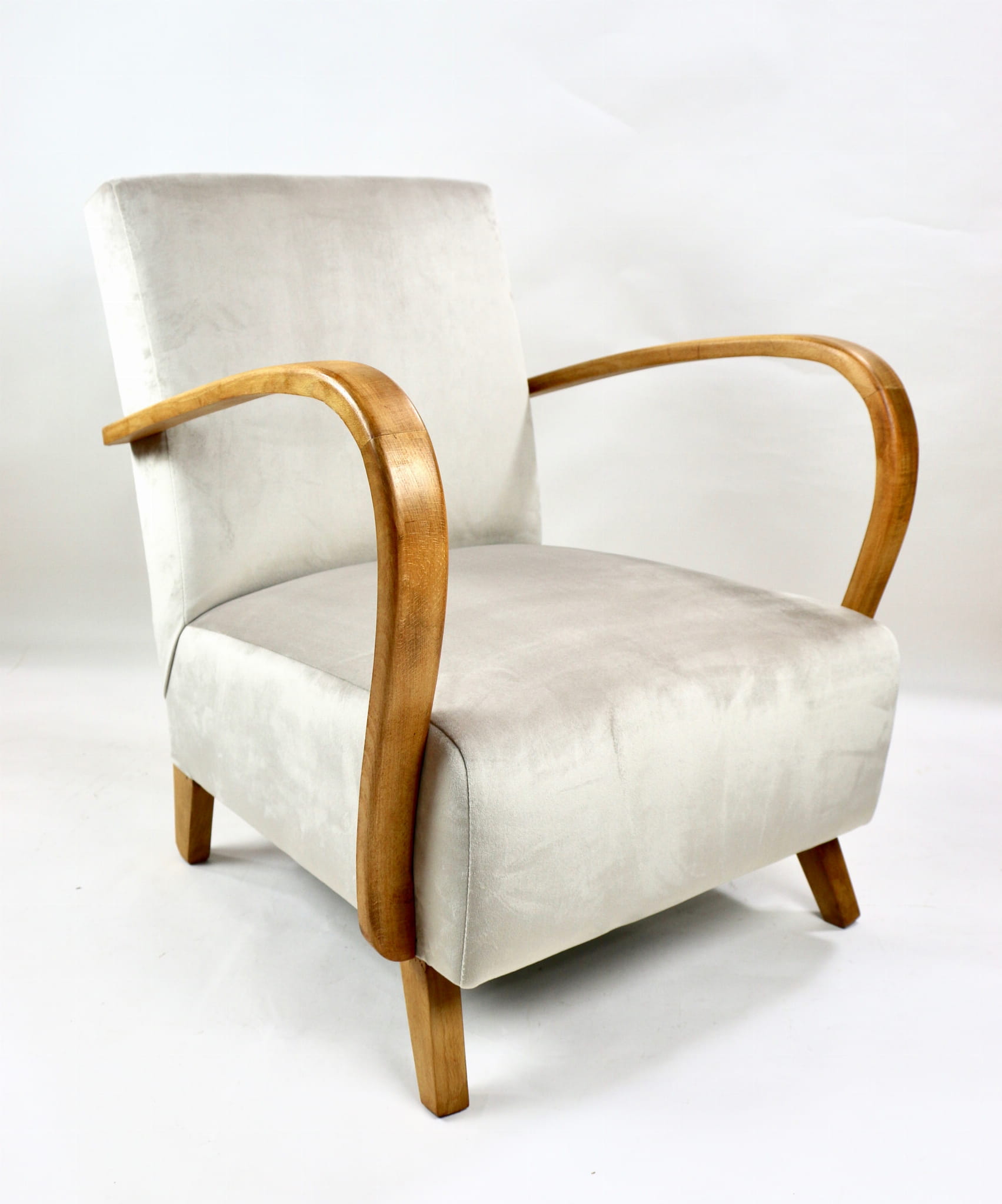 Przepiękny fotel w stylu Art. Deco., kompletnie odrestaurowany. Nowa tapicerka wraz z wypełnieniem. Oparcie wraz siedziskiem pokryte aksamitnym materiałem w kolorze beżowym . Siedzisko na sprężynach. Podparcia i nóżki drewniane w naturalnym kolorze drewna - zostały pokryte woskiem.