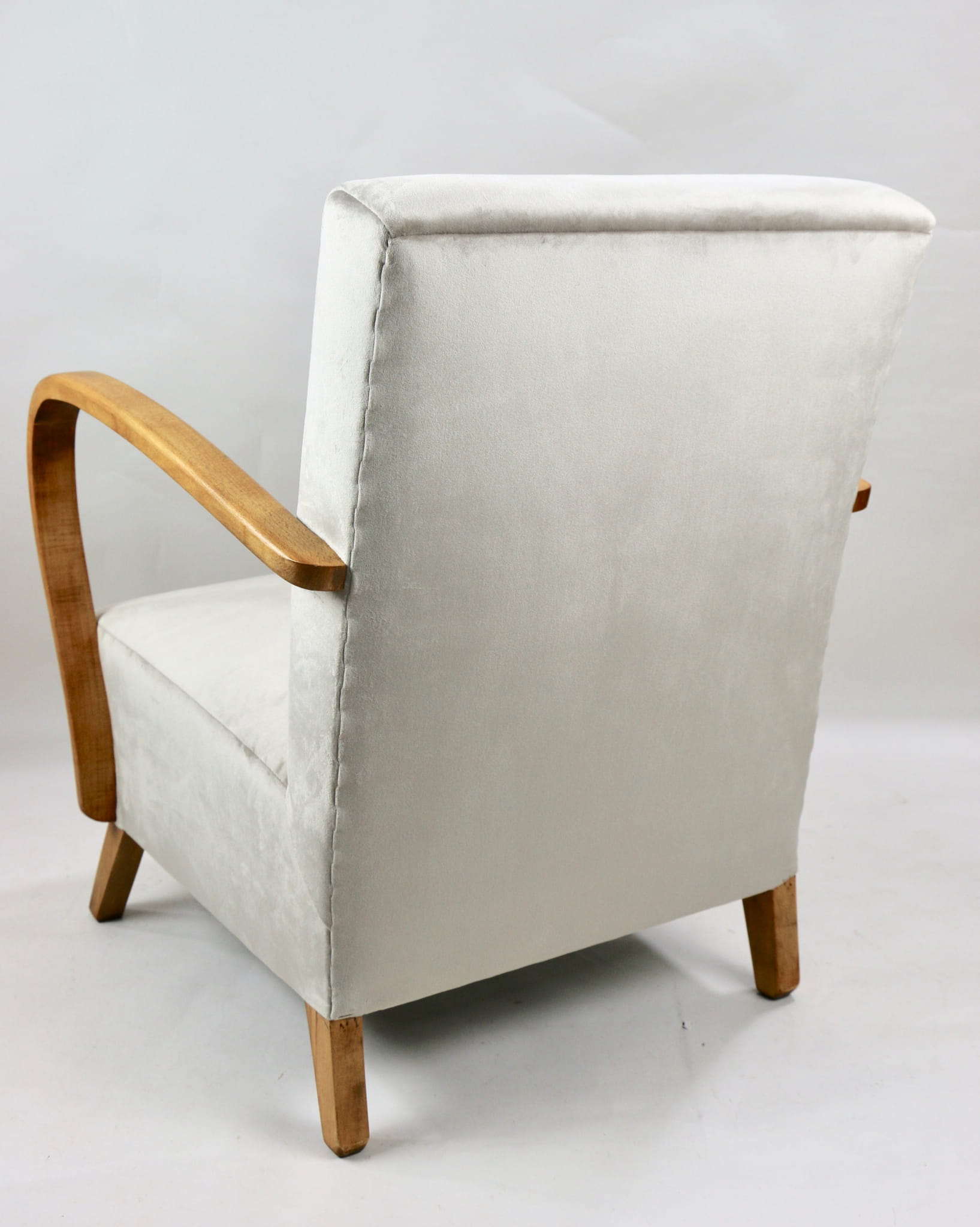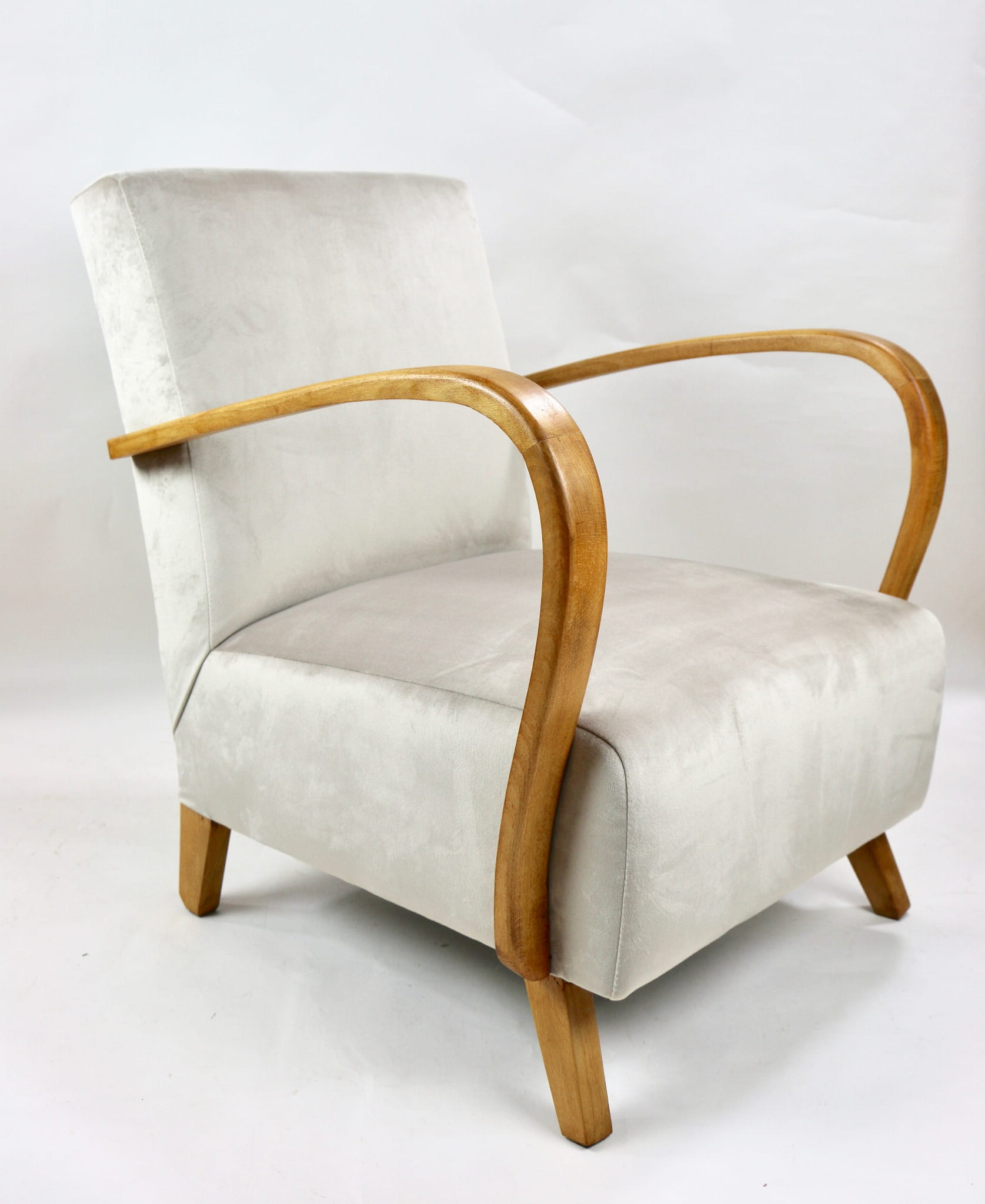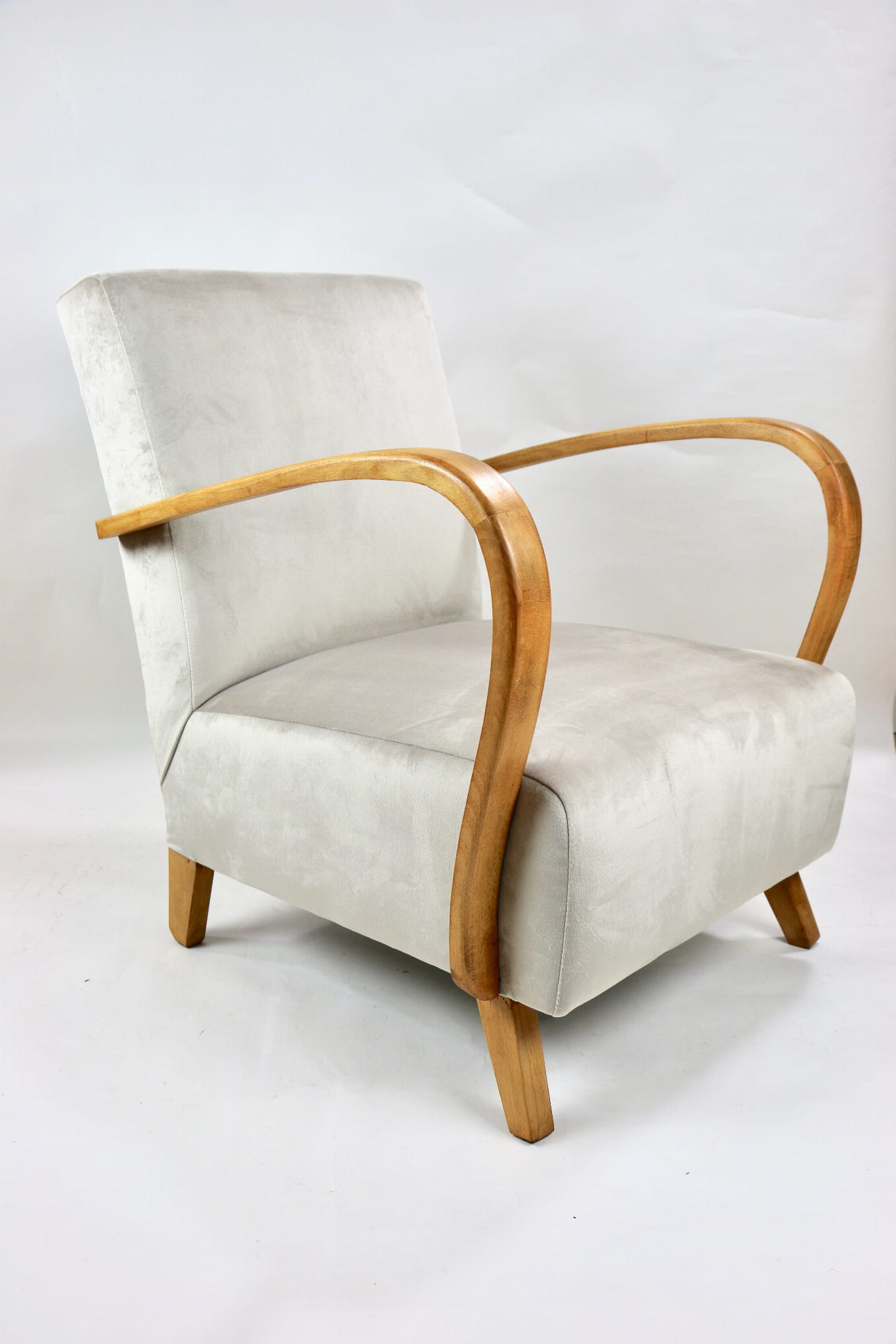 Przepiękny fotel w stylu Art. Deco., kompletnie odrestaurowany. Nowa tapicerka wraz z wypełnieniem. Oparcie wraz siedziskiem pokryte aksamitnym materiałem w kolorze beżowym . Siedzisko na sprężynach. Podparcia i nóżki drewniane w naturalnym kolorze drewna - zostały pokryte woskiem.