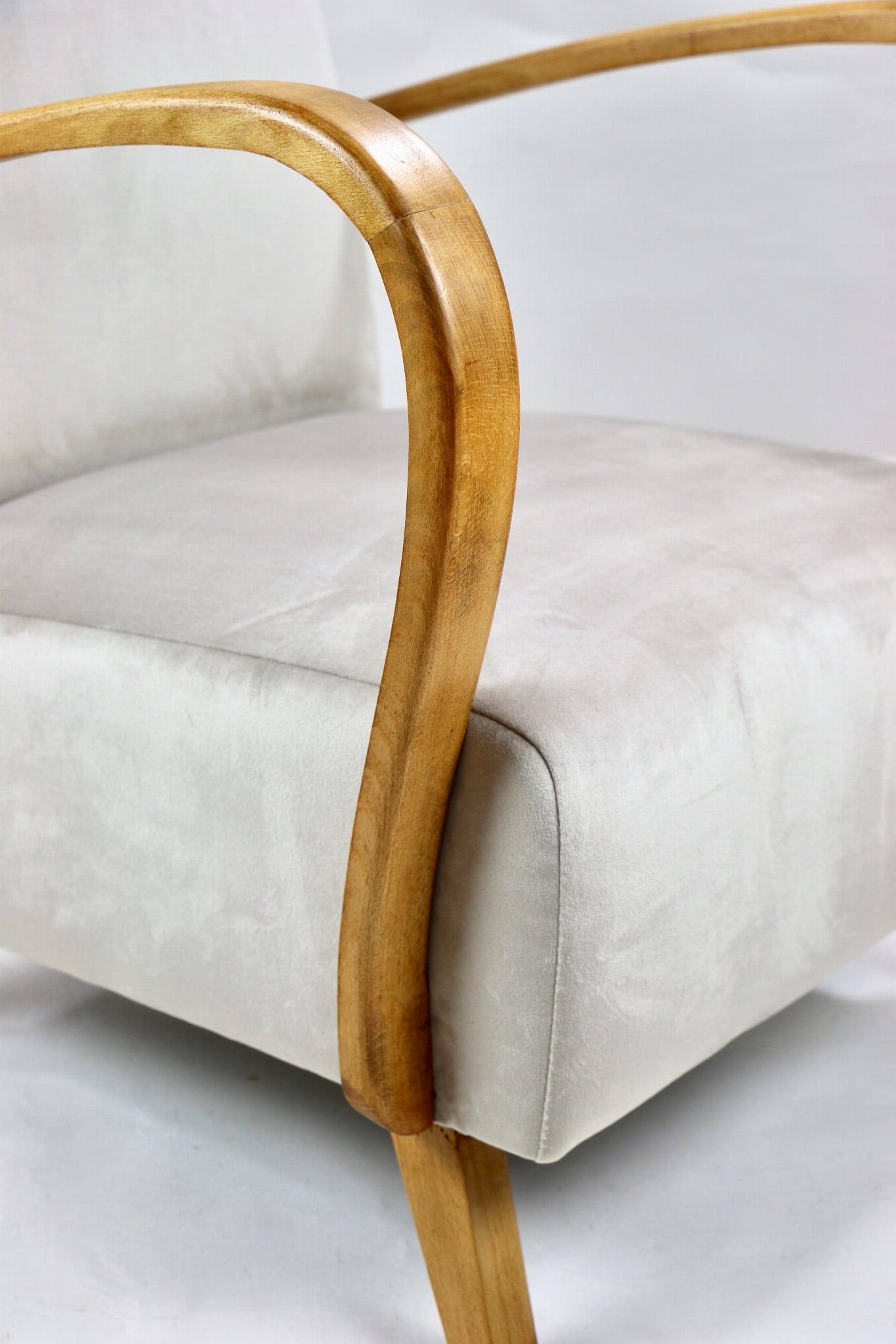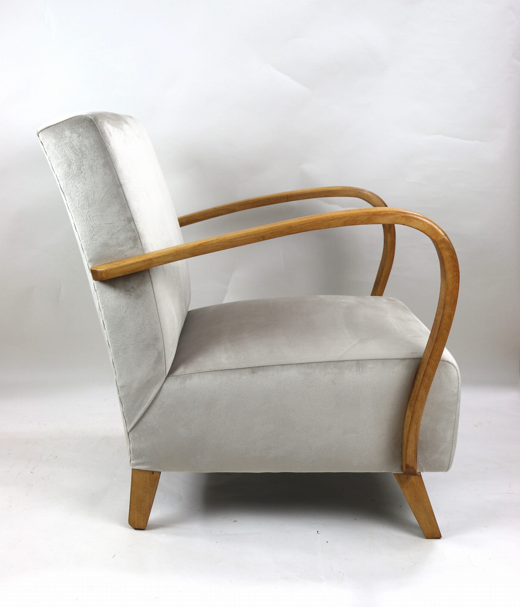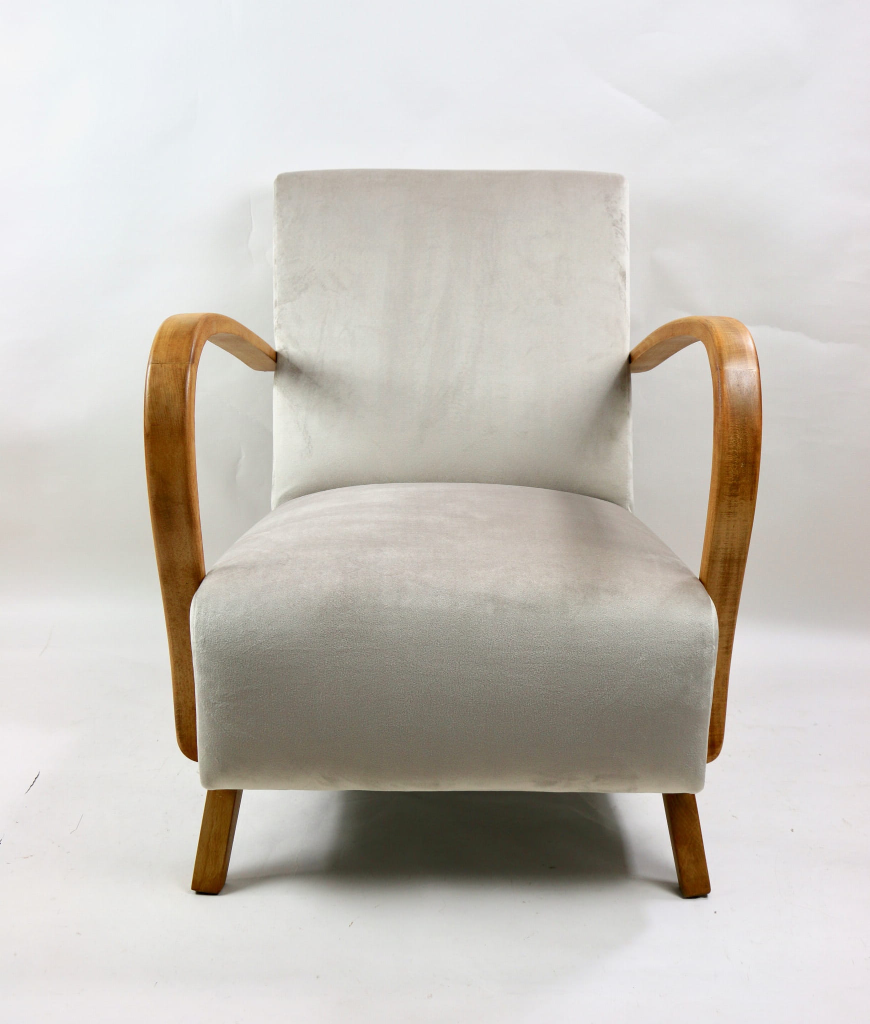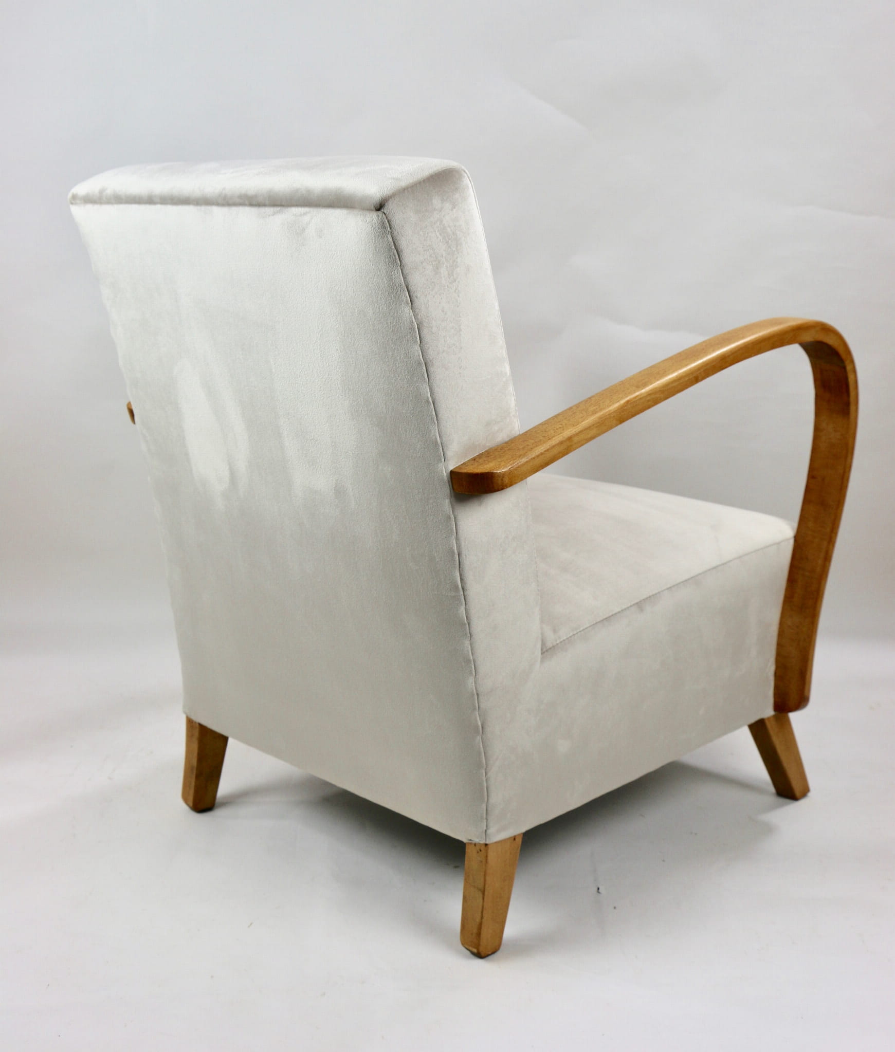 Przepiękny fotel w stylu Art. Deco., kompletnie odrestaurowany. Nowa tapicerka wraz z wypełnieniem. Oparcie wraz siedziskiem pokryte aksamitnym materiałem w kolorze beżowym . Siedzisko na sprężynach. Podparcia i nóżki drewniane w naturalnym kolorze drewna - zostały pokryte woskiem.