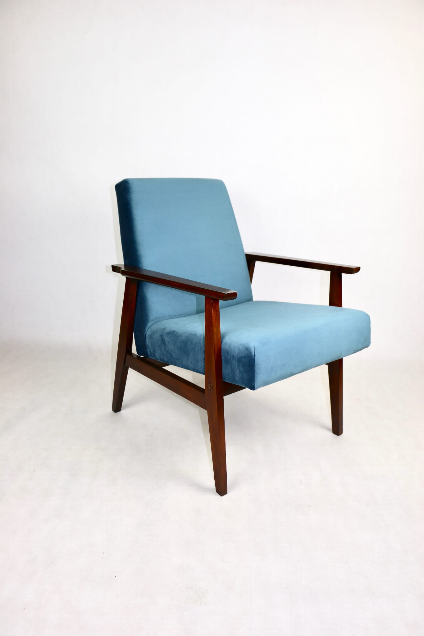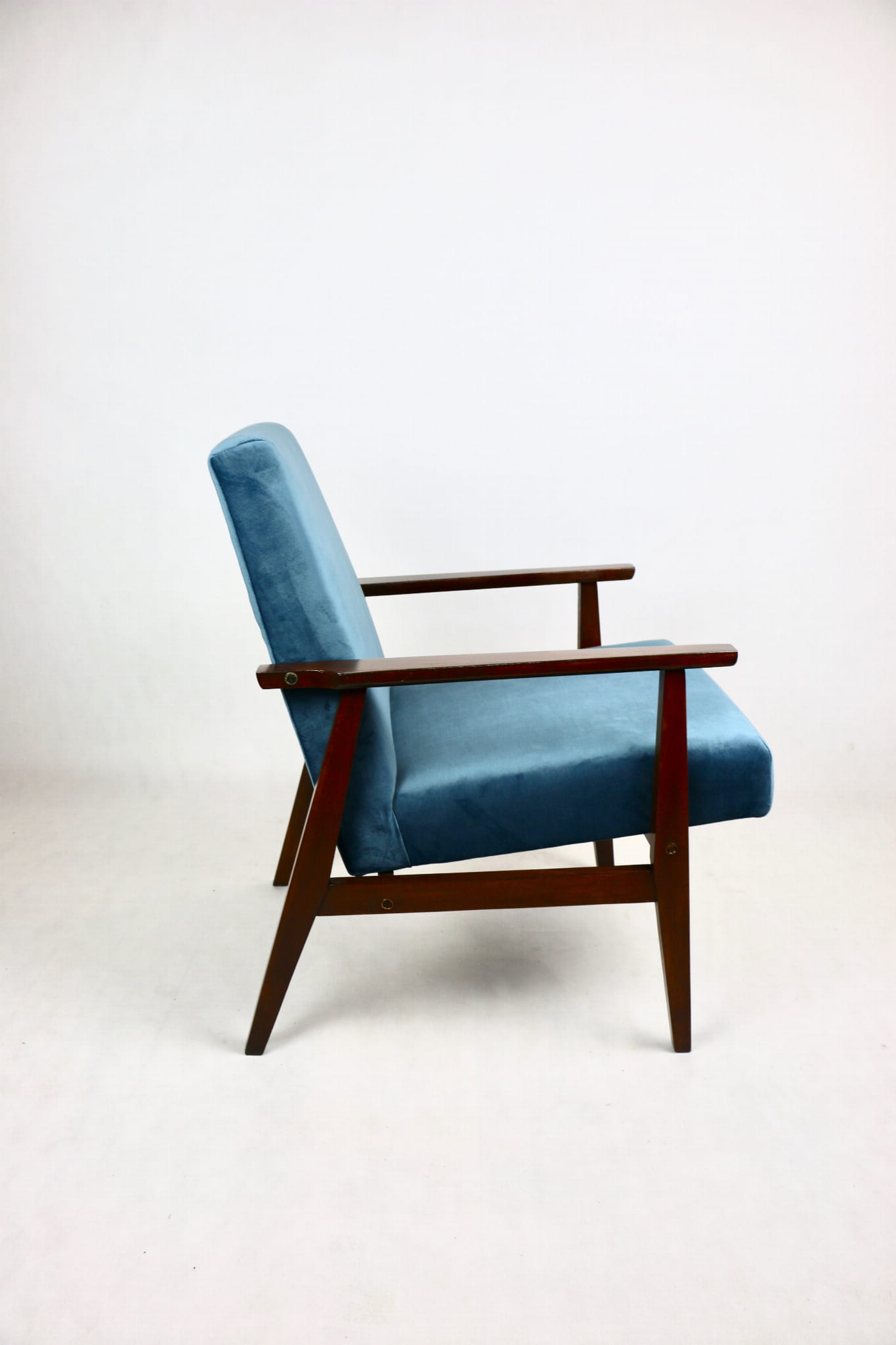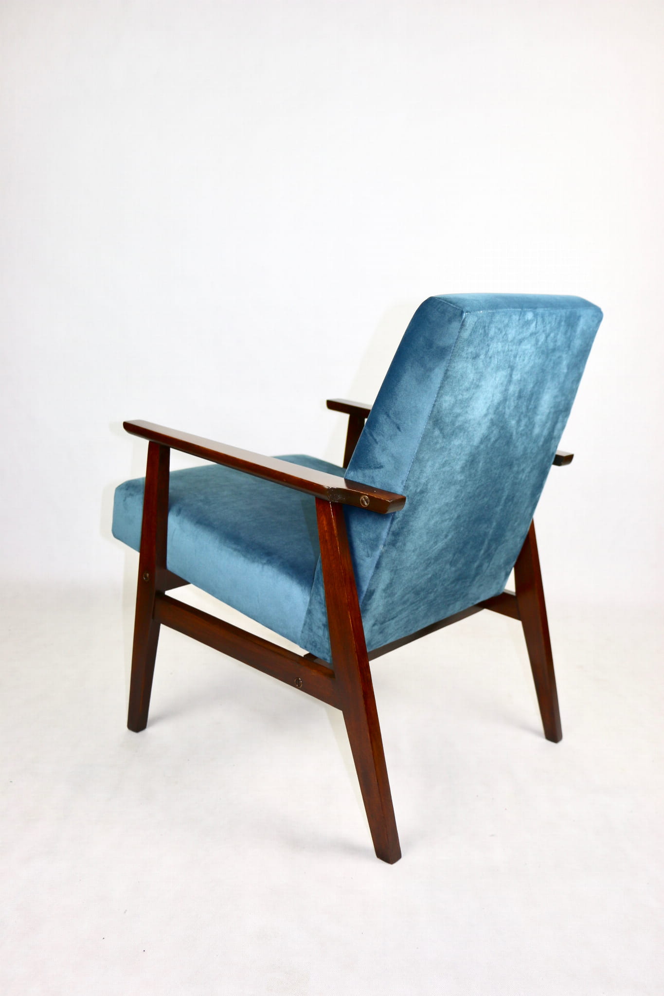 Odrestaurowany fotel Henryka Lis-a z roku 1970, nowe welwetowe obicie w tkaninie w kolorze niebieskim z serii Paris. Stelaż drewniany połączony z podłokietnikami w ciemnej kolorystyce drewna.