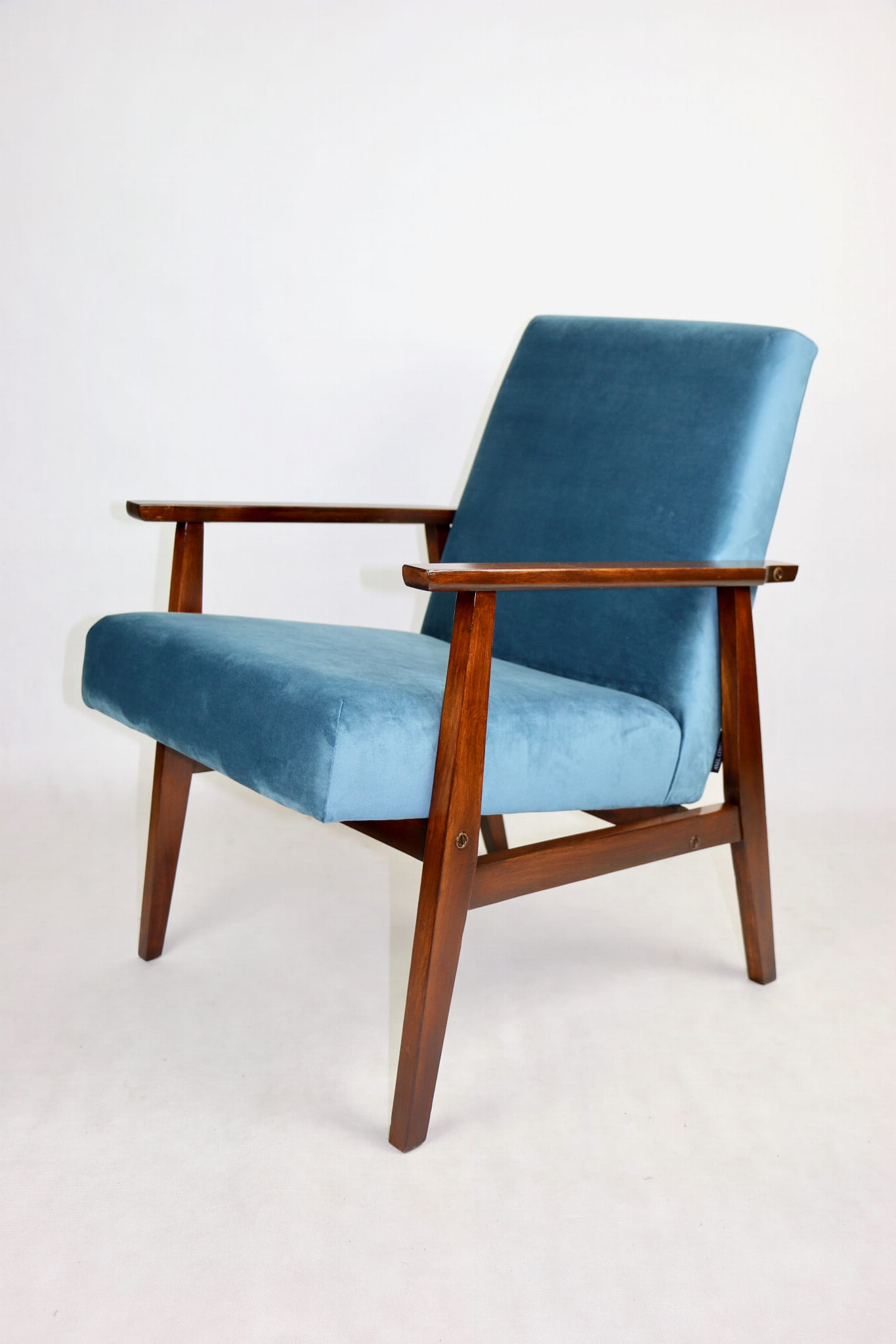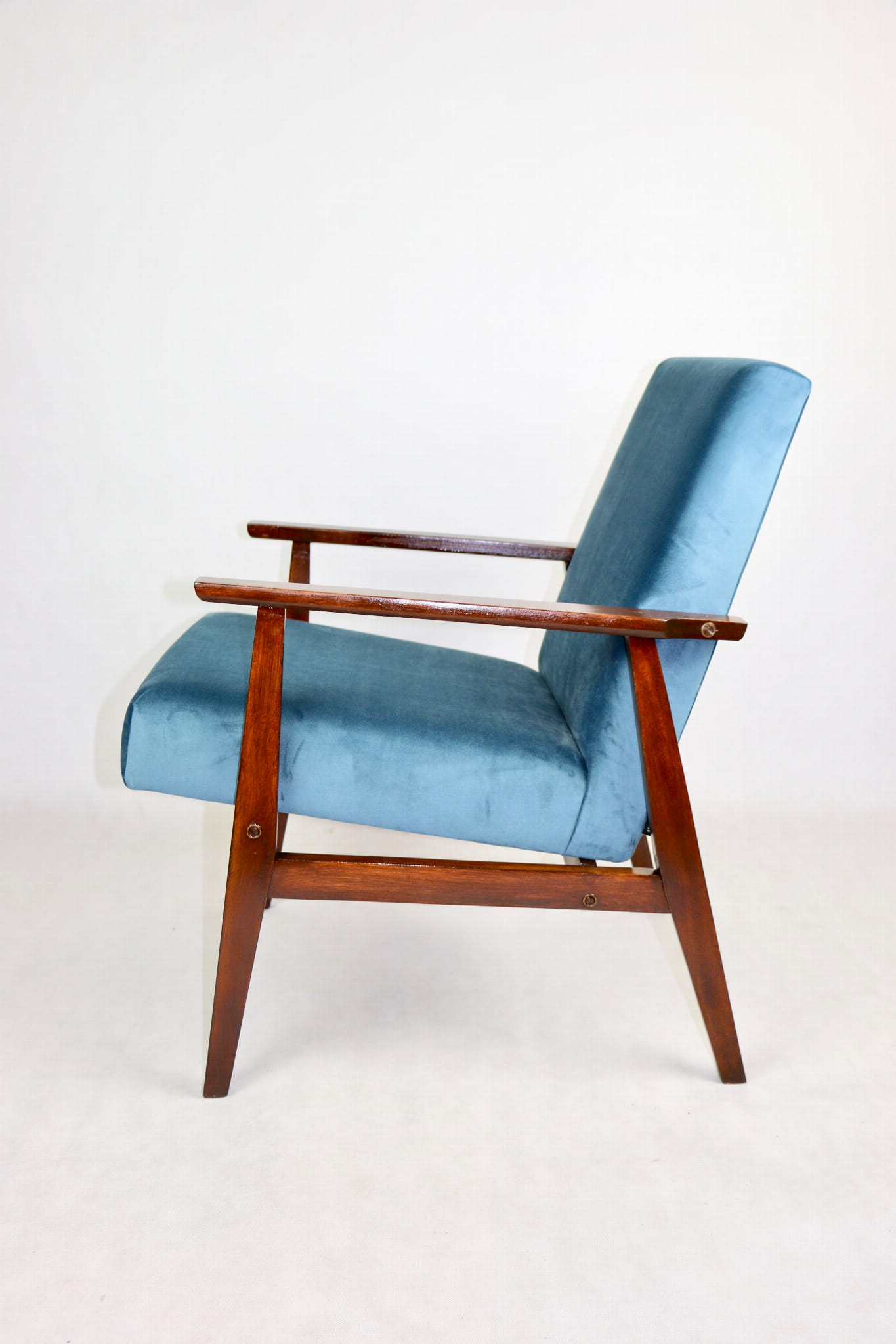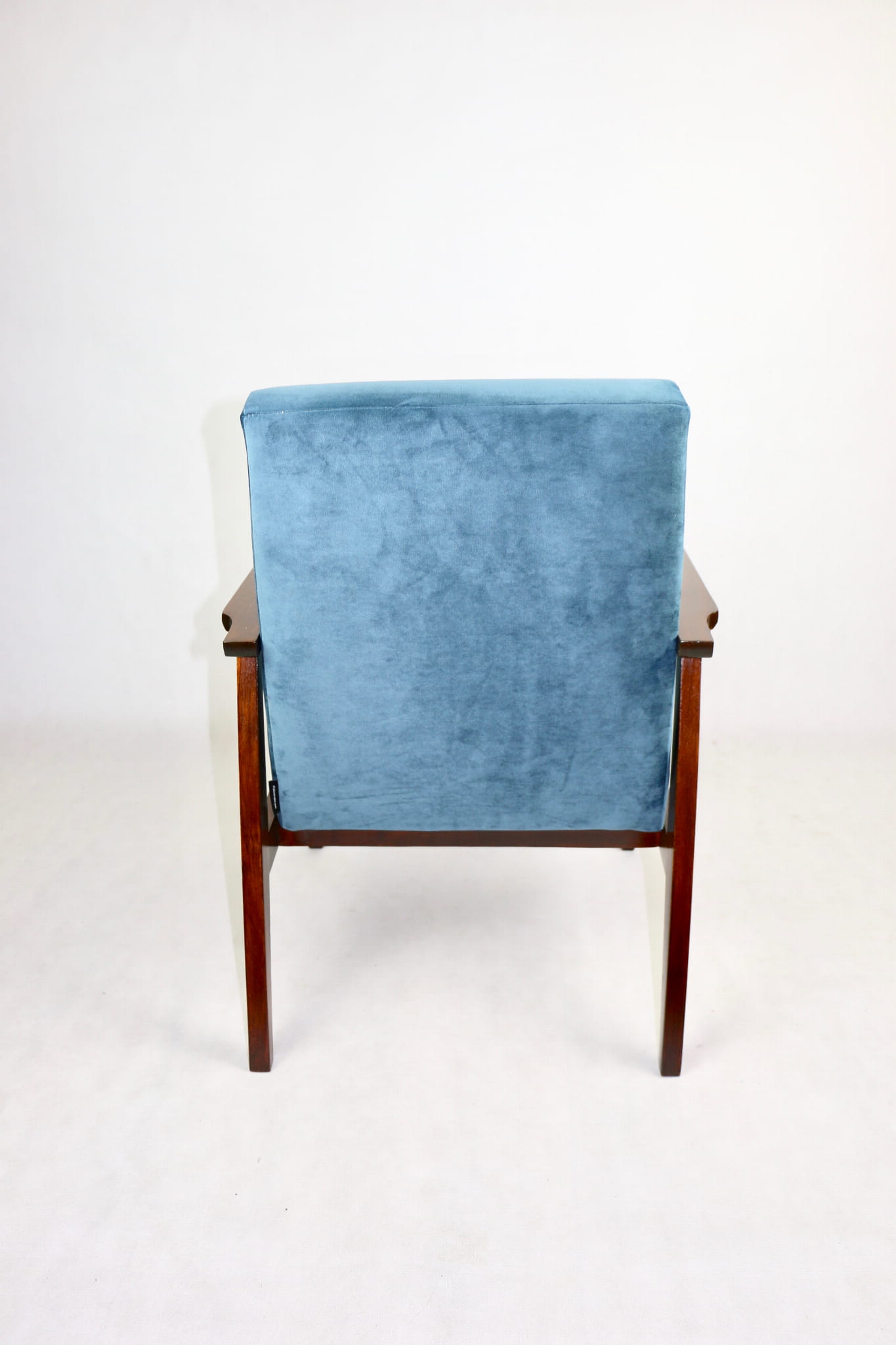Odrestaurowany fotel Henryka Lis-a z roku 1970, nowe welwetowe obicie w tkaninie w kolorze niebieskim z serii Paris. Stelaż drewniany połączony z podłokietnikami w ciemnej kolorystyce drewna.