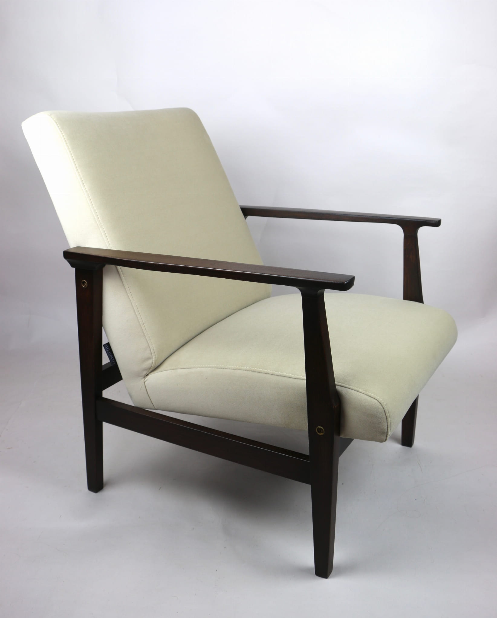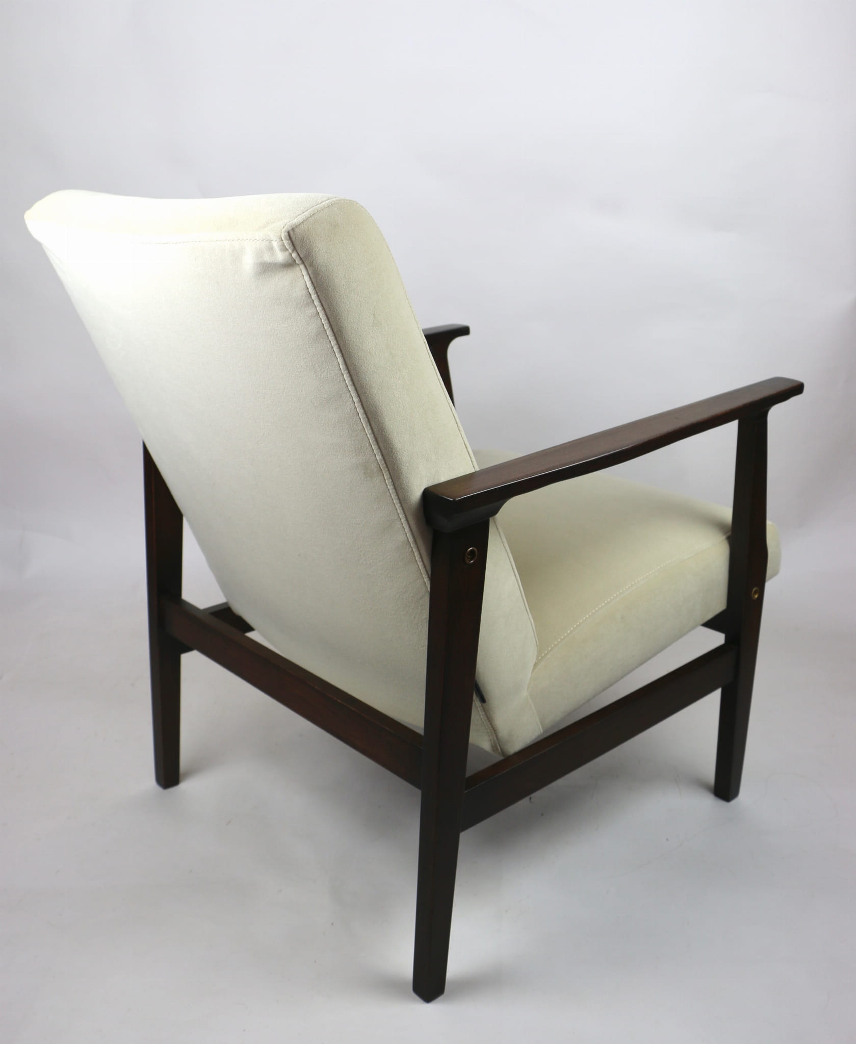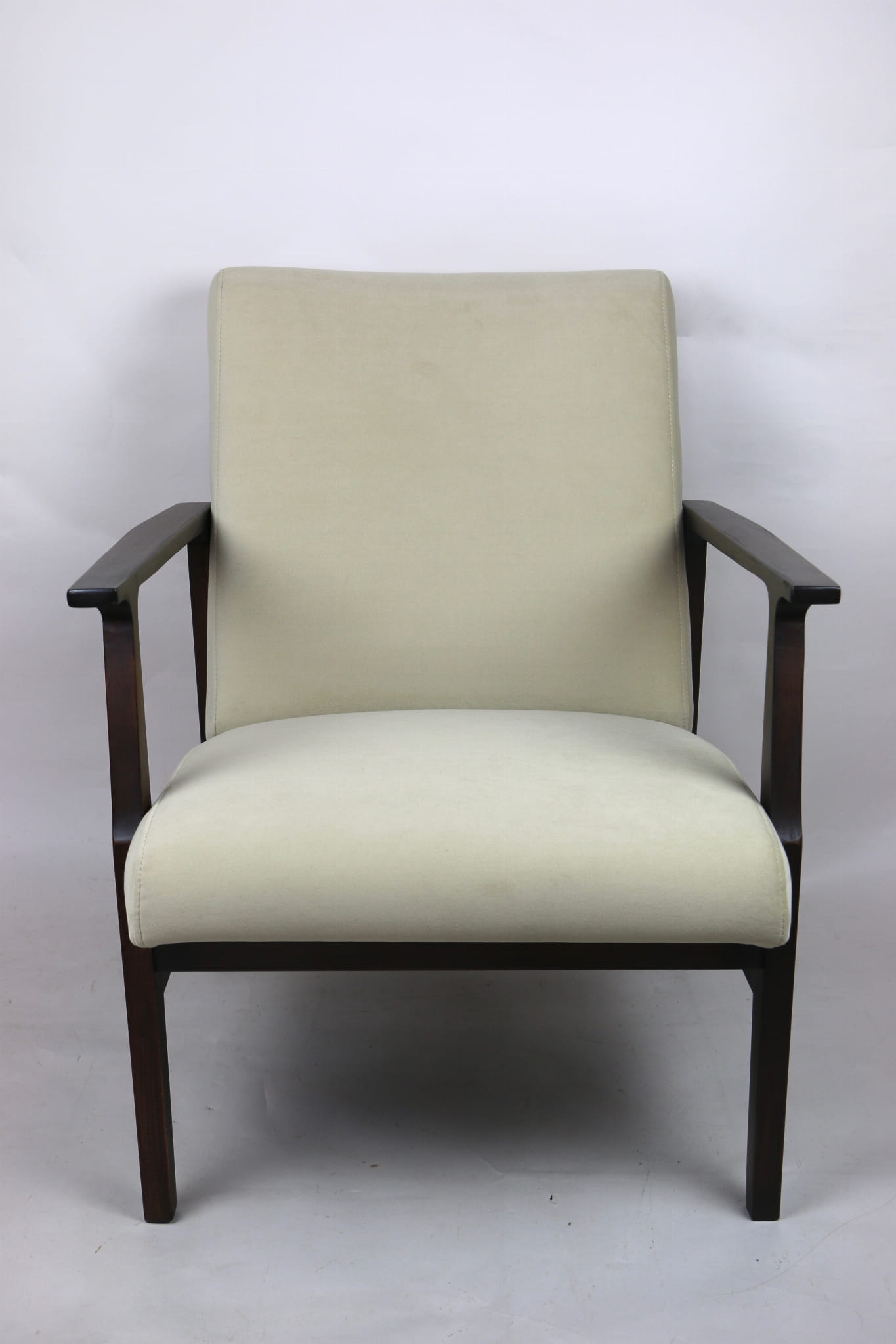 Odrestaurowany fotel, nowe obicie pokryte wysokiej jakości materiałem tapicerskim strukturalnym typu welwet w kolorze beżowy - seria Jade - kolor 911. Siedzisko na sprężynach, stelaż drewniany połączony z podłokietnikami w naturalnym brązowym kolorze drewna.
