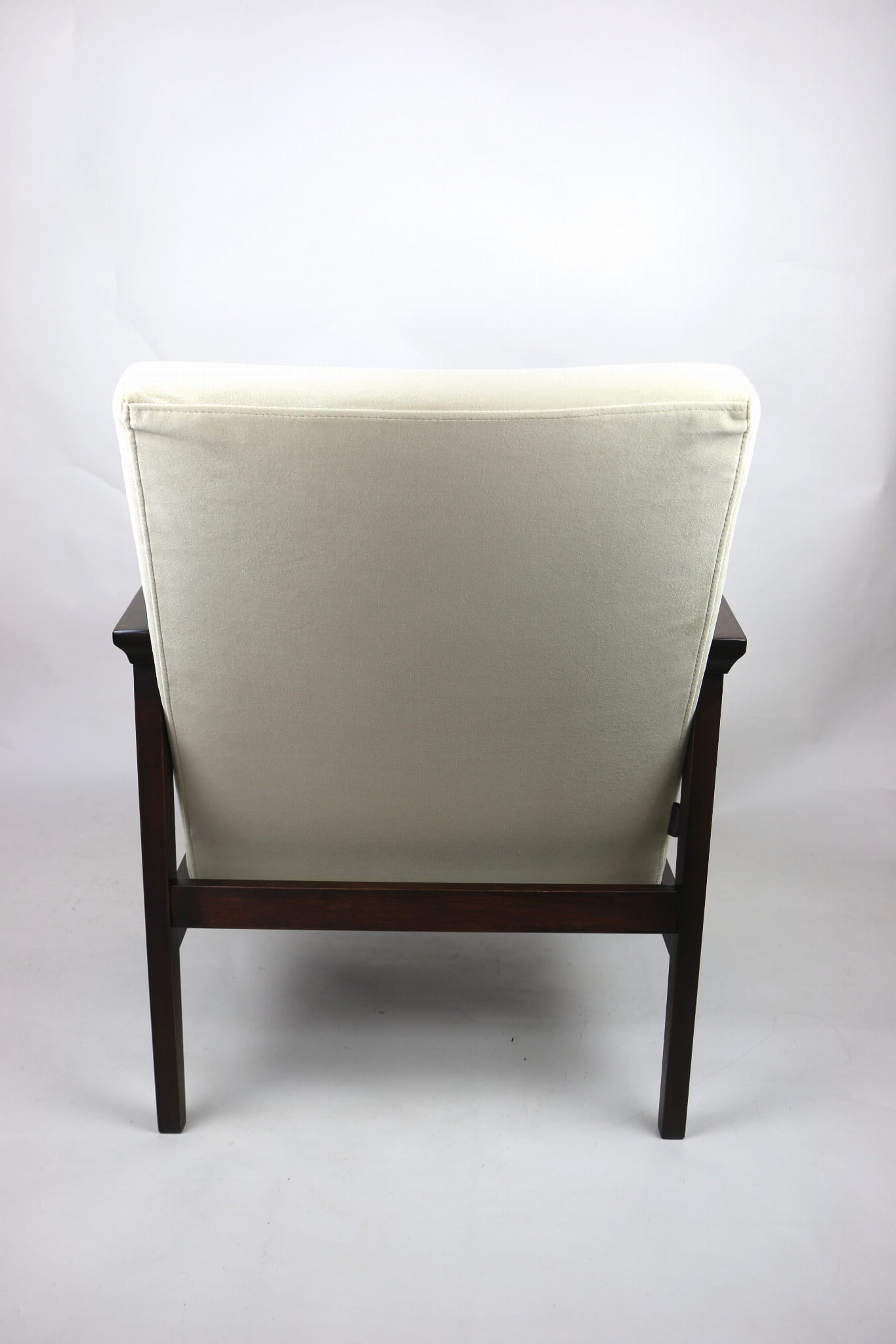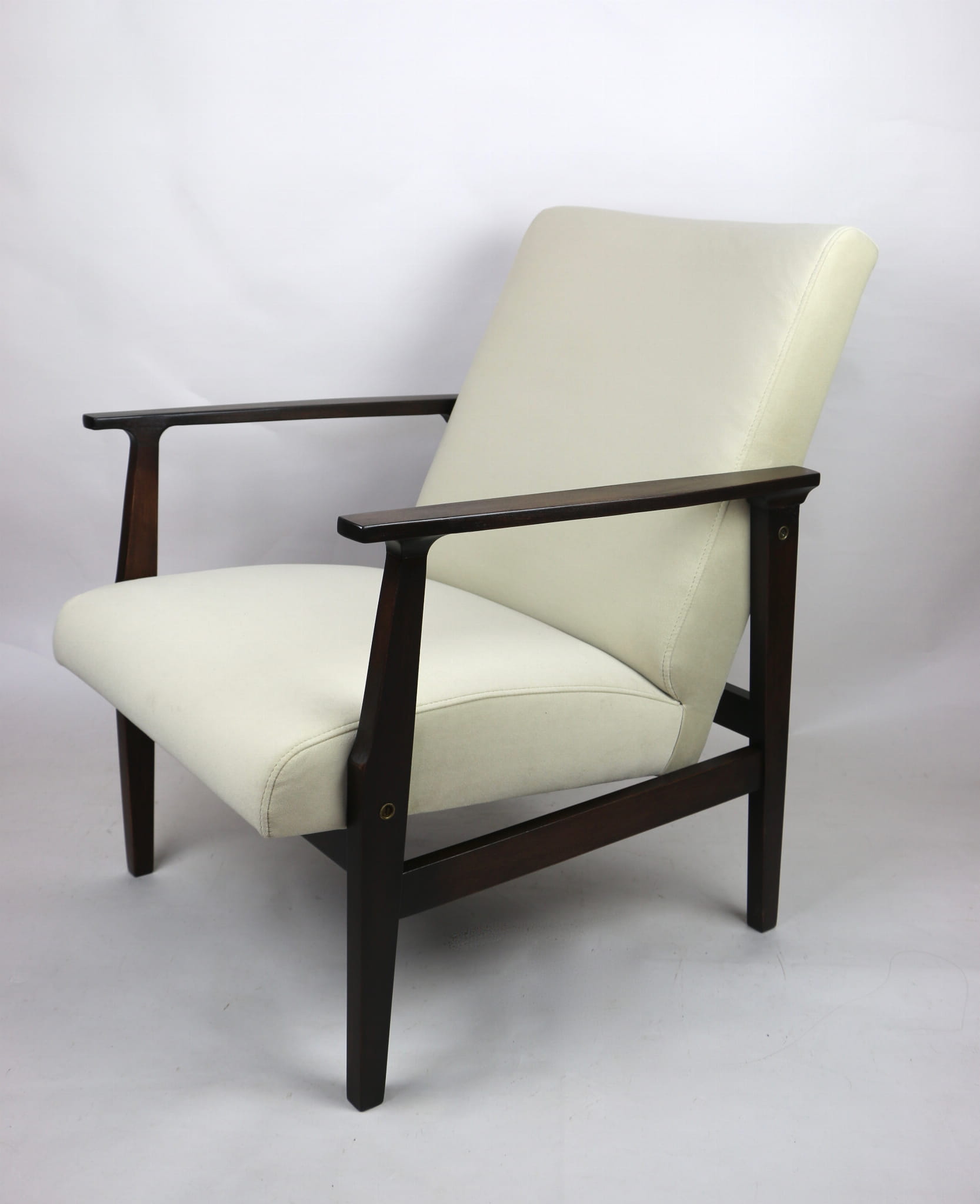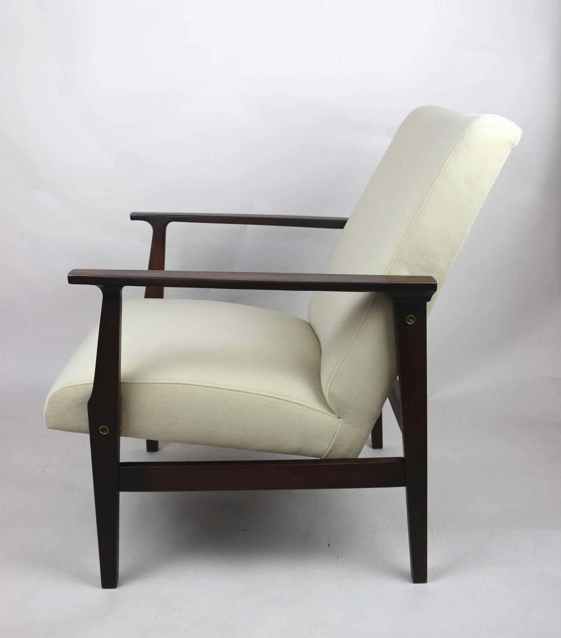 Odrestaurowany fotel, nowe obicie pokryte wysokiej jakości materiałem tapicerskim strukturalnym typu welwet w kolorze beżowy - seria Jade - kolor 911. Siedzisko na sprężynach, stelaż drewniany połączony z podłokietnikami w naturalnym brązowym kolorze drewna.