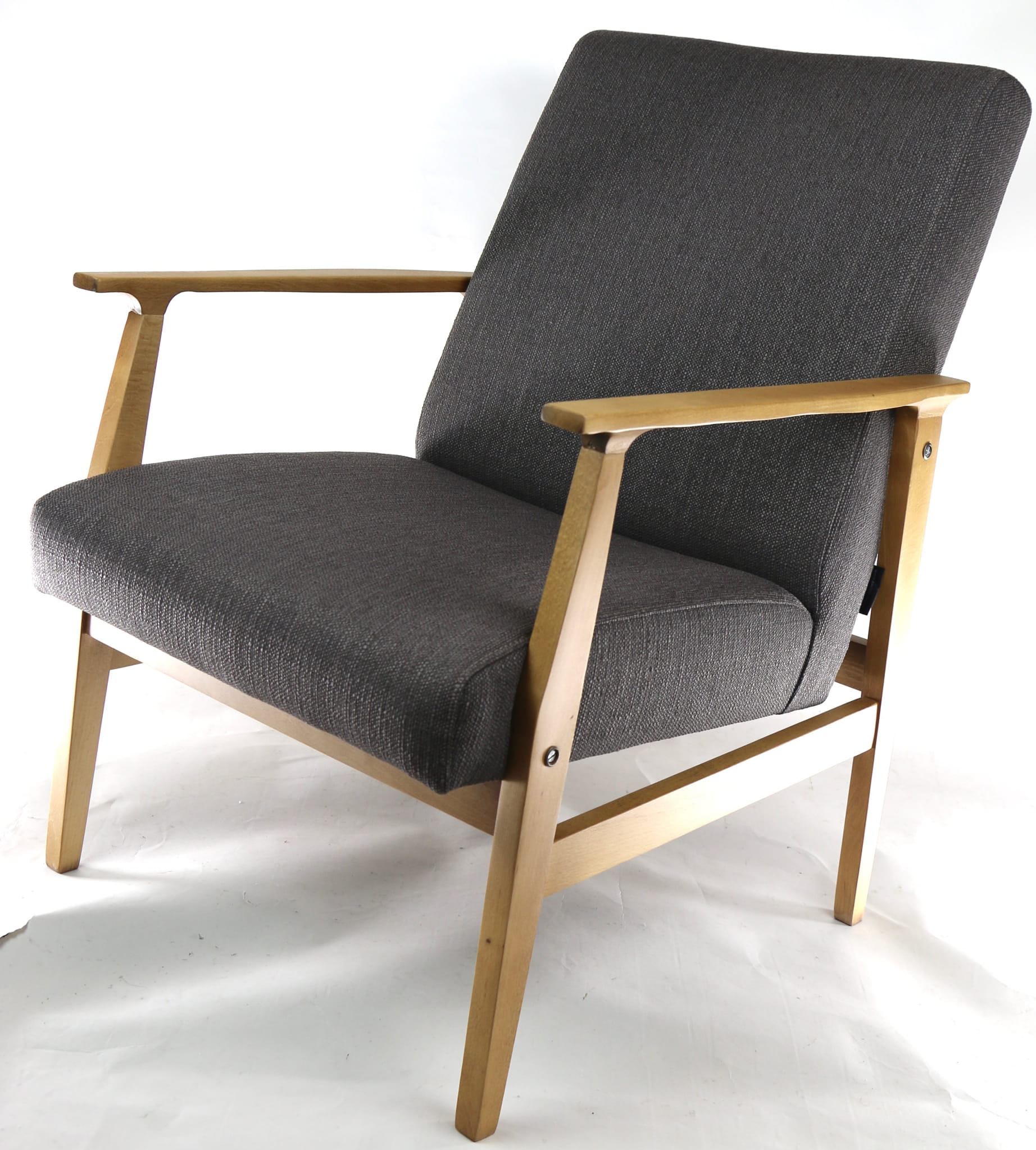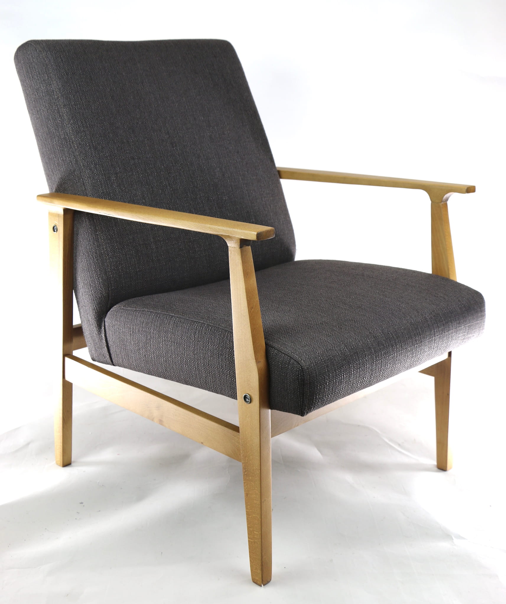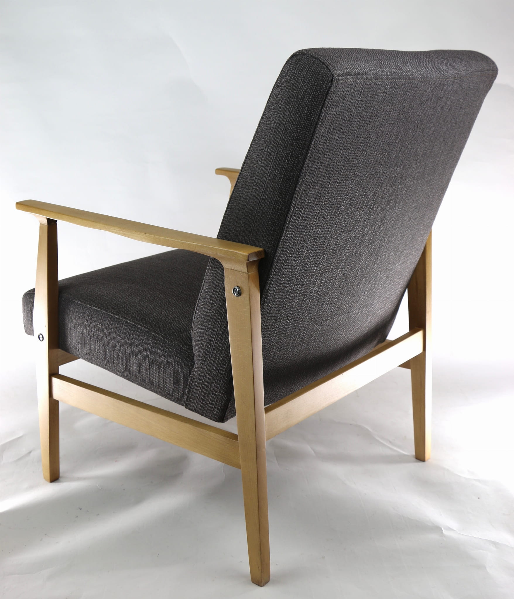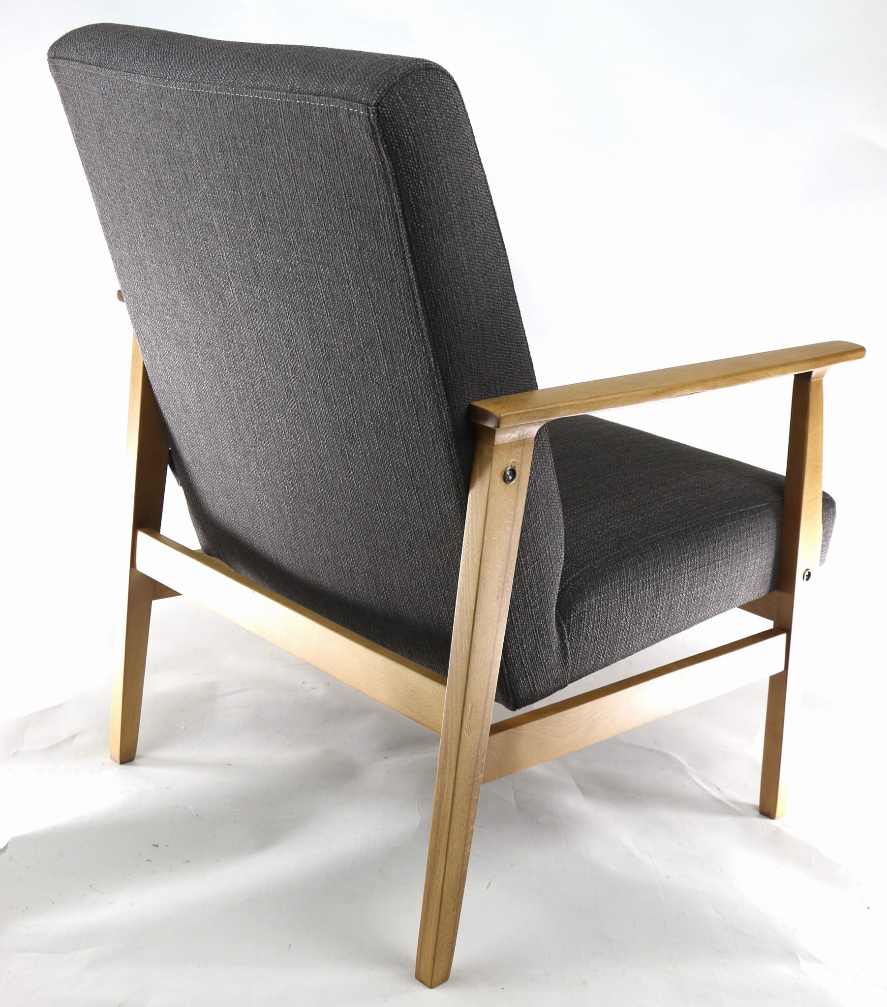 Odrestaurowany fotel, nowe obicie pokryte wysokiej jakości materiałem tapicerskim typu strukturalnym w kolorze brązowym. Siedzisko na pasach, stelaż drewniany połączony z podłokietnikami w naturalnym kolorze drewna. Dostępne 2 sztuki