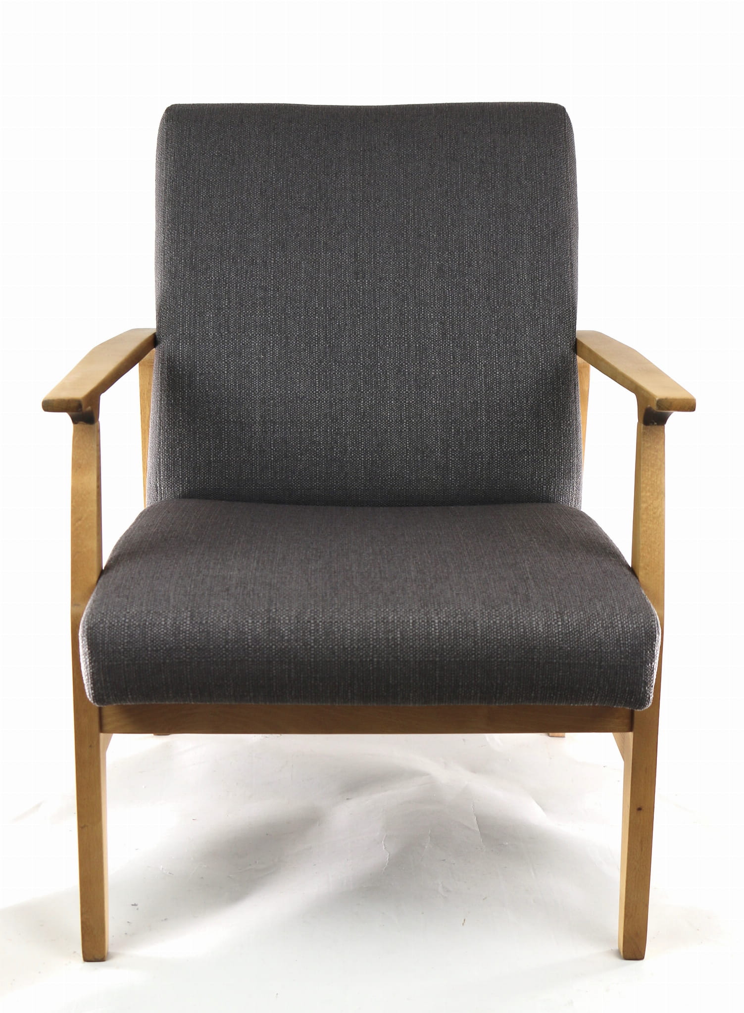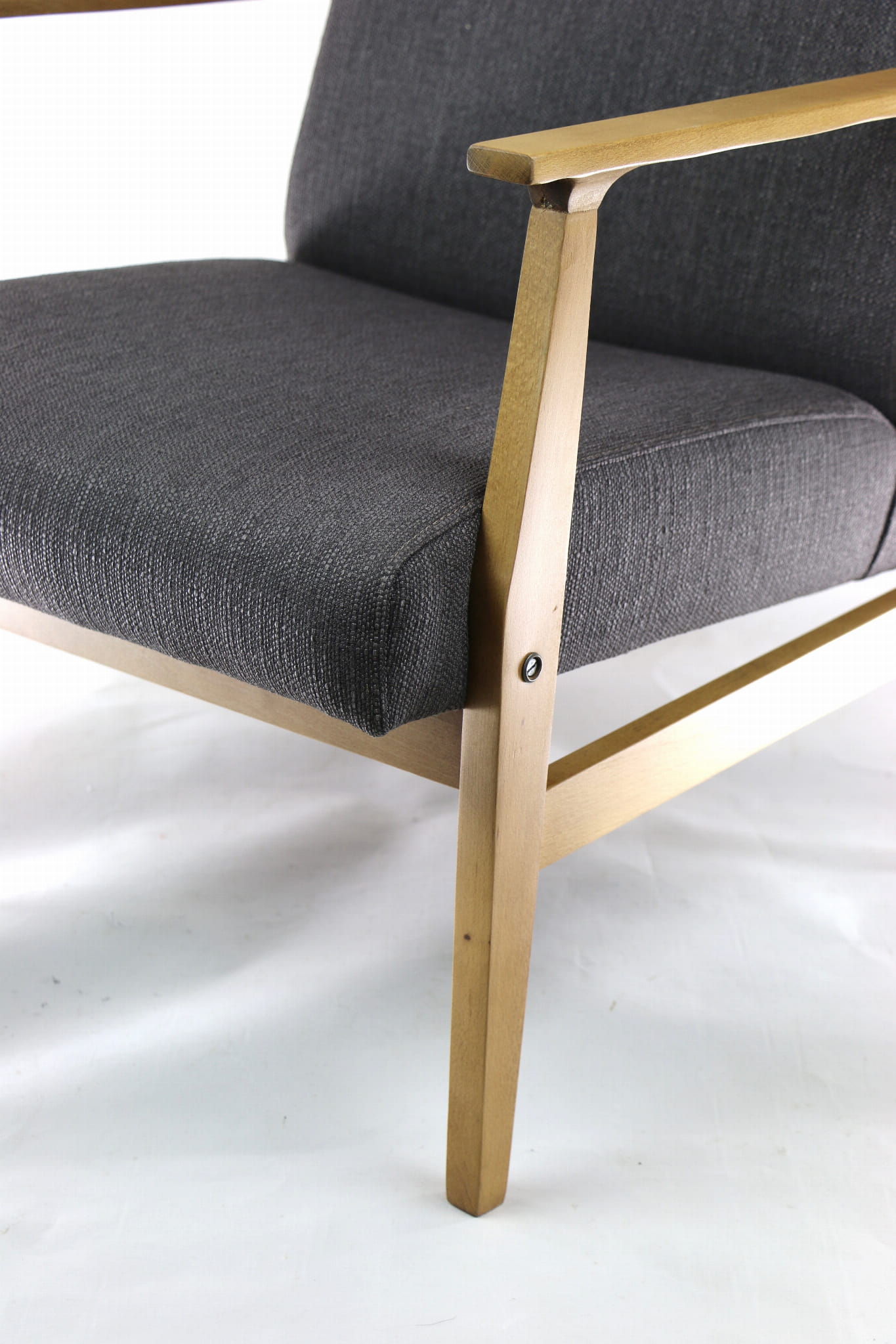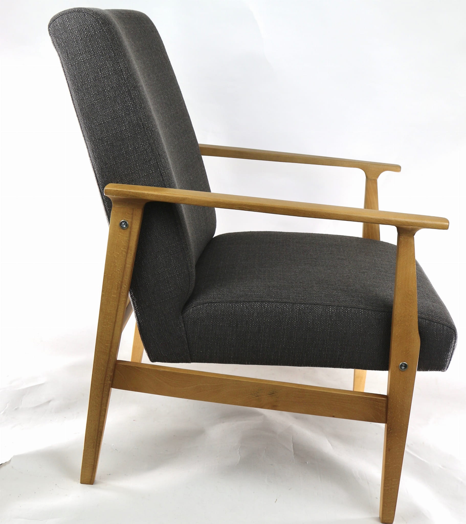 Odrestaurowany fotel, nowe obicie pokryte wysokiej jakości materiałem tapicerskim typu strukturalnym w kolorze brązowym. Siedzisko na pasach, stelaż drewniany połączony z podłokietnikami w naturalnym kolorze drewna. Dostępne 2 sztuki
