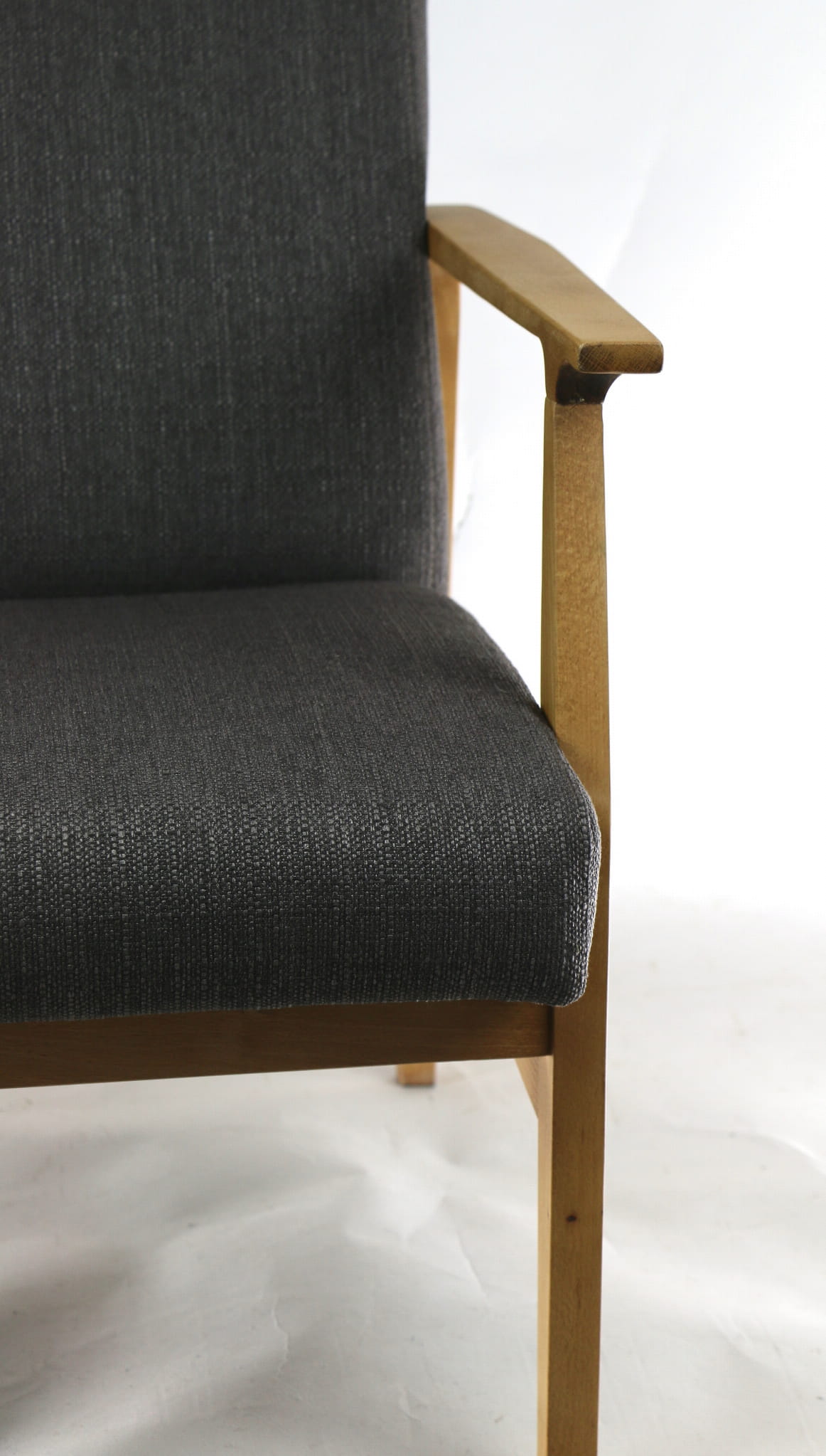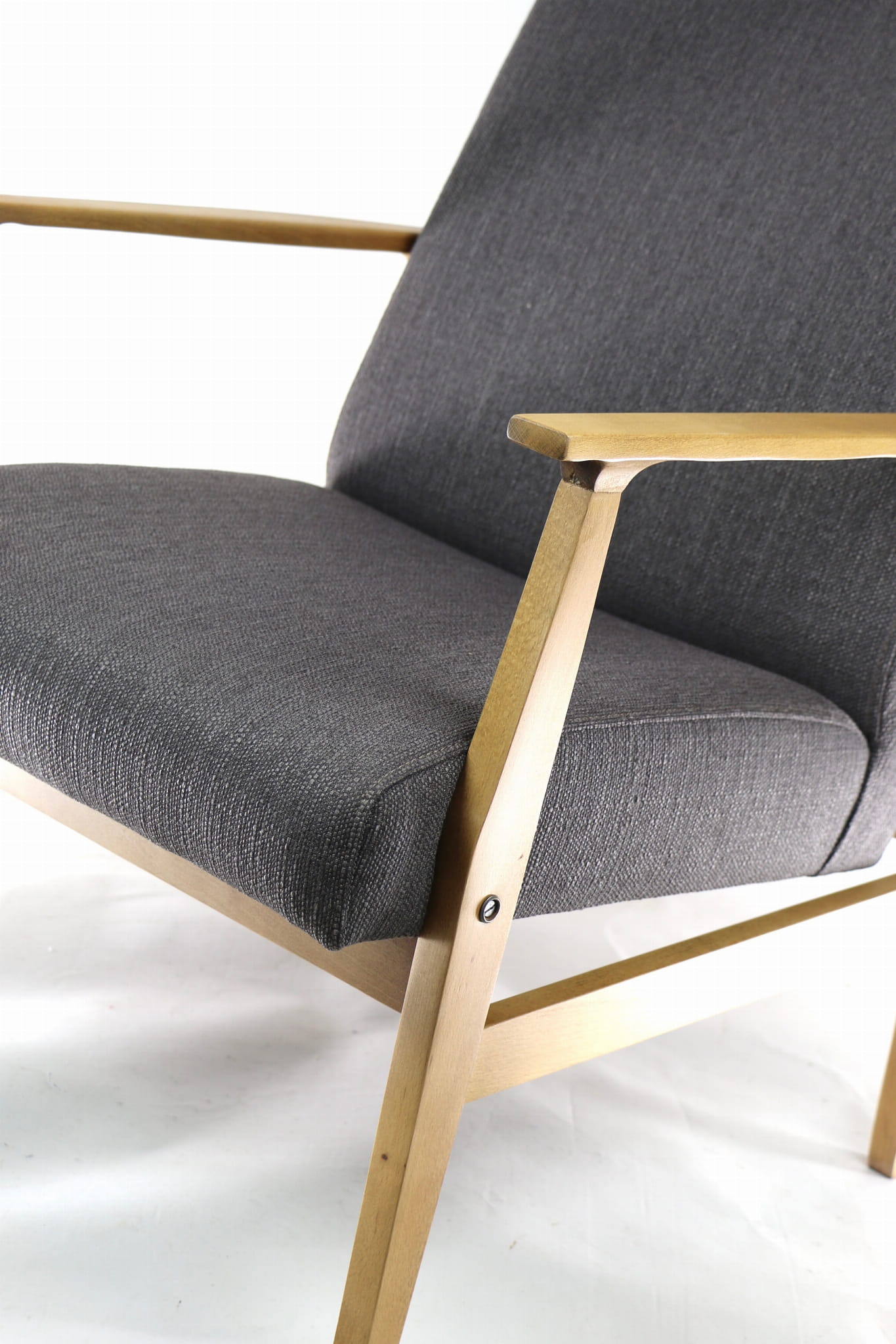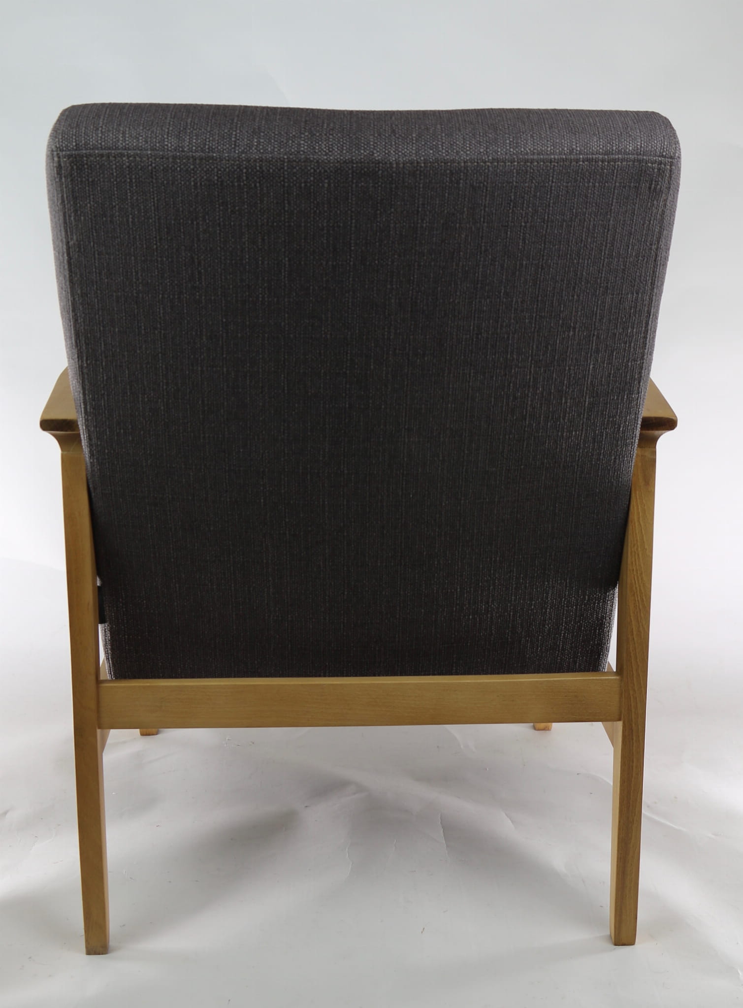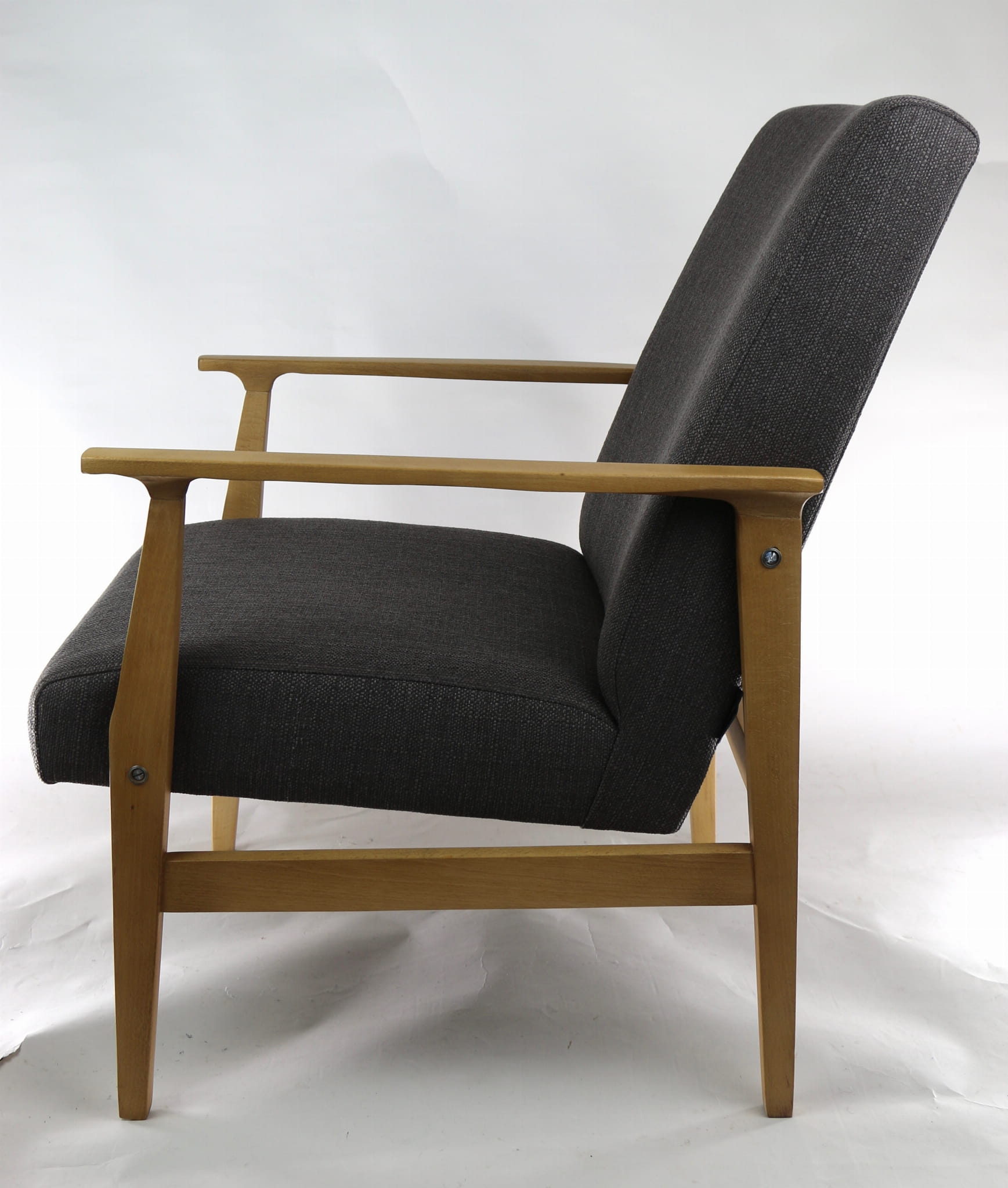 Odrestaurowany fotel, nowe obicie pokryte wysokiej jakości materiałem tapicerskim typu strukturalnym w kolorze brązowym. Siedzisko na pasach, stelaż drewniany połączony z podłokietnikami w naturalnym kolorze drewna. Dostępne 2 sztuki