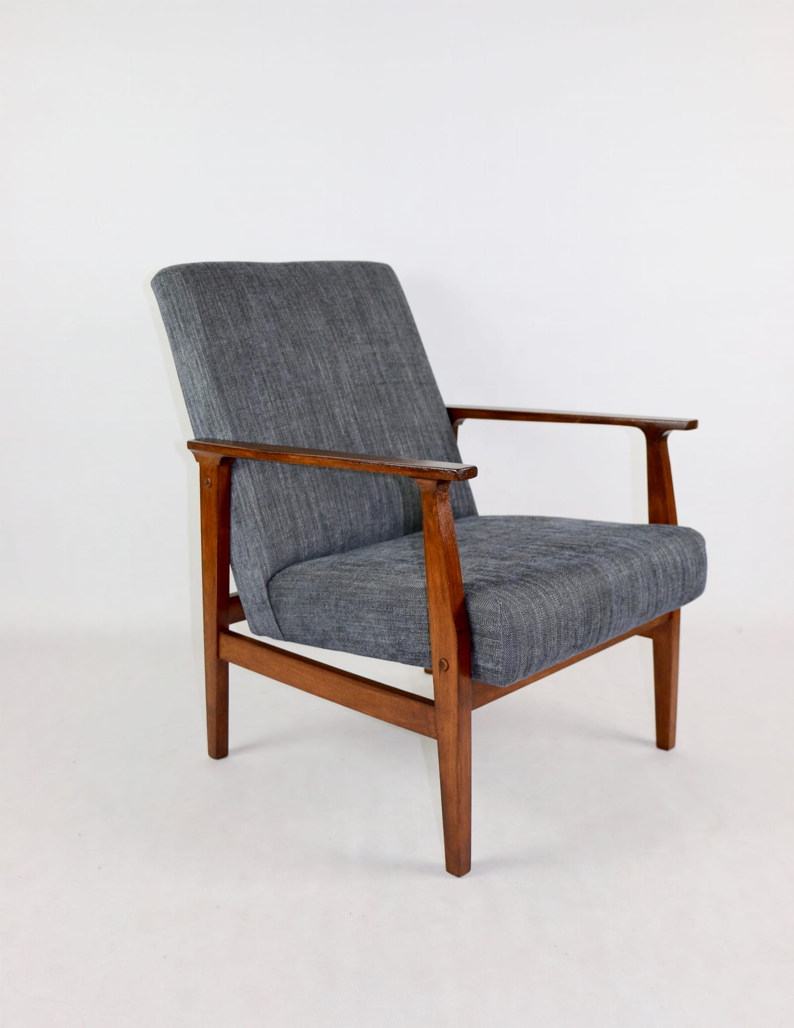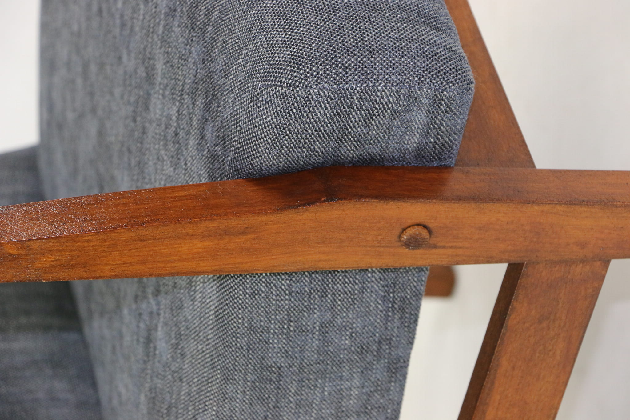 Odrestaurowany fotel, nowe obicie pokryte wysokiej jakości materiałem tapicerskim strukturalnym w kolorze beżowym - seria Danubio. Siedzisko na pasach, stelaż drewniany połączony z podłokietnikami w naturalnym ciemno-brązowym kolorze drewna.
