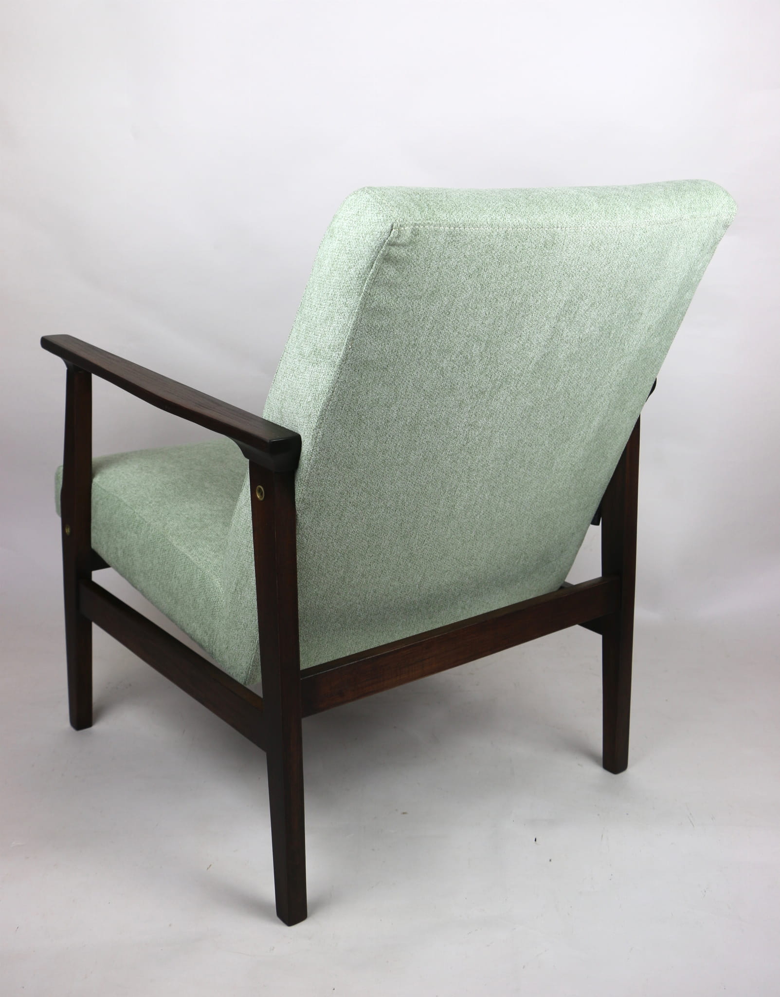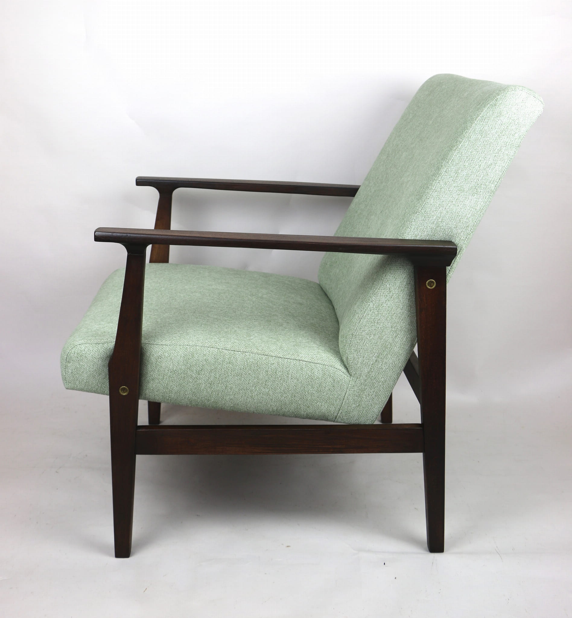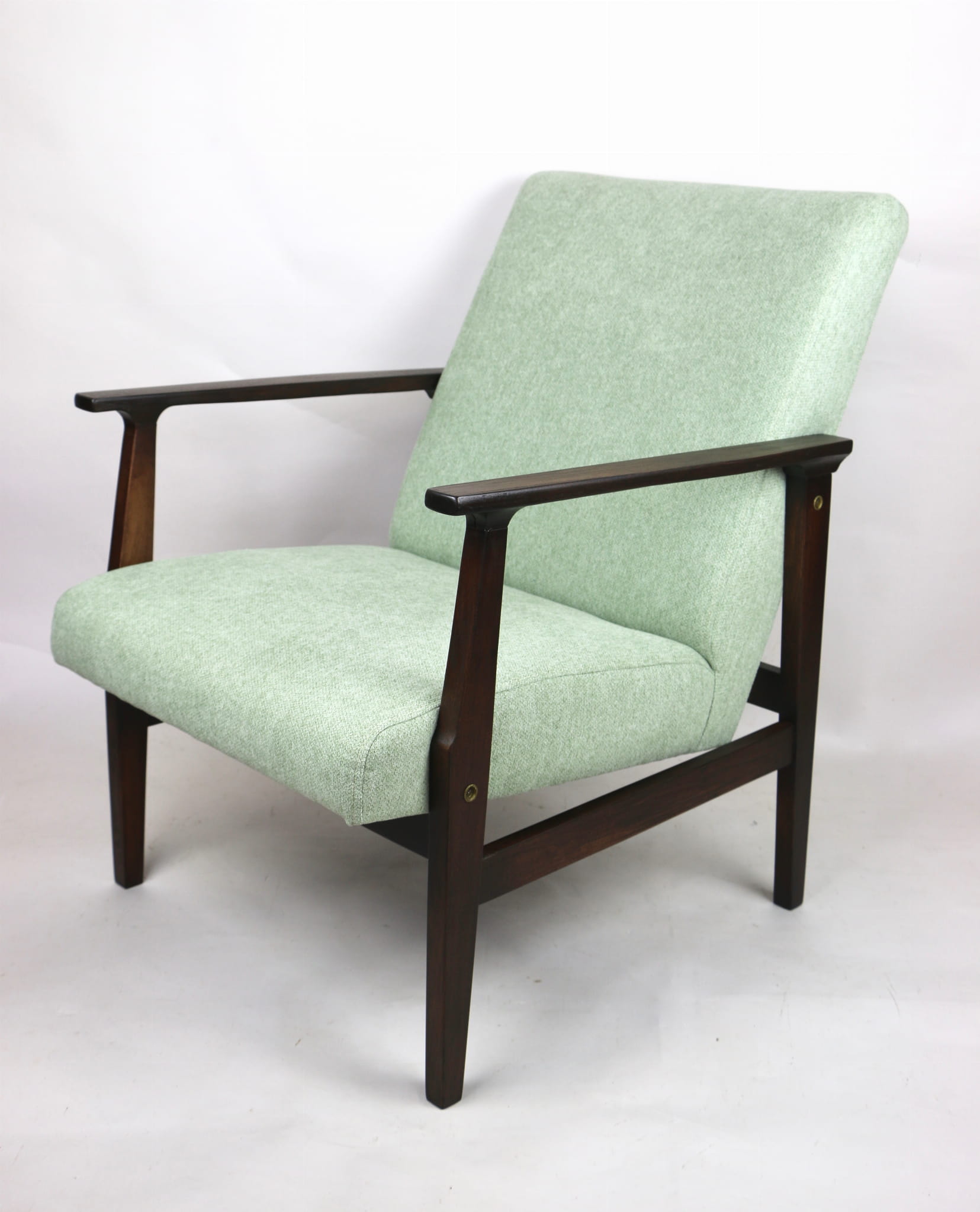 Odrestaurowany fotel, nowe obicie pokryte wysokiej jakości materiałem tapicerskim strukturalnym w kolorze jasnym zielonym - seria Queens. Siedzisko na sprężynach, stelaż drewniany połączony z podłokietnikami w naturalnym brązowym kolorze drewna.