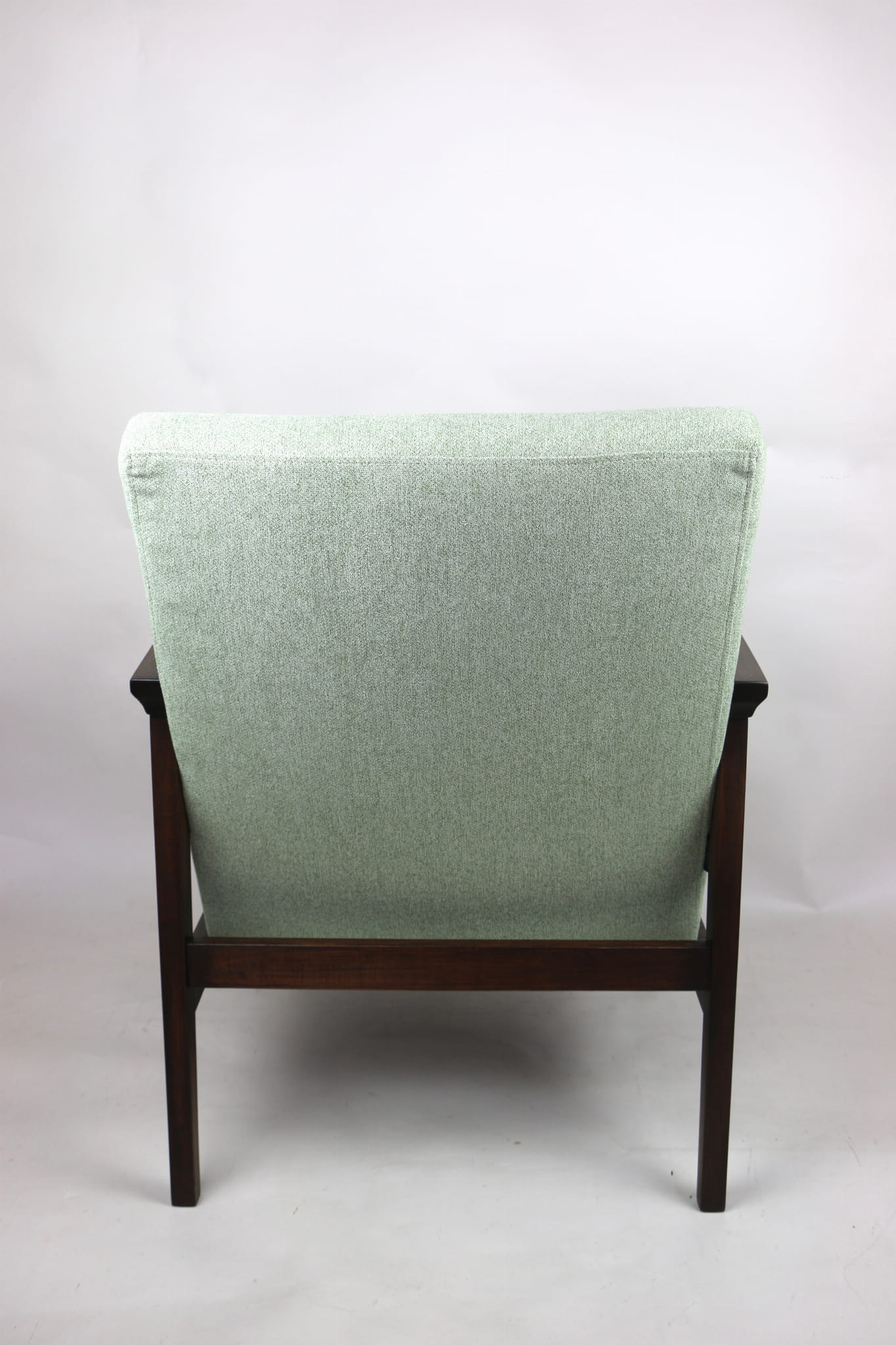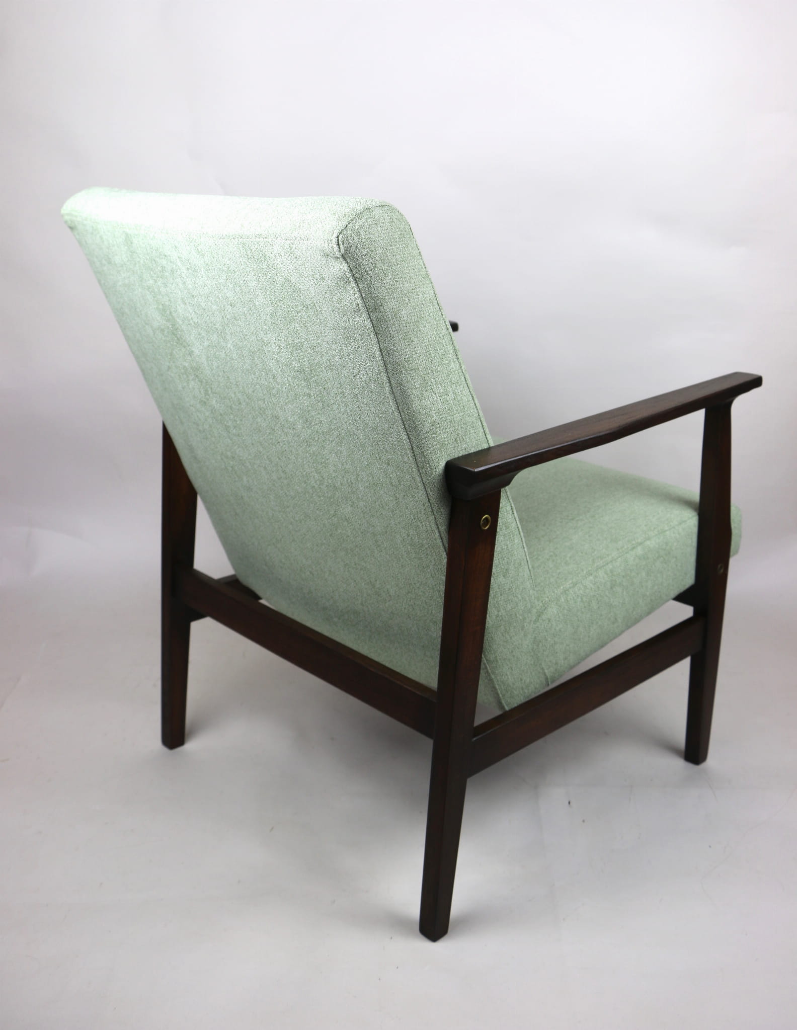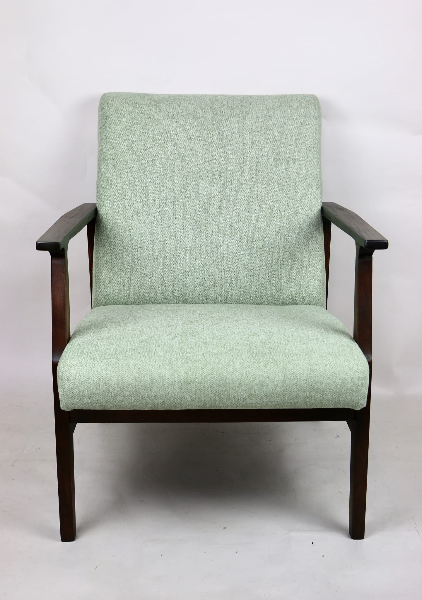 Odrestaurowany fotel, nowe obicie pokryte wysokiej jakości materiałem tapicerskim strukturalnym w kolorze jasnym zielonym - seria Queens. Siedzisko na sprężynach, stelaż drewniany połączony z podłokietnikami w naturalnym brązowym kolorze drewna.