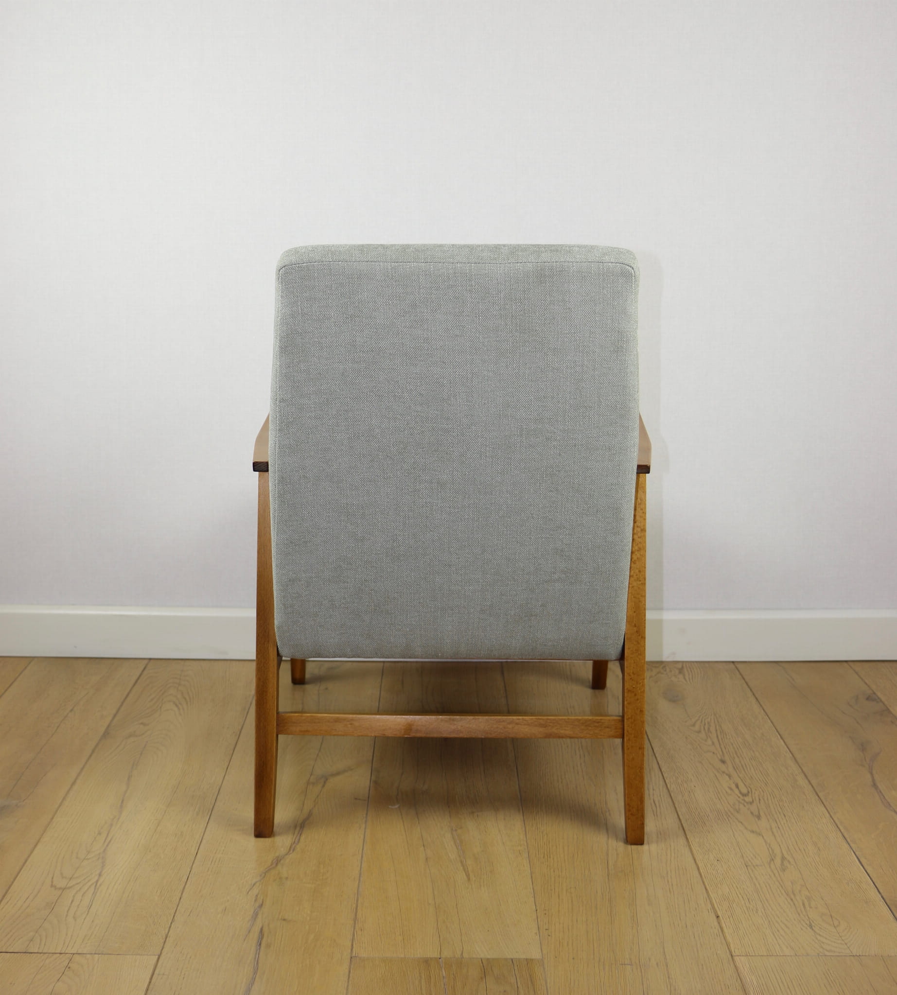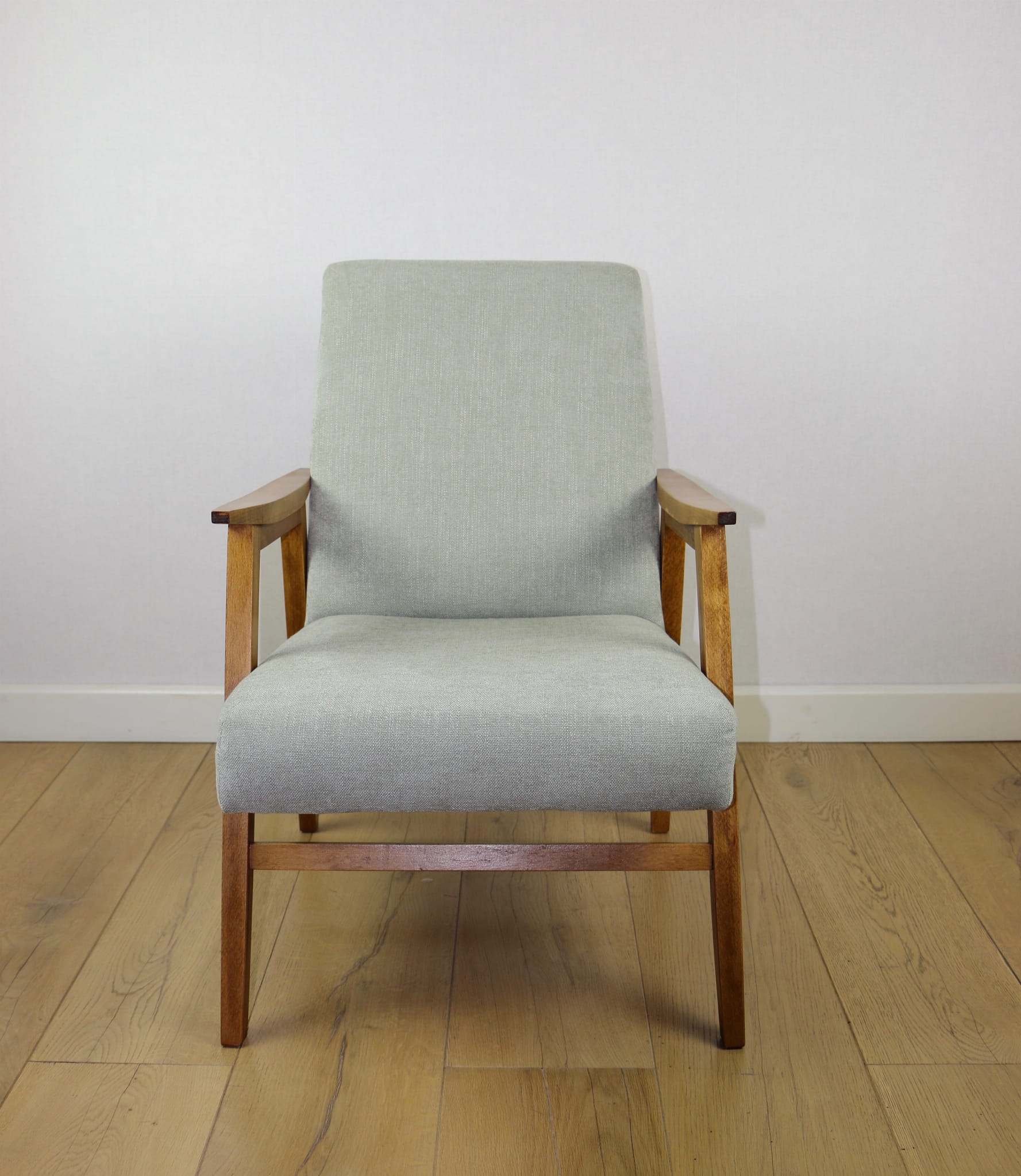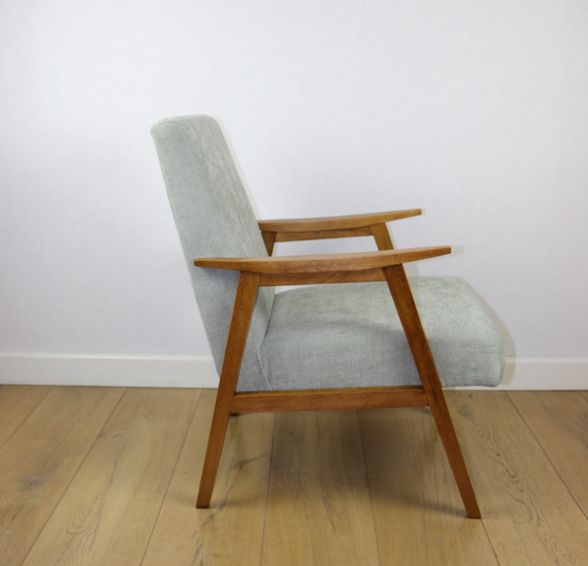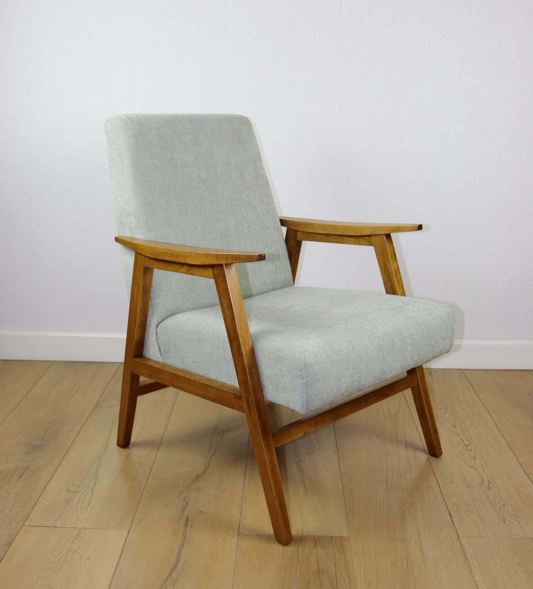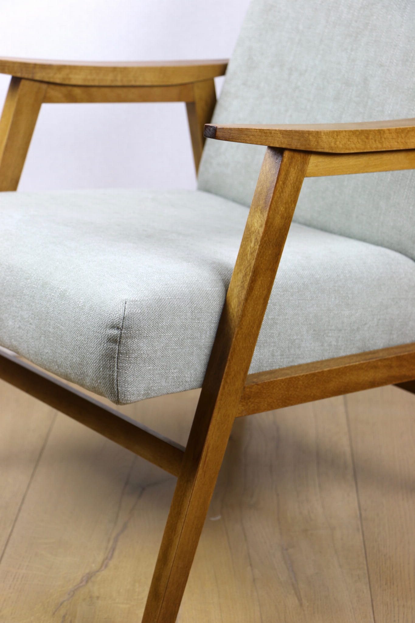 Odrestaurowany fotel, nowe obicie pokryte wysokiej jakości materiałem tapicerskim strukturalnym w kolorze jasnym zielonym - seria Danubio. Siedzisko na pasach, stelaż drewniany połączony z podłokietnikami w naturalnym kolorze drewna.