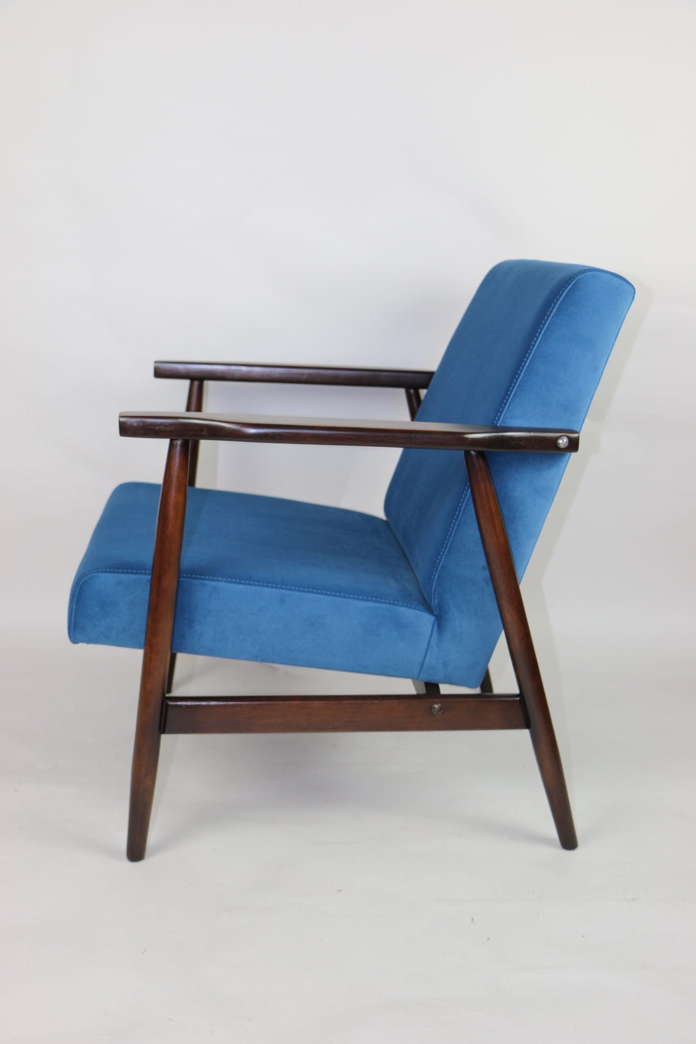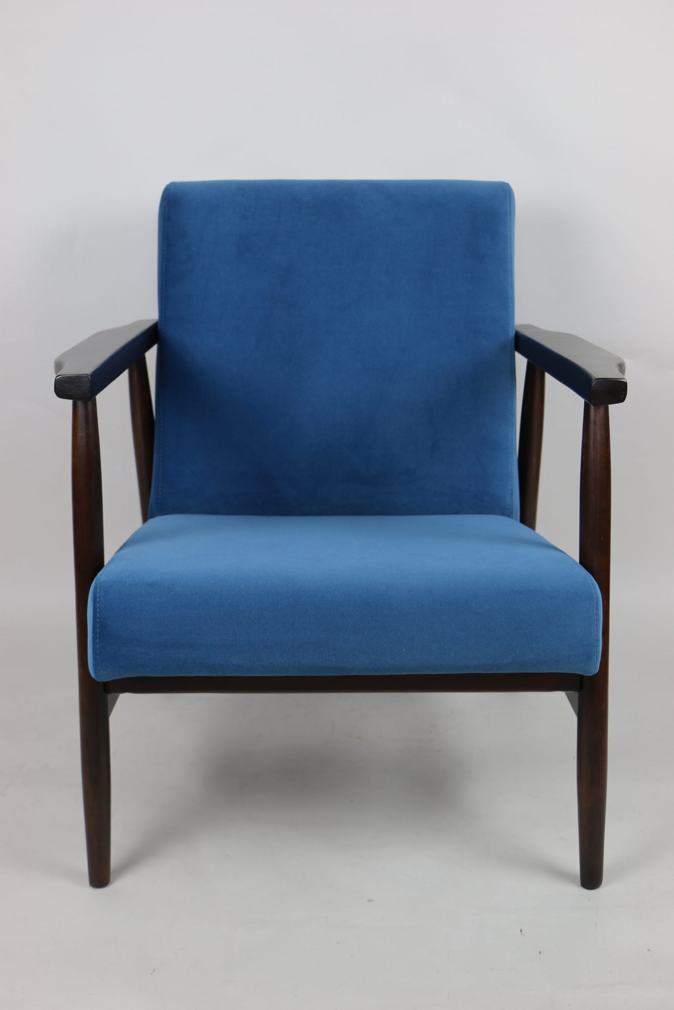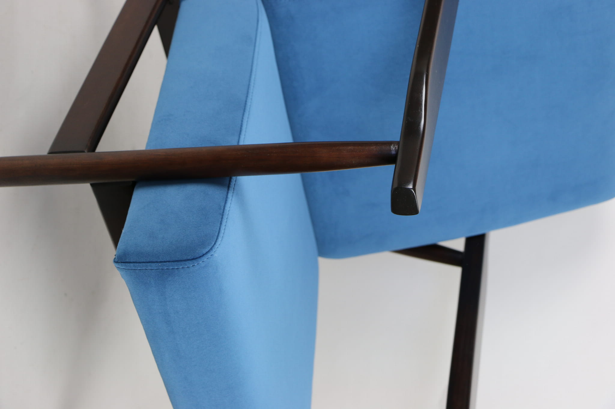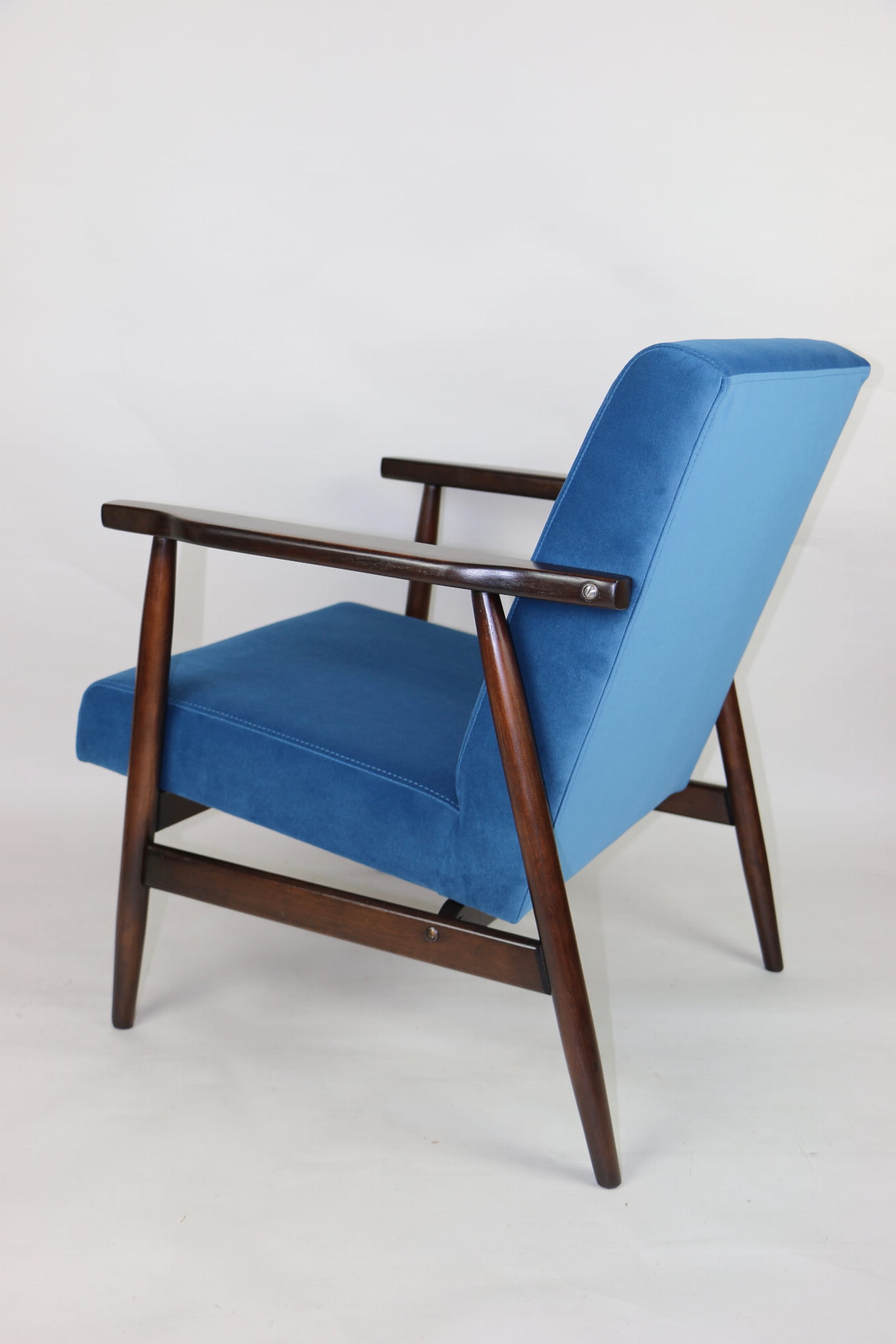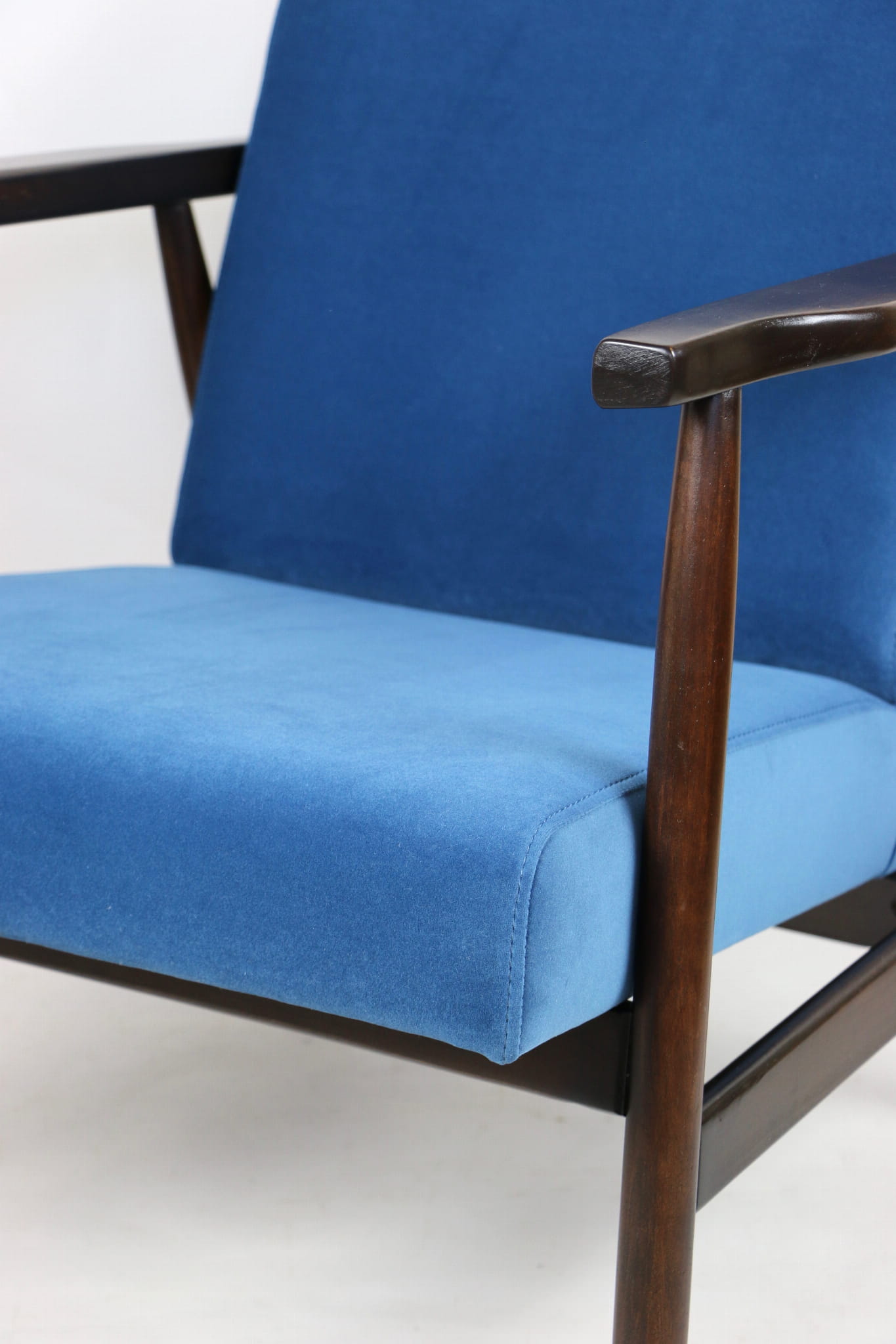 Odrestaurowany fotel, nowe obicie pokryte wysokiej jakości materiałem tapicerskim strukturalnym typu welwet w kolorze niebiesko morskim - seria Jade - kolor 601. Siedzisko na sprężynach, stelaż drewniany połączony z podłokietnikami w naturalnym brązowym kolorze drewna.