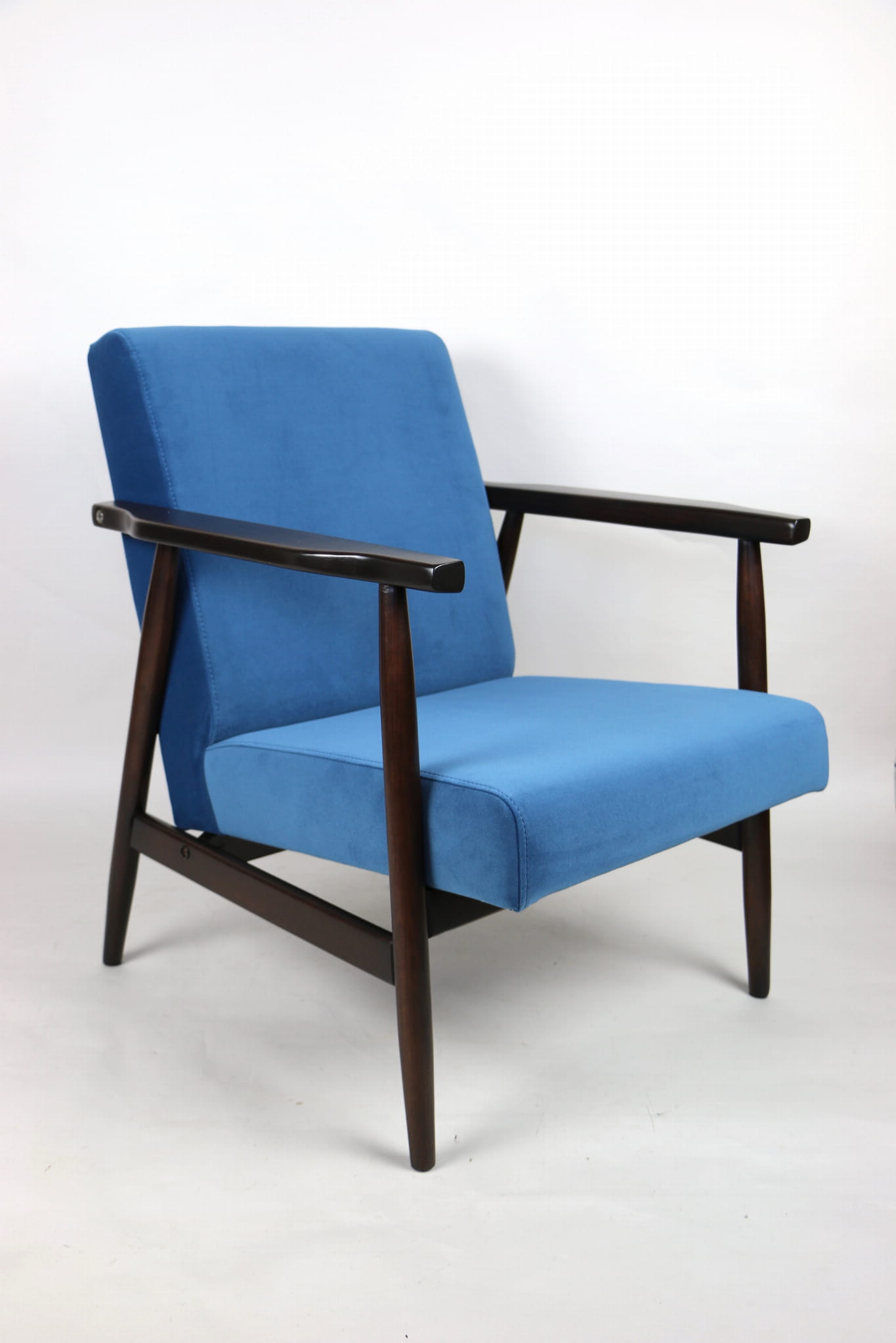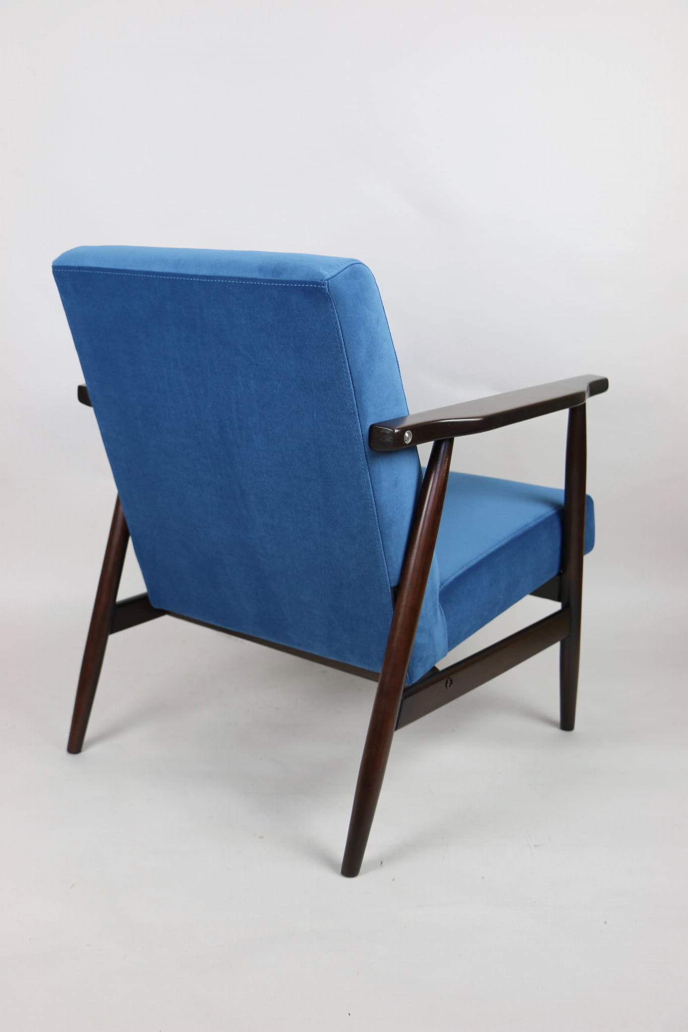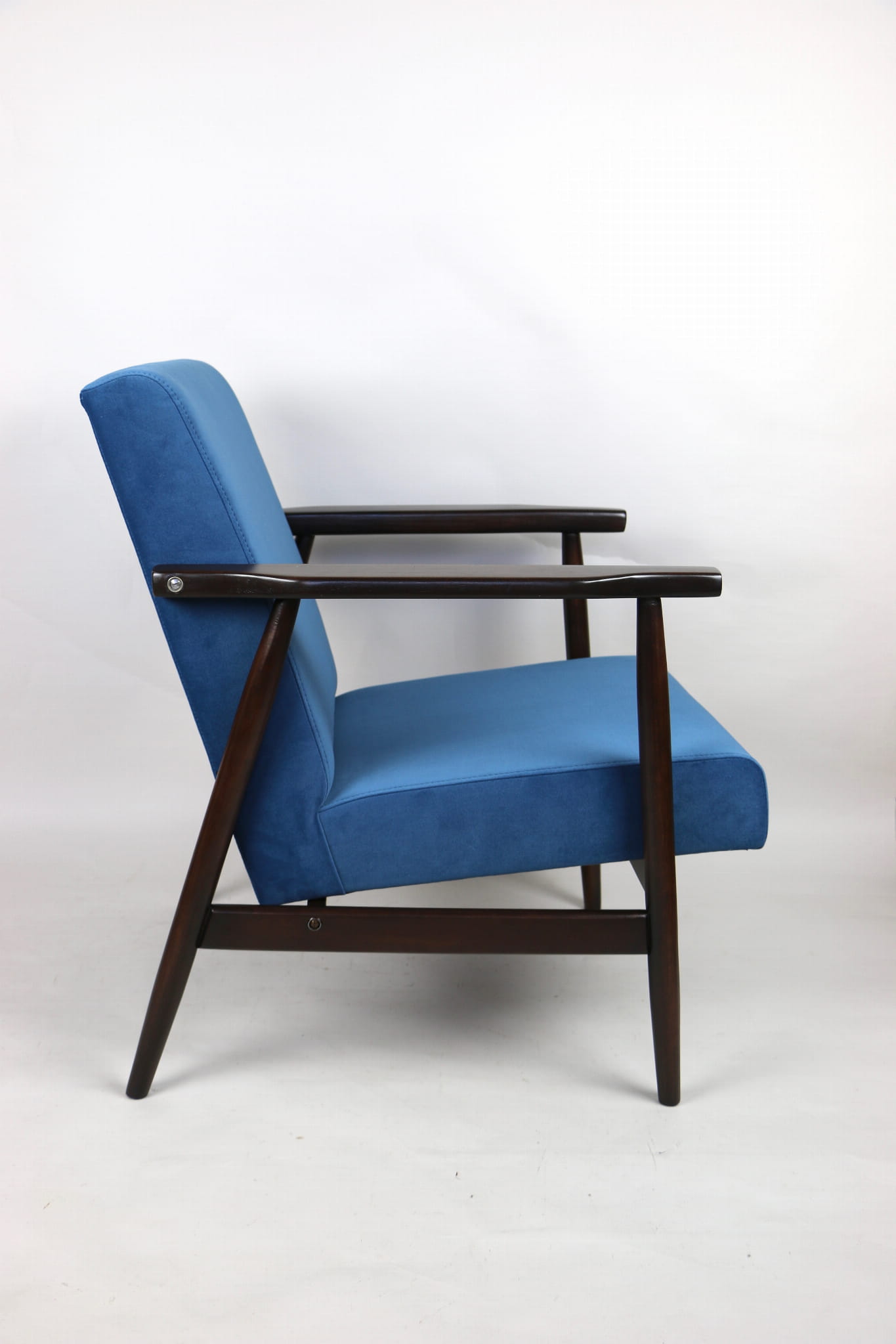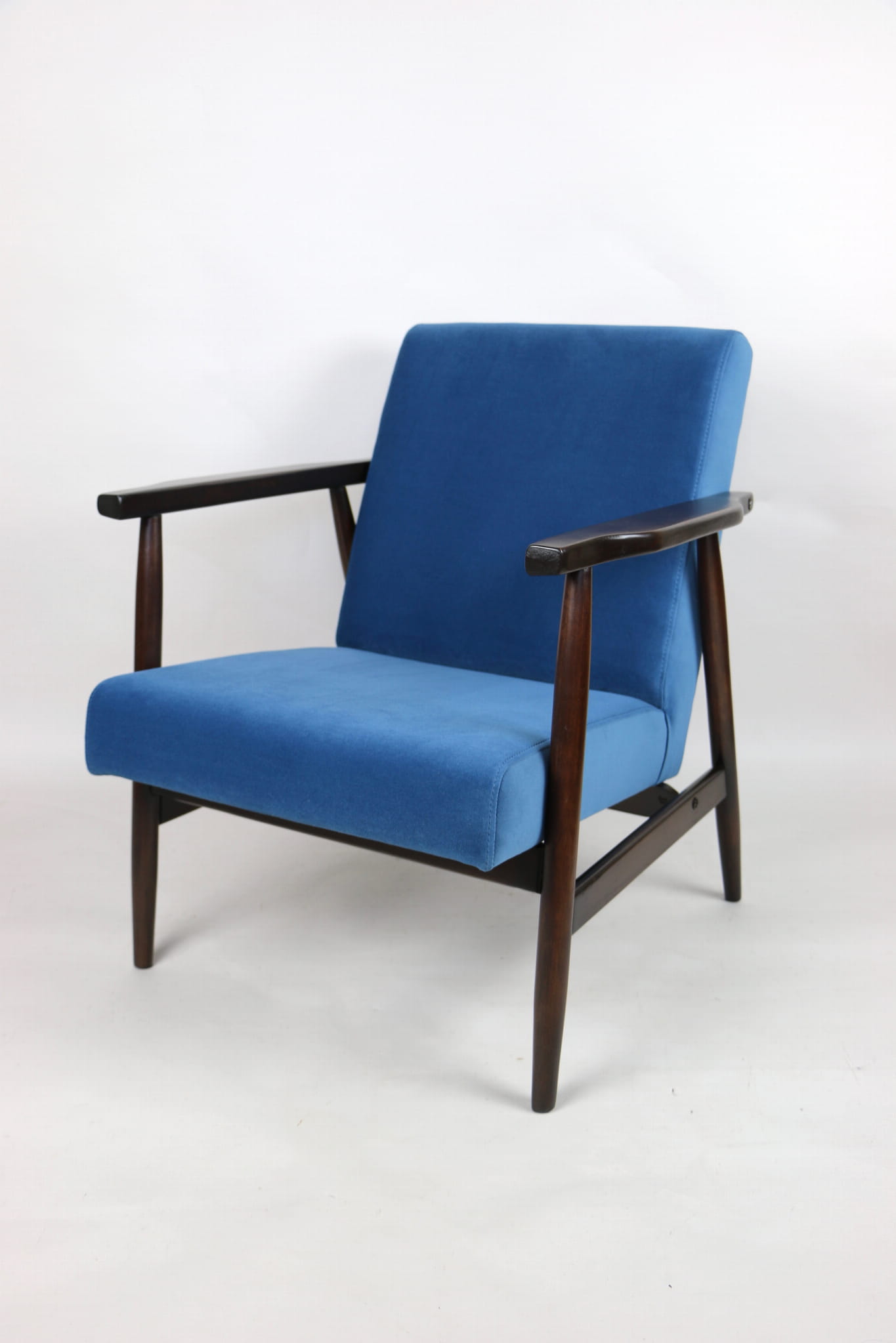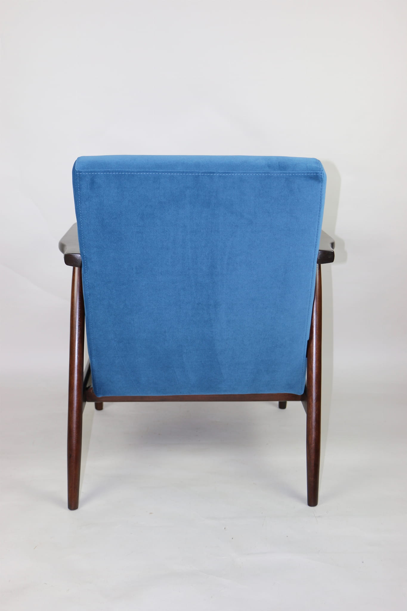 Odrestaurowany fotel, nowe obicie pokryte wysokiej jakości materiałem tapicerskim strukturalnym typu welwet w kolorze niebiesko morskim - seria Jade - kolor 601. Siedzisko na sprężynach, stelaż drewniany połączony z podłokietnikami w naturalnym brązowym kolorze drewna.
