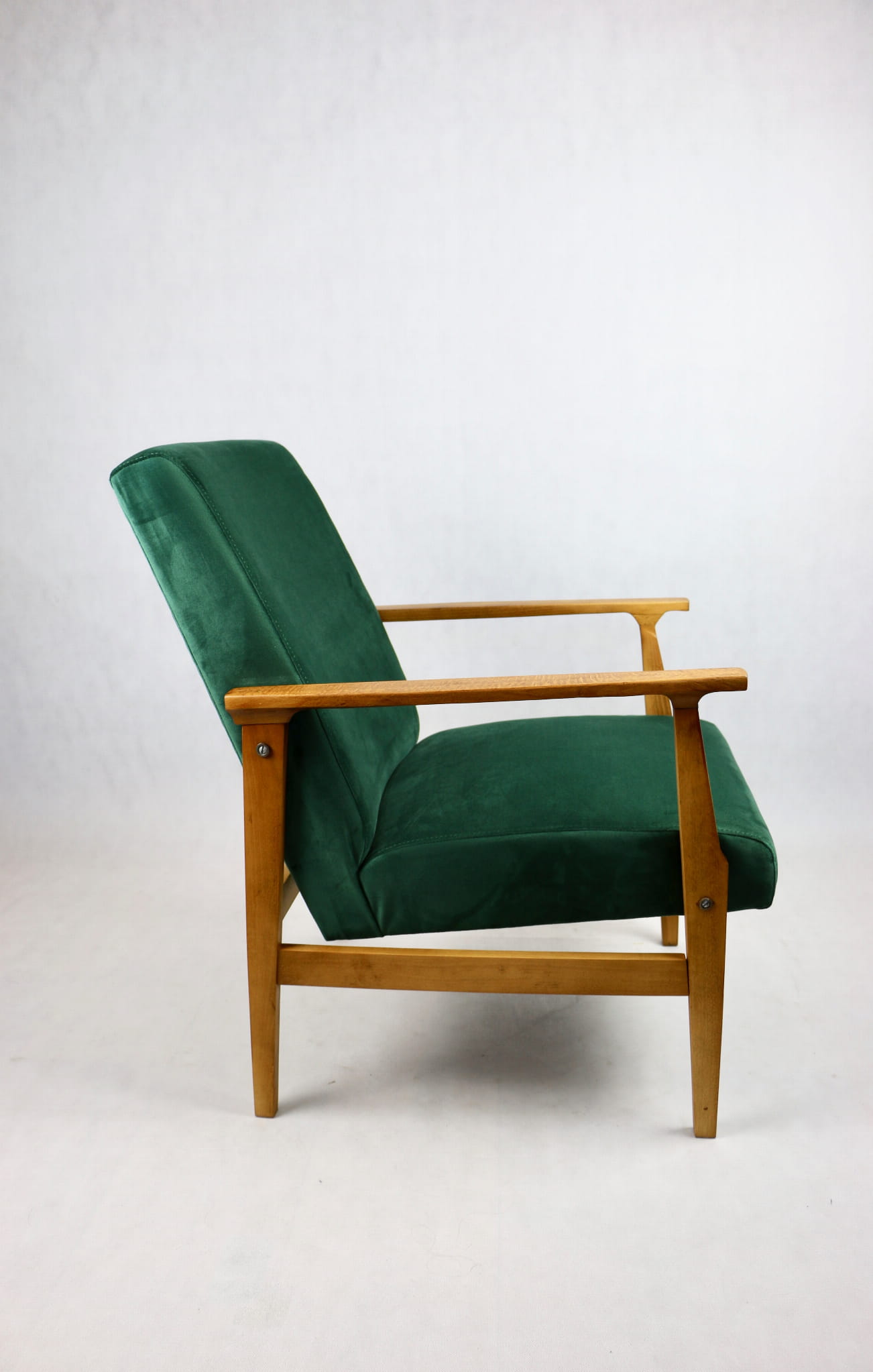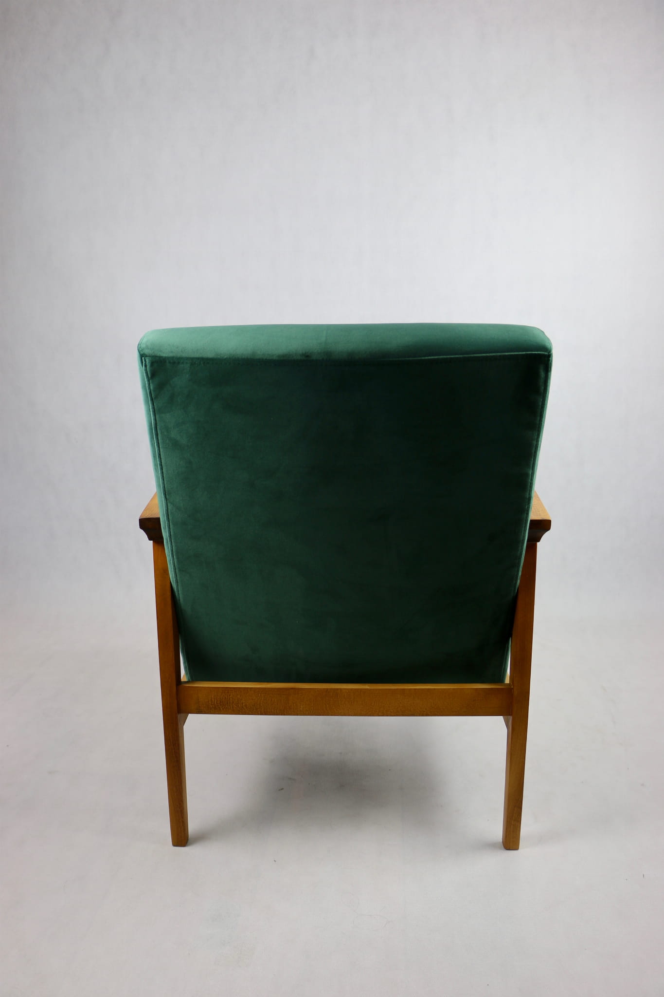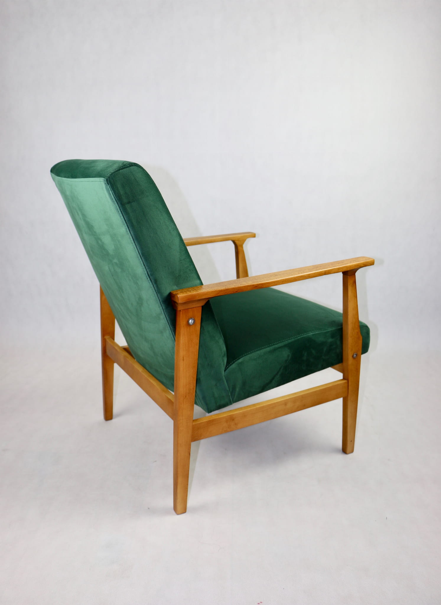 Odrestaurowany fotel, nowe obicie pokryte wysokiej jakości materiałem tapicerskim w kolorze zielonym - seria Paris. Siedzisko na sprężynach, stelaż drewniany połączony z podłokietnikami w naturalnym brązowym kolorze drewna.