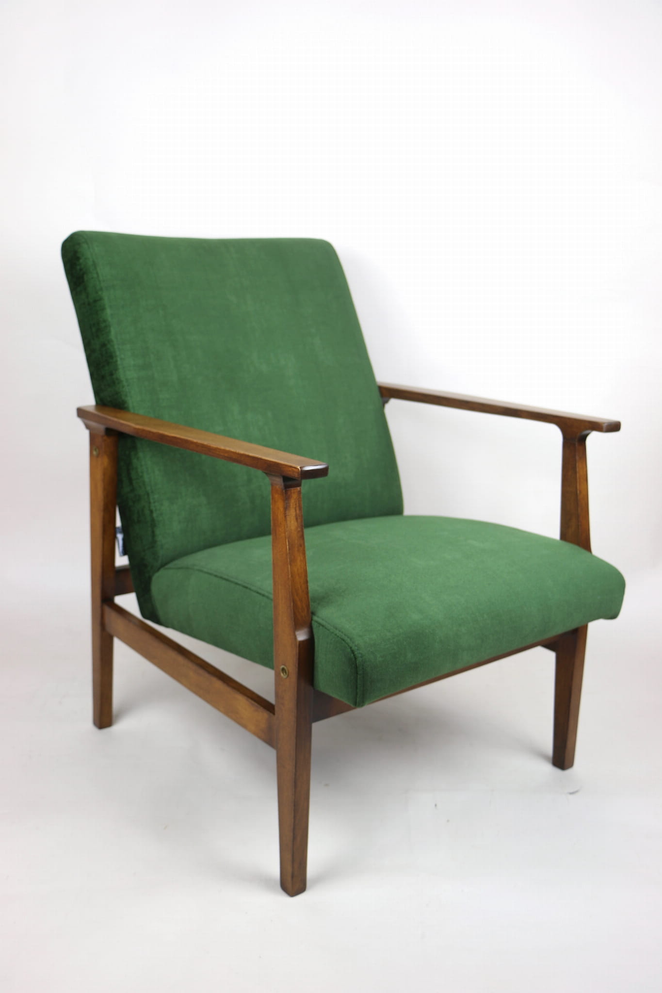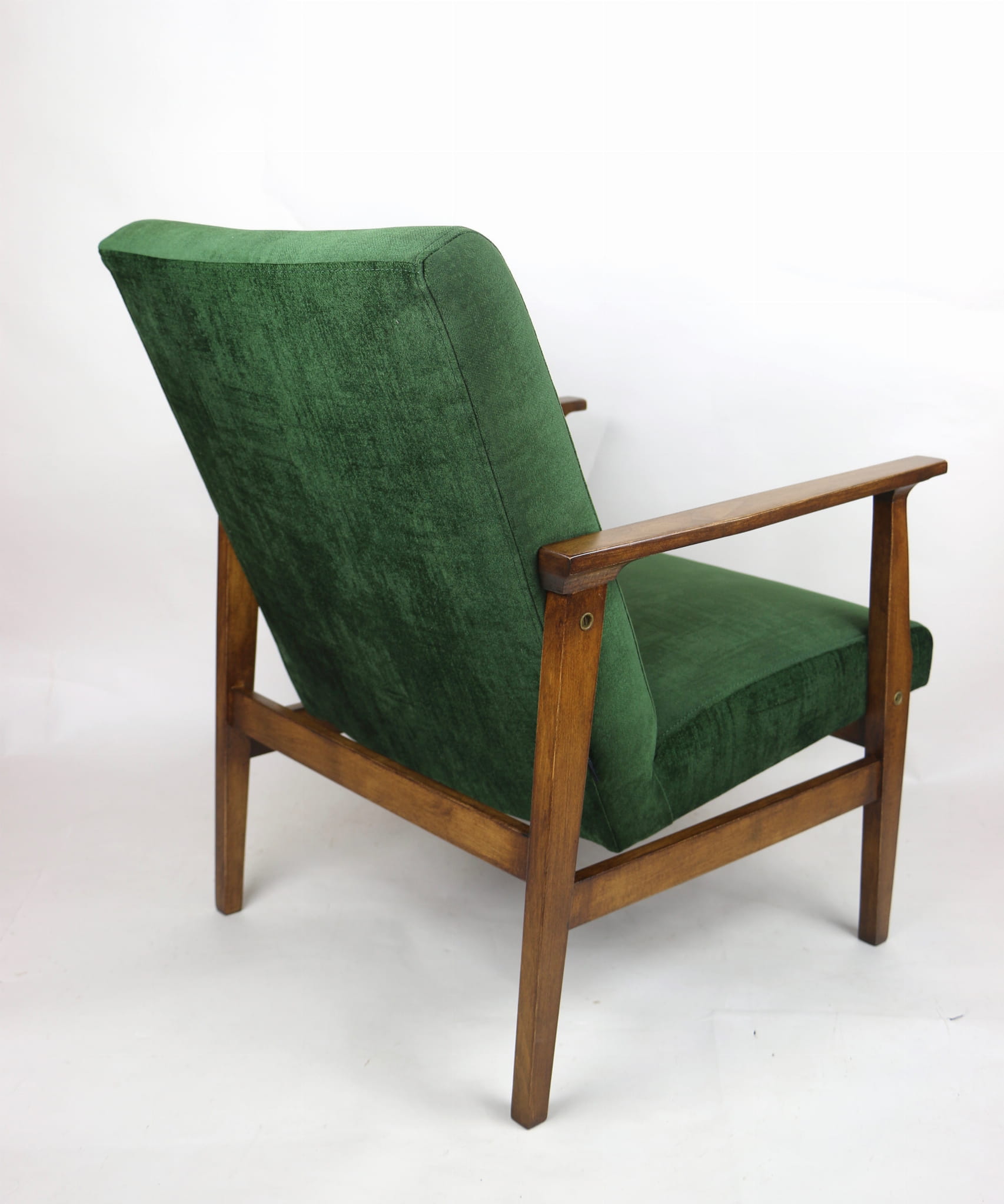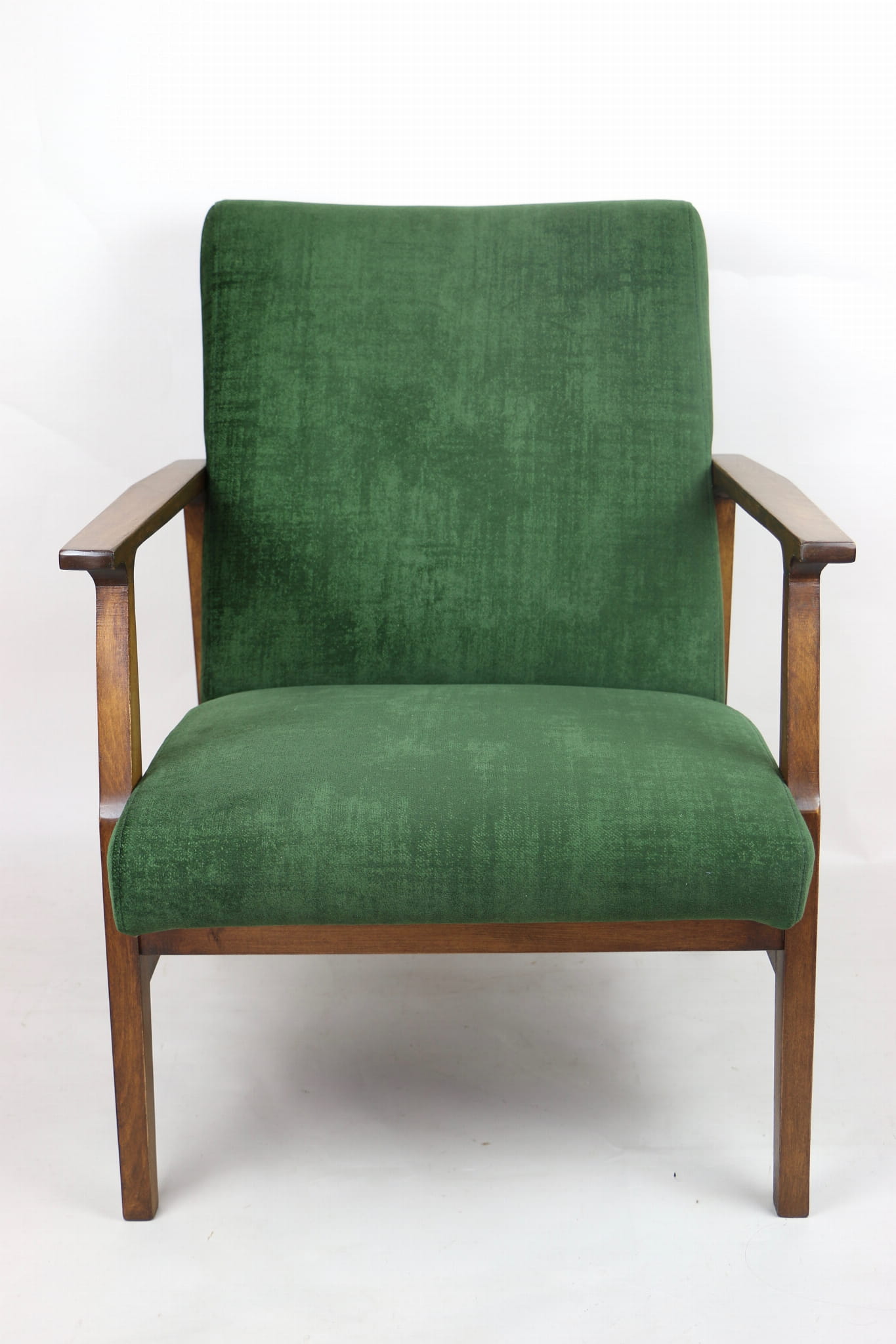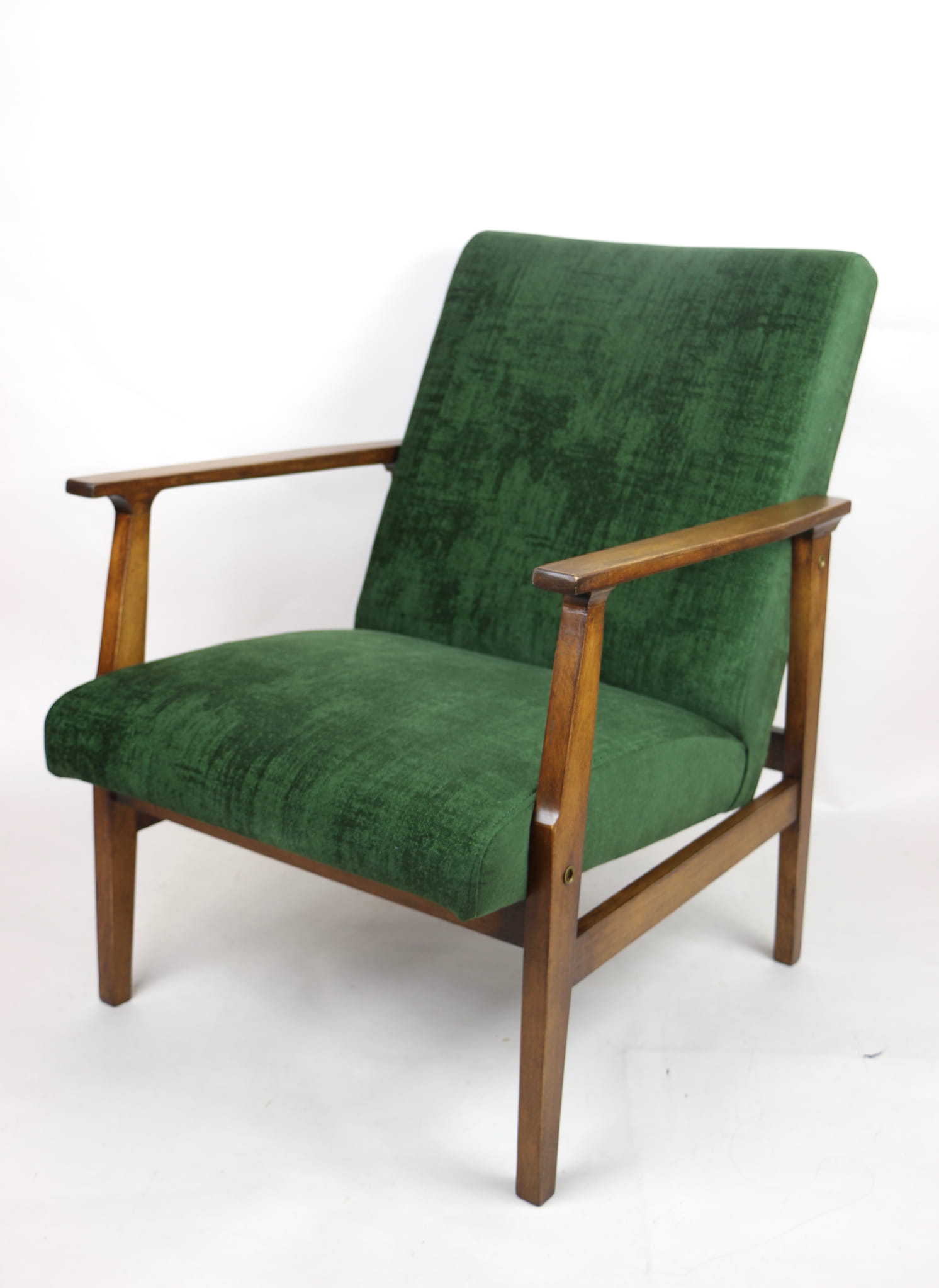 Odrestaurowany fotel, nowe obicie pokryte wysokiej jakości materiałem tapicerskim strukturalnym typu welwet w kolorze zielonym - seria chameleon. Siedzisko na sprężynach, stelaż drewniany połączony z podłokietnikami w naturalnym brązowym kolorze drewna.