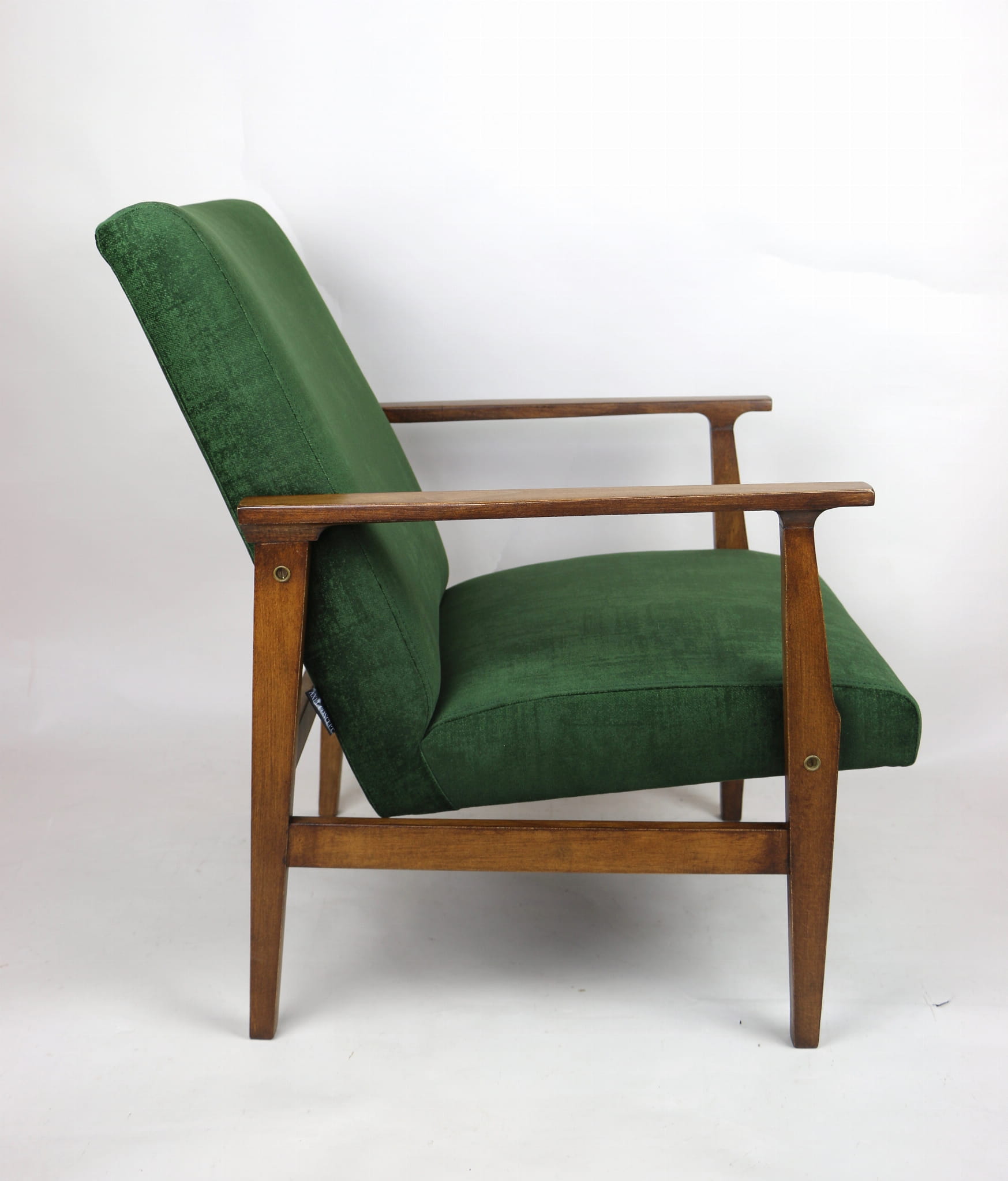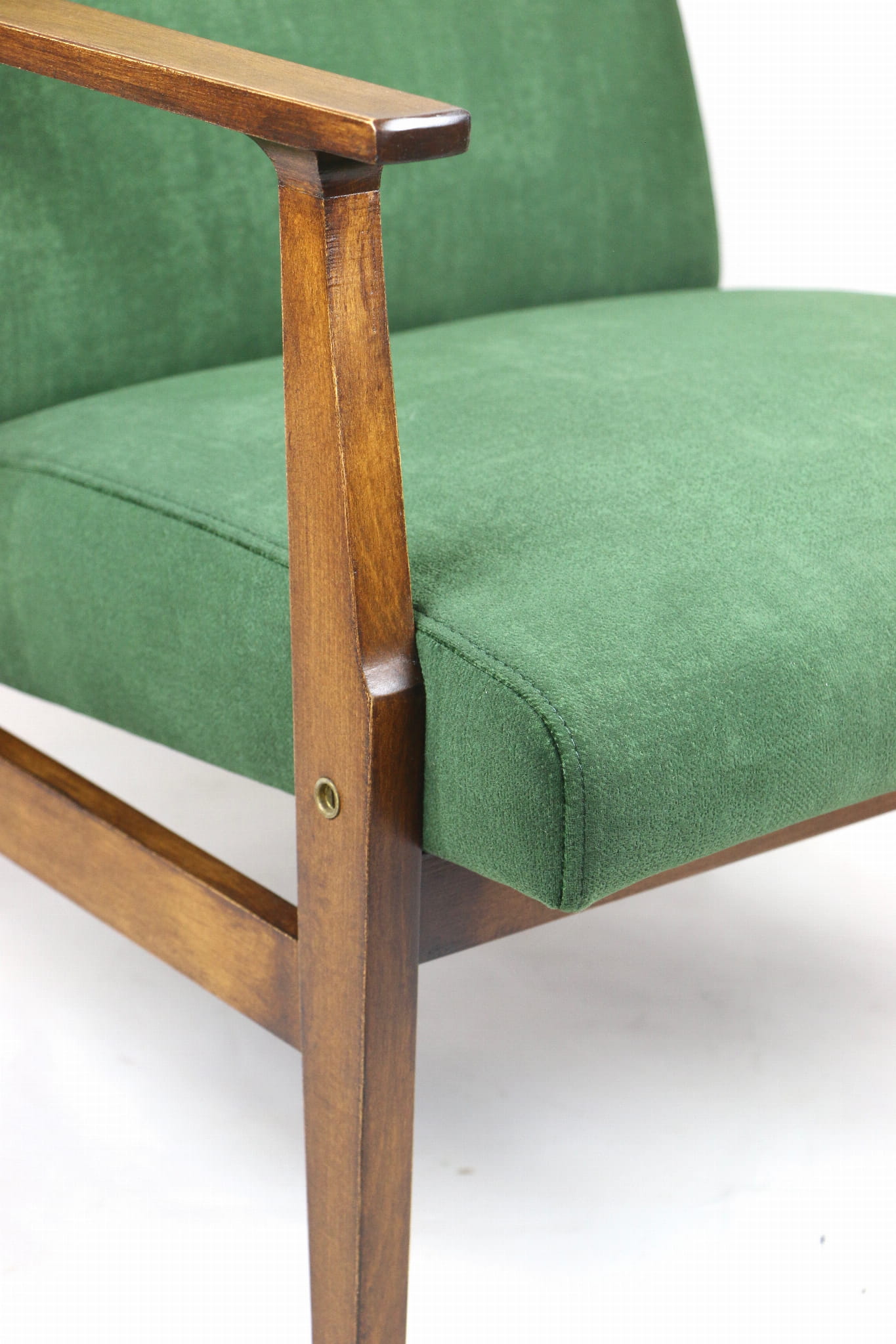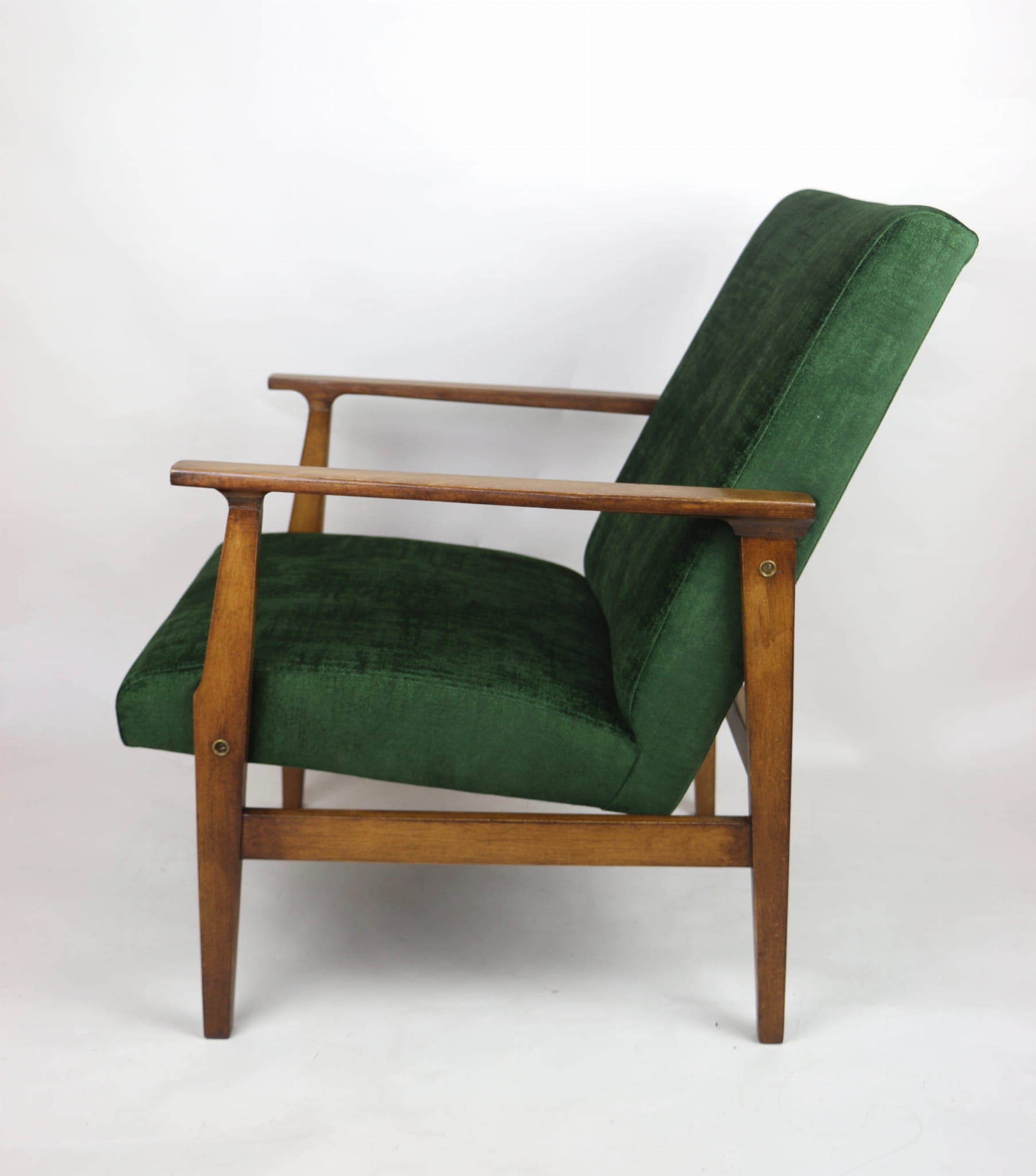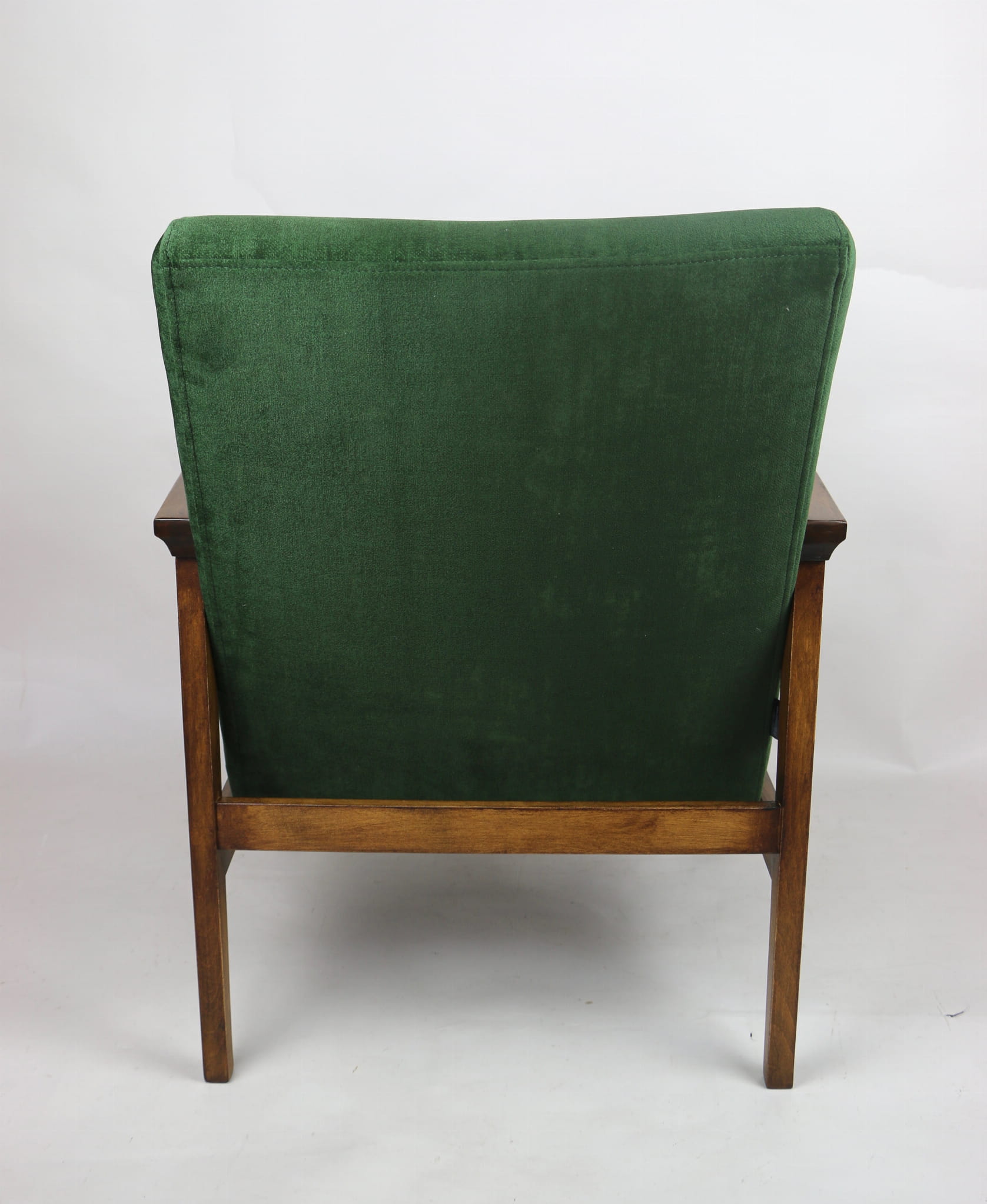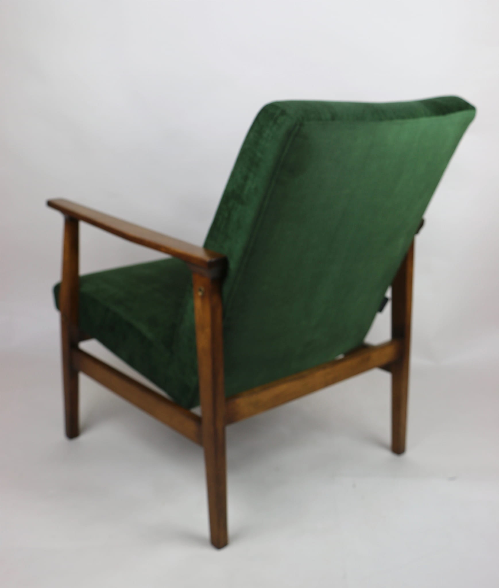 Odrestaurowany fotel, nowe obicie pokryte wysokiej jakości materiałem tapicerskim strukturalnym typu welwet w kolorze zielonym - seria chameleon. Siedzisko na sprężynach, stelaż drewniany połączony z podłokietnikami w naturalnym brązowym kolorze drewna.