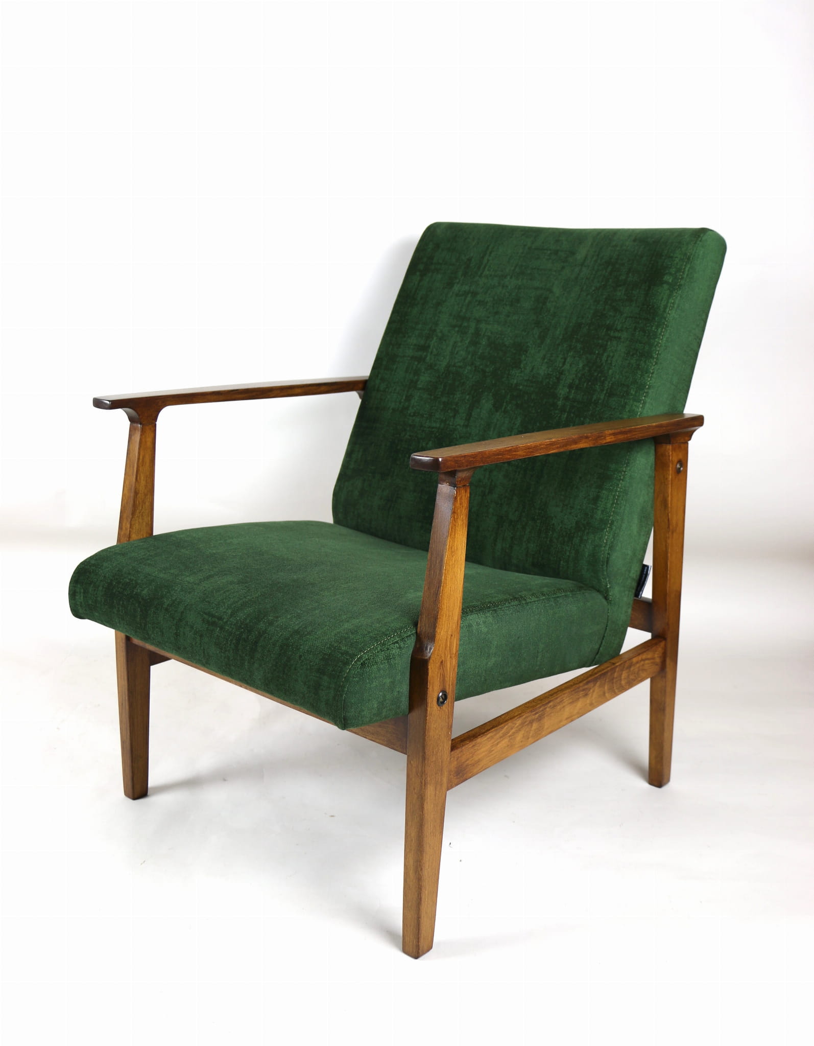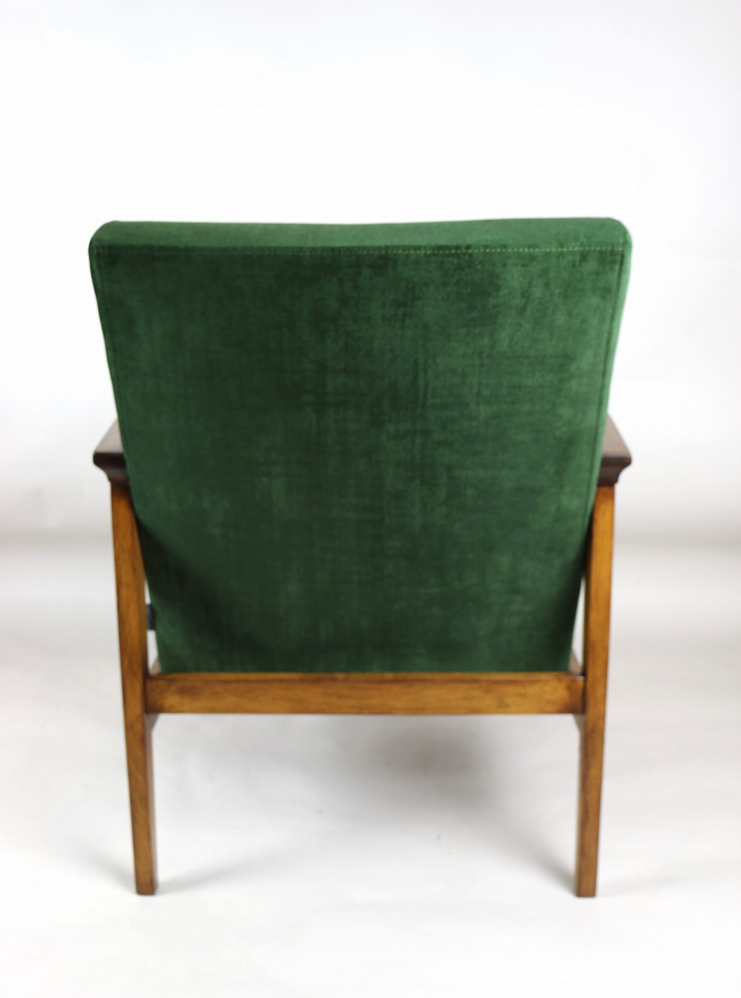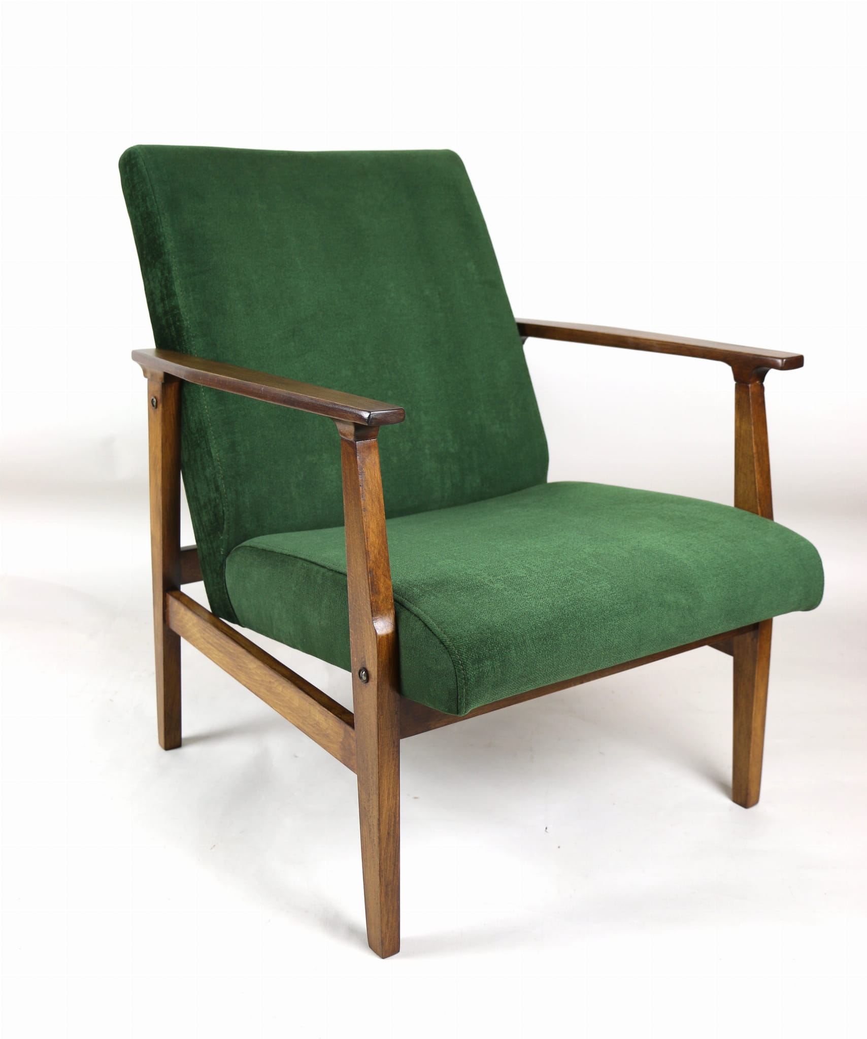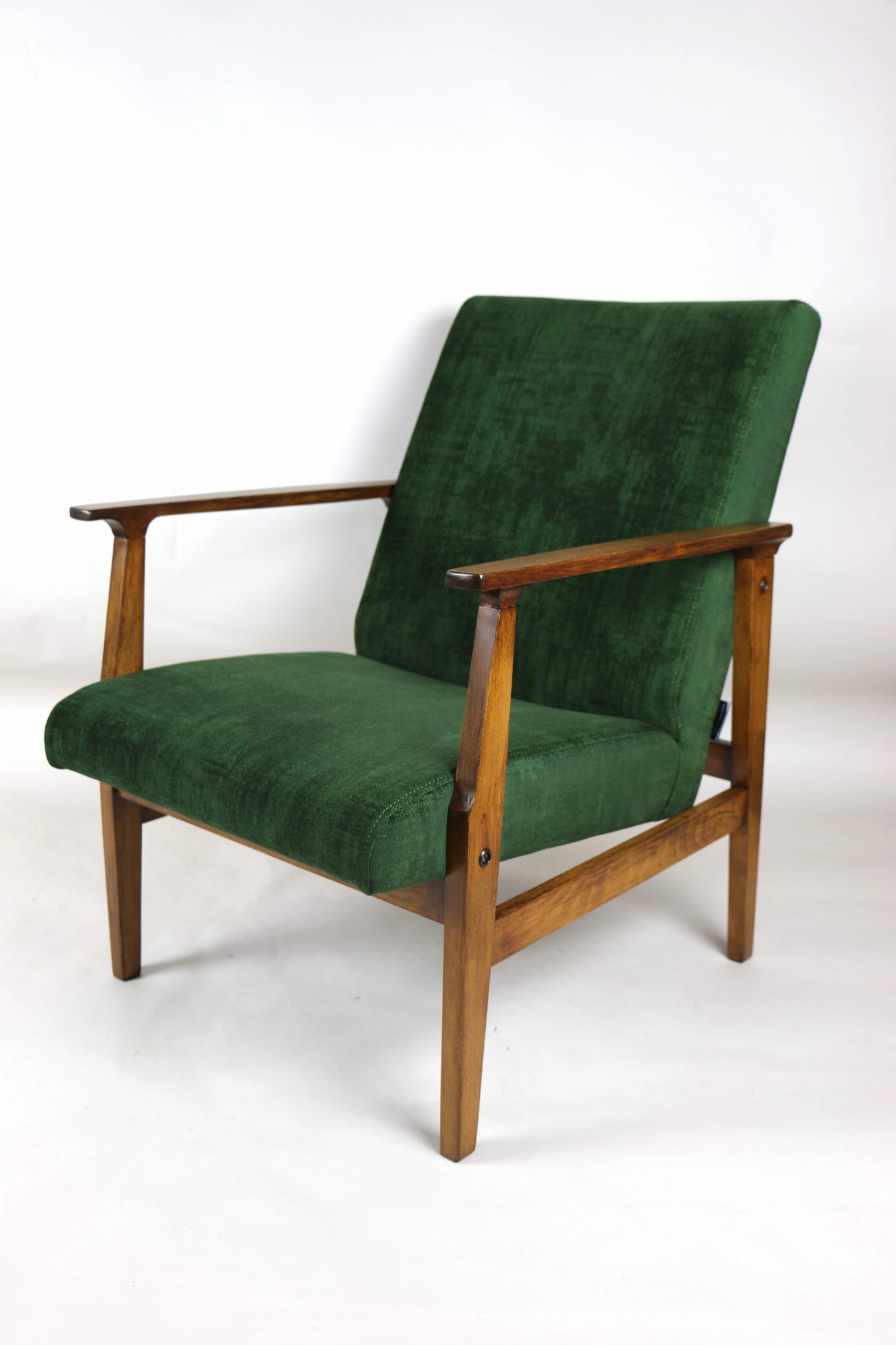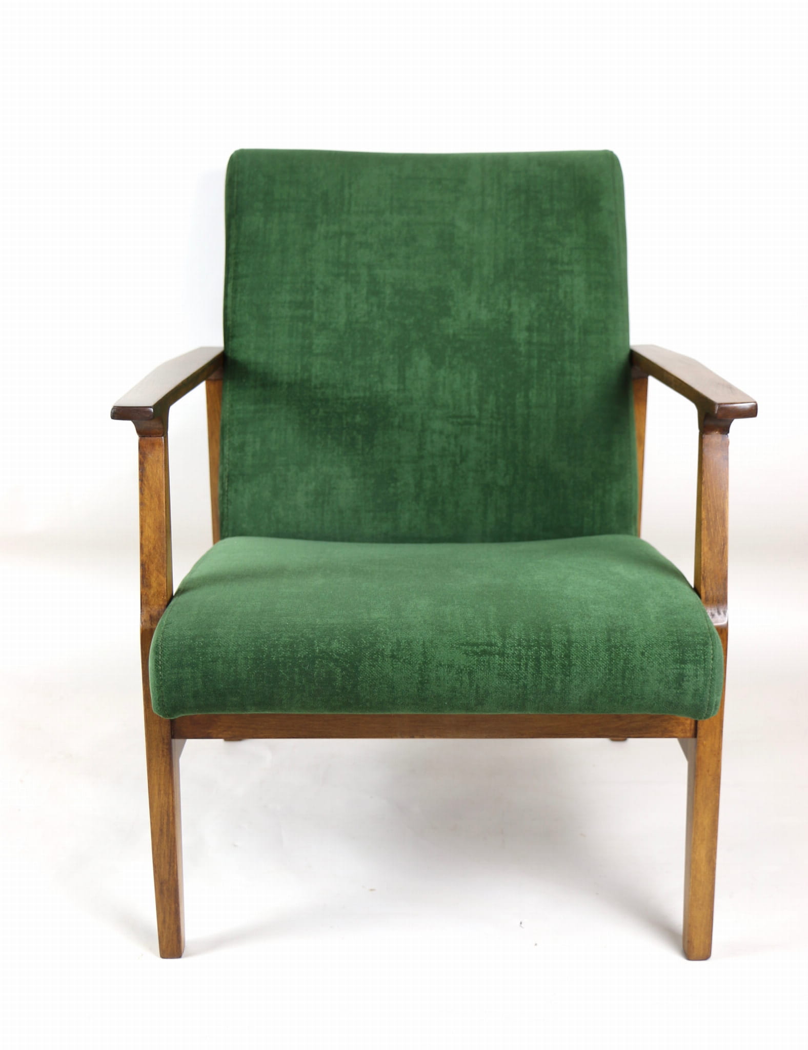 Odrestaurowany fotel, nowe obicie pokryte wysokiej jakości materiałem tapicerskim strukturalnym typu welwet w kolorze zielonym - seria chameleon. Siedzisko na pasach, stelaż drewniany połączony z podłokietnikami w ciemnym brązowym kolorze drewna.