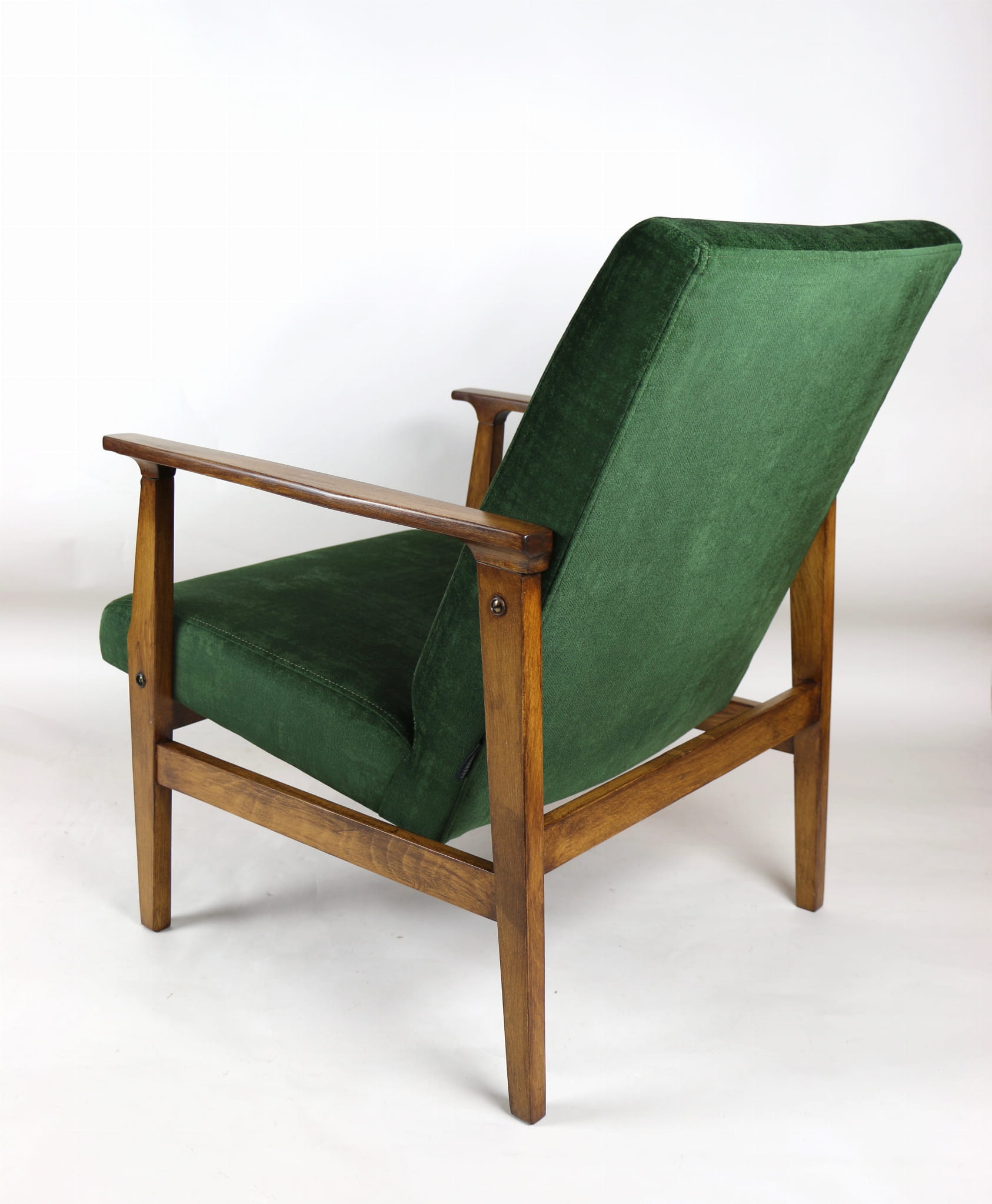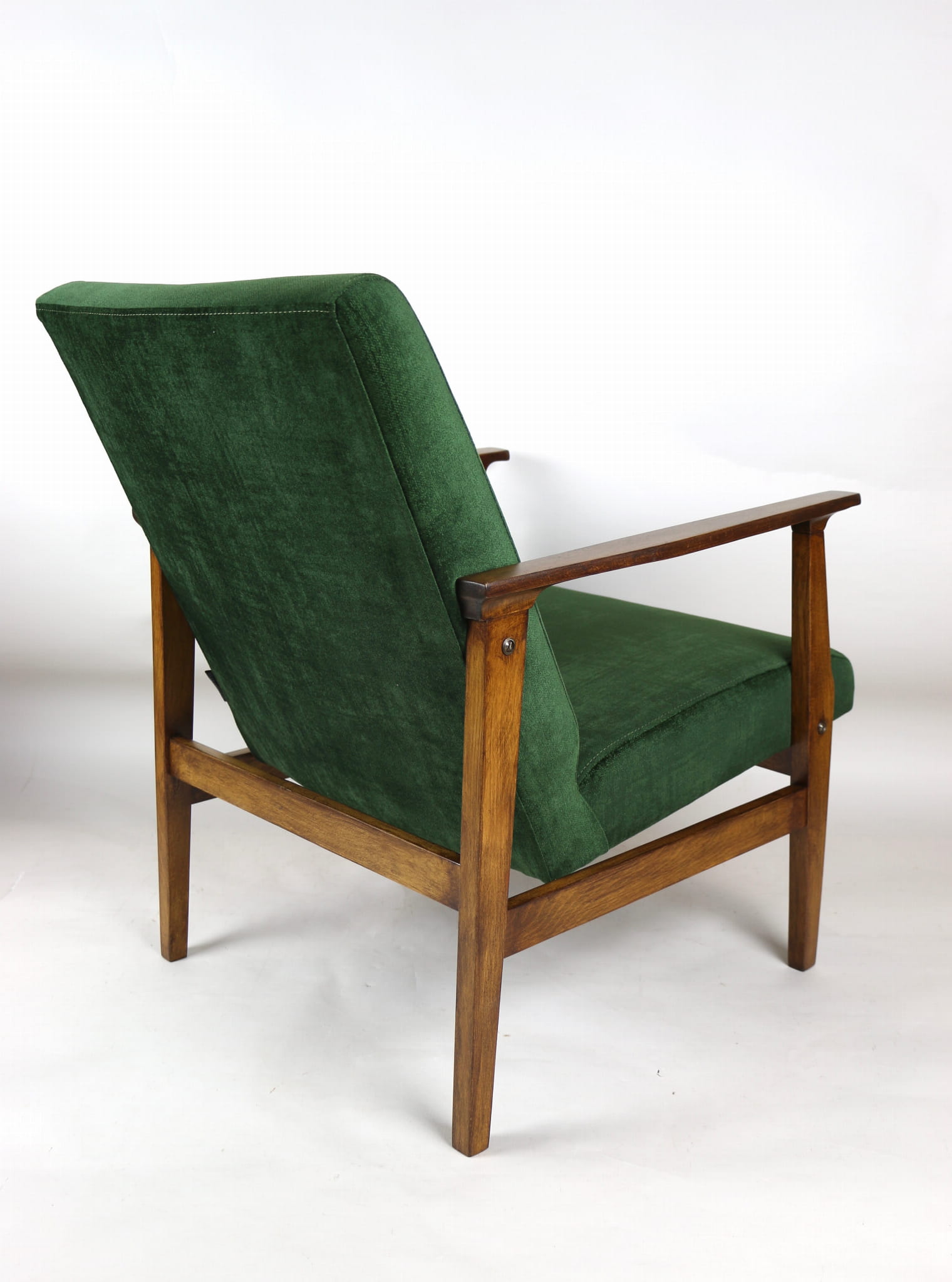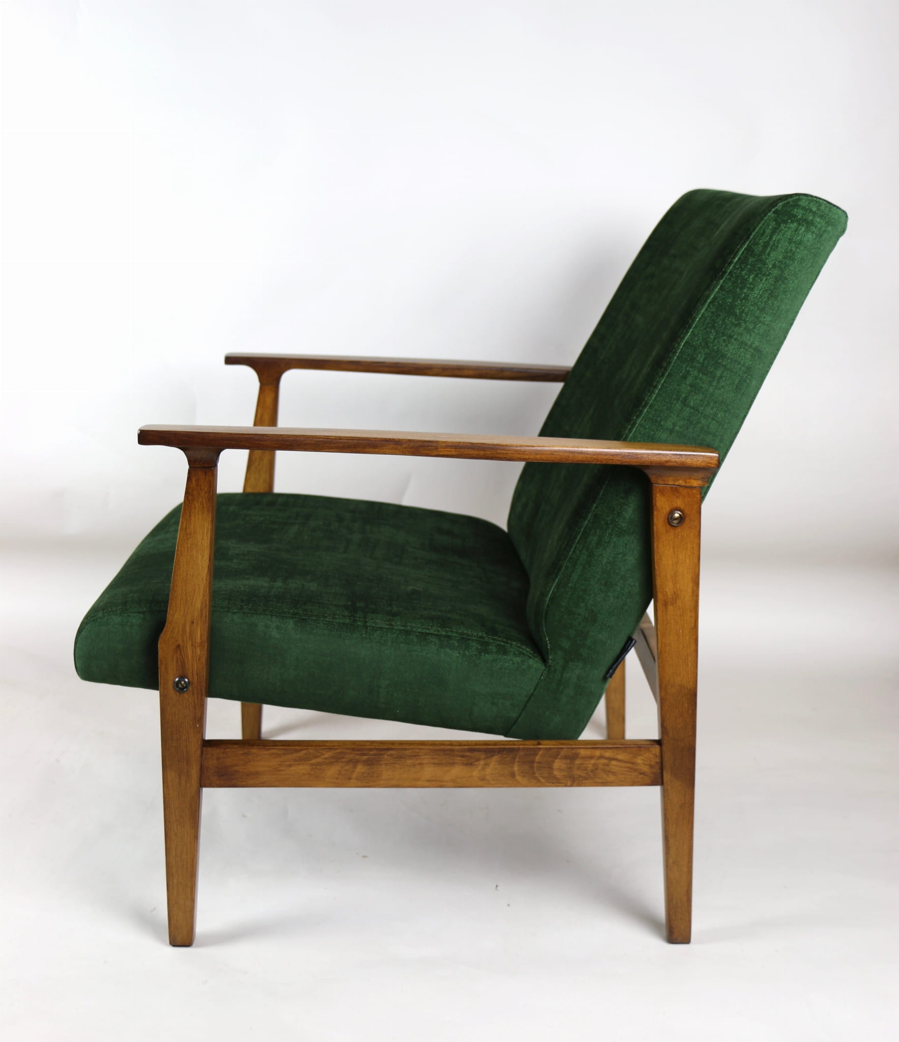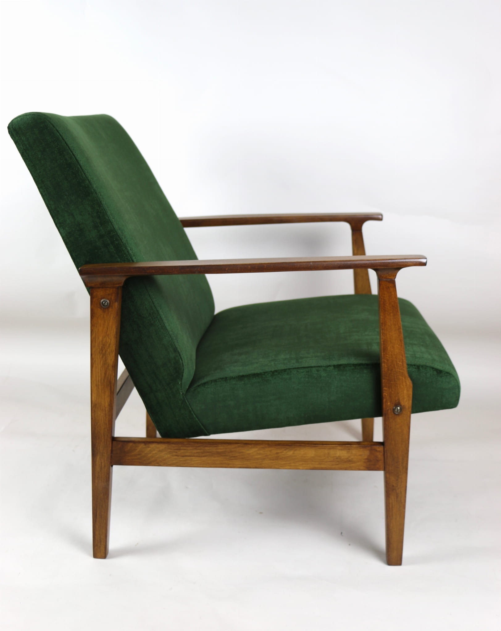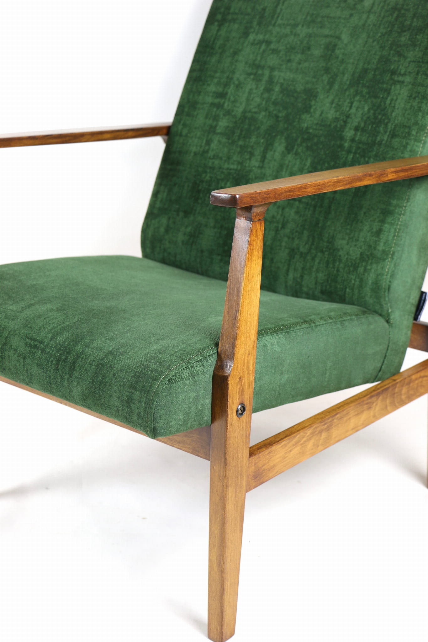 Odrestaurowany fotel, nowe obicie pokryte wysokiej jakości materiałem tapicerskim strukturalnym typu welwet w kolorze zielonym - seria chameleon. Siedzisko na pasach, stelaż drewniany połączony z podłokietnikami w ciemnym brązowym kolorze drewna.