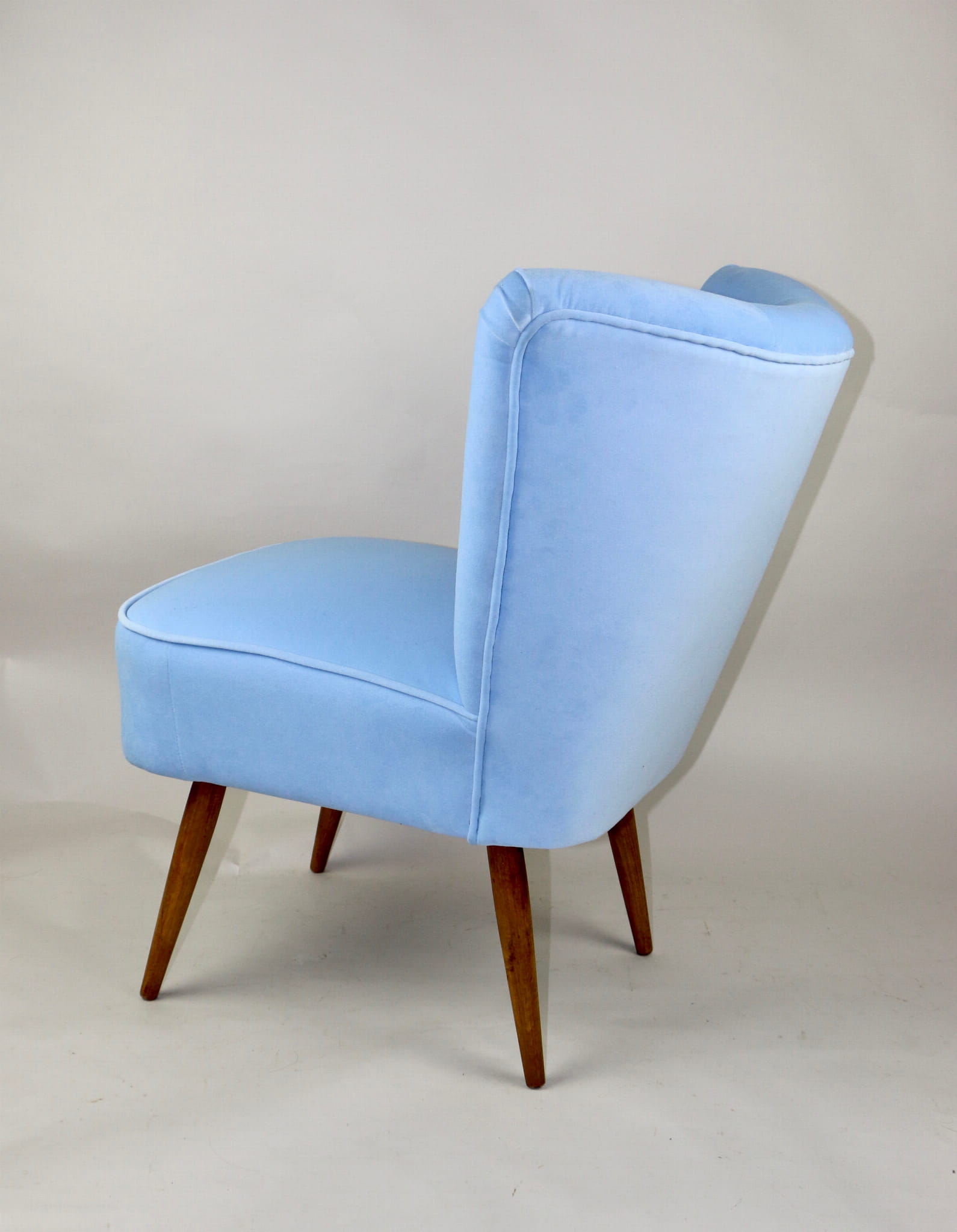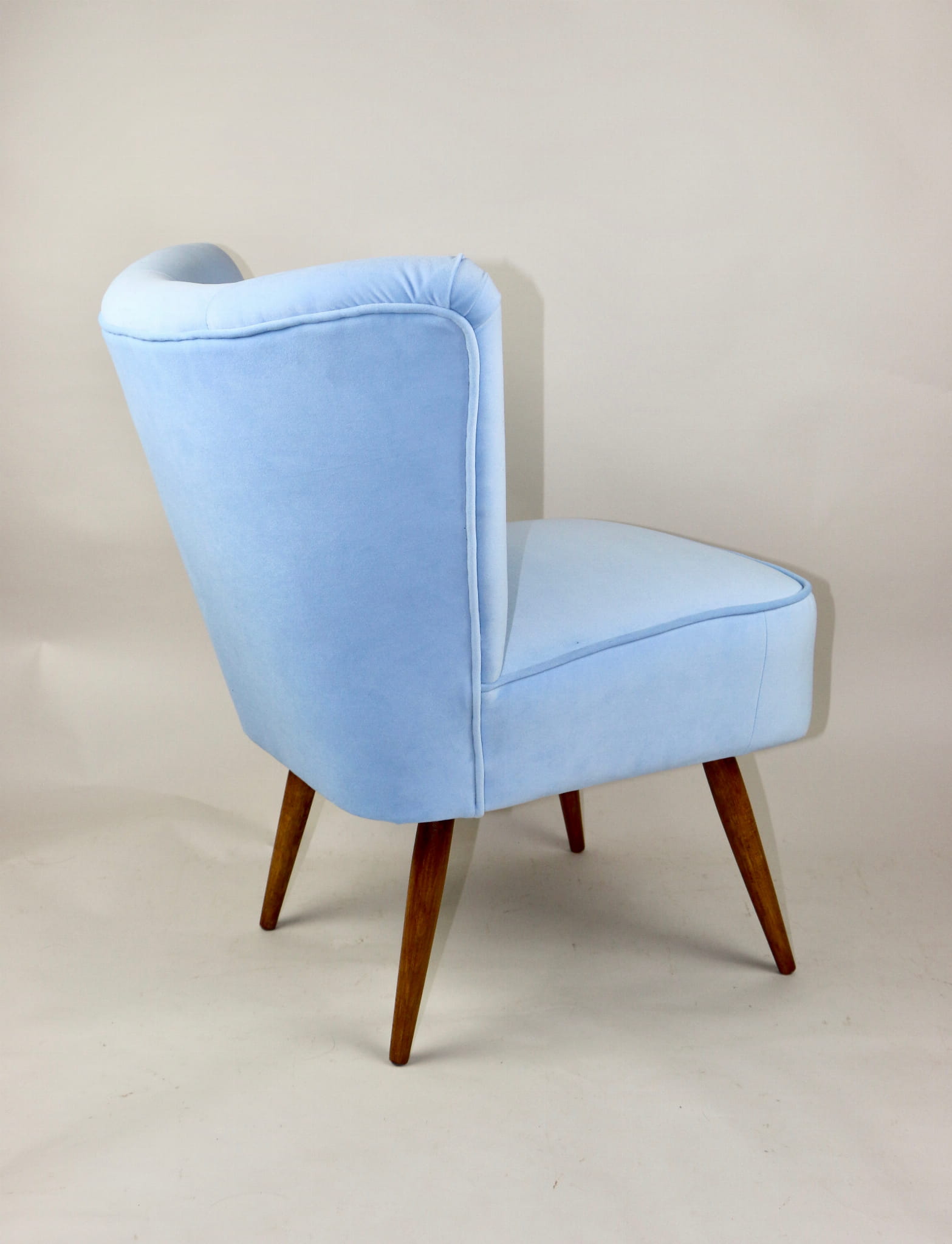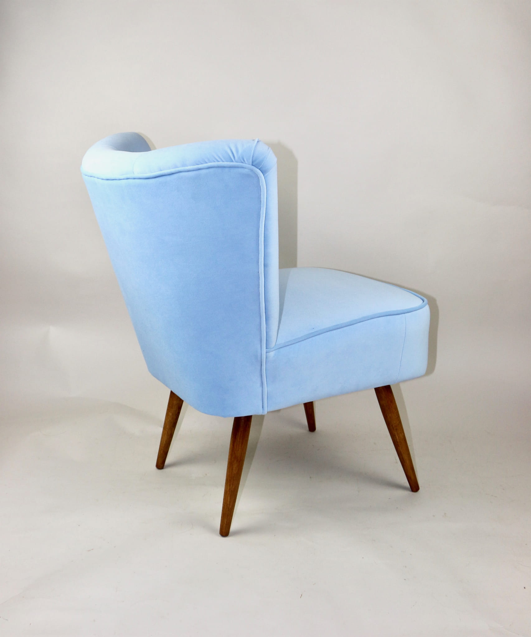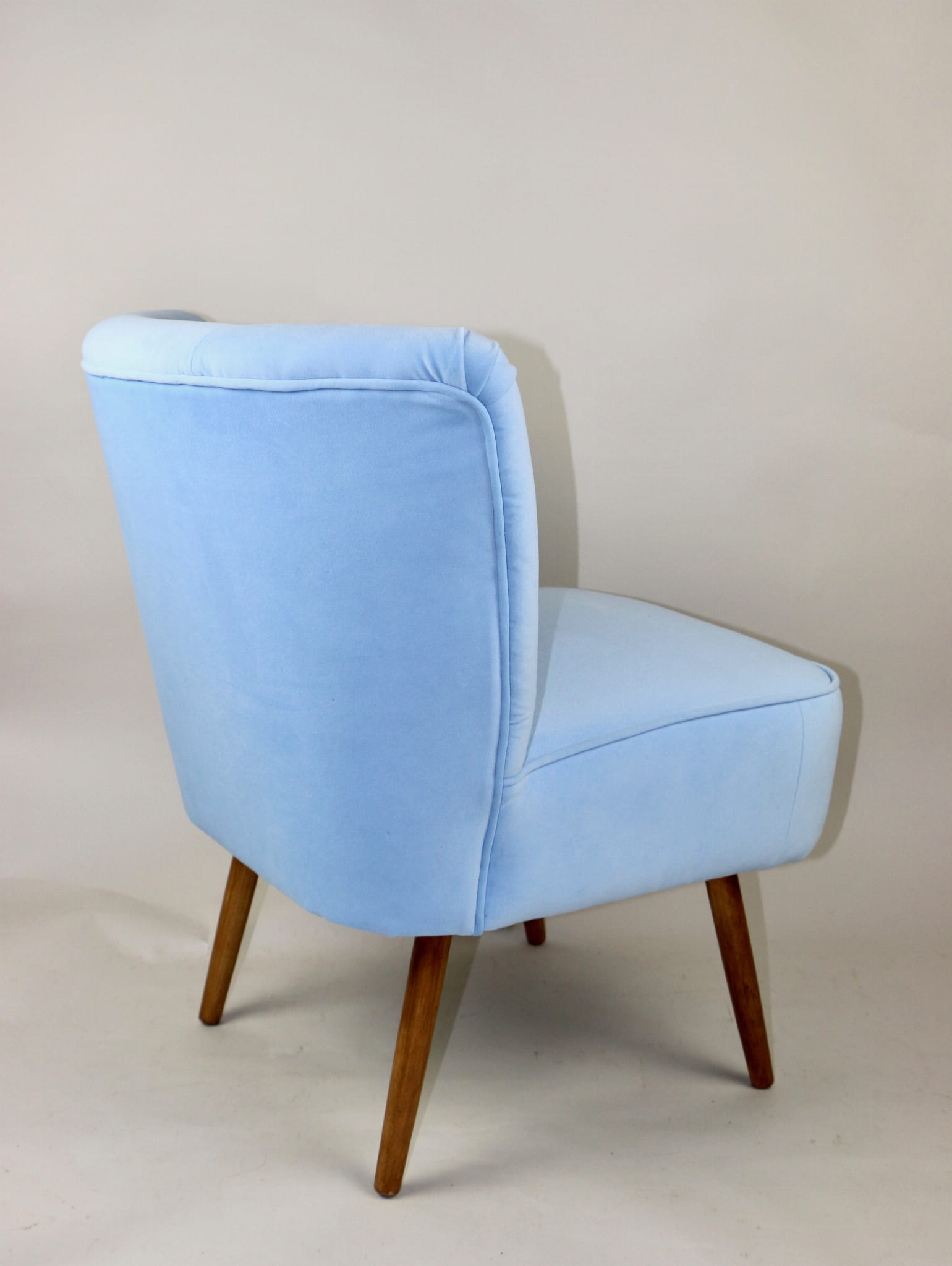 Fotel klubowy z lat 70, kompletnie odrestaurowany. Nowa tapicerka wraz z wypełnieniem w kolorze błękitnym wykończona aksamitną lamówką, siedzisko na sprężynach, nóżki bukowe lakierowane lakiero-bejcą. Tkanina welwet easy to clean - Jade 612.