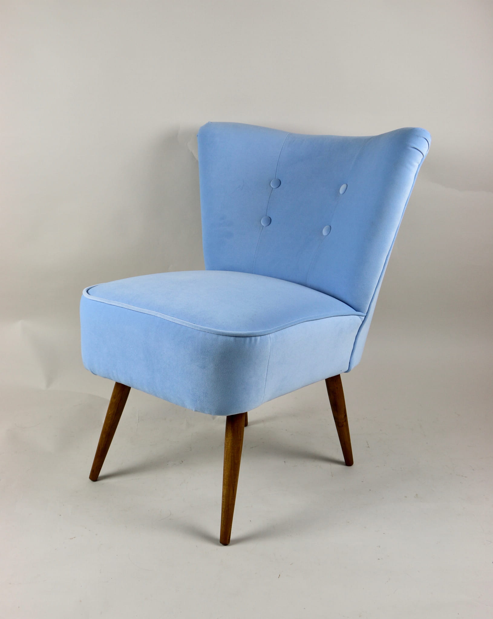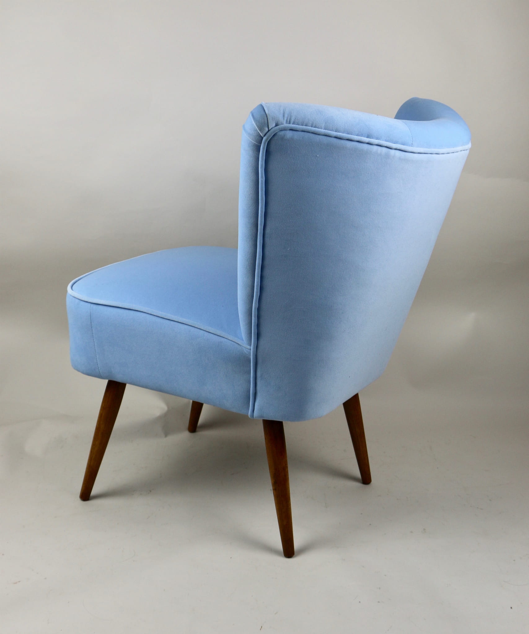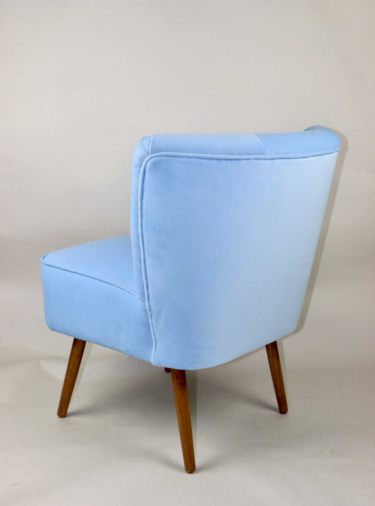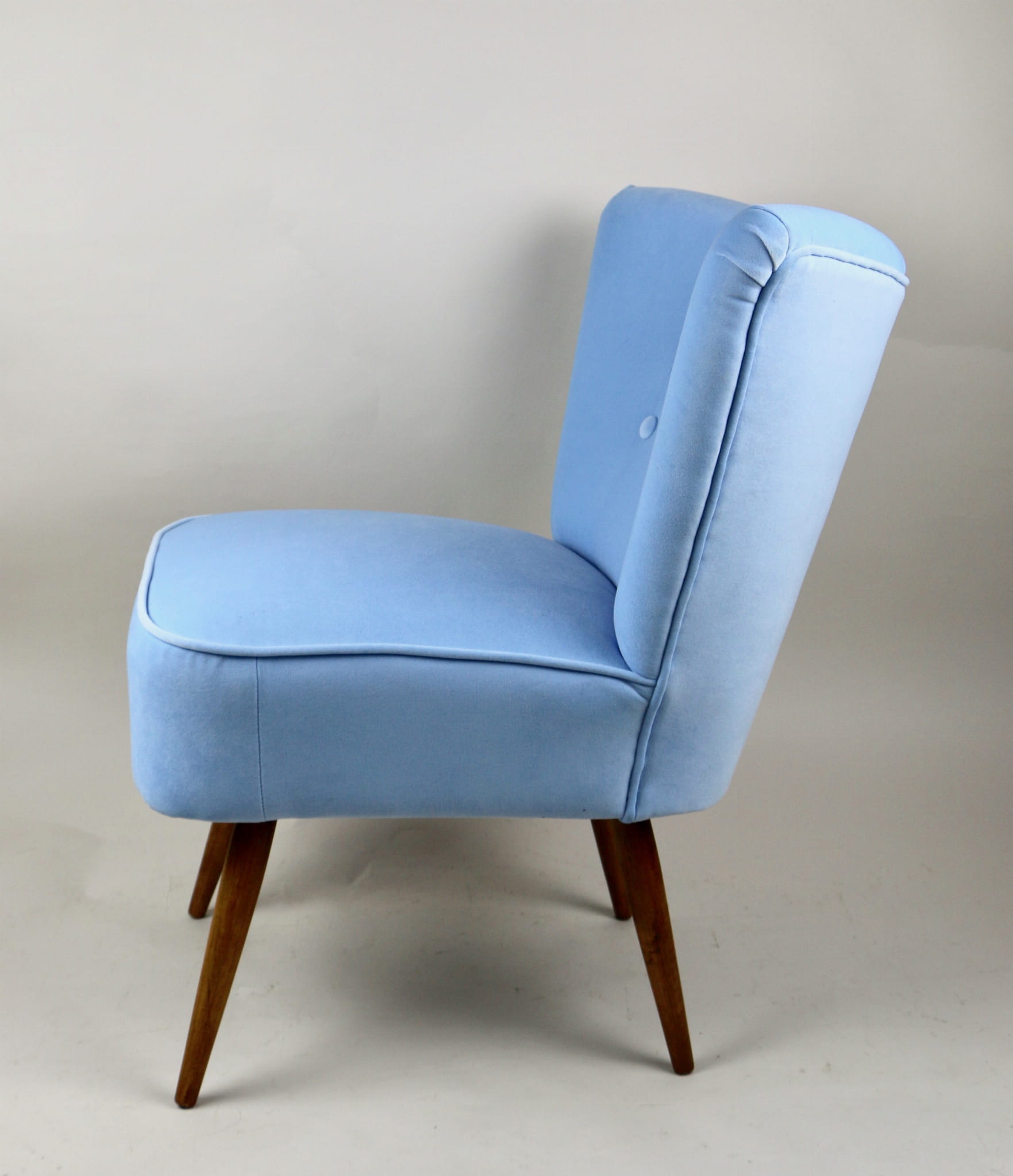 Fotel klubowy z lat 70, kompletnie odrestaurowany. Nowa tapicerka wraz z wypełnieniem w kolorze błękitnym wykończona aksamitną lamówką, siedzisko na sprężynach, nóżki bukowe lakierowane lakiero-bejcą. Tkanina welwet easy to clean - Jade 612.