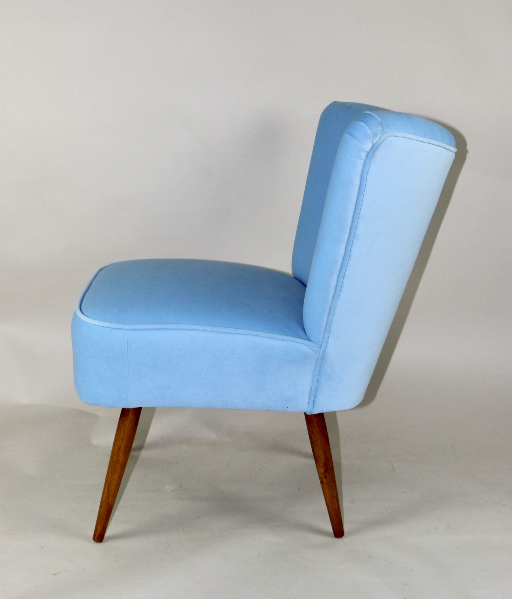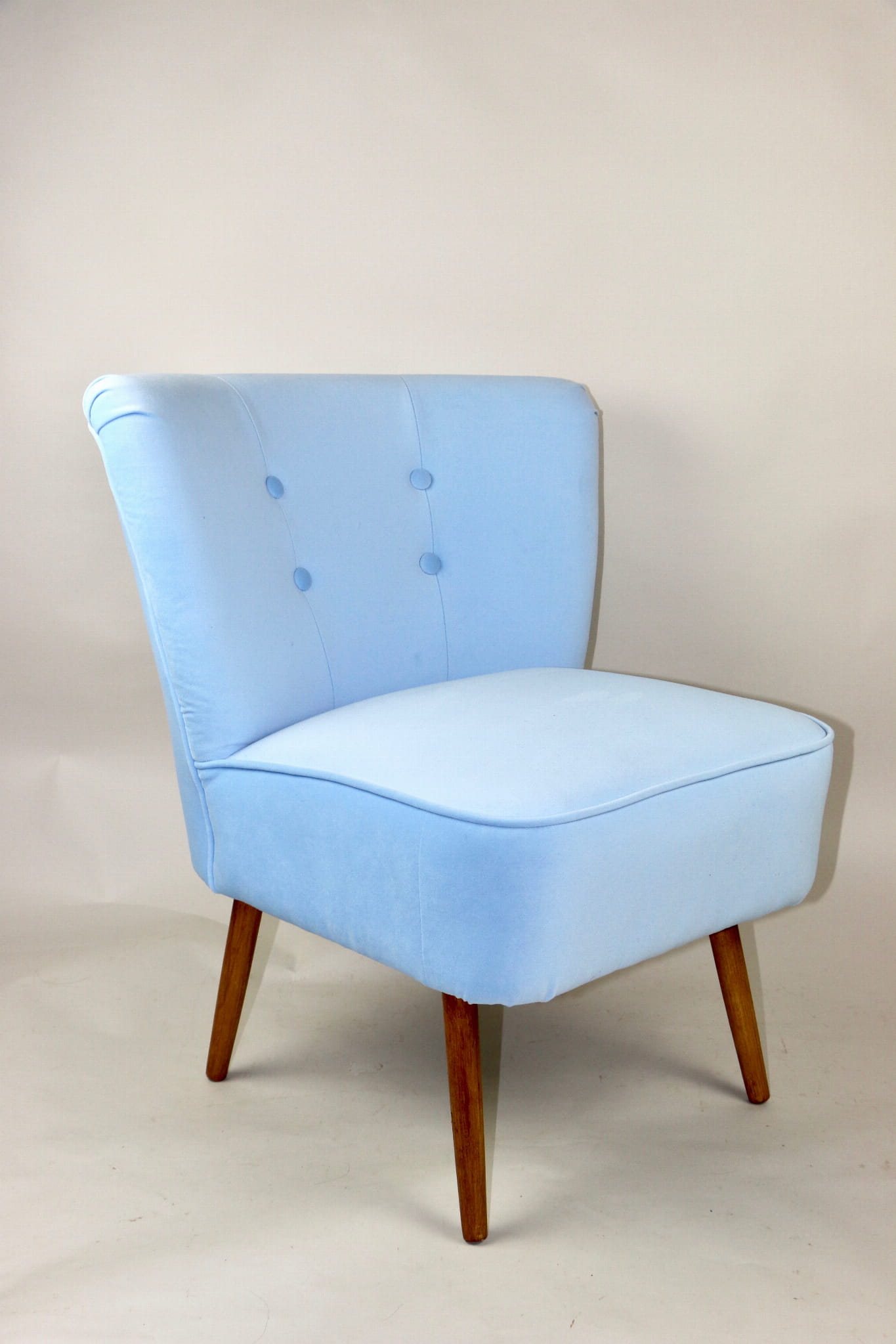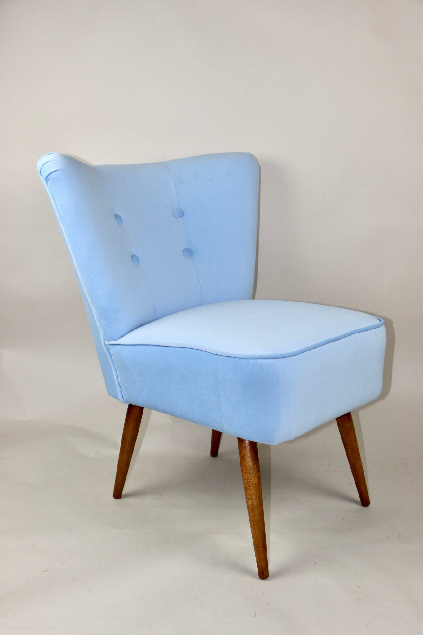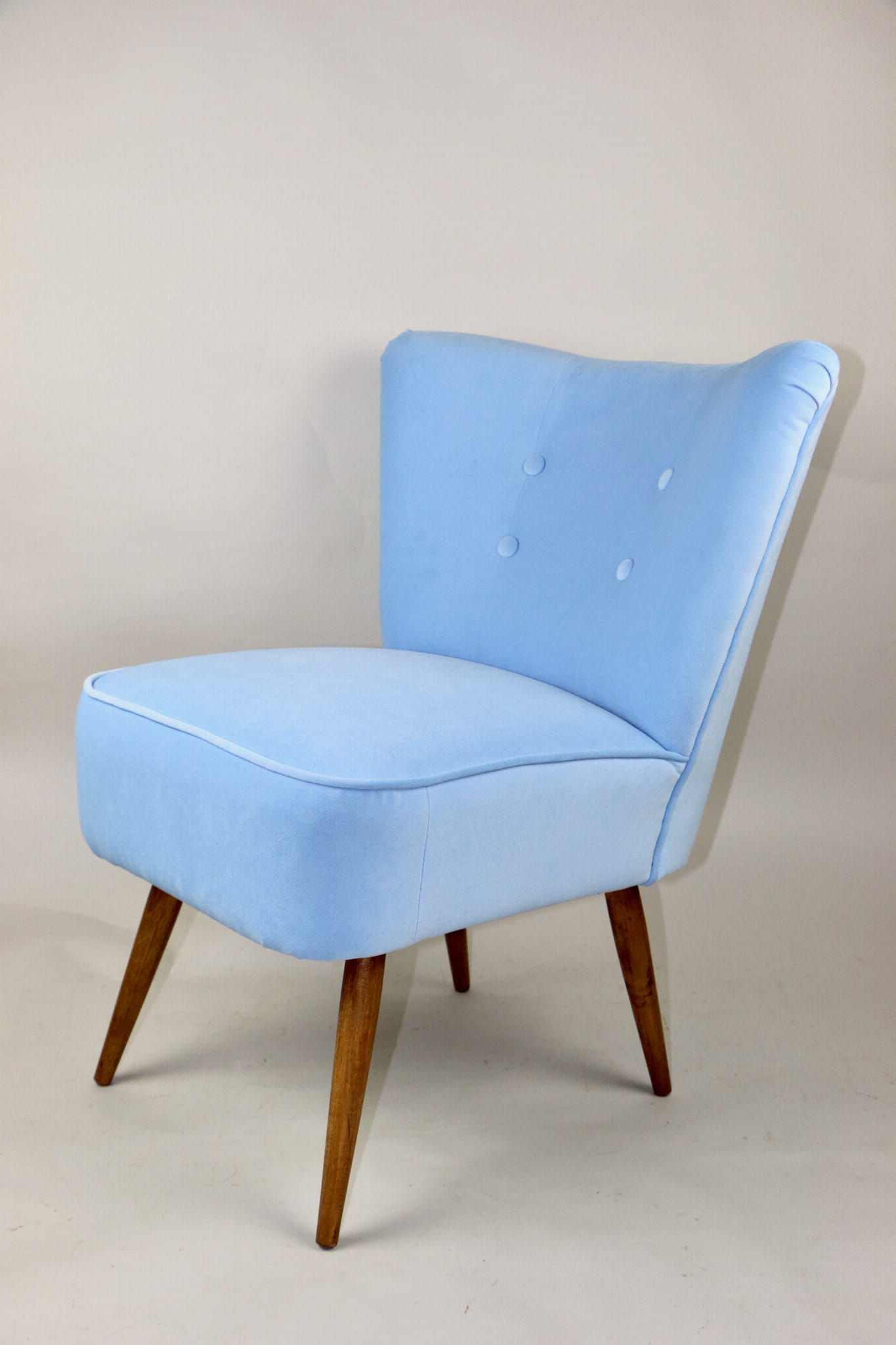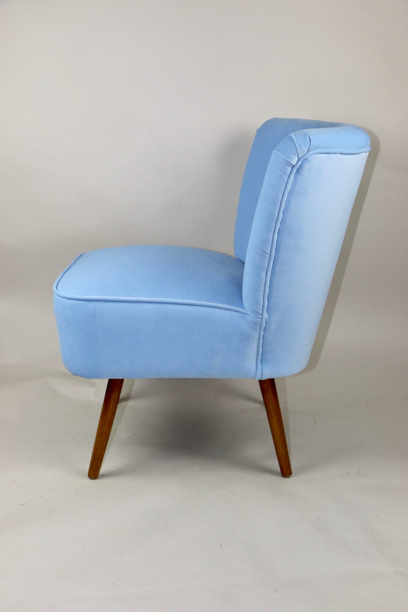 Fotel klubowy z lat 70, kompletnie odrestaurowany. Nowa tapicerka wraz z wypełnieniem w kolorze błękitnym wykończona aksamitną lamówką, siedzisko na sprężynach, nóżki bukowe lakierowane lakiero-bejcą. Tkanina welwet easy to clean - Jade 612.