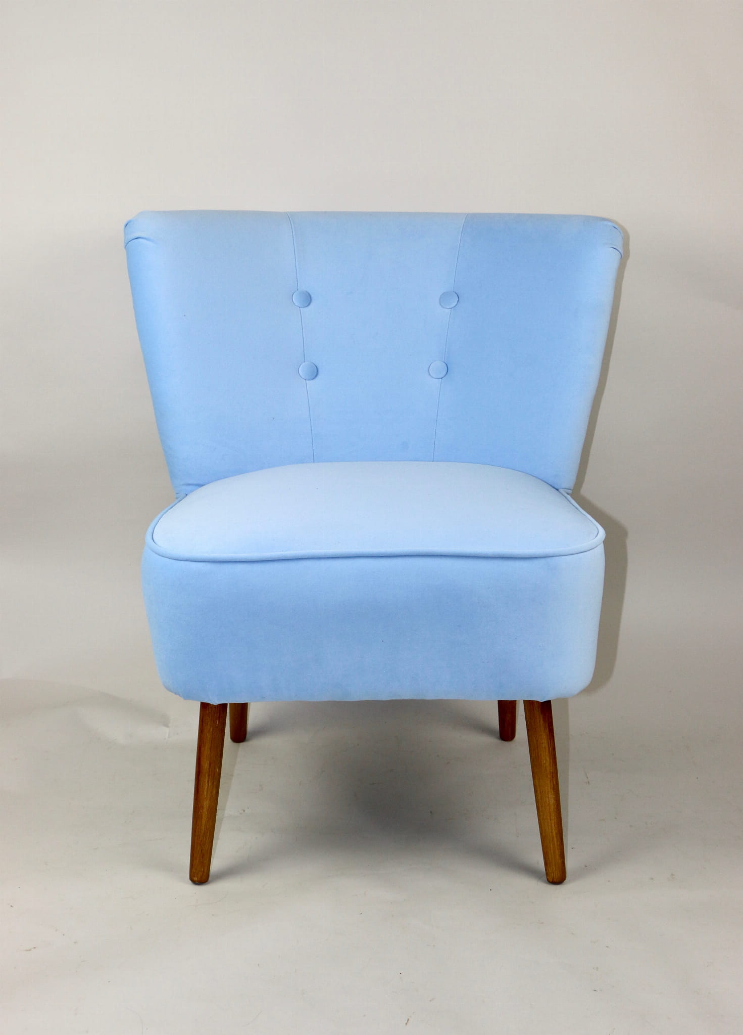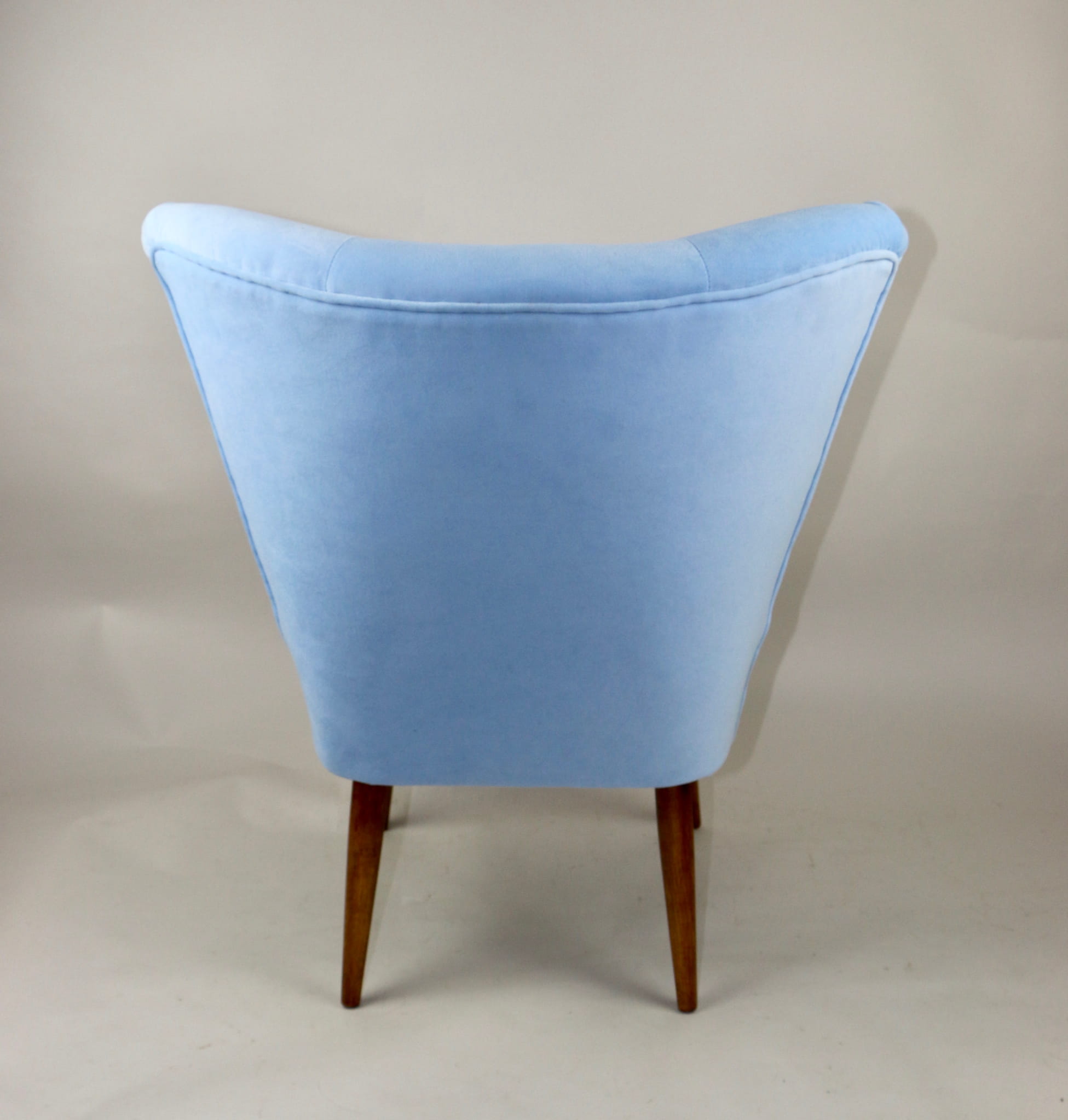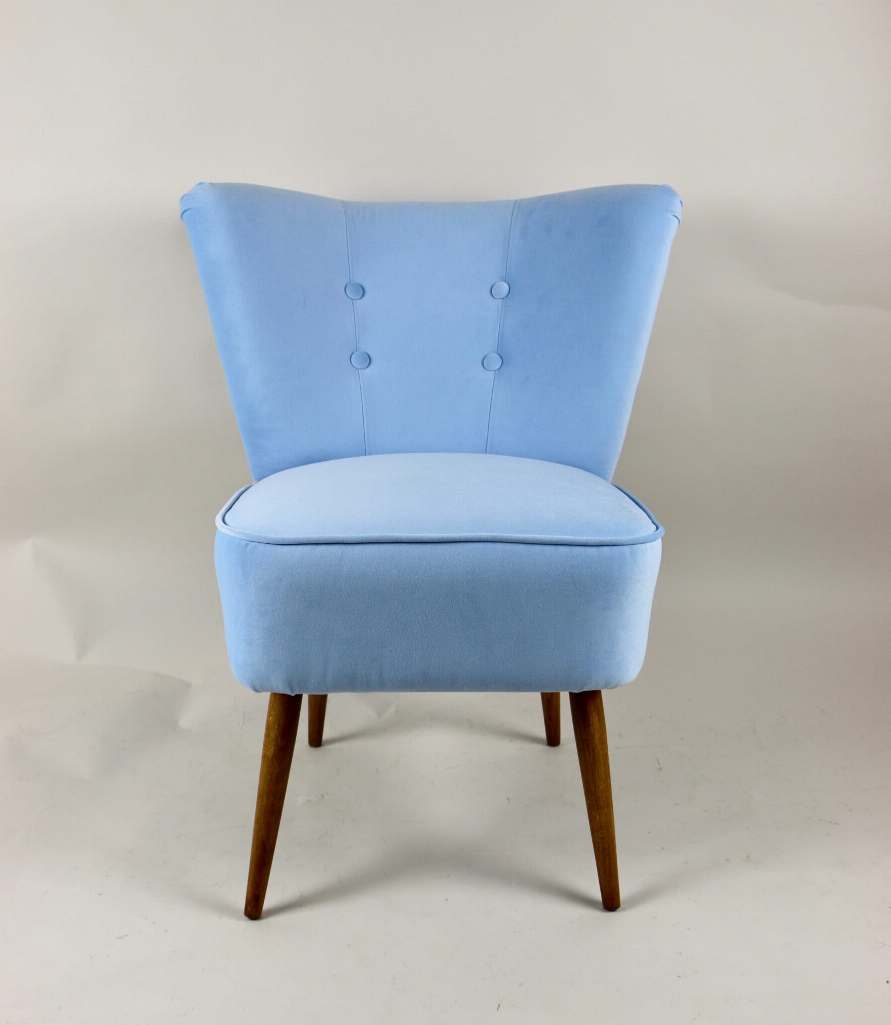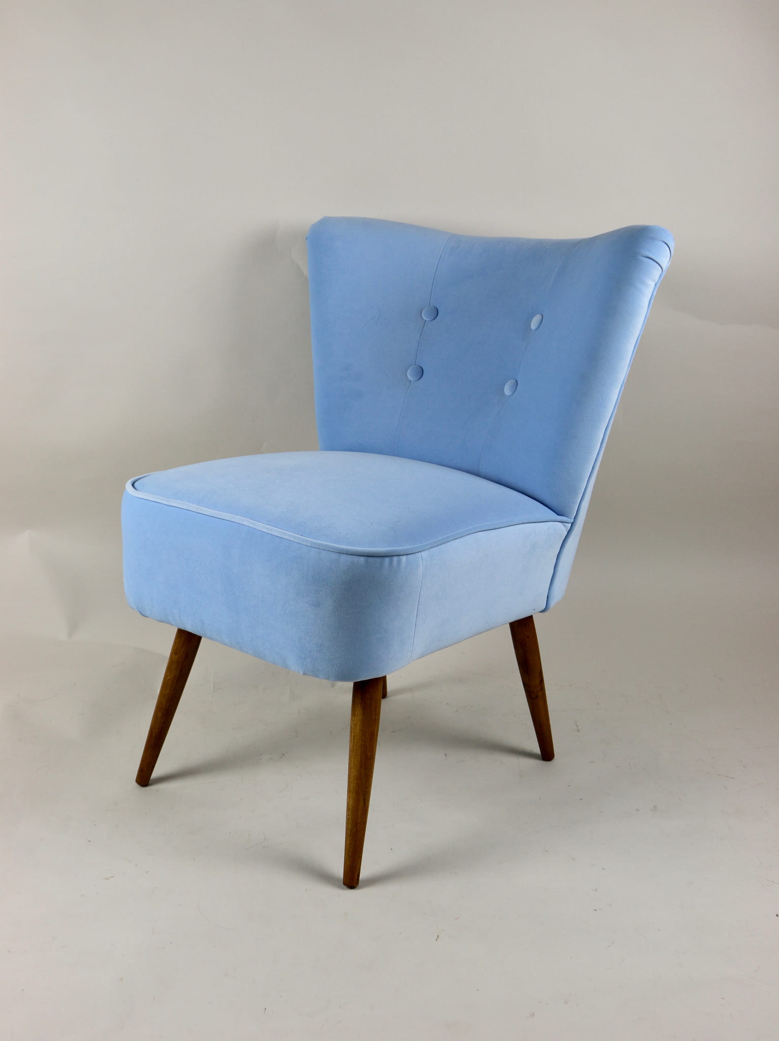 Fotel klubowy z lat 70, kompletnie odrestaurowany. Nowa tapicerka wraz z wypełnieniem w kolorze błękitnym wykończona aksamitną lamówką, siedzisko na sprężynach, nóżki bukowe lakierowane lakiero-bejcą. Tkanina welwet easy to clean - Jade 612.