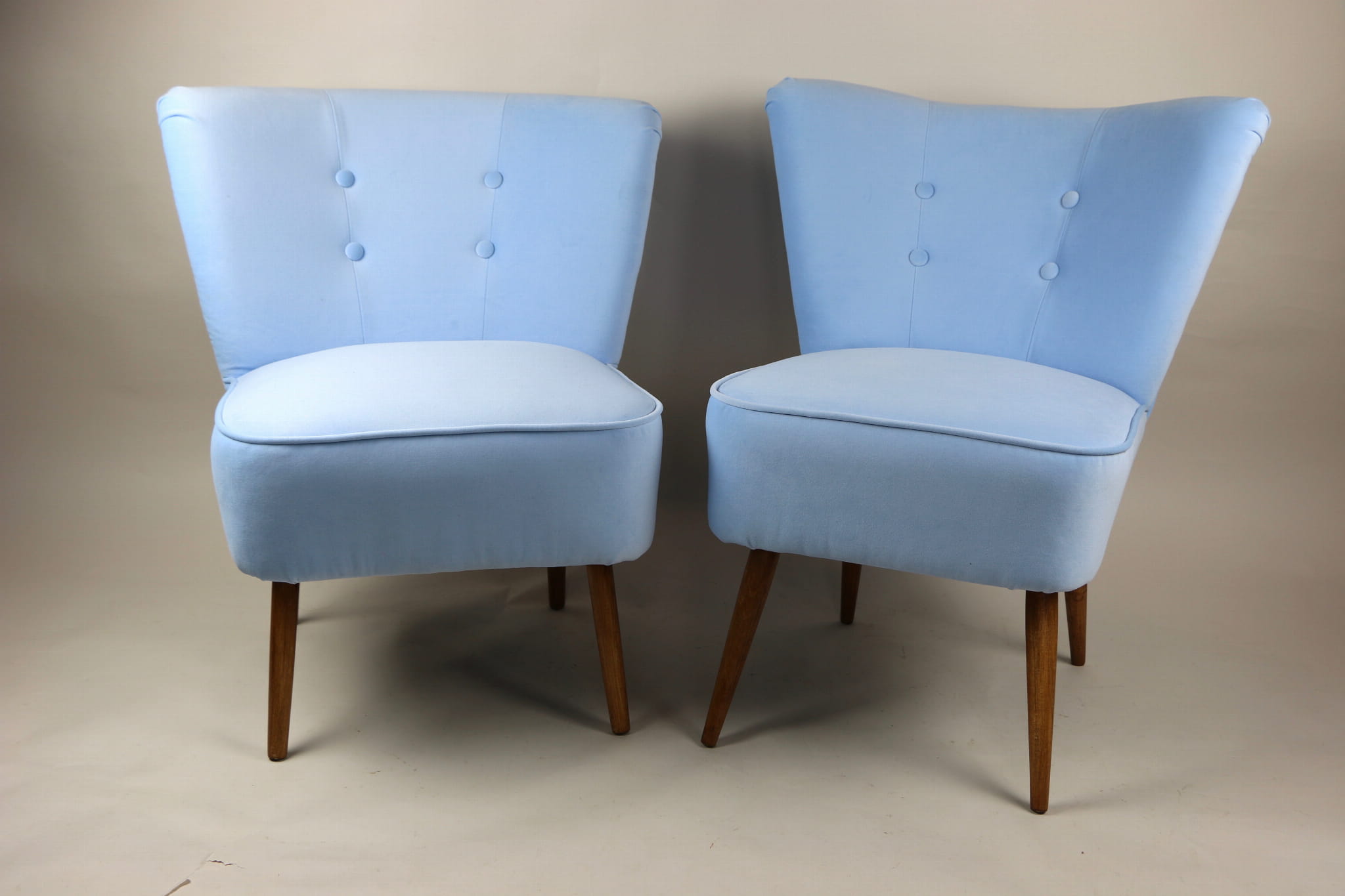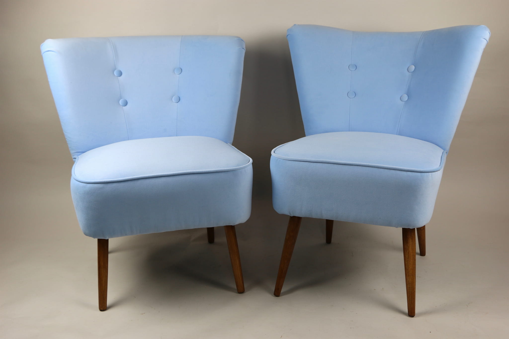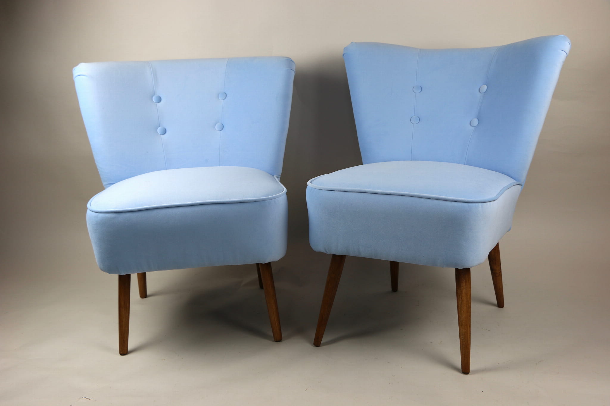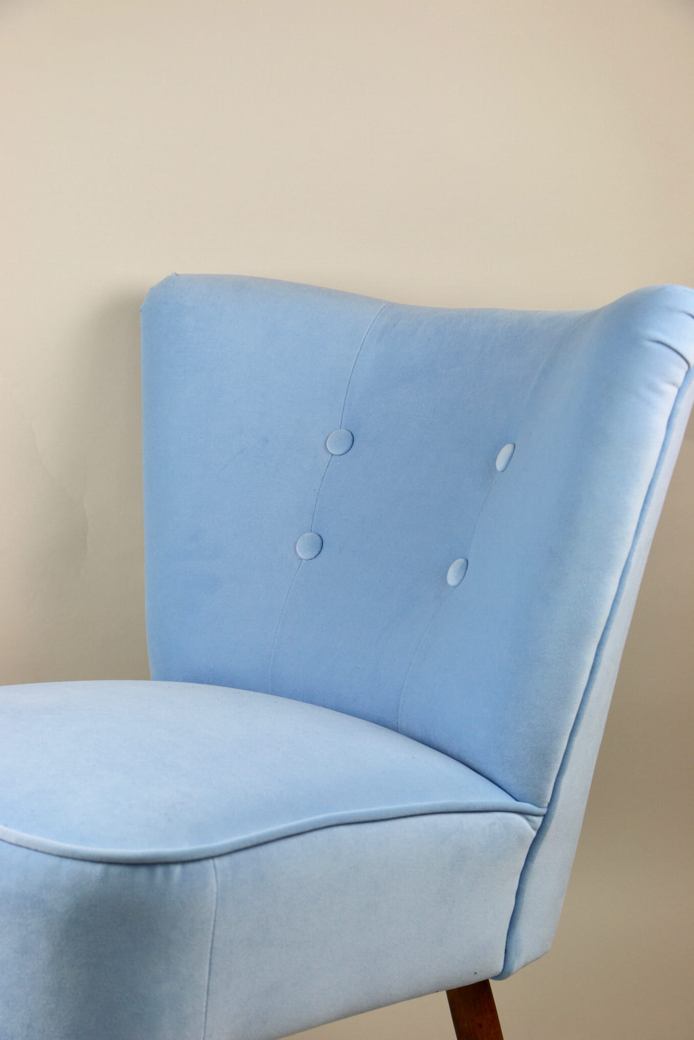 Fotel klubowy z lat 70, kompletnie odrestaurowany. Nowa tapicerka wraz z wypełnieniem w kolorze błękitnym wykończona aksamitną lamówką, siedzisko na sprężynach, nóżki bukowe lakierowane lakiero-bejcą. Tkanina welwet easy to clean - Jade 612.