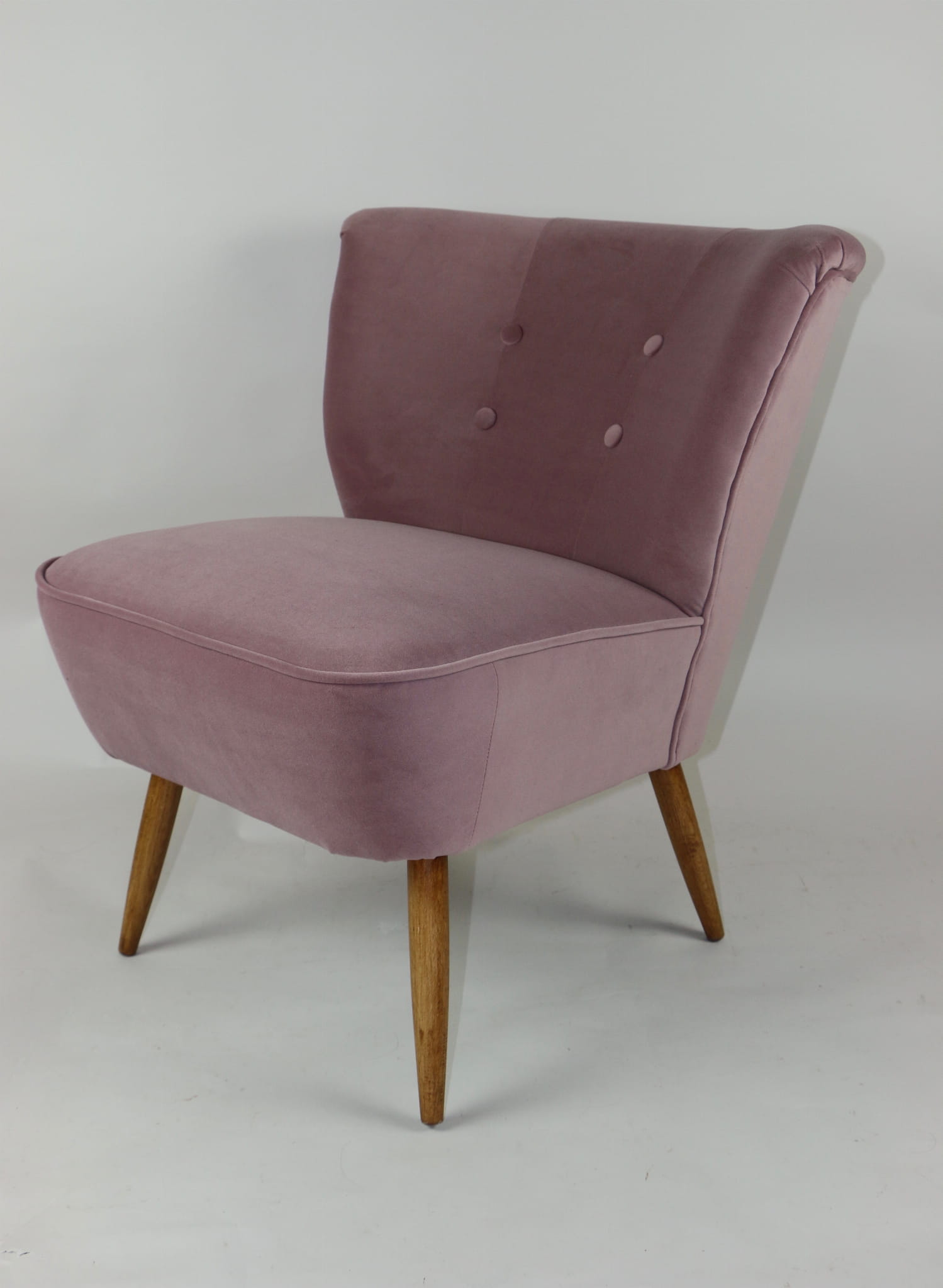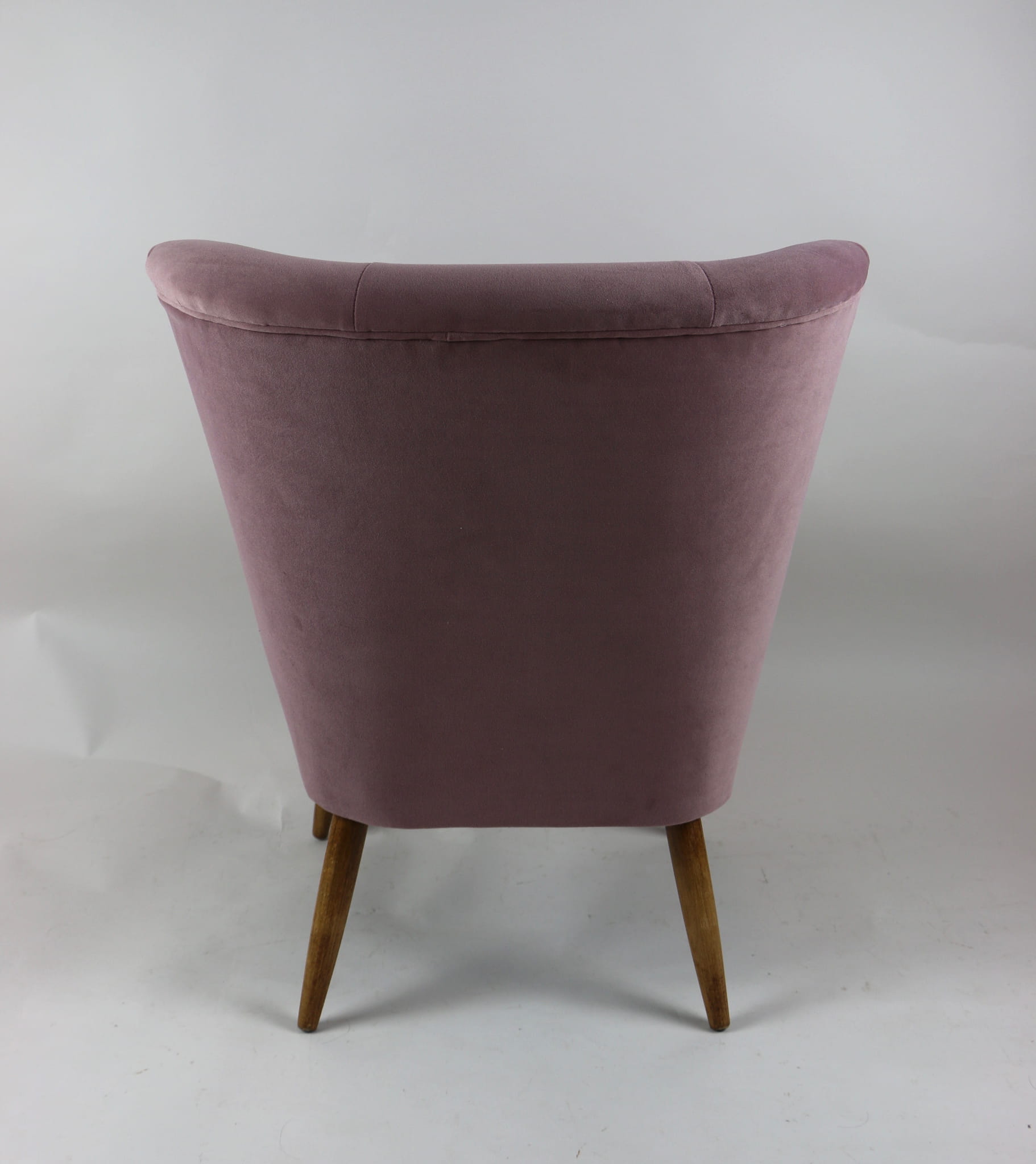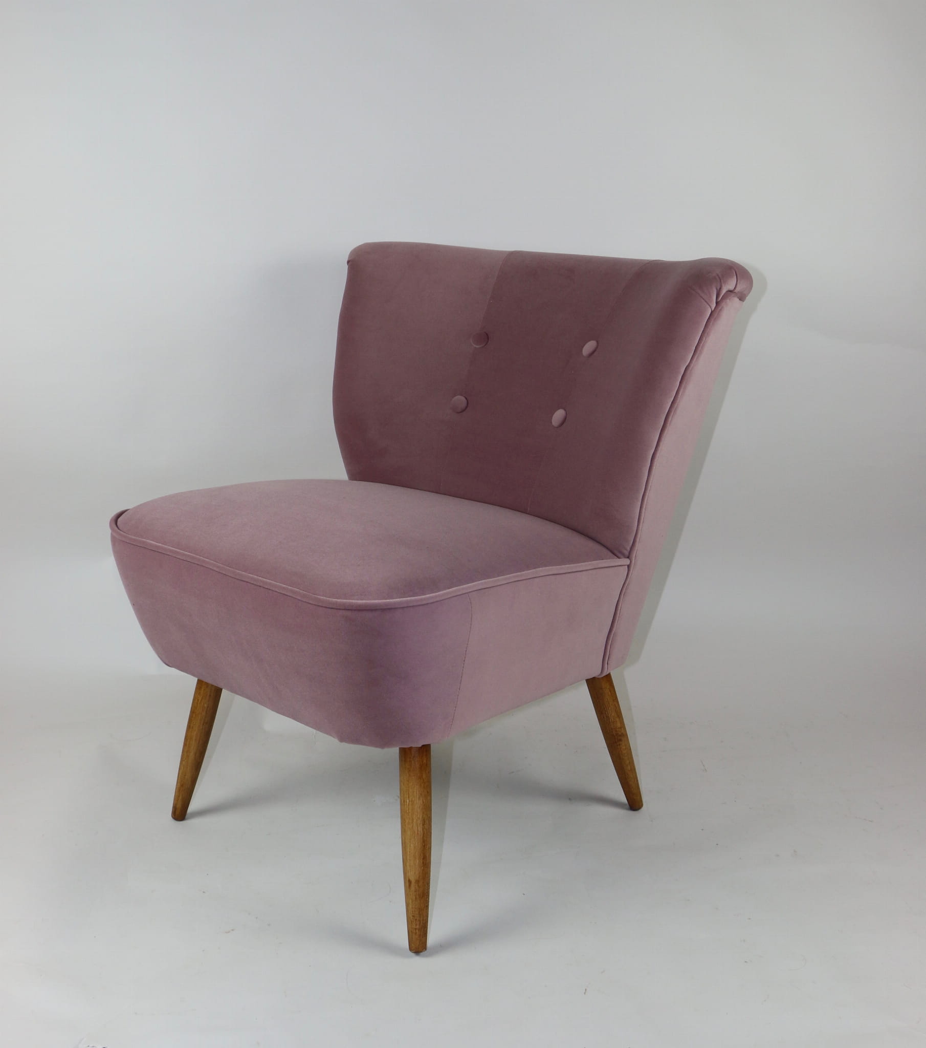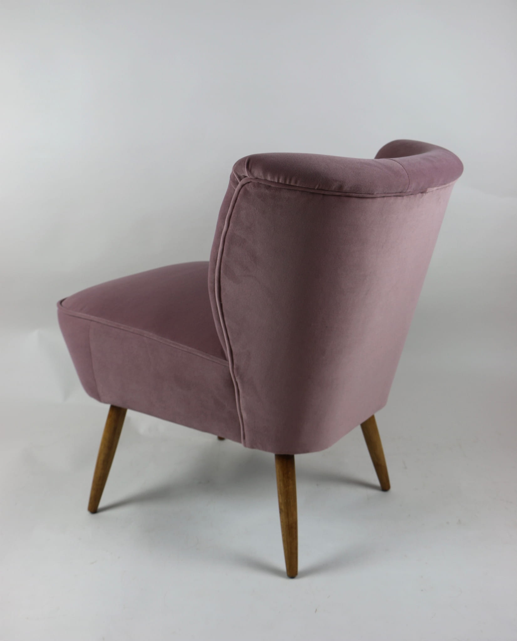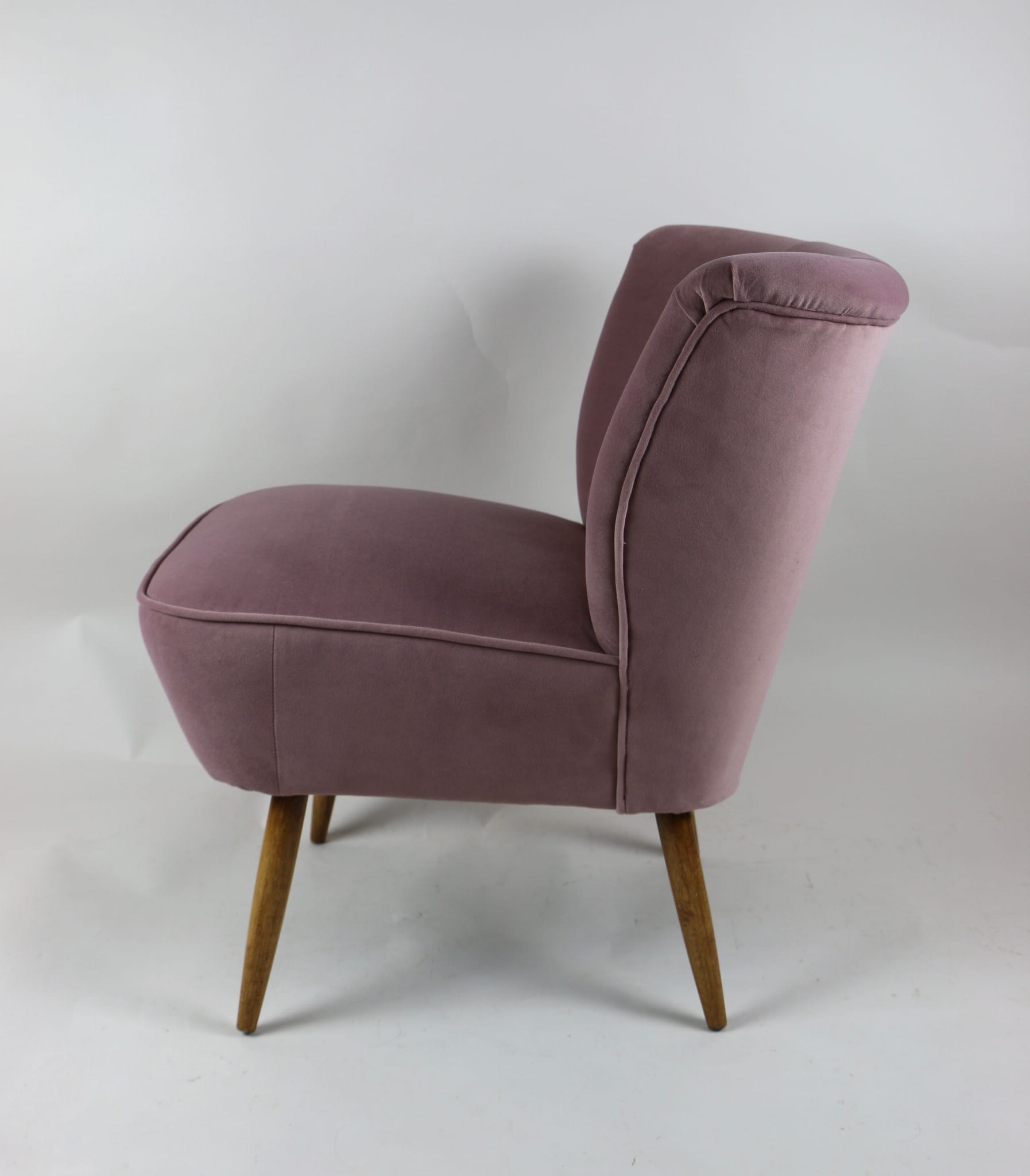 Fotel klubowy z lat 70, kompletnie odrestaurowany. Nowa tapicerka wraz z wypełnieniem w kolorze różu / fioletu wykończona aksamitną lamówką, siedzisko na sprężynach, nóżki bukowe lakierowane lakiero-bejcą. Tkanina welwet easy to clean - Jade 700.