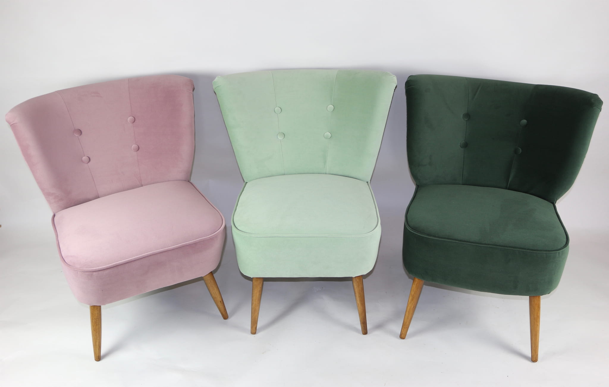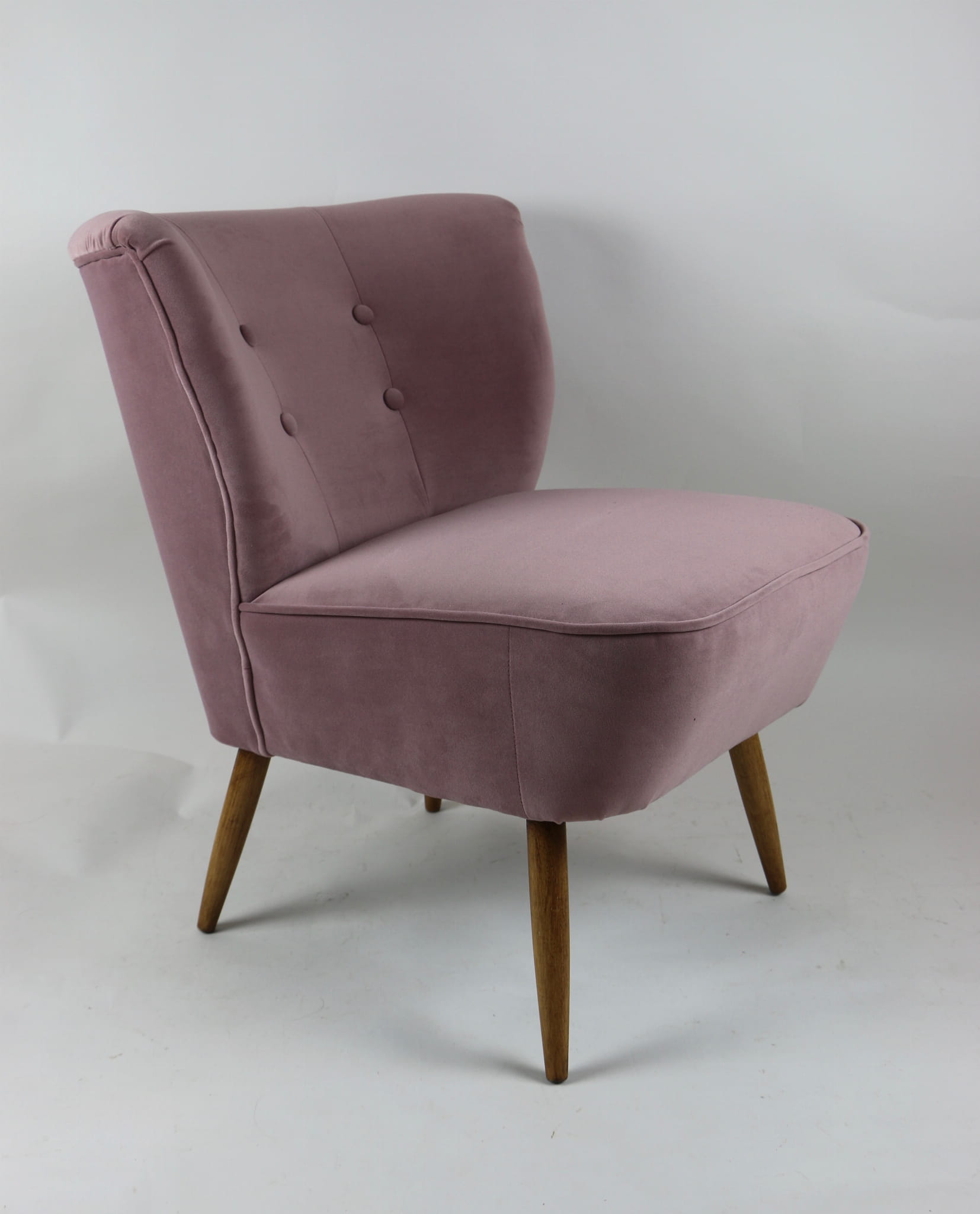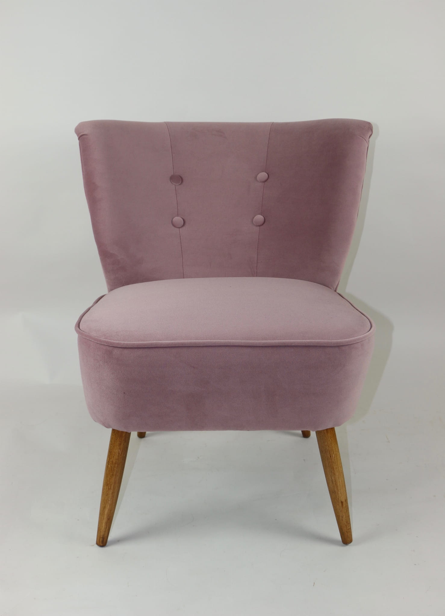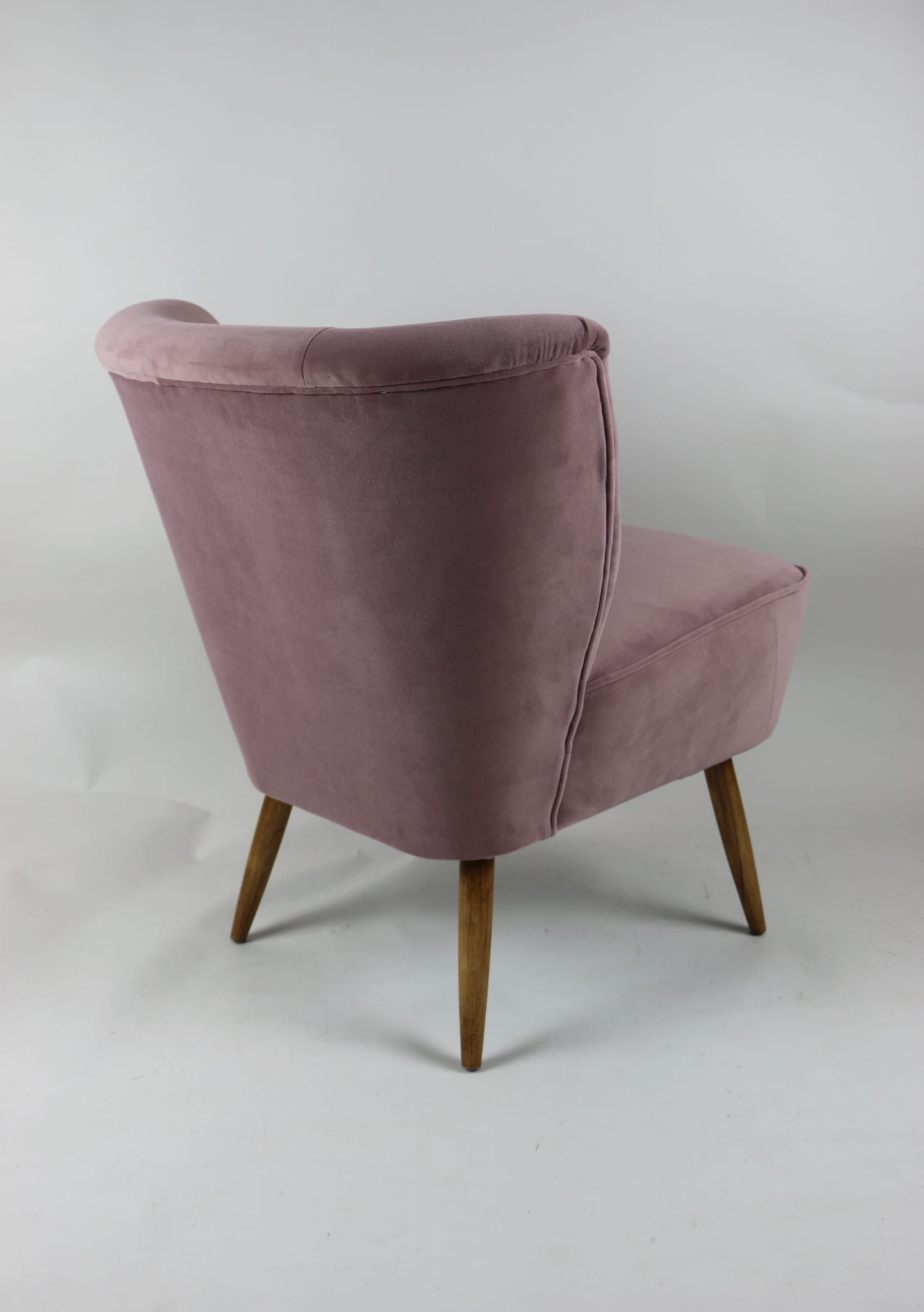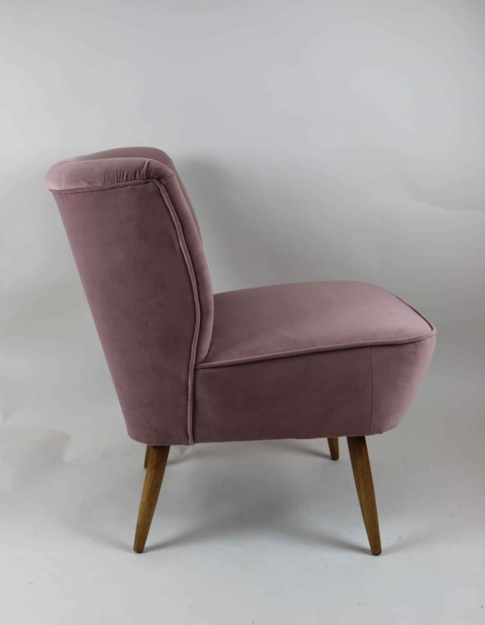 Fotel klubowy z lat 70, kompletnie odrestaurowany. Nowa tapicerka wraz z wypełnieniem w kolorze różu / fioletu wykończona aksamitną lamówką, siedzisko na sprężynach, nóżki bukowe lakierowane lakiero-bejcą. Tkanina welwet easy to clean - Jade 700.