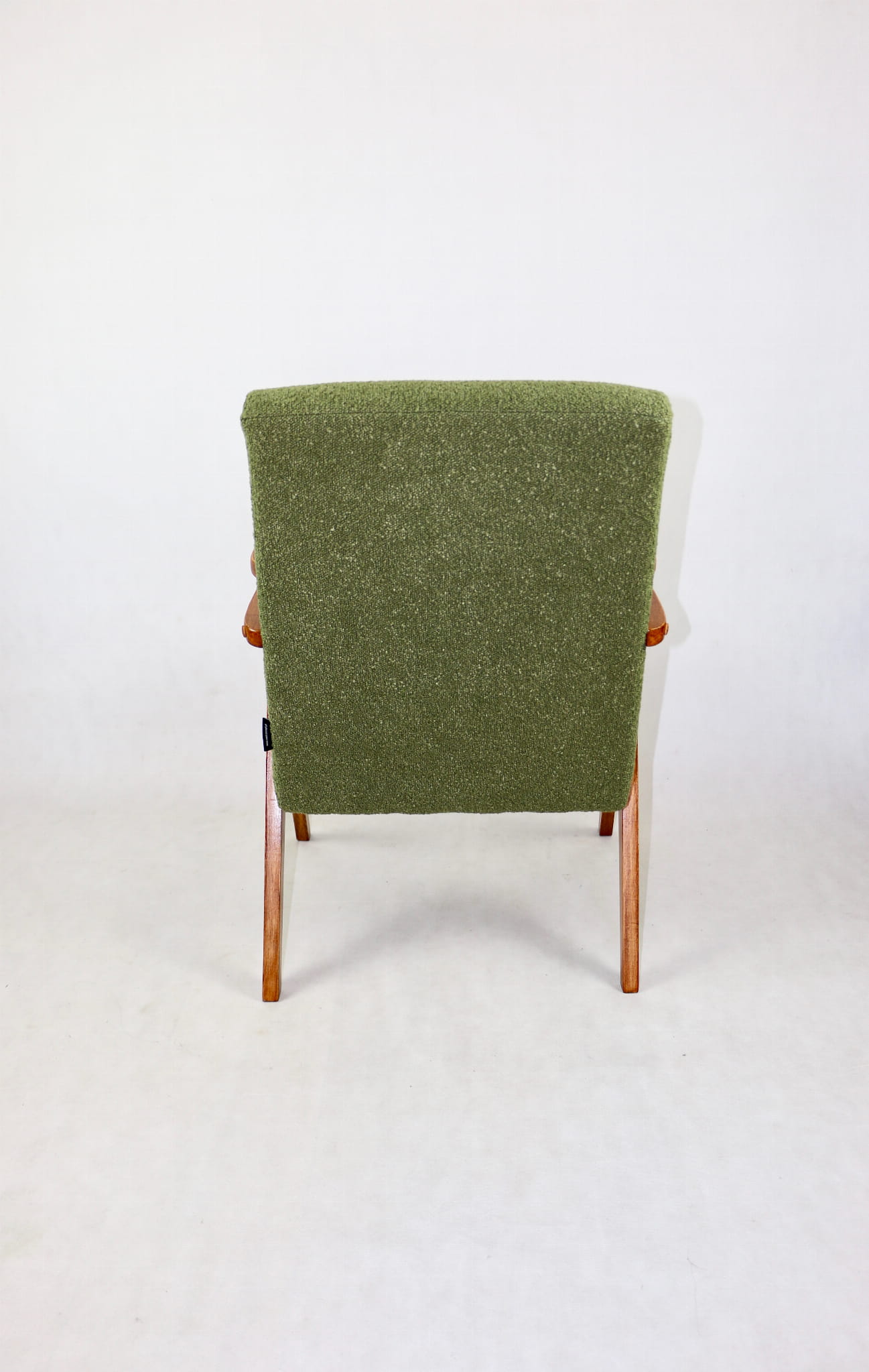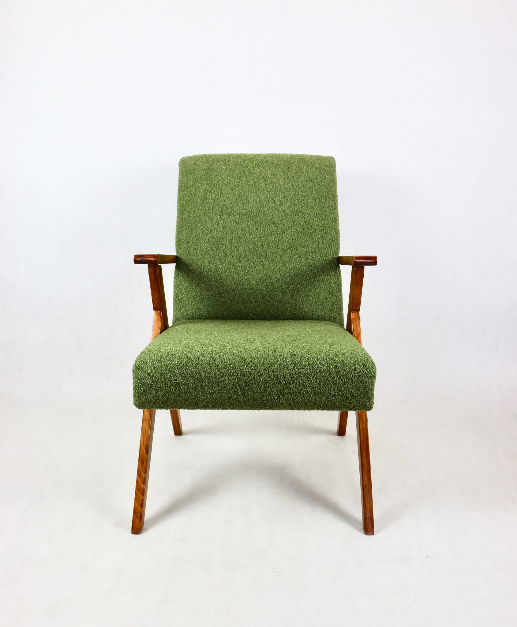 Fotele krzesła z lat 70 tych kompletnie odrestaurowane. Nowe obicie pokryte najwyższej jakości materiałem tapicerskim w kolorze zielonym z serii boucle. Siedzisko odpowiednio wyprofilowane, stelaż drewniany połączony z podłokietnikami w kolorze orzecha włoskiego.