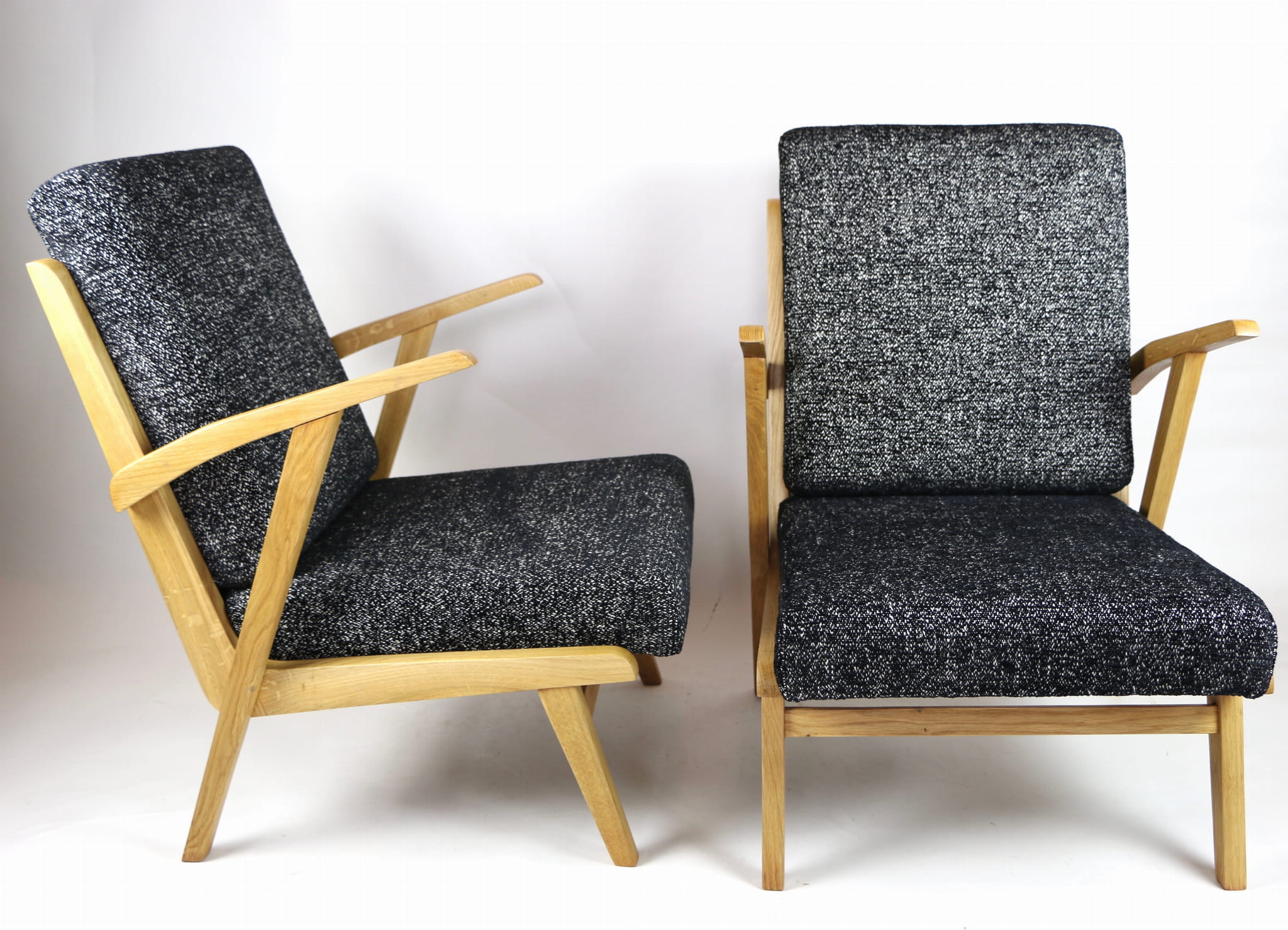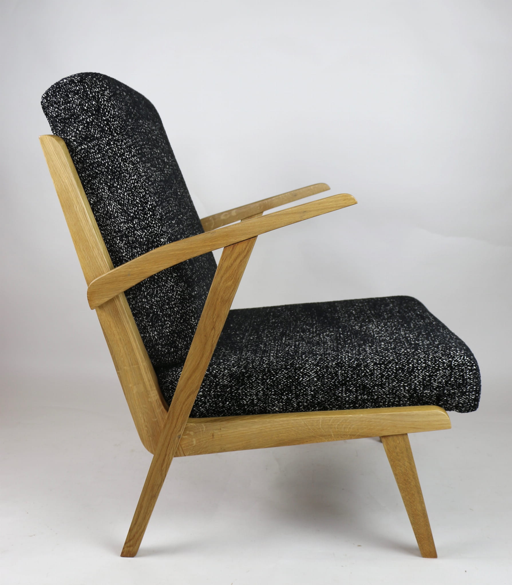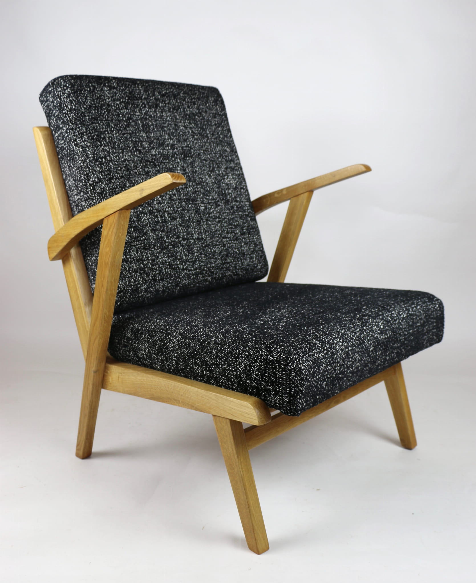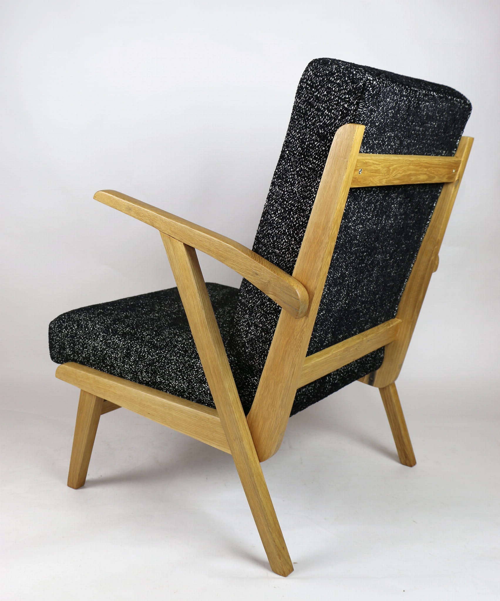 Fotel został wyprodukowany w latach 70 w Jeleniogórskich fabrykach mebli. Mebel jest kompletnie odrestaurowany. Posiada nowe siedzisko wraz z oparciem, pokryte najwyższej jakości naturalnym materiałem strukturalnym w kolorze czarno-białym. Stelaż drewniany lakierowany w kolorze naturalnego dębu. Dostępne dwie identyczne sztuki - możliwość stworzenia zestawu.