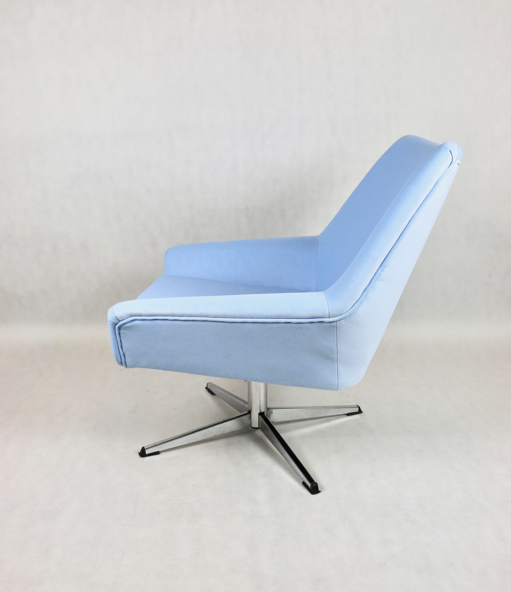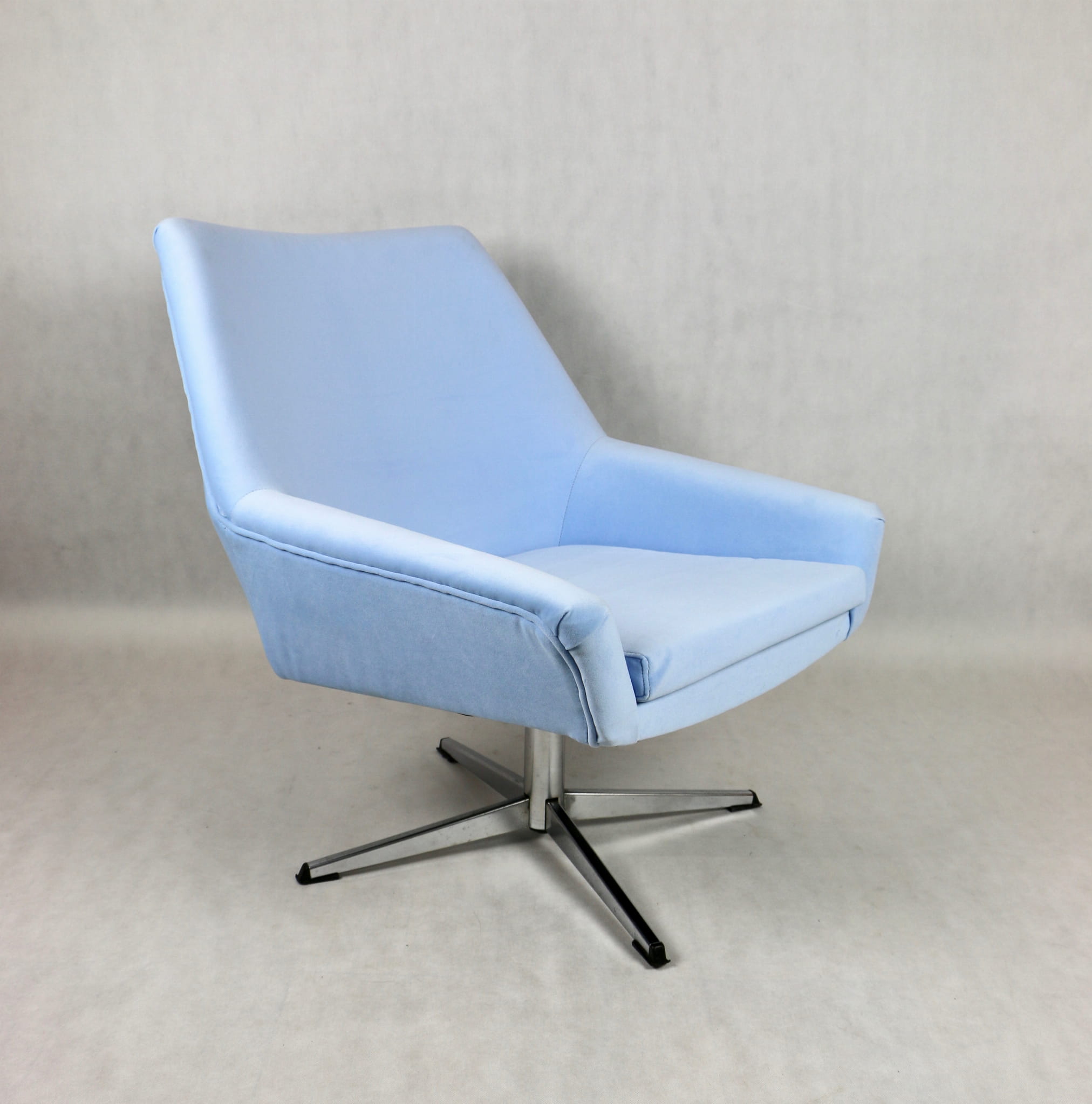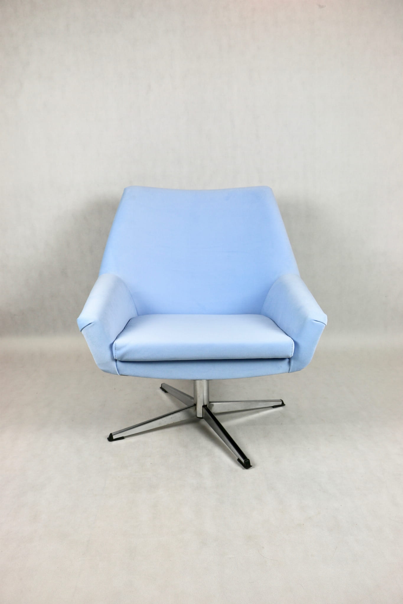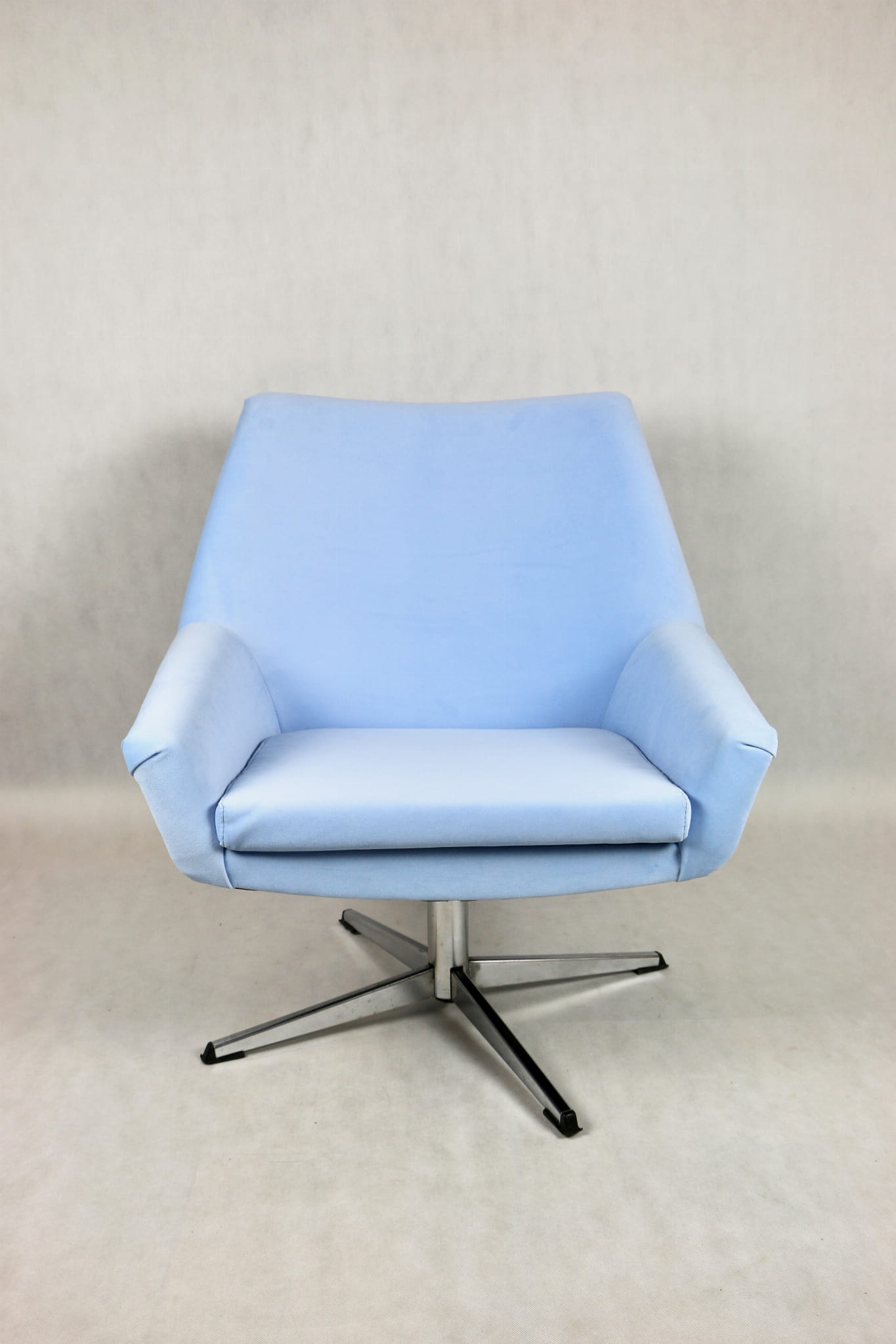 Fotel obrotowy z lat 70 produkowany przez VEB METALLWAREN NAUMBURG w DDR, kompletnie odrestaurowany. Nowa tapicerka wraz z wypełnieniem tkaniną typu welwet w kolorze jasno niebieskim - seria Jade kolor 612 easy to clean. Podstawa fotela metalowa, czteroramienna odświeżona w niklu. Bardzo wygodne.