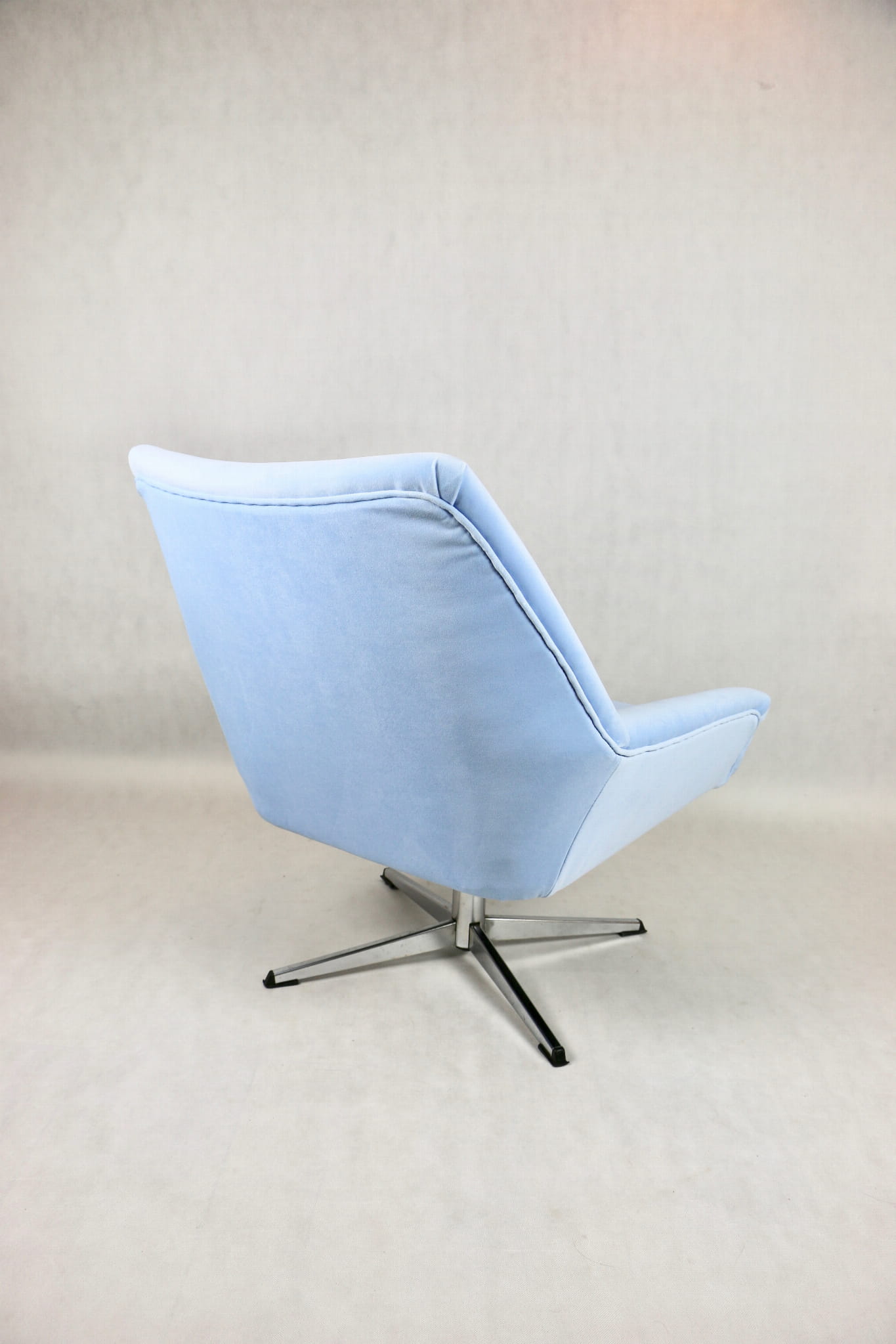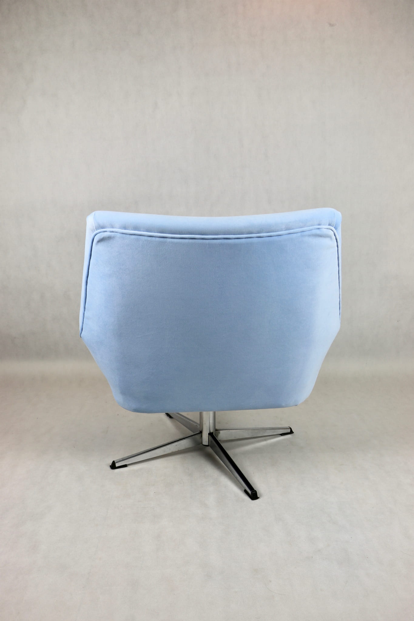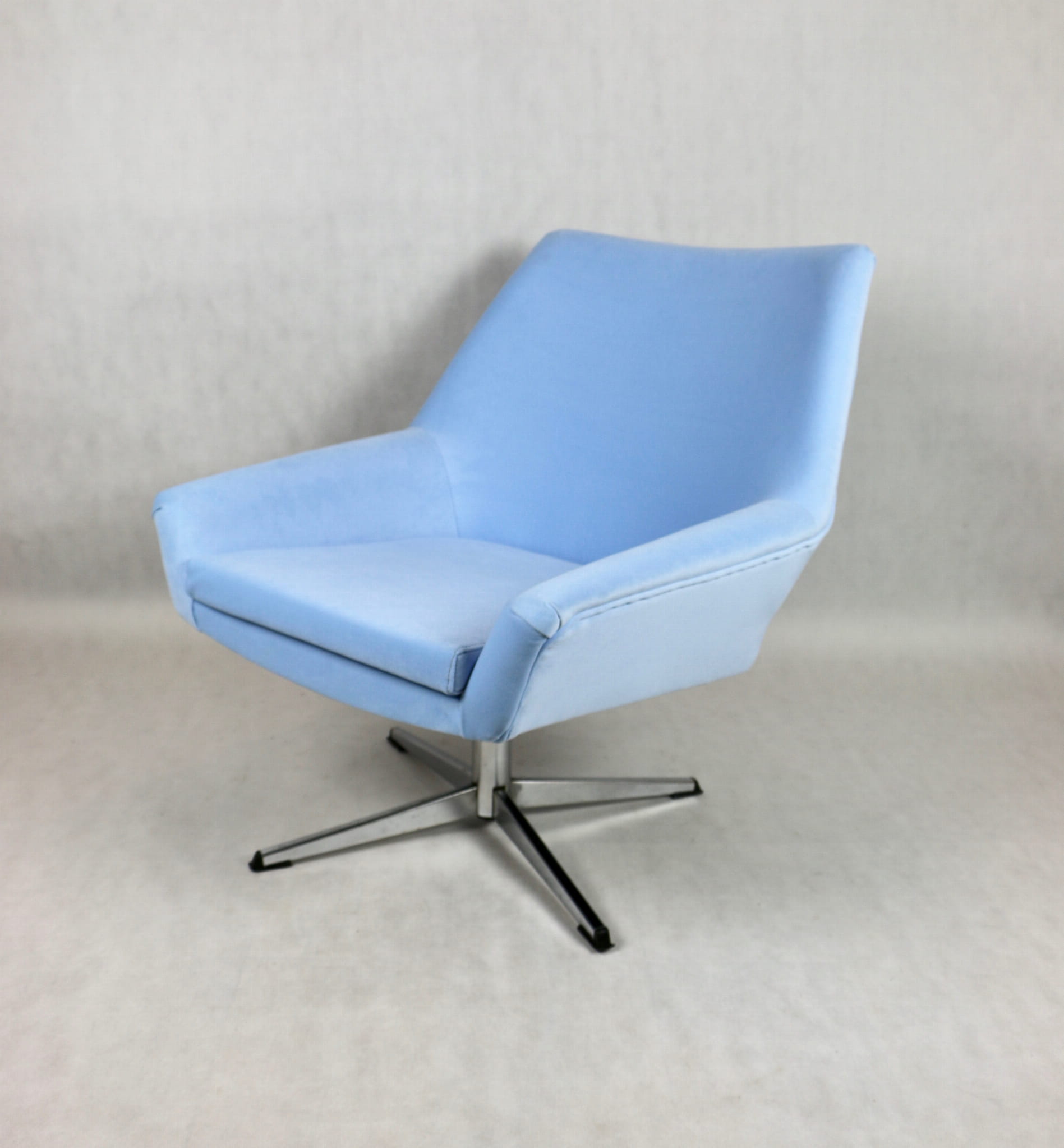 Fotel obrotowy z lat 70 produkowany przez VEB METALLWAREN NAUMBURG w DDR, kompletnie odrestaurowany. Nowa tapicerka wraz z wypełnieniem tkaniną typu welwet w kolorze jasno niebieskim - seria Jade kolor 612 easy to clean. Podstawa fotela metalowa, czteroramienna odświeżona w niklu. Bardzo wygodne.