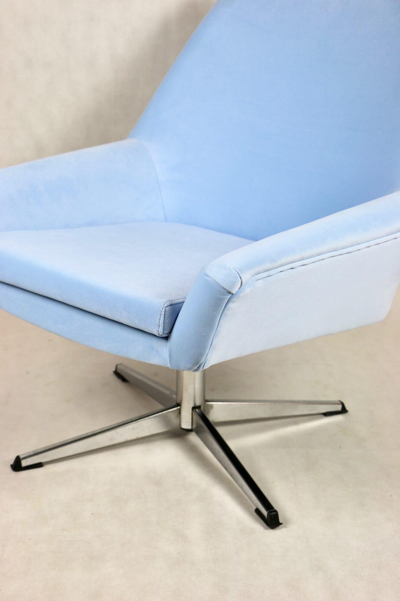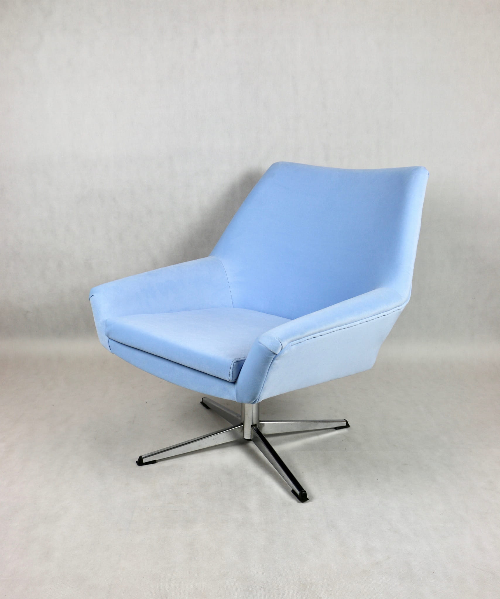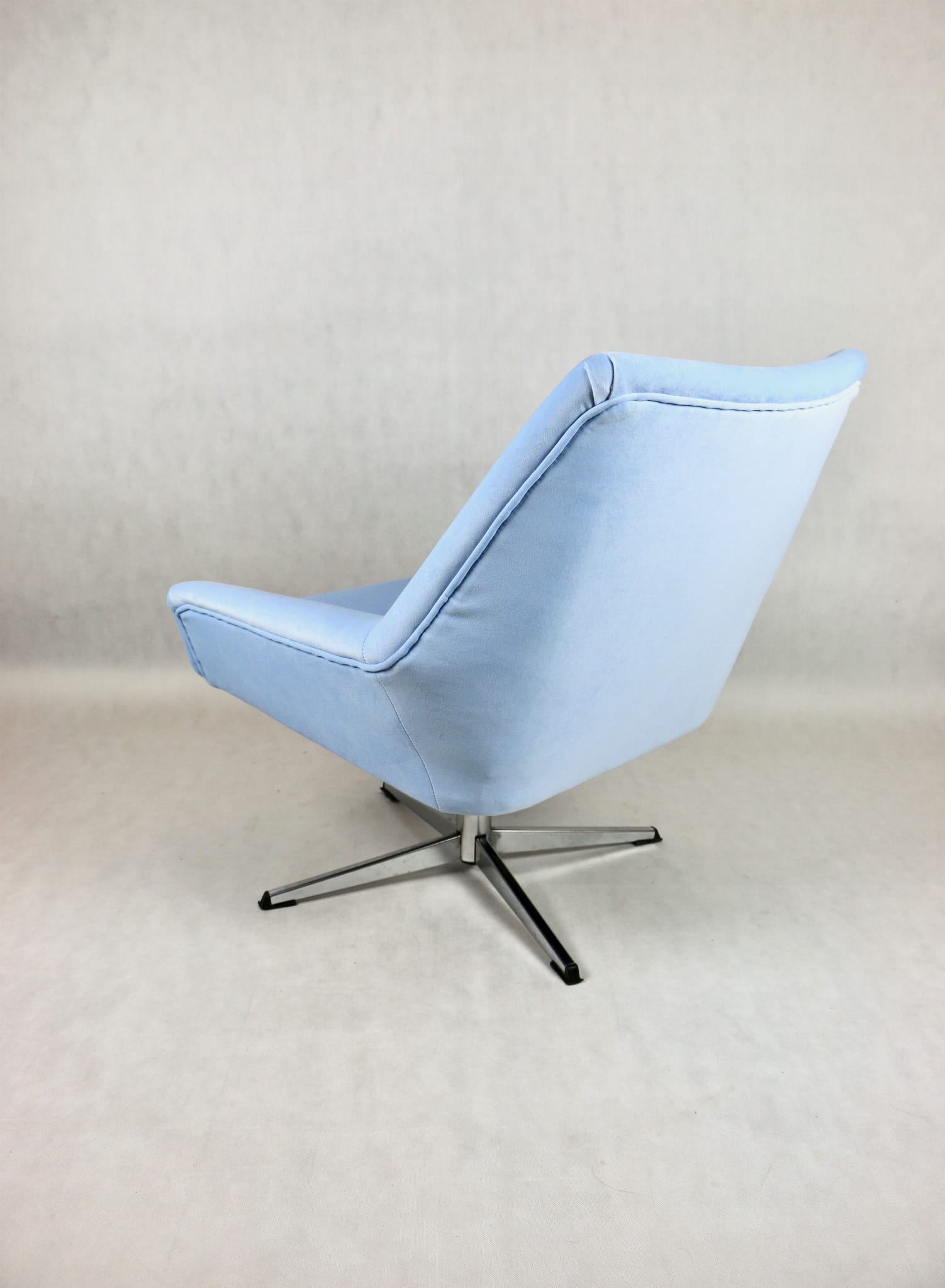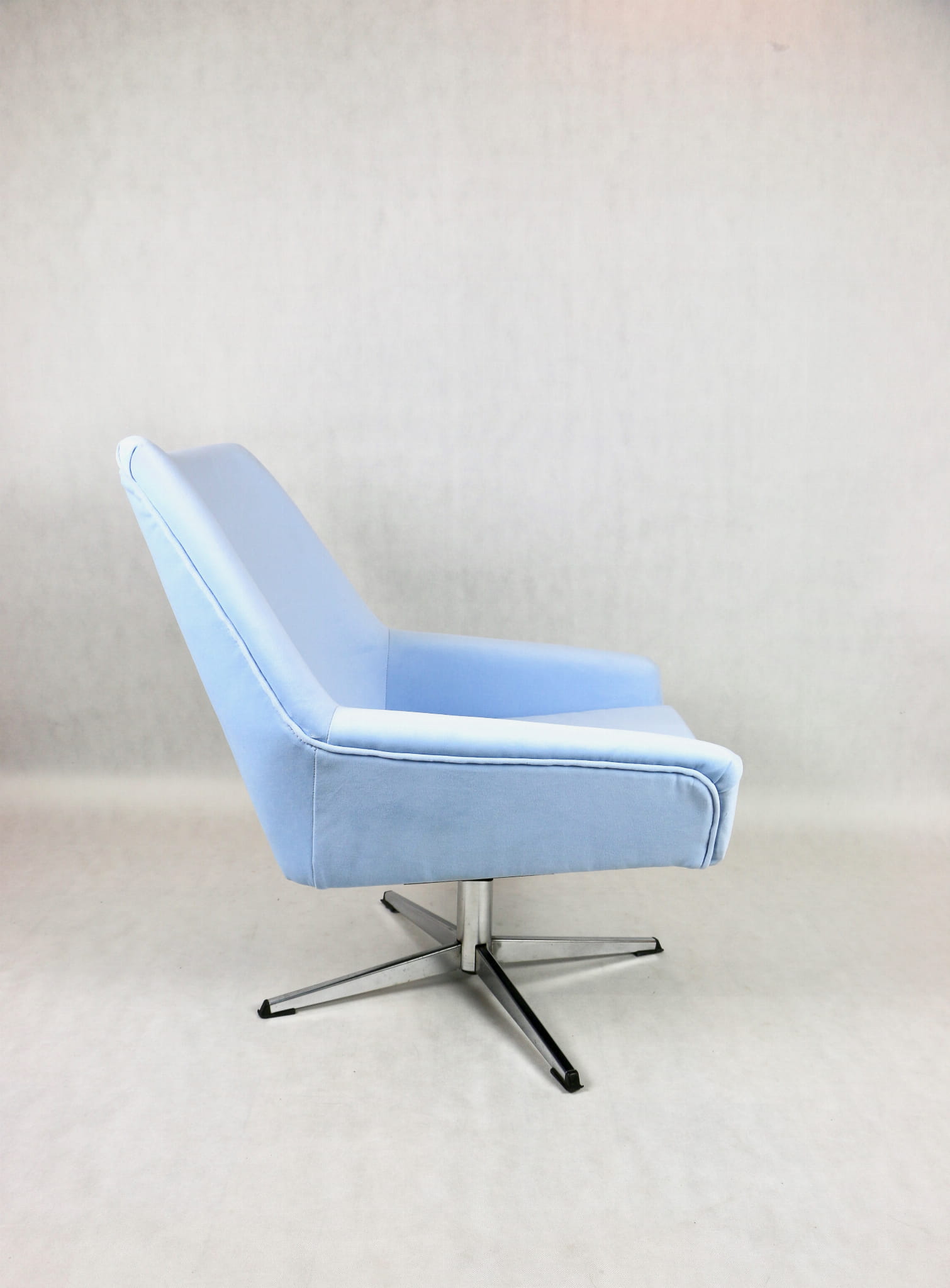 Fotel obrotowy z lat 70 produkowany przez VEB METALLWAREN NAUMBURG w DDR, kompletnie odrestaurowany. Nowa tapicerka wraz z wypełnieniem tkaniną typu welwet w kolorze jasno niebieskim - seria Jade kolor 612 easy to clean. Podstawa fotela metalowa, czteroramienna odświeżona w niklu. Bardzo wygodne.