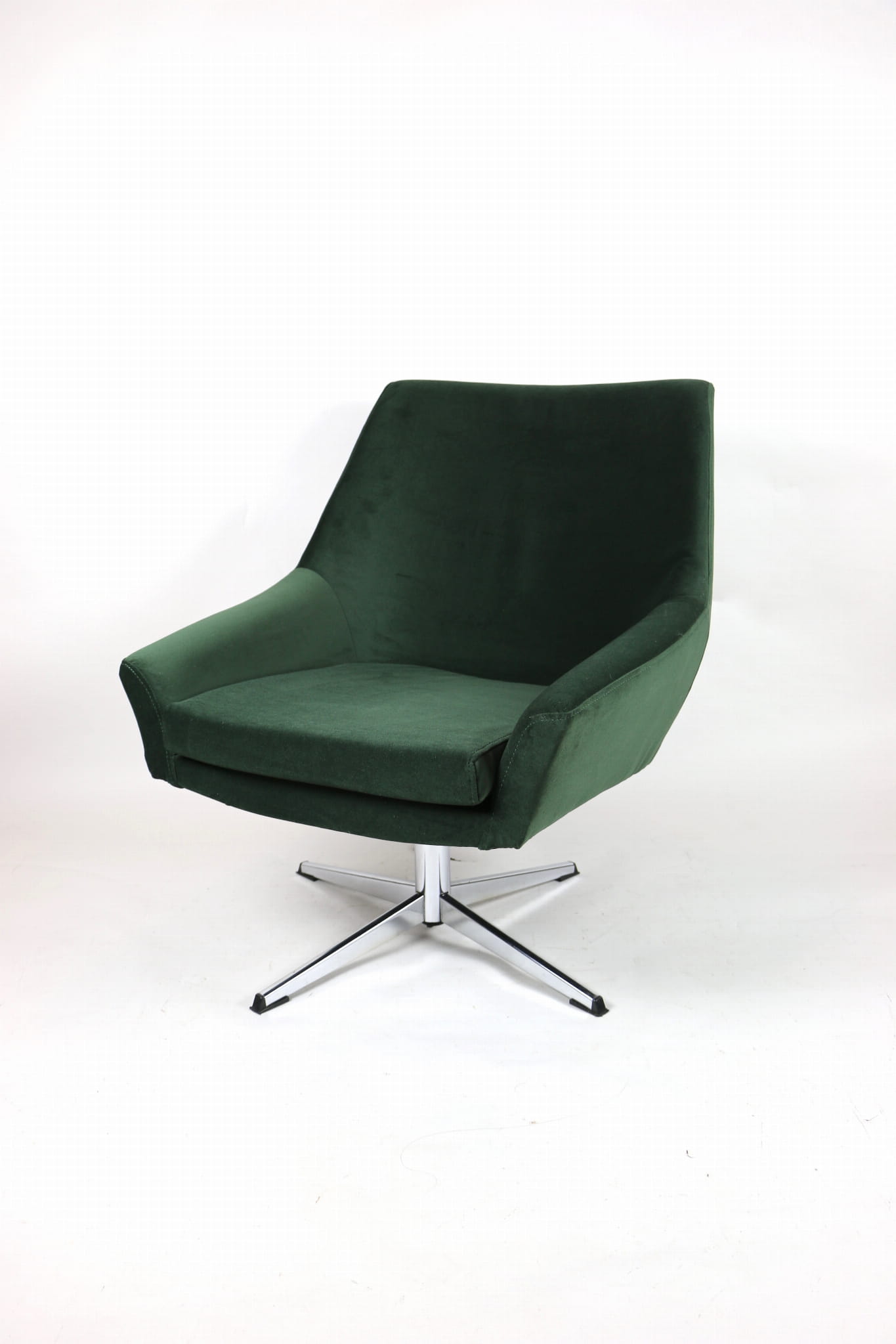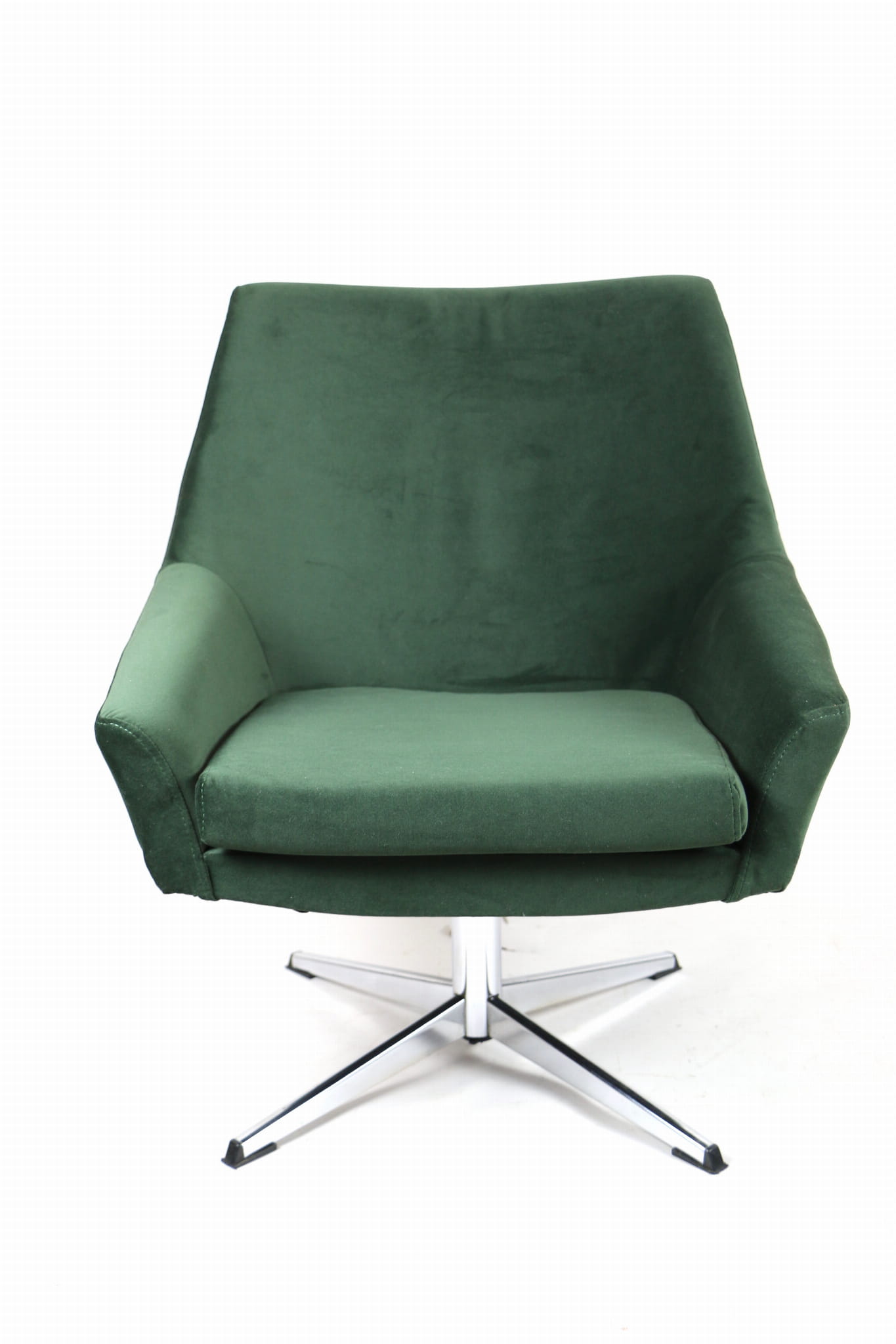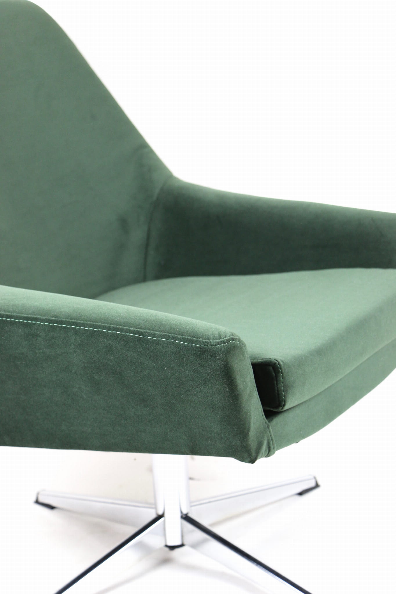 Fotel obrotowy z lat 70 produkowany przez VEB METALLWAREN NAUMBURG w DDR, kompletnie odrestaurowany. Nowa tapicerka wraz z wypełnieniem tkaniną typu welwet w kolorze zgniłej zieleni - seria Jade kolor 508 easy to clean. Podstawa fotela metalowa, czteroramienna odświeżona w niklu. Bardzo wygodne w idealnym stanie.