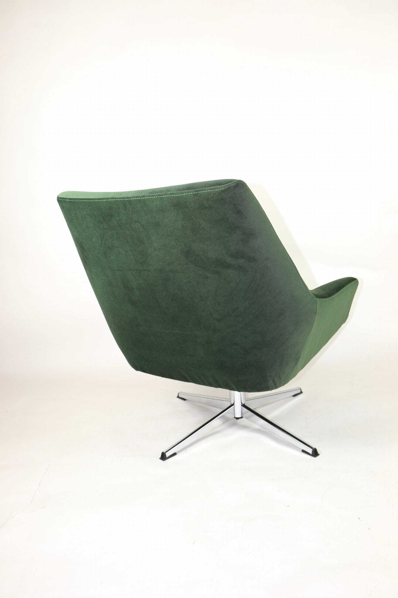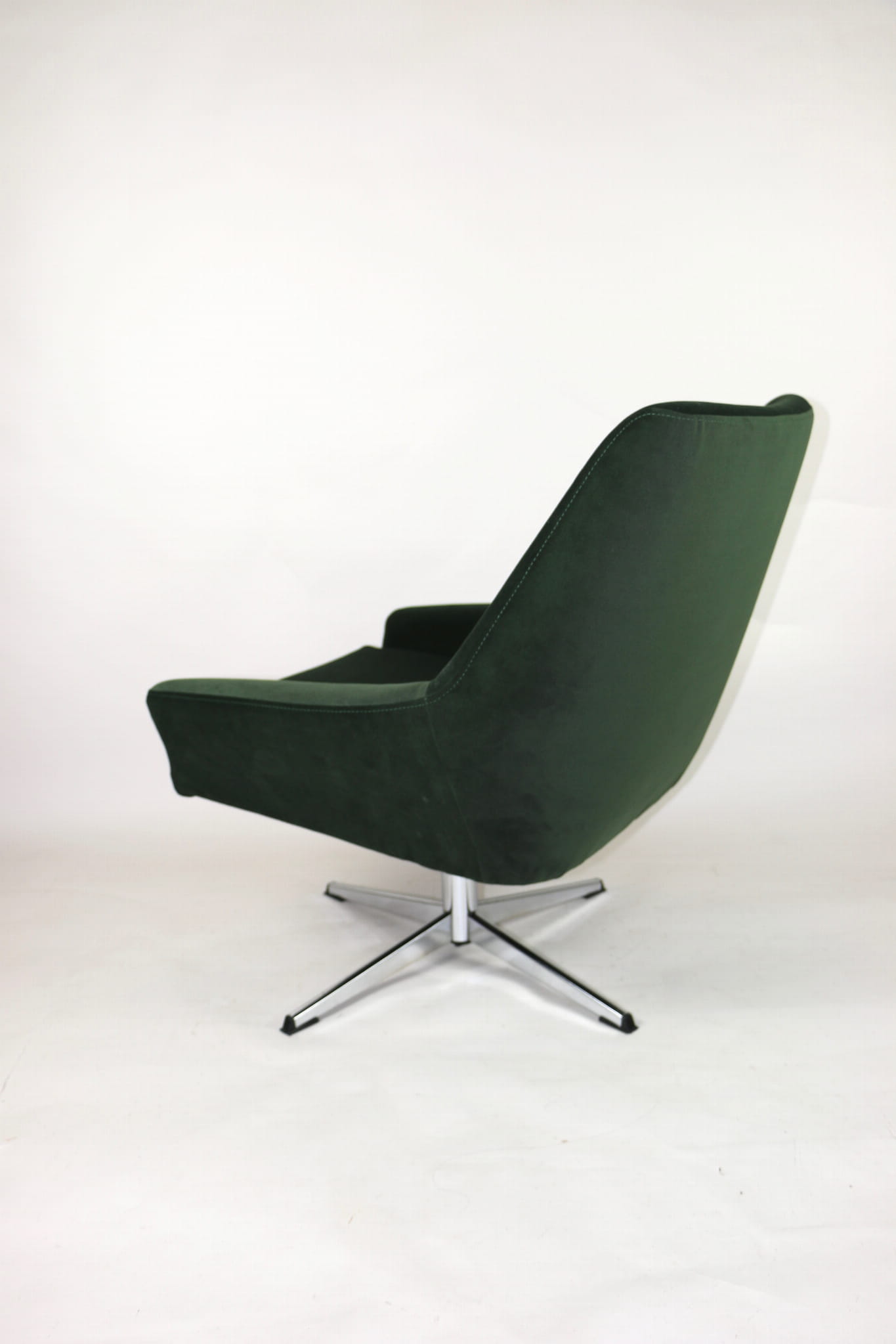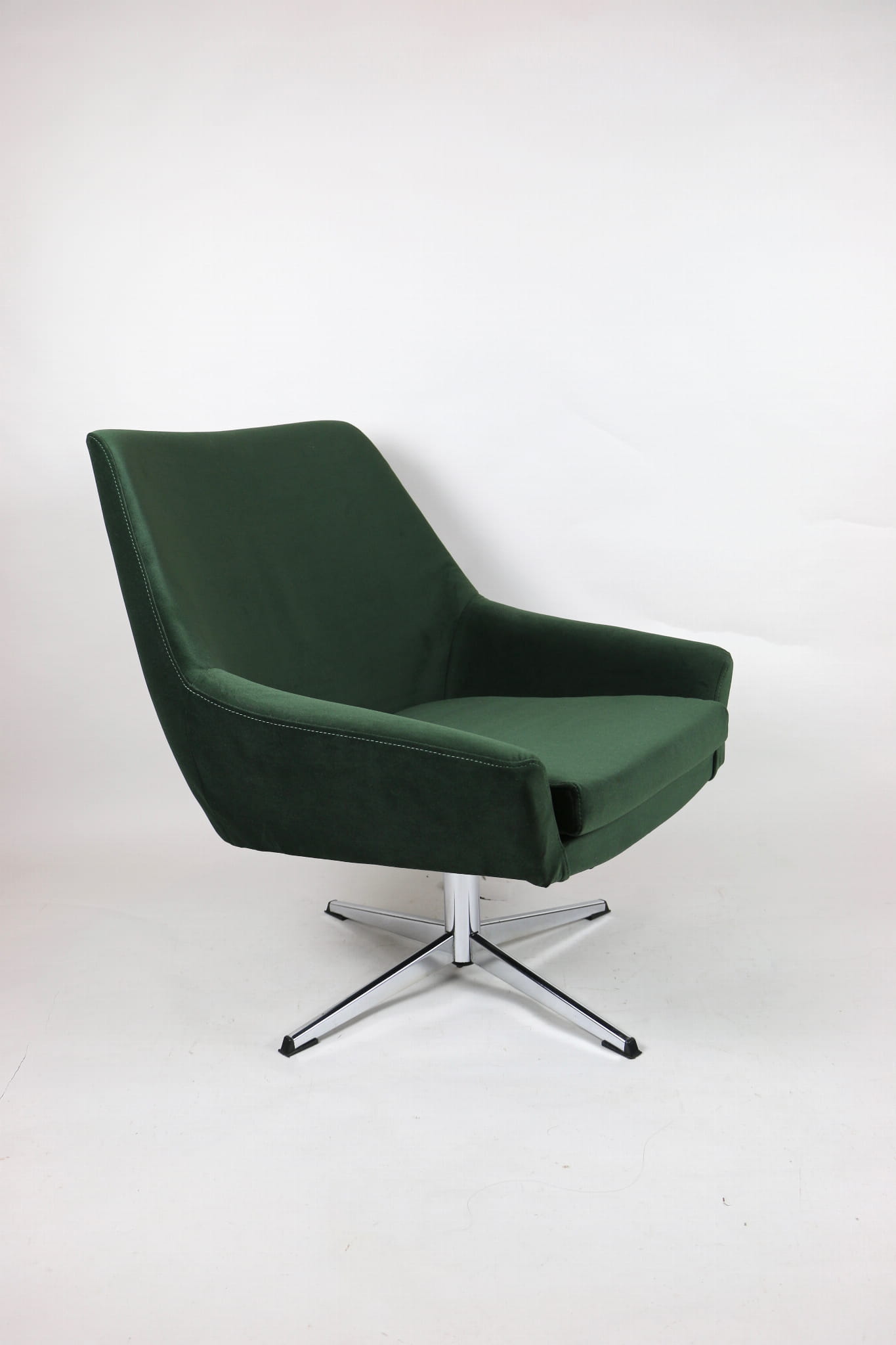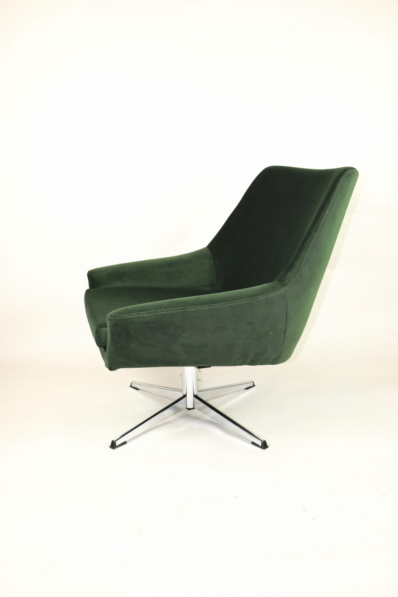 Fotel obrotowy z lat 70 produkowany przez VEB METALLWAREN NAUMBURG w DDR, kompletnie odrestaurowany. Nowa tapicerka wraz z wypełnieniem tkaniną typu welwet w kolorze zgniłej zieleni - seria Jade kolor 508 easy to clean. Podstawa fotela metalowa, czteroramienna odświeżona w niklu. Bardzo wygodne w idealnym stanie.
