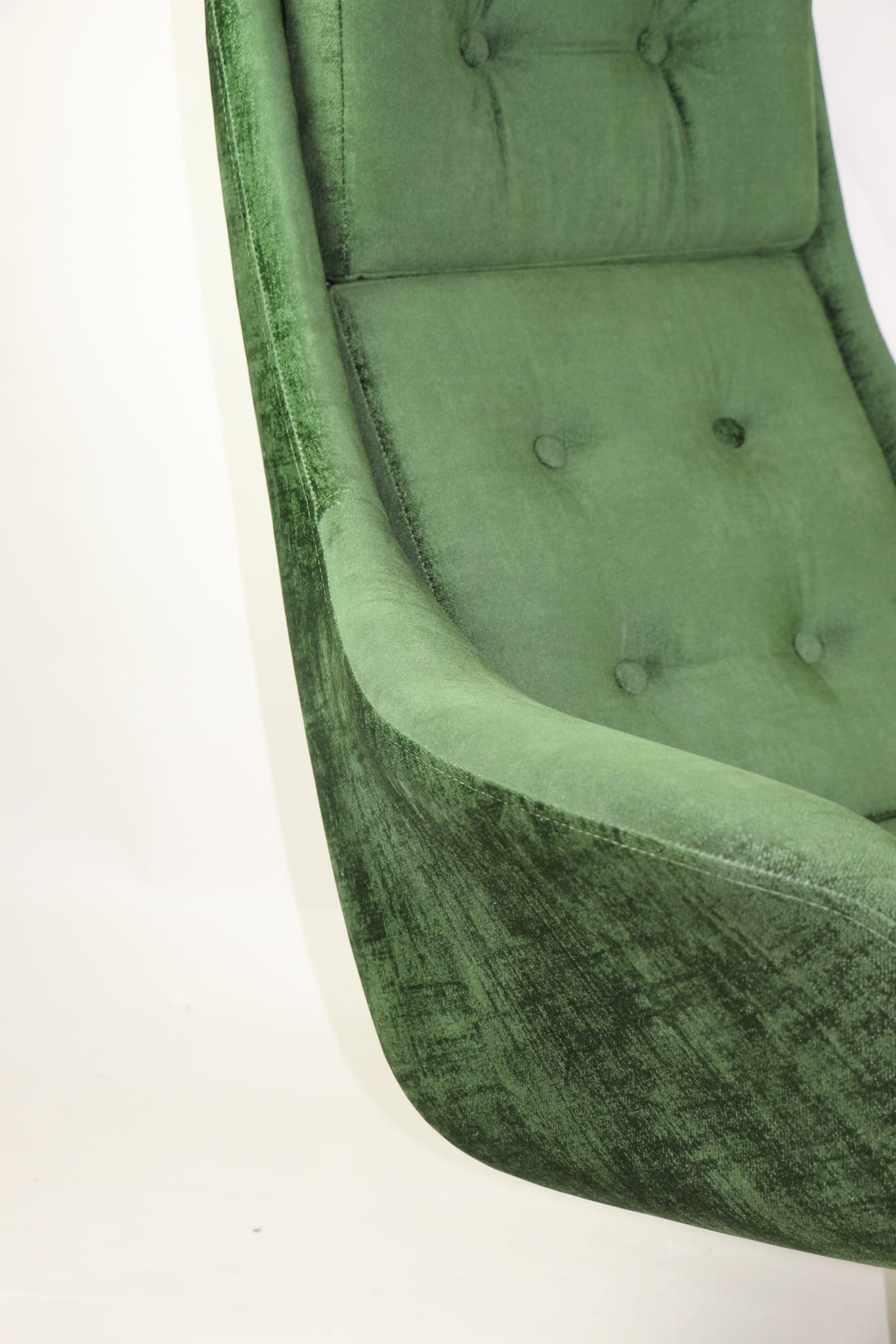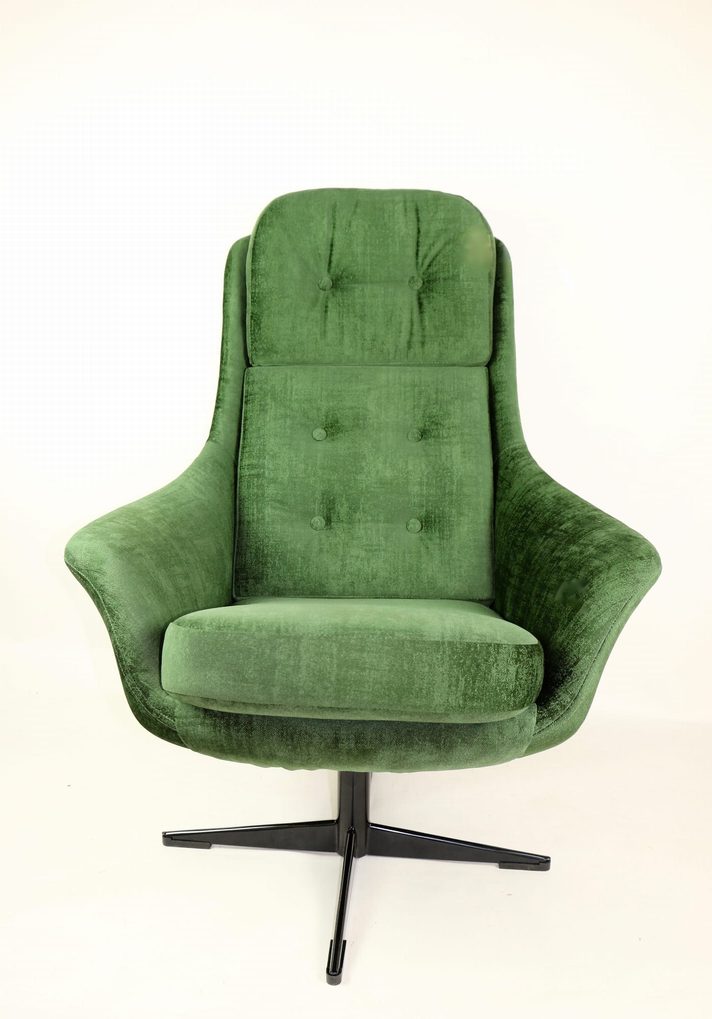 Fotel obrotowy produkowany w latach 70. Kompletnie odrestaurowany. Nowa tapicerka wraz z wypełnieniem pokryta aksamitnym materiałem tapicerskim typu velvet w pięknym zielonym kolorze z serii Chameleon. Podstawa fotela metalowa, czteroramienna w czarnym kolorze.