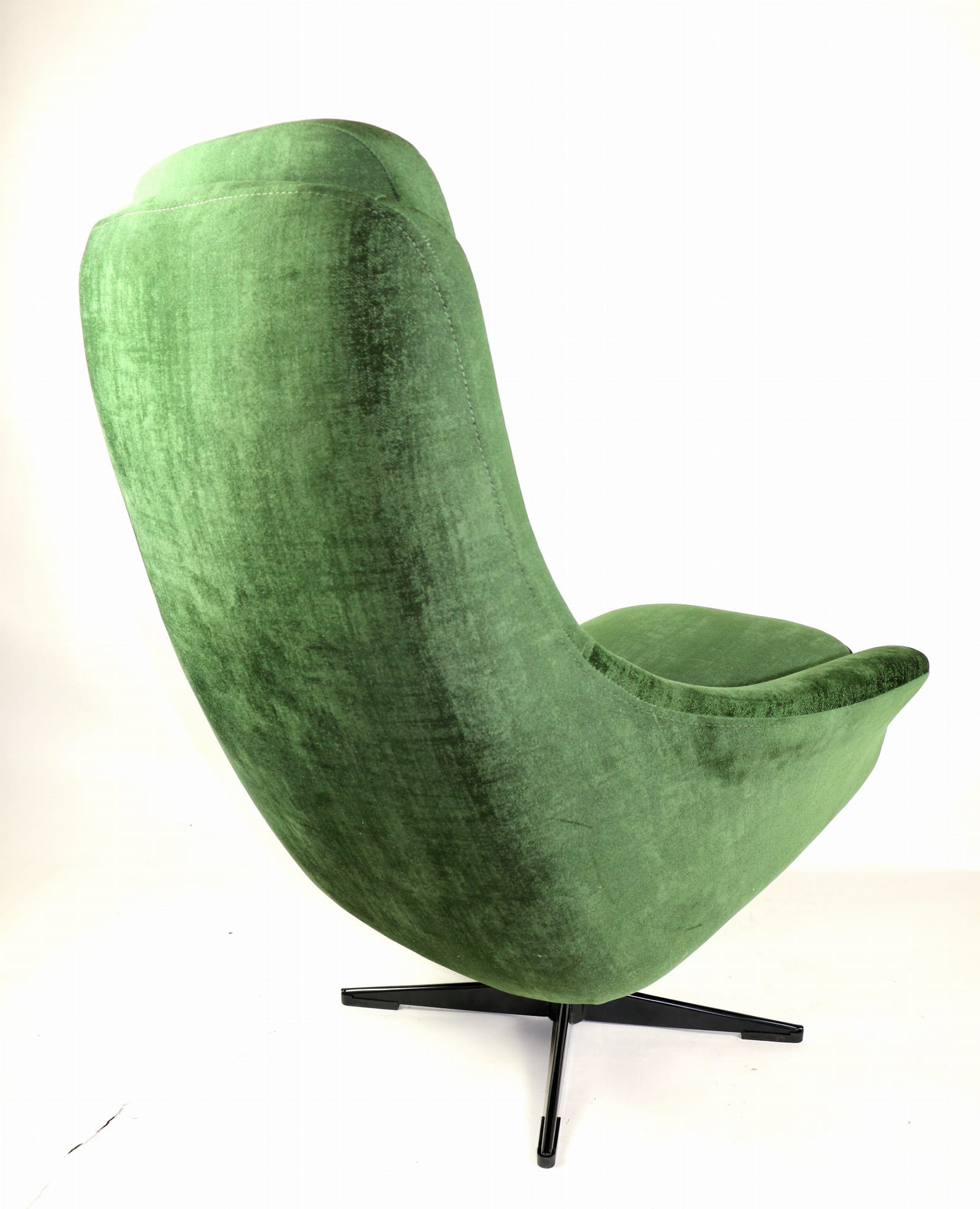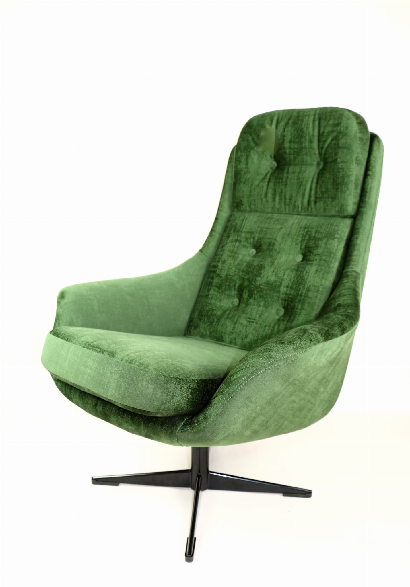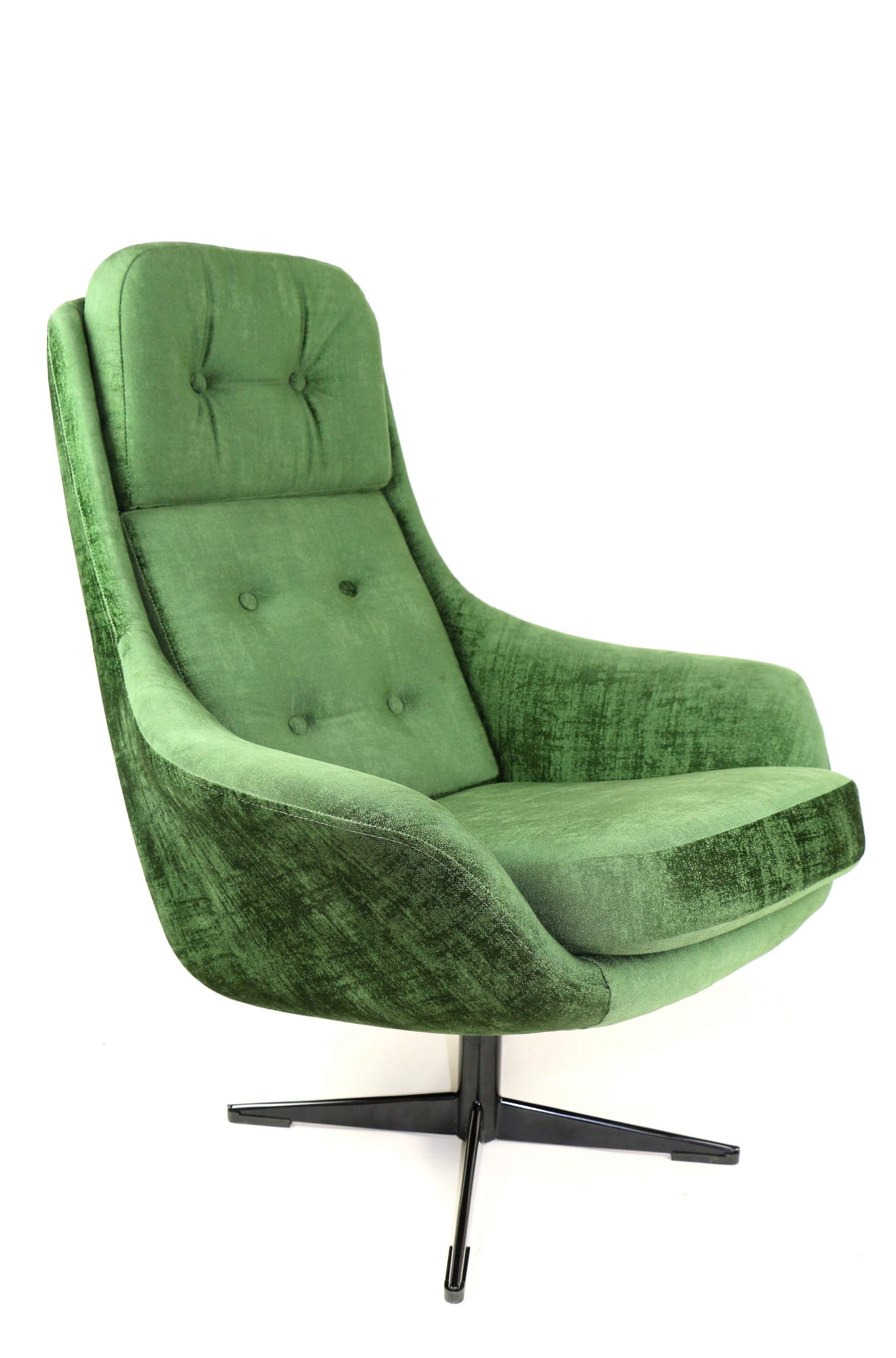 Fotel obrotowy, lata 70. Kompletnie odrestaurowany. Nowa tapicerka wraz z wypełnieniem pokryta aksamitnym materiałem tapicerskim typu velvet w pięknym zielonym kolorze.Podstawa fotela metalowa, czteroramienna w czarnym kolorze.