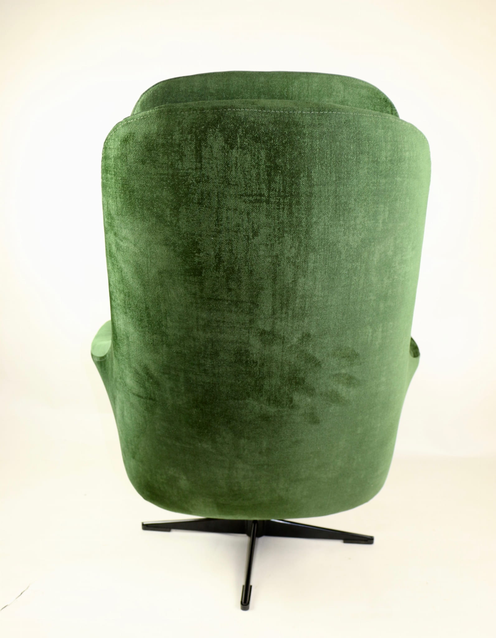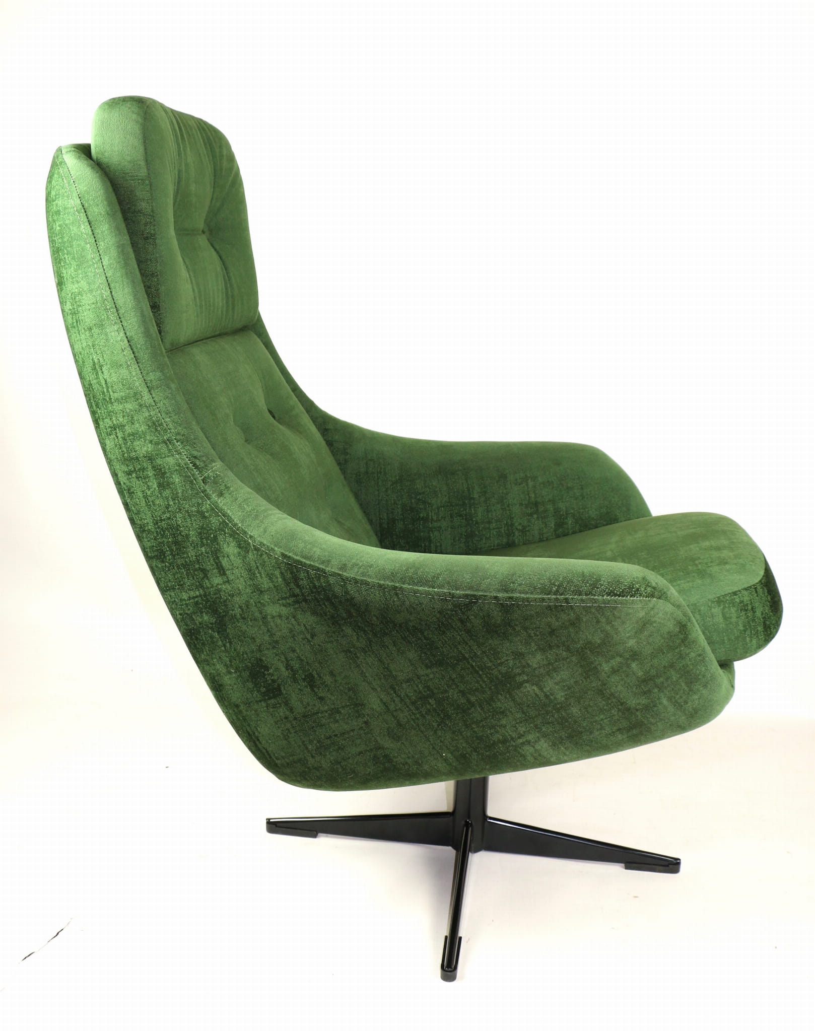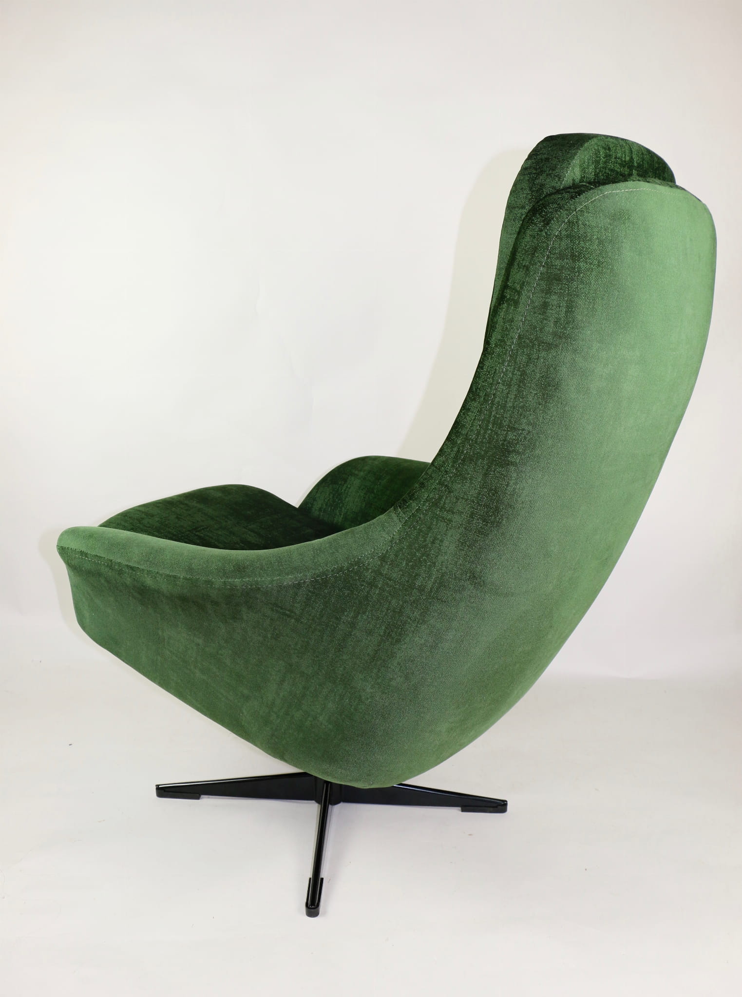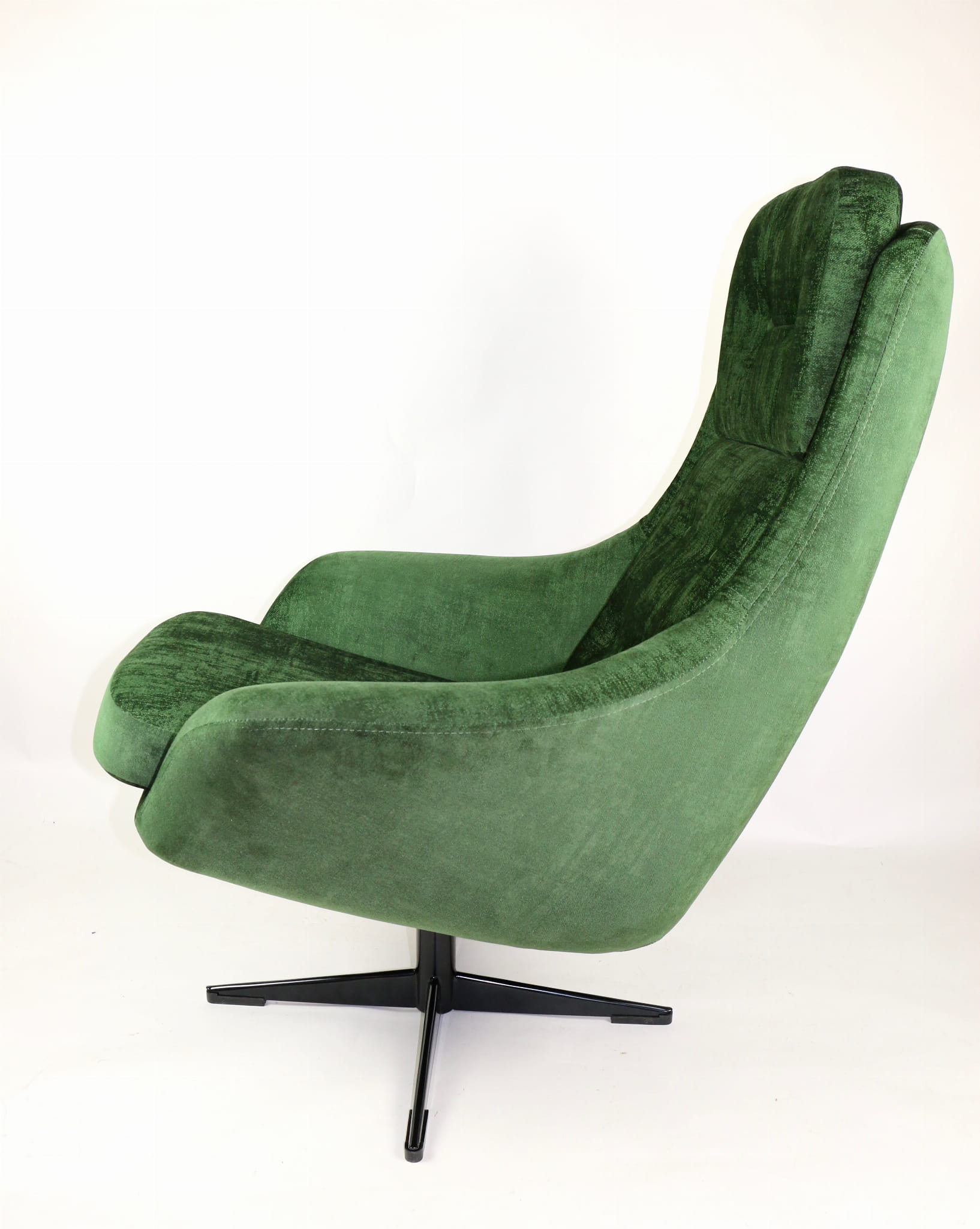 Fotel obrotowy, lata 70. Kompletnie odrestaurowany. Nowa tapicerka wraz z wypełnieniem pokryta aksamitnym materiałem tapicerskim typu velvet w pięknym zielonym kolorze.Podstawa fotela metalowa, czteroramienna w czarnym kolorze.
