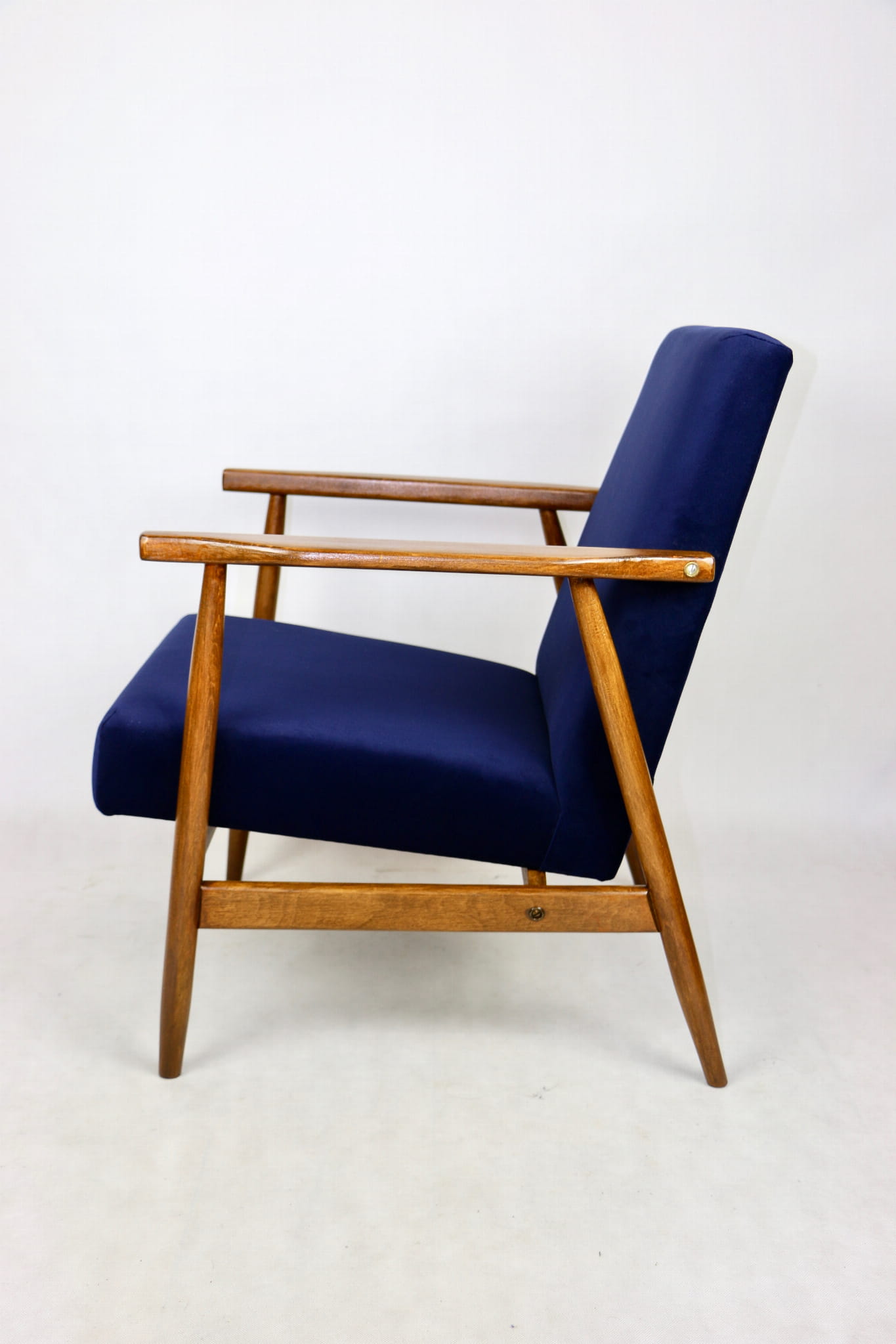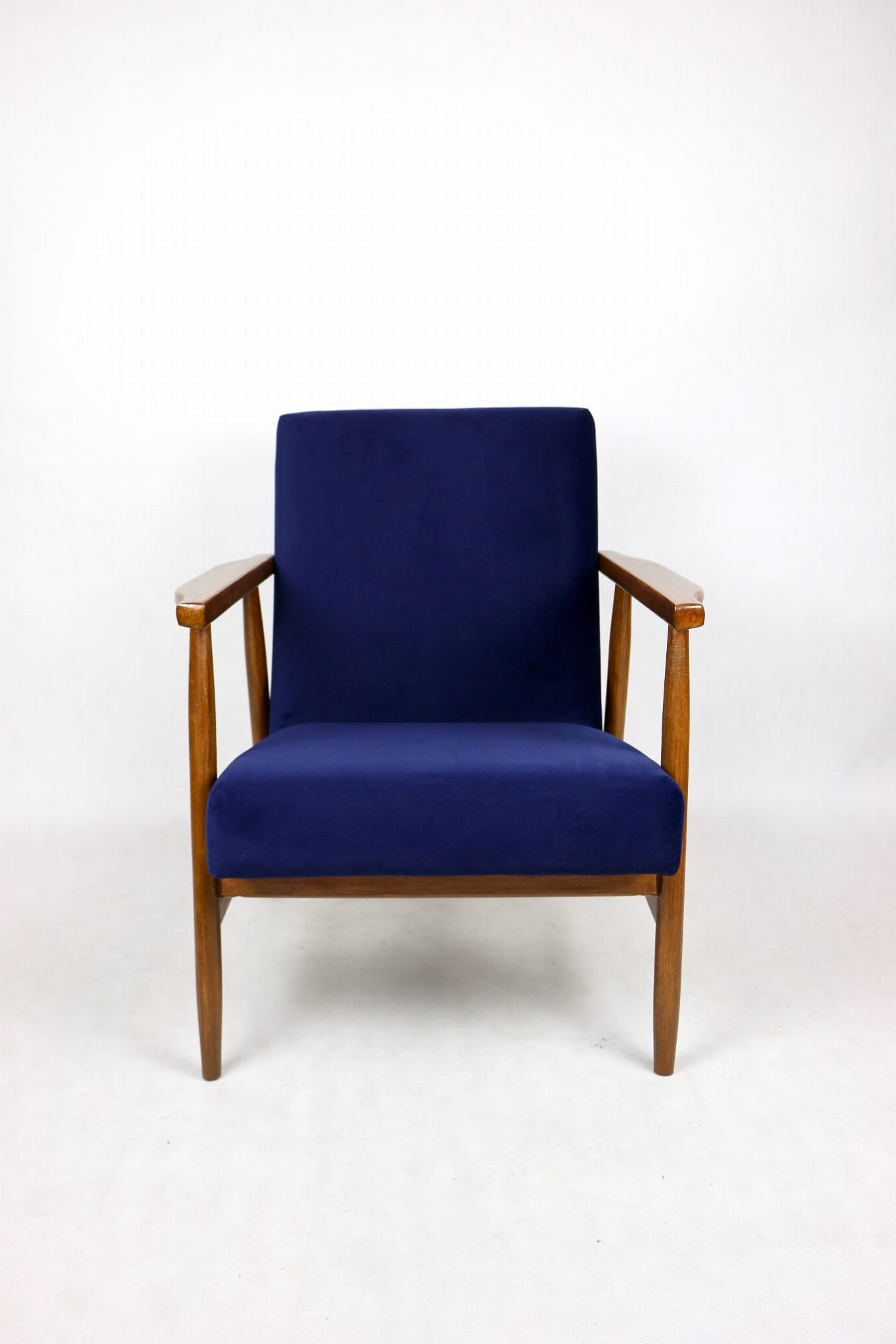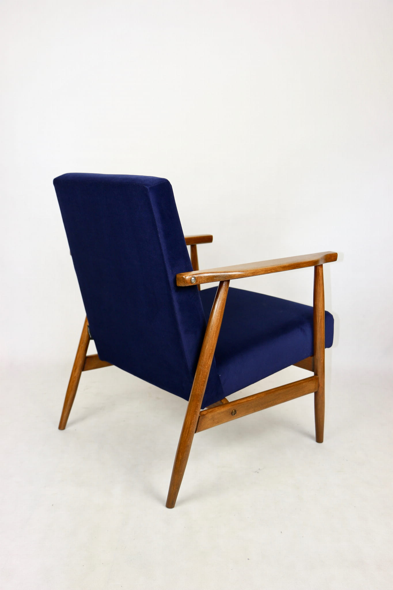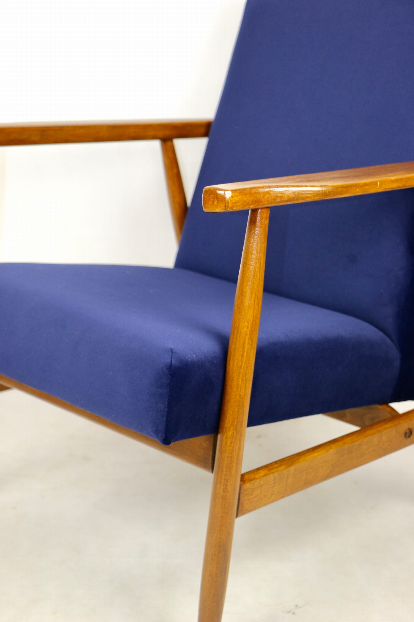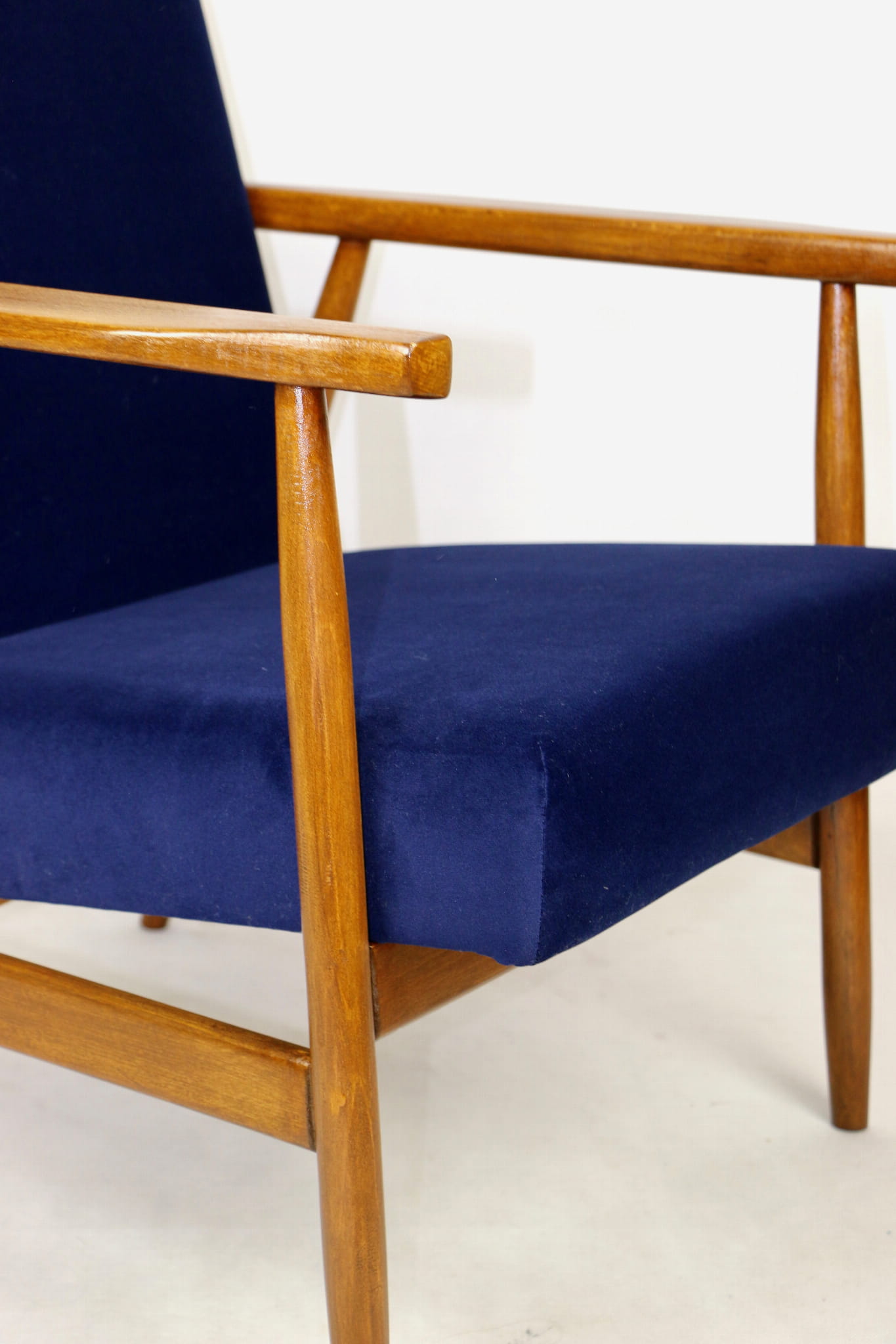 Fotel typu Lis został całkowicie odrestaurowany. Zyskał nowe, modne aksamitne obicie w kolorze niebieskim granatowym typu welwet z serii Jade - easy to clean. Stelaż drewniany połączony jest z podłokietnikami w ciemnej kolorystyce drewna.