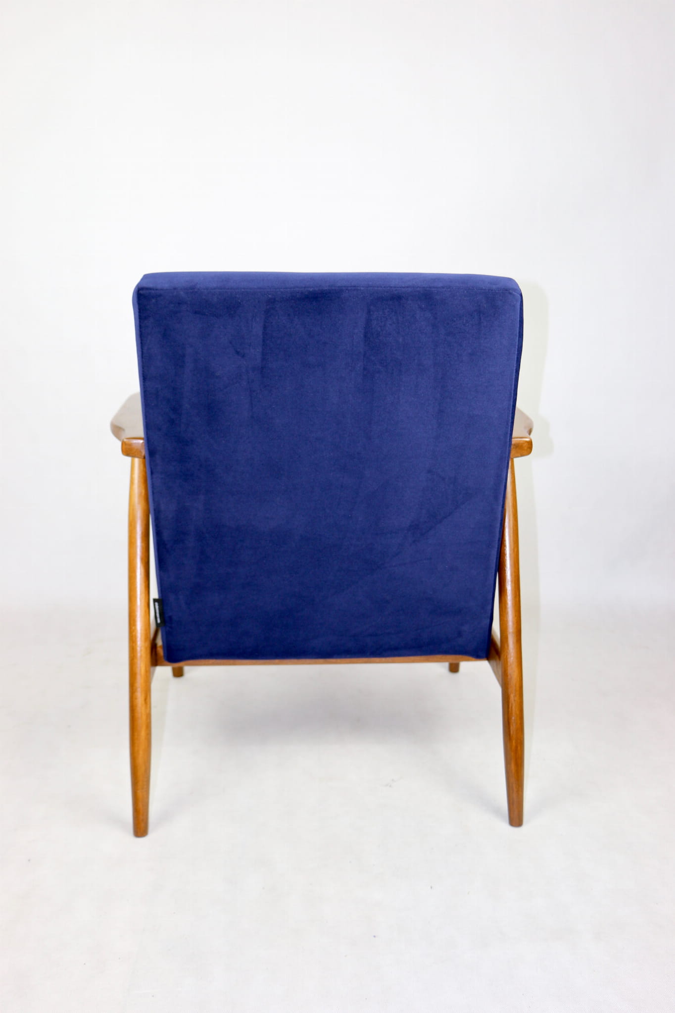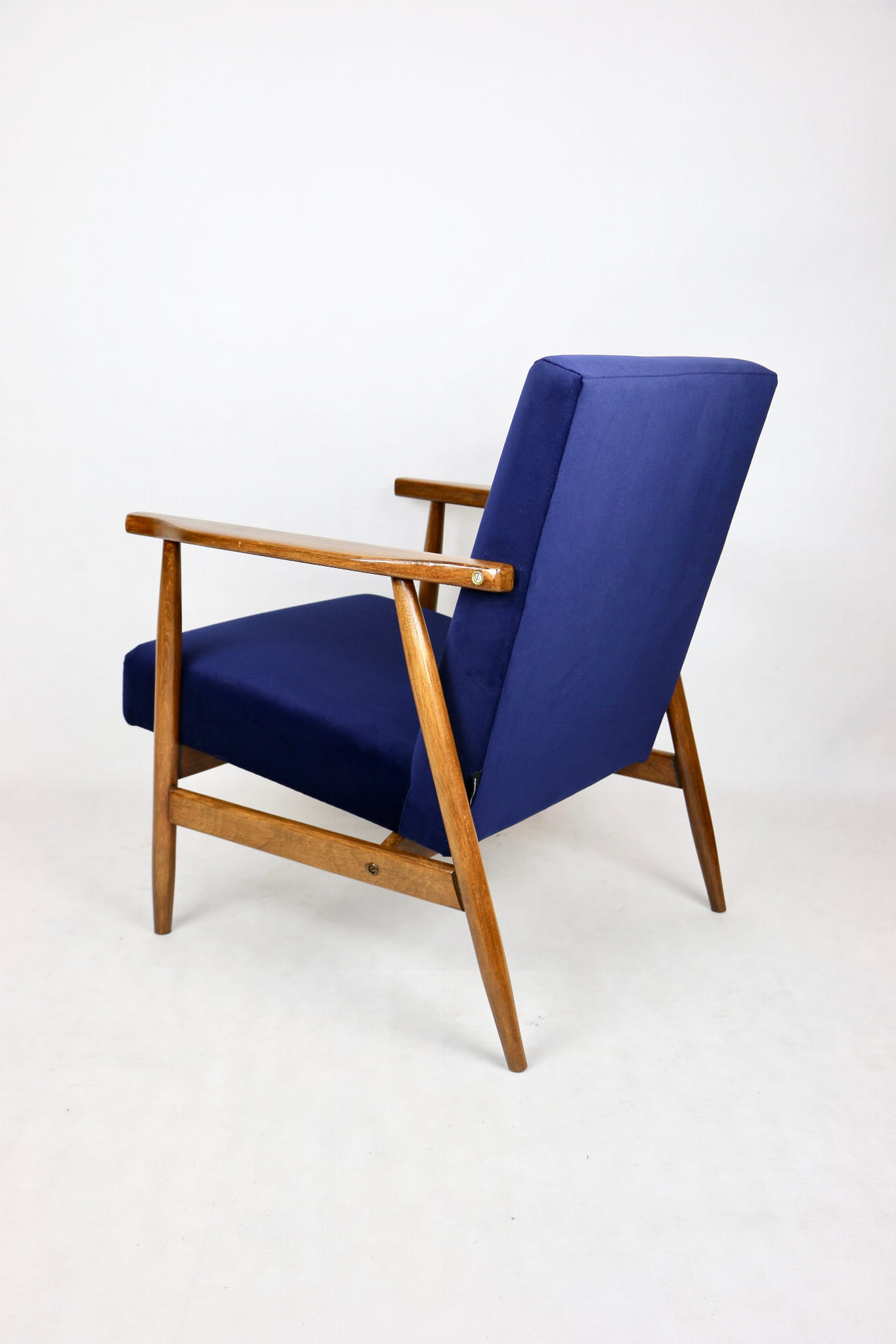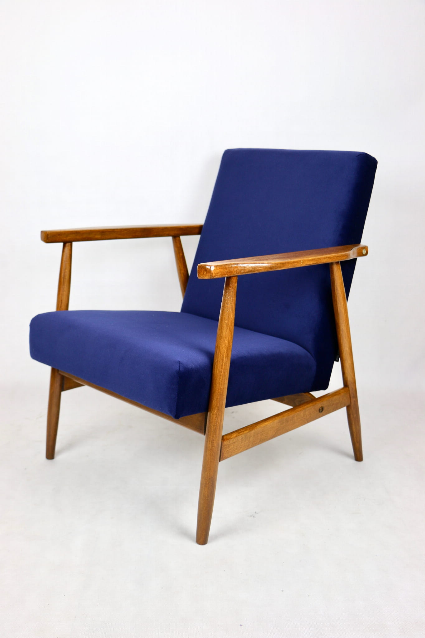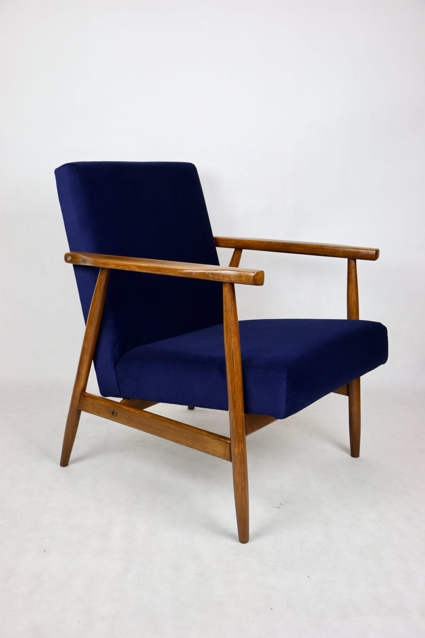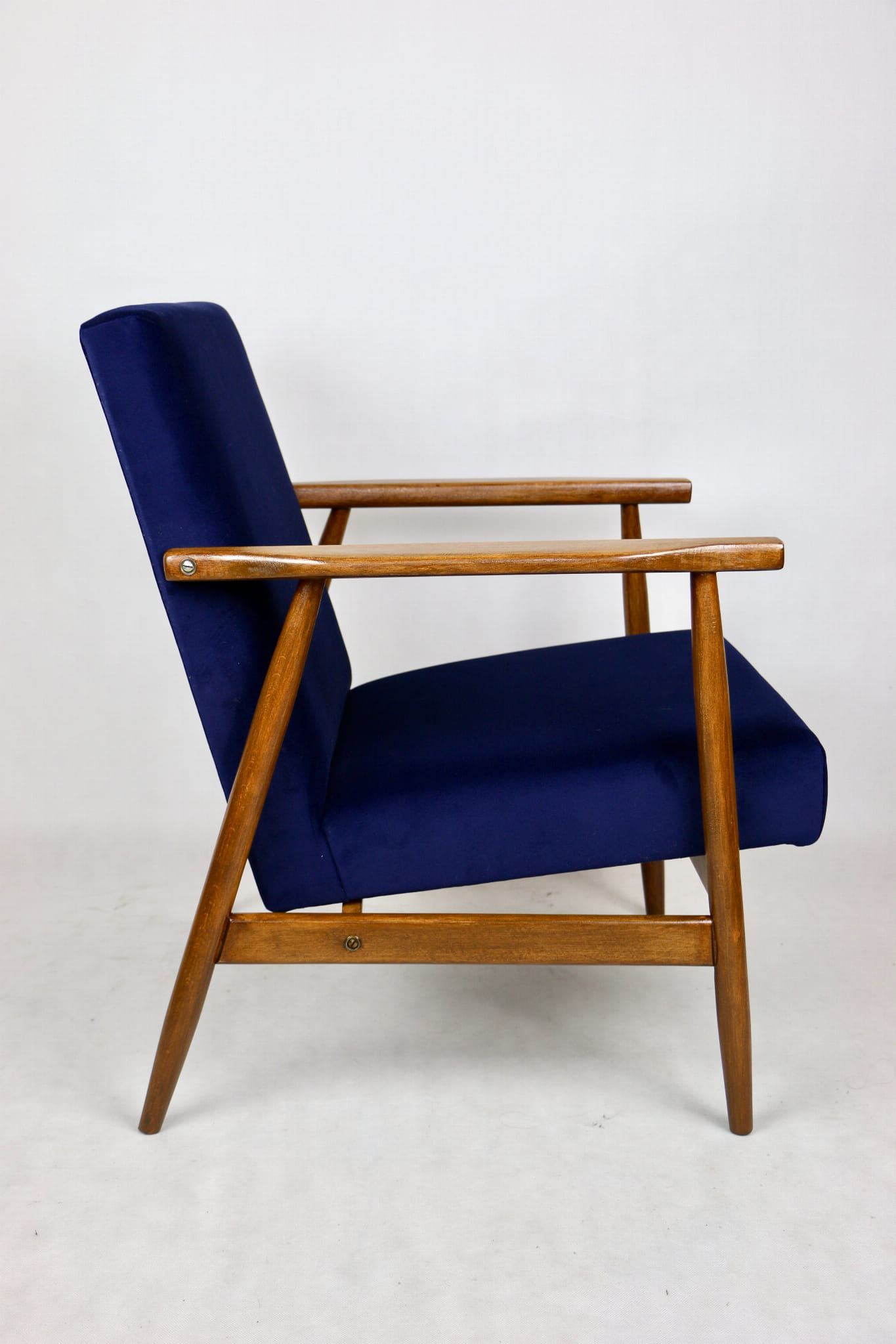Fotel typu Lis został całkowicie odrestaurowany. Zyskał nowe, modne aksamitne obicie w kolorze niebieskim granatowym typu welwet z serii Jade - easy to clean. Stelaż drewniany połączony jest z podłokietnikami w ciemnej kolorystyce drewna.