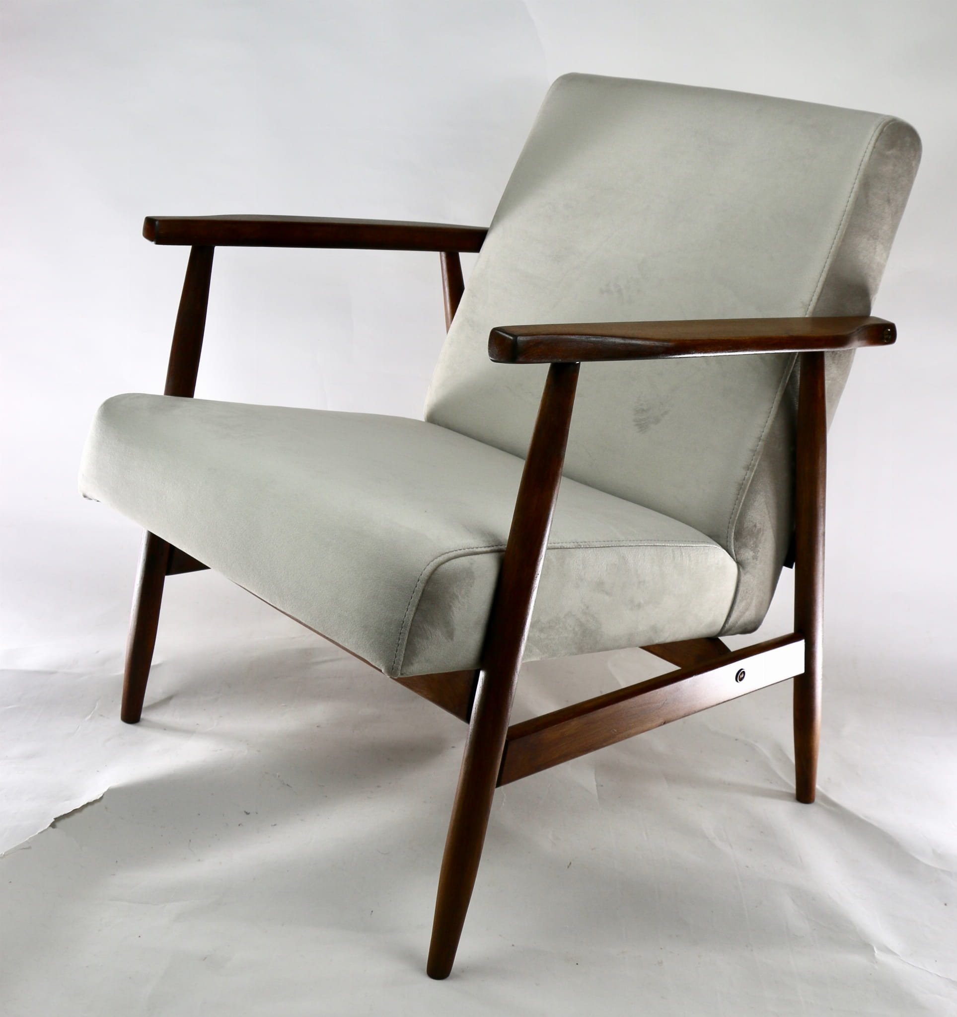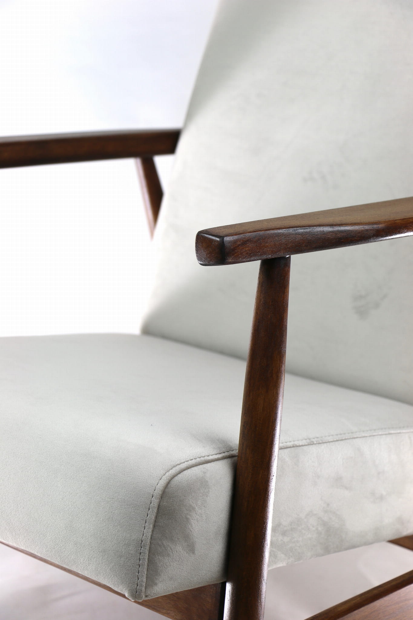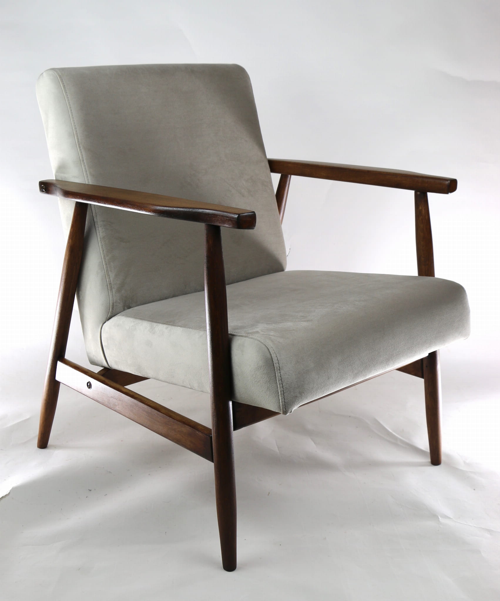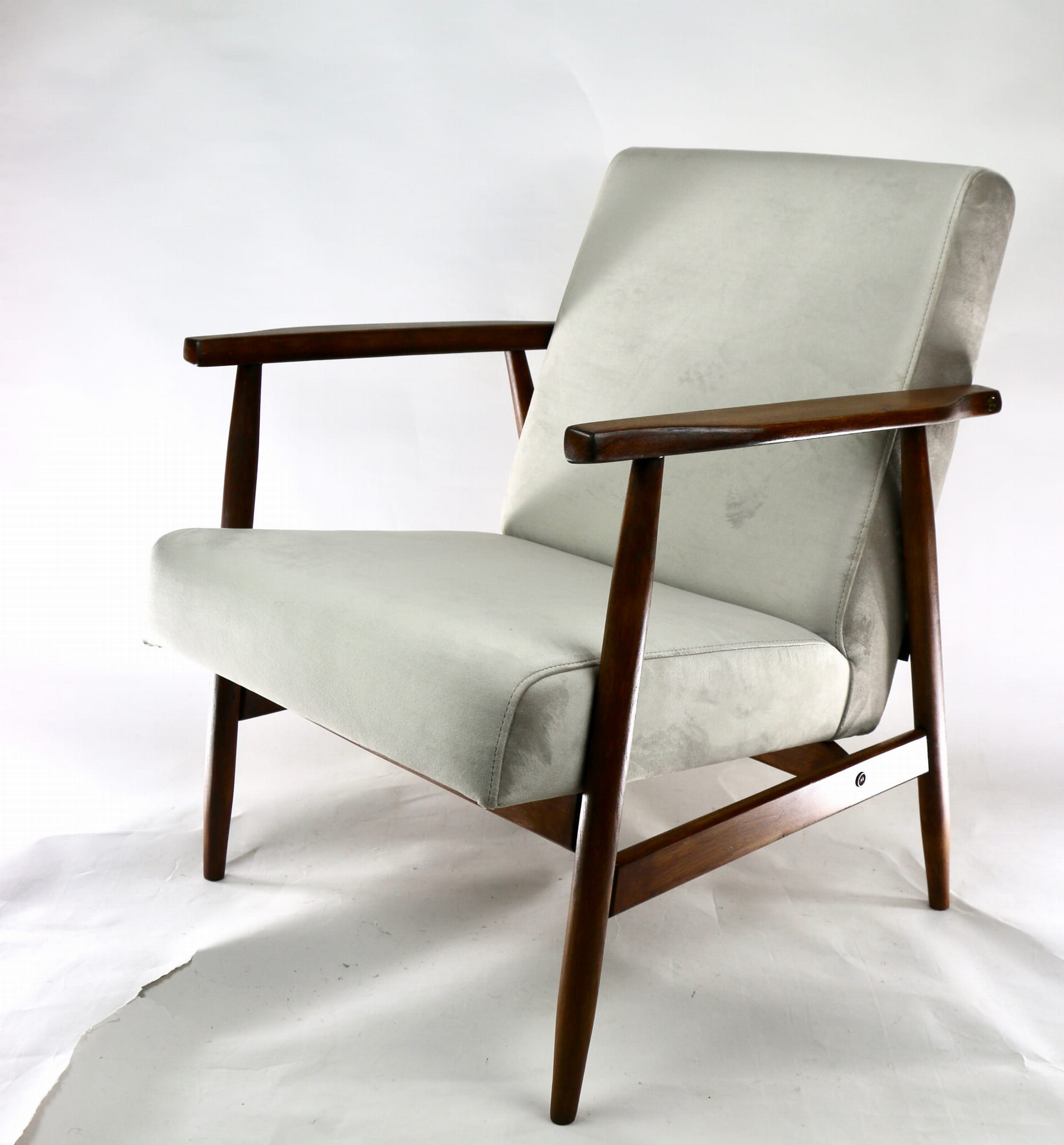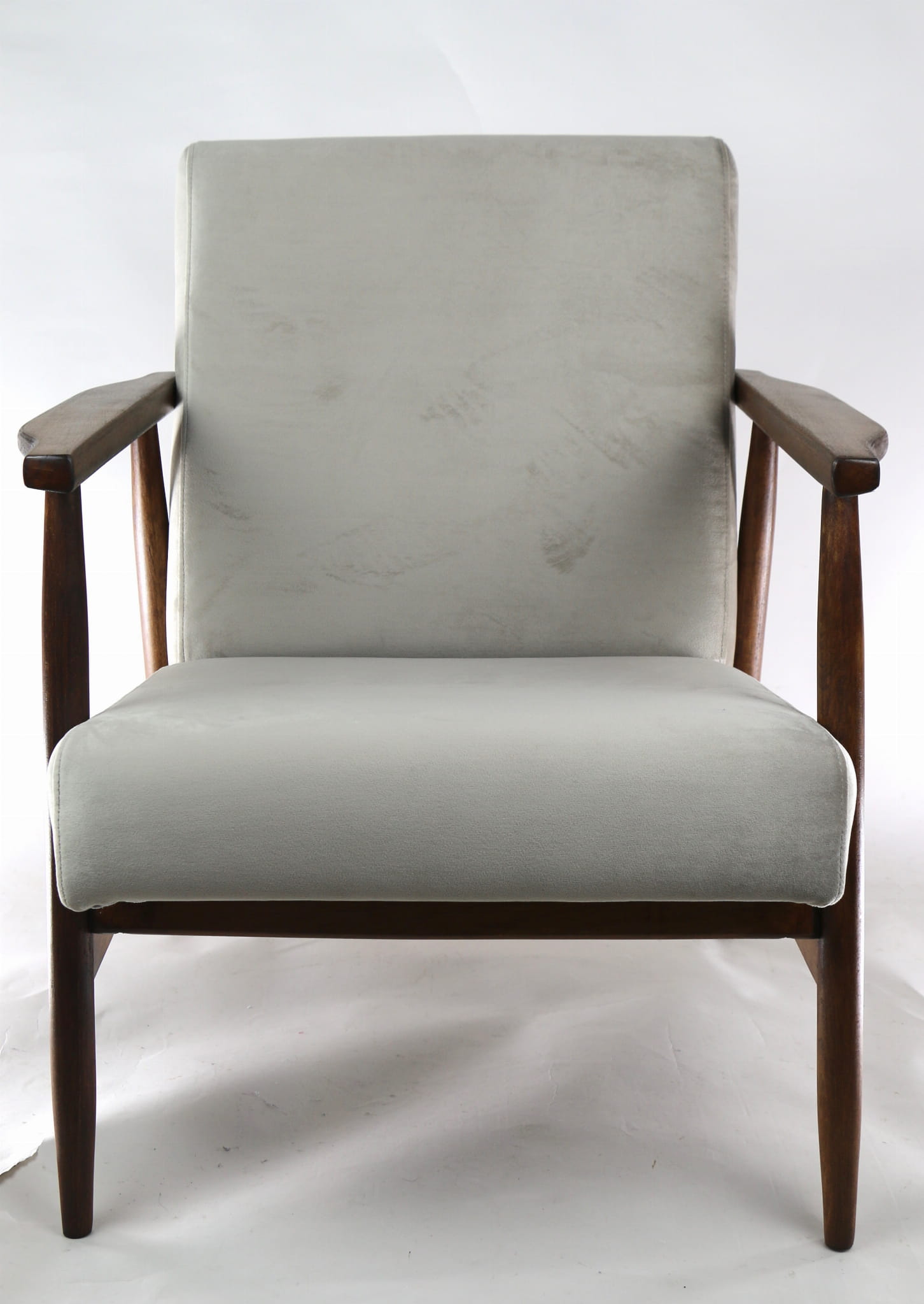 Fotel Vintage został całkowicie odrestaurowany. Zyskał nowe, modne aksamitne obicie w kolorze beżowym typu welwet. Stelaż drewniany połączony jest z podłokietnikami w ciemnej kolorystyce drewna.