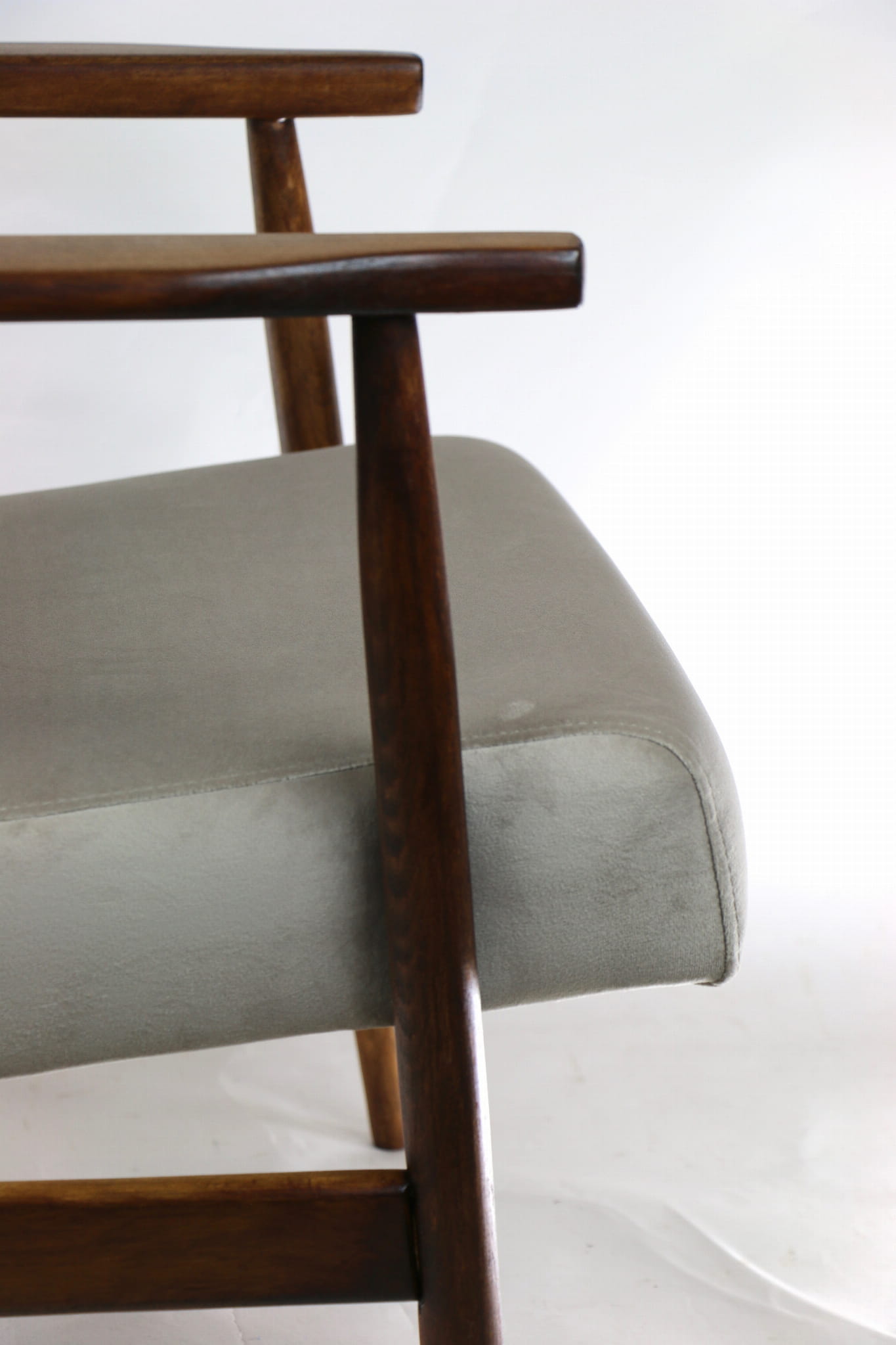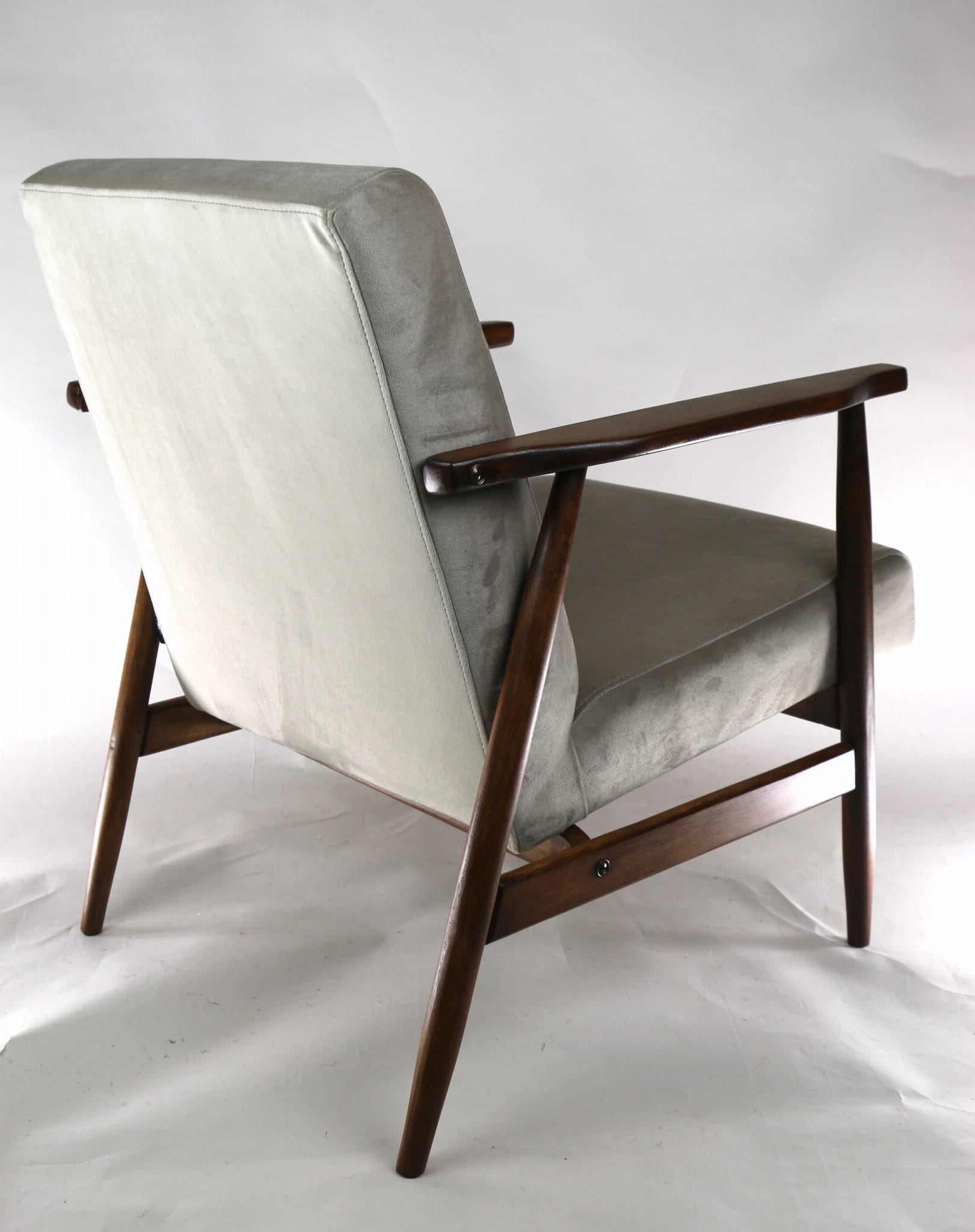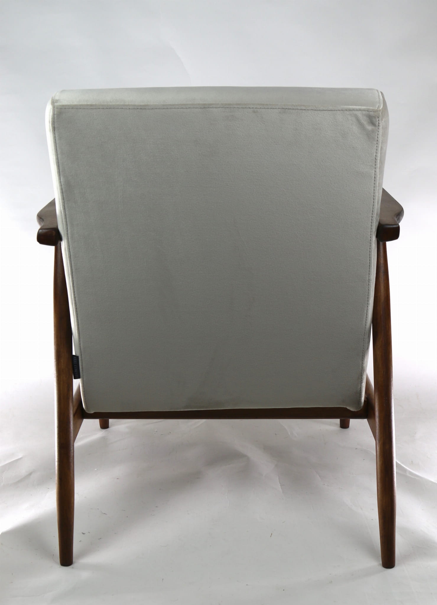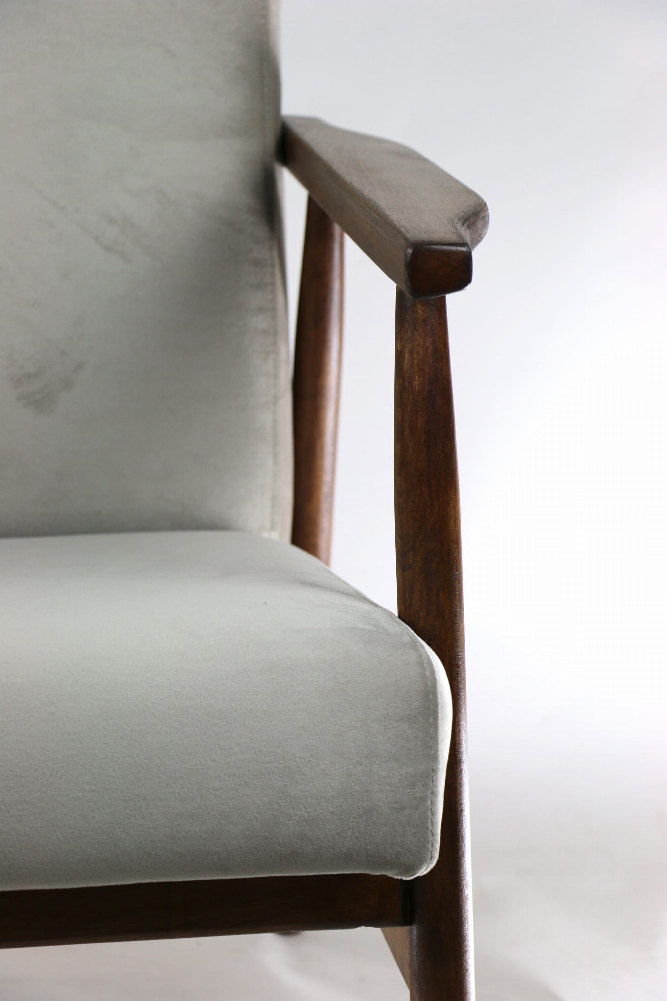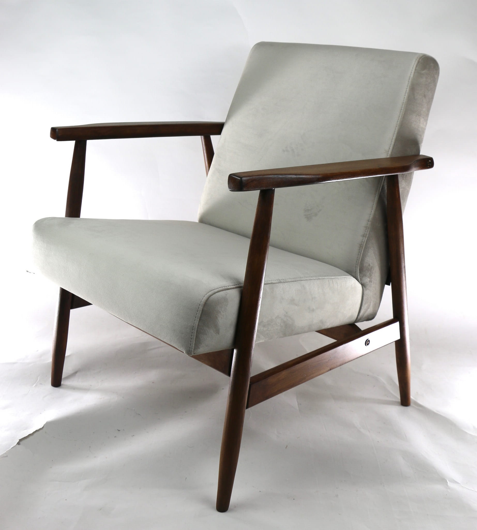 Fotel Vintage został całkowicie odrestaurowany. Zyskał nowe, modne aksamitne obicie w kolorze beżowym typu welwet. Stelaż drewniany połączony jest z podłokietnikami w ciemnej kolorystyce drewna.