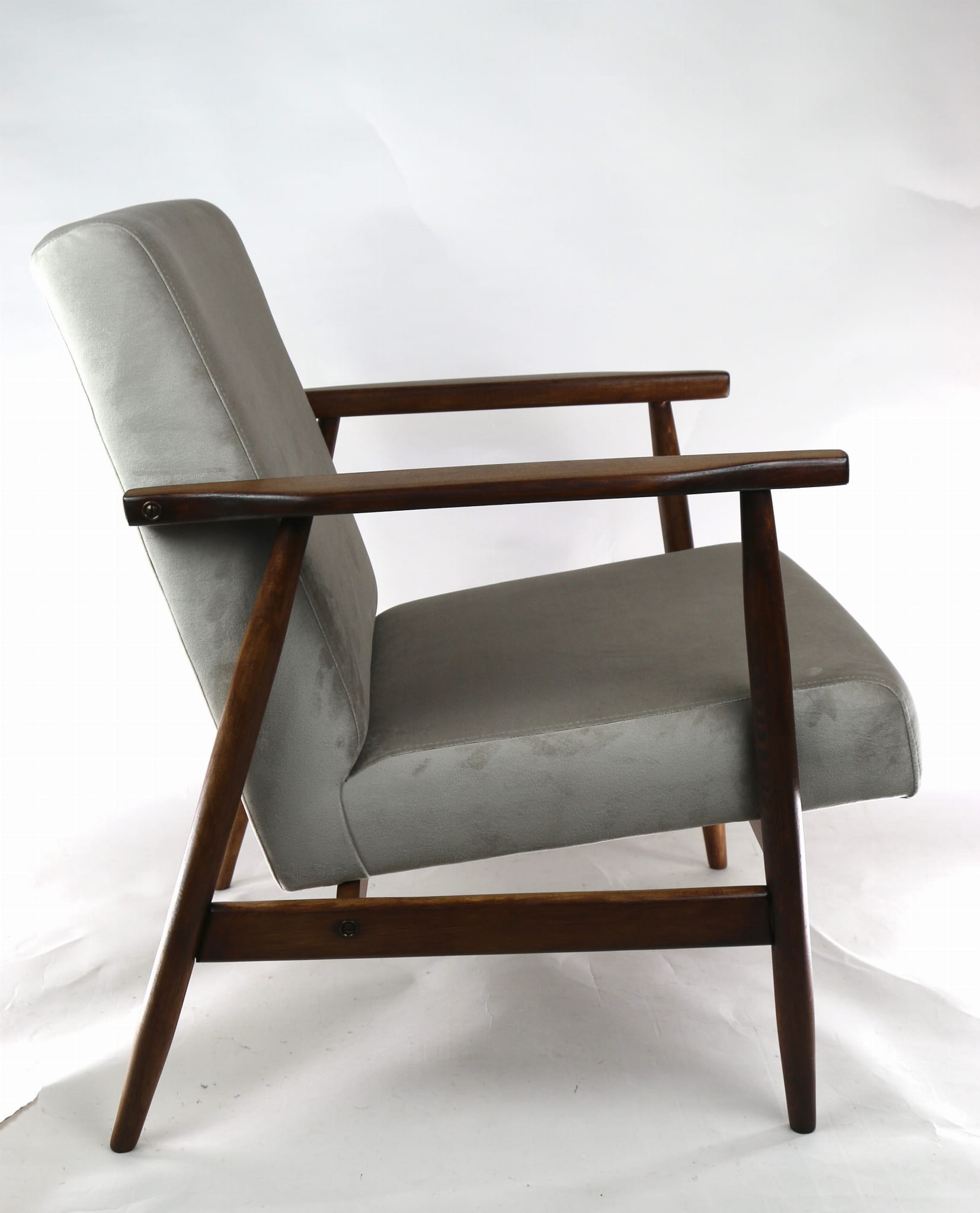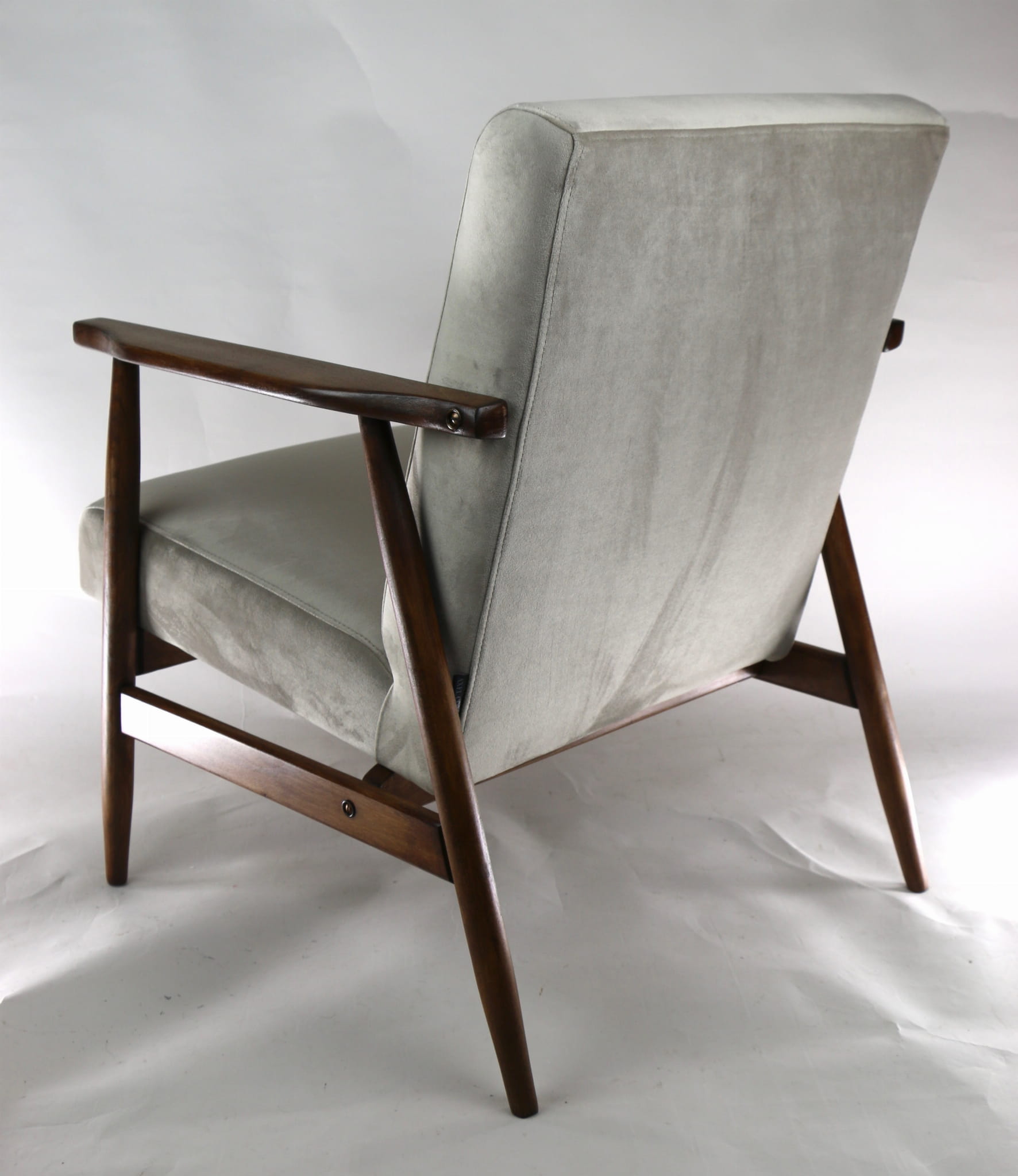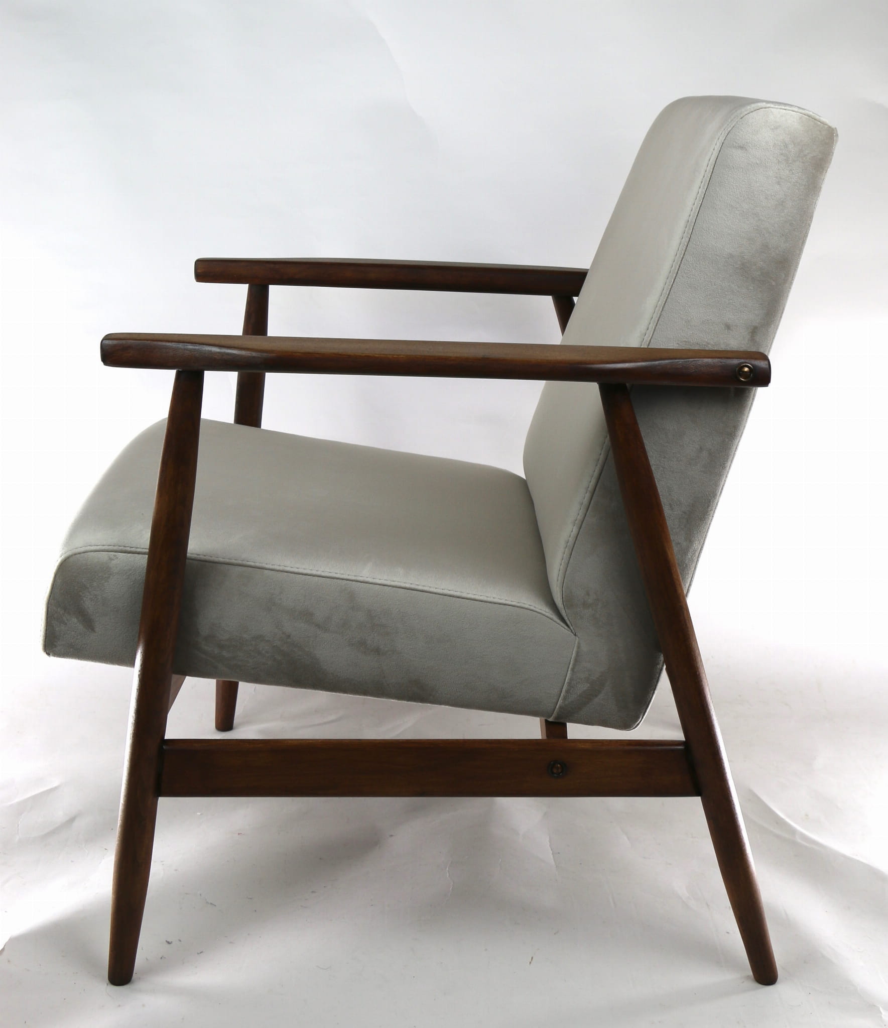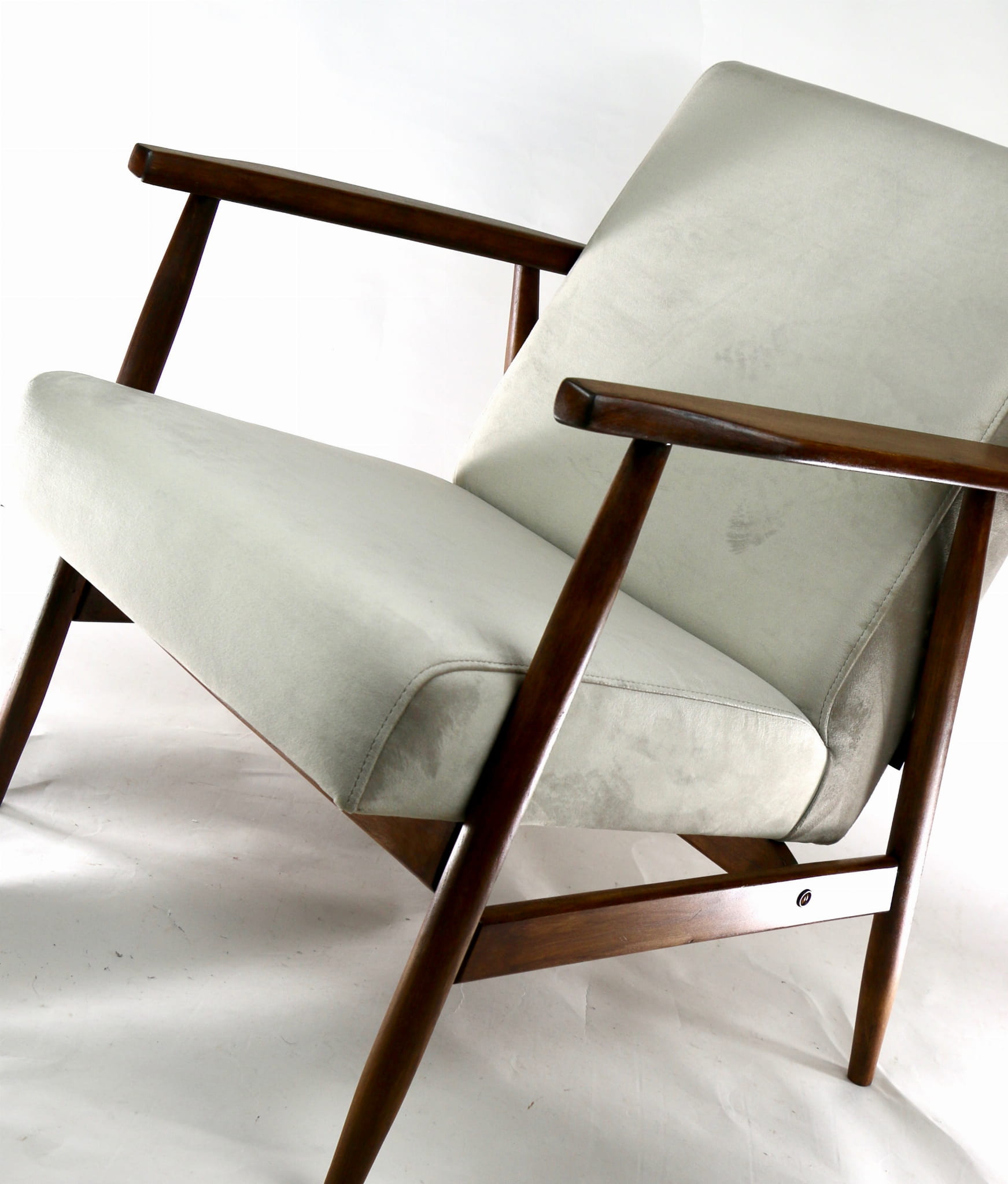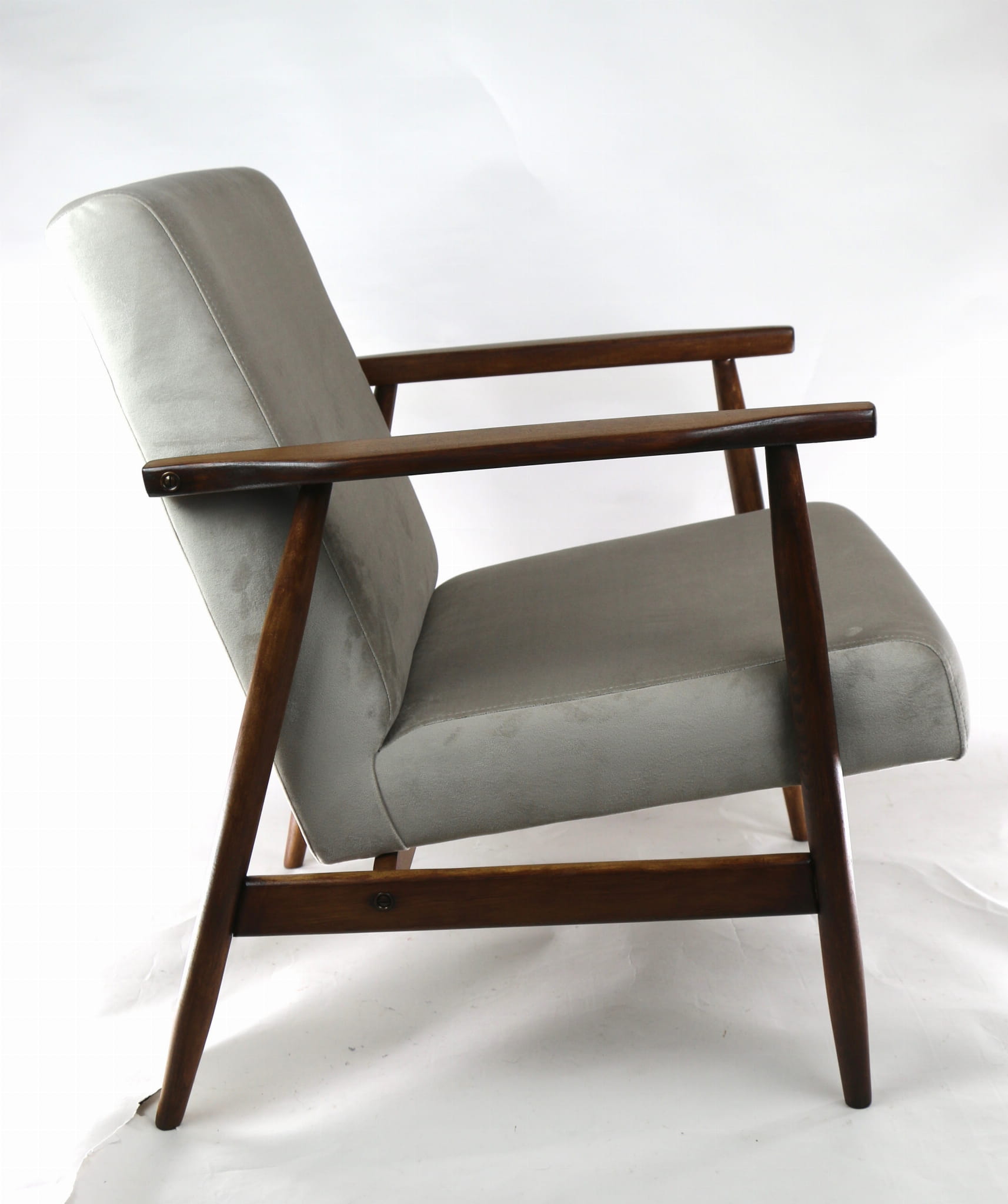 Fotel Vintage został całkowicie odrestaurowany. Zyskał nowe, modne aksamitne obicie w kolorze beżowym typu welwet. Stelaż drewniany połączony jest z podłokietnikami w ciemnej kolorystyce drewna.