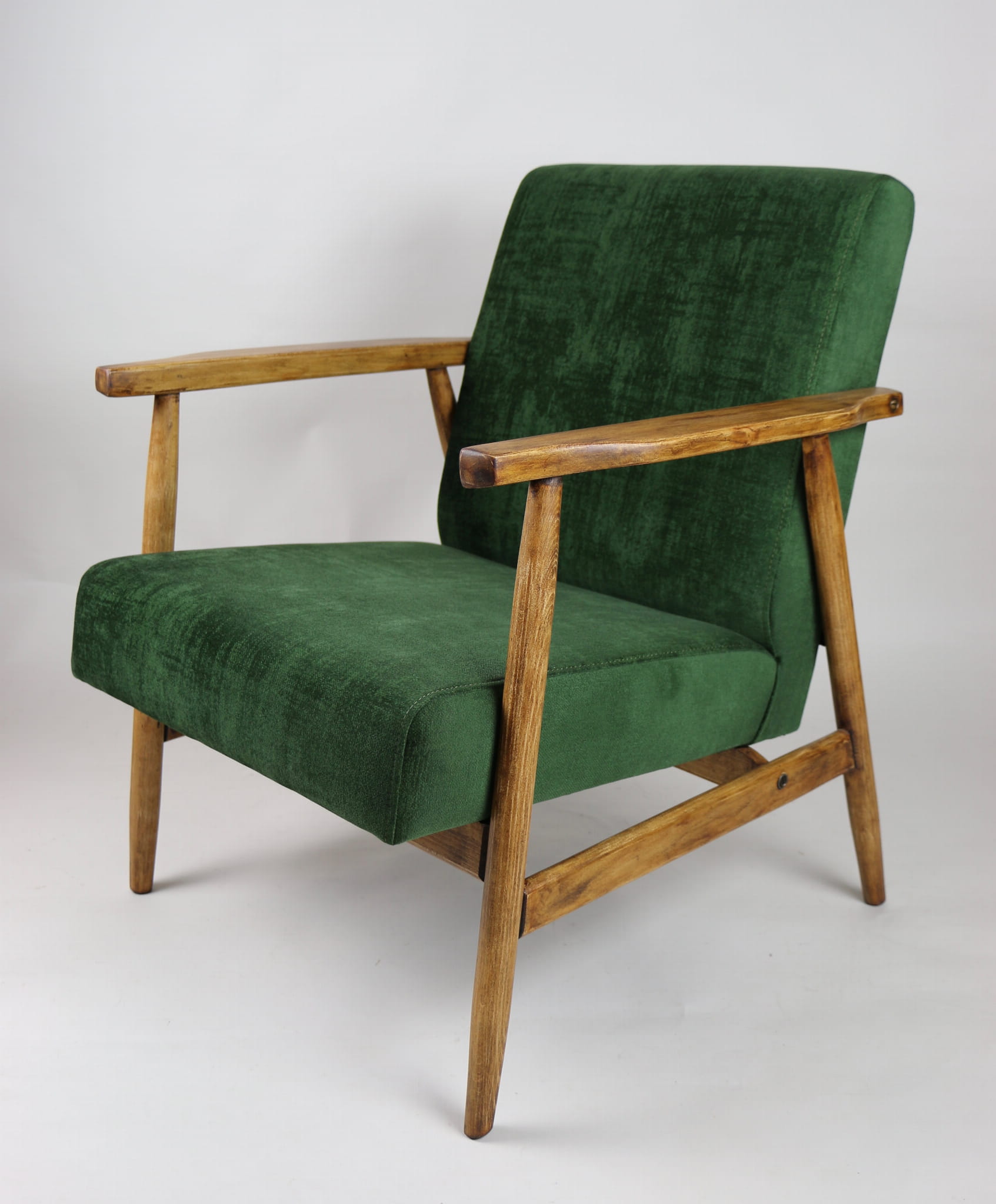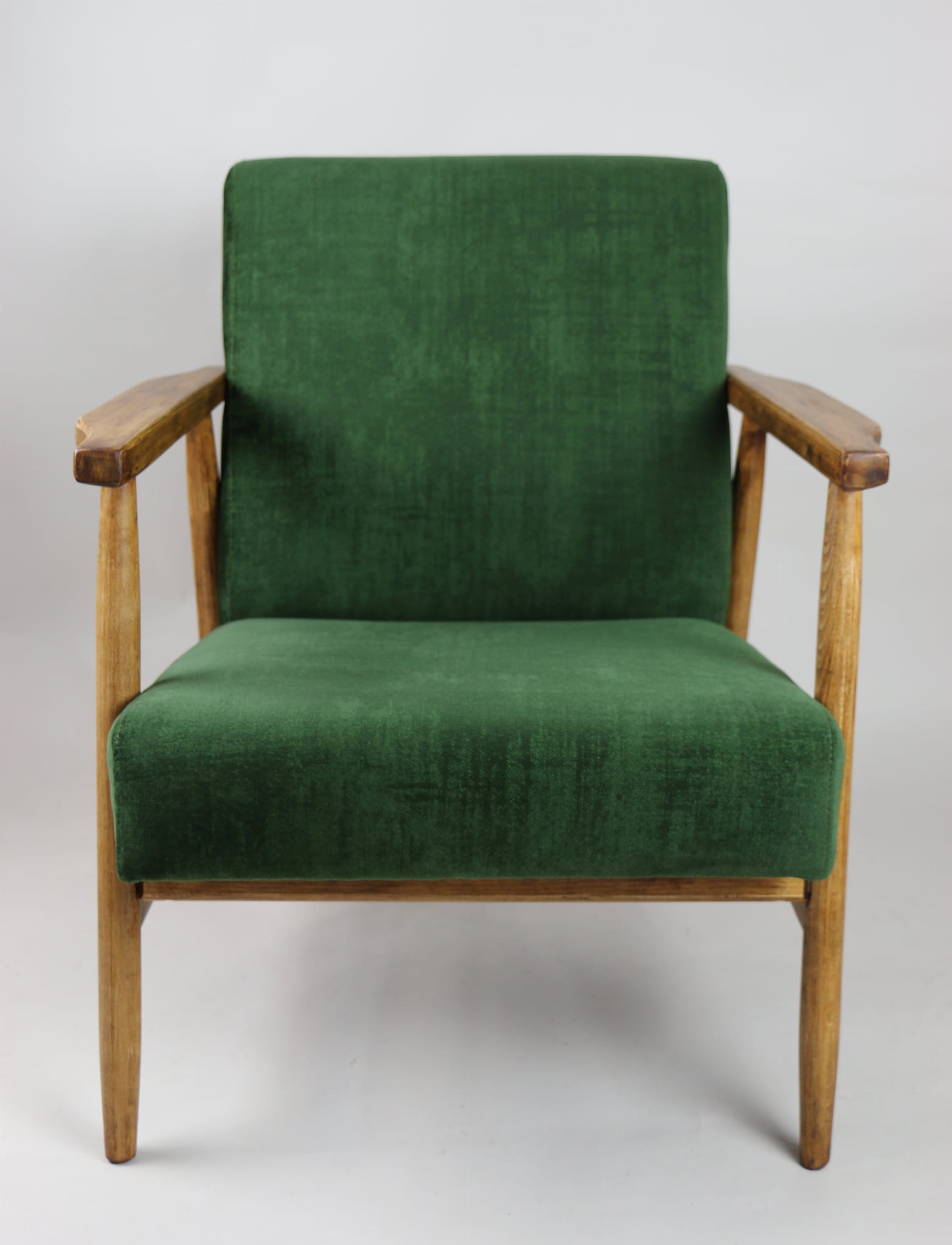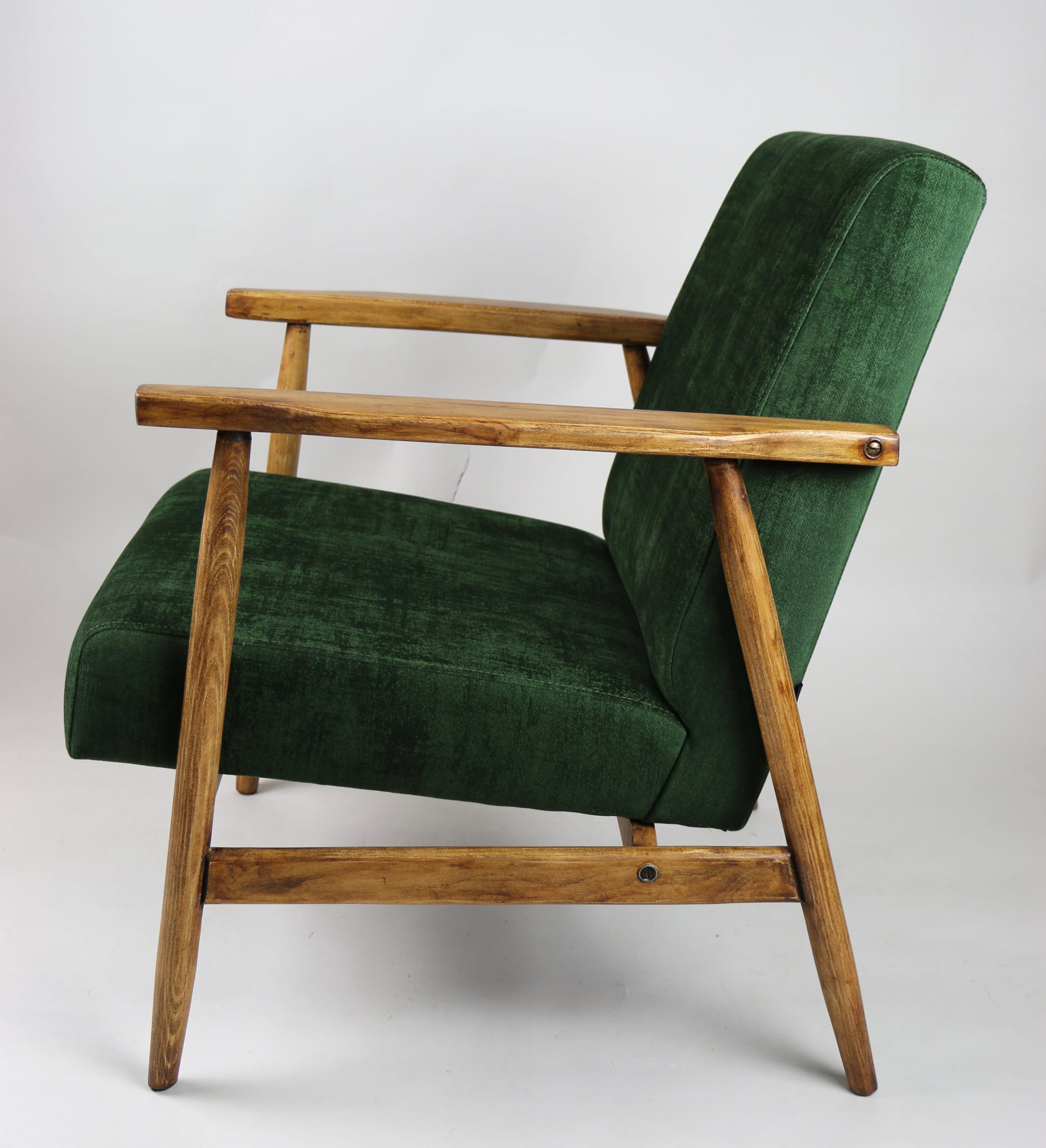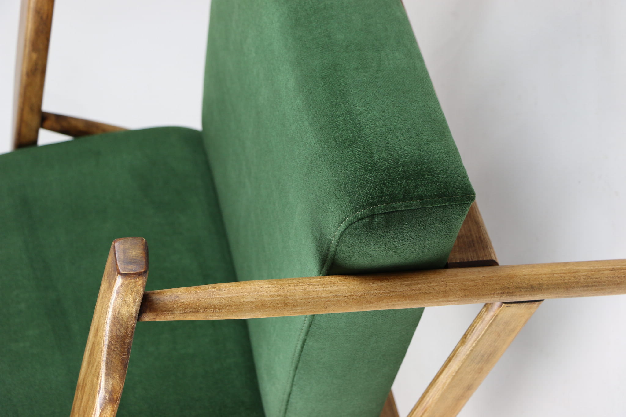 Fotel klasyczny typo śnieżnik został całkowicie odrestaurowany. Zyskał nowe, modne aksamitne obicie w kolorze zielonym z serii welwetów strukturalnych typu chameleon. Stelaż drewniany jest zawoskowany i połączony z podłokietnikami w jasnej kolorystyce drewna .
