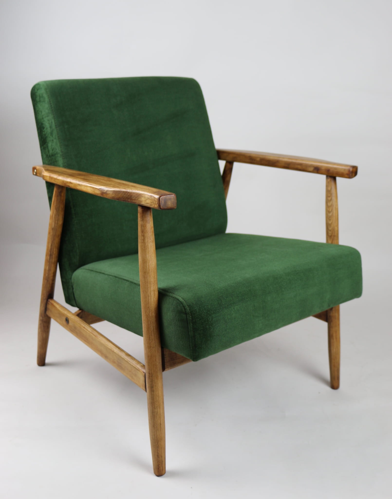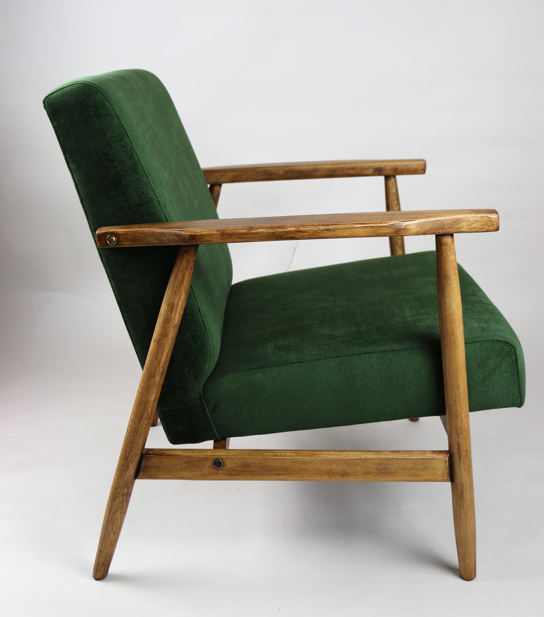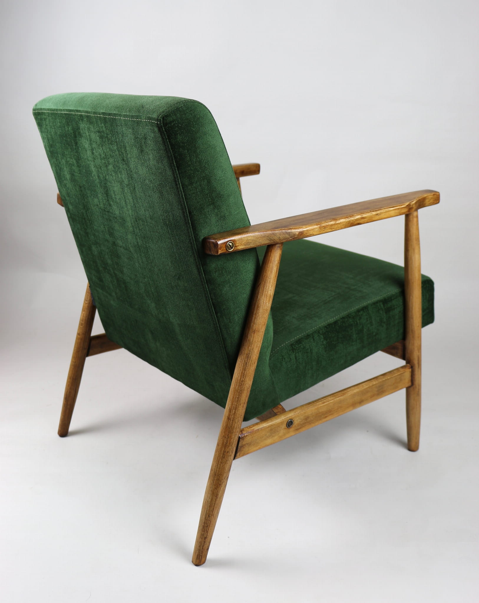 Fotel klasyczny typo śnieżnik został całkowicie odrestaurowany. Zyskał nowe, modne aksamitne obicie w kolorze zielonym z serii welwetów strukturalnych typu chameleon. Stelaż drewniany jest zawoskowany i połączony z podłokietnikami w jasnej kolorystyce drewna .