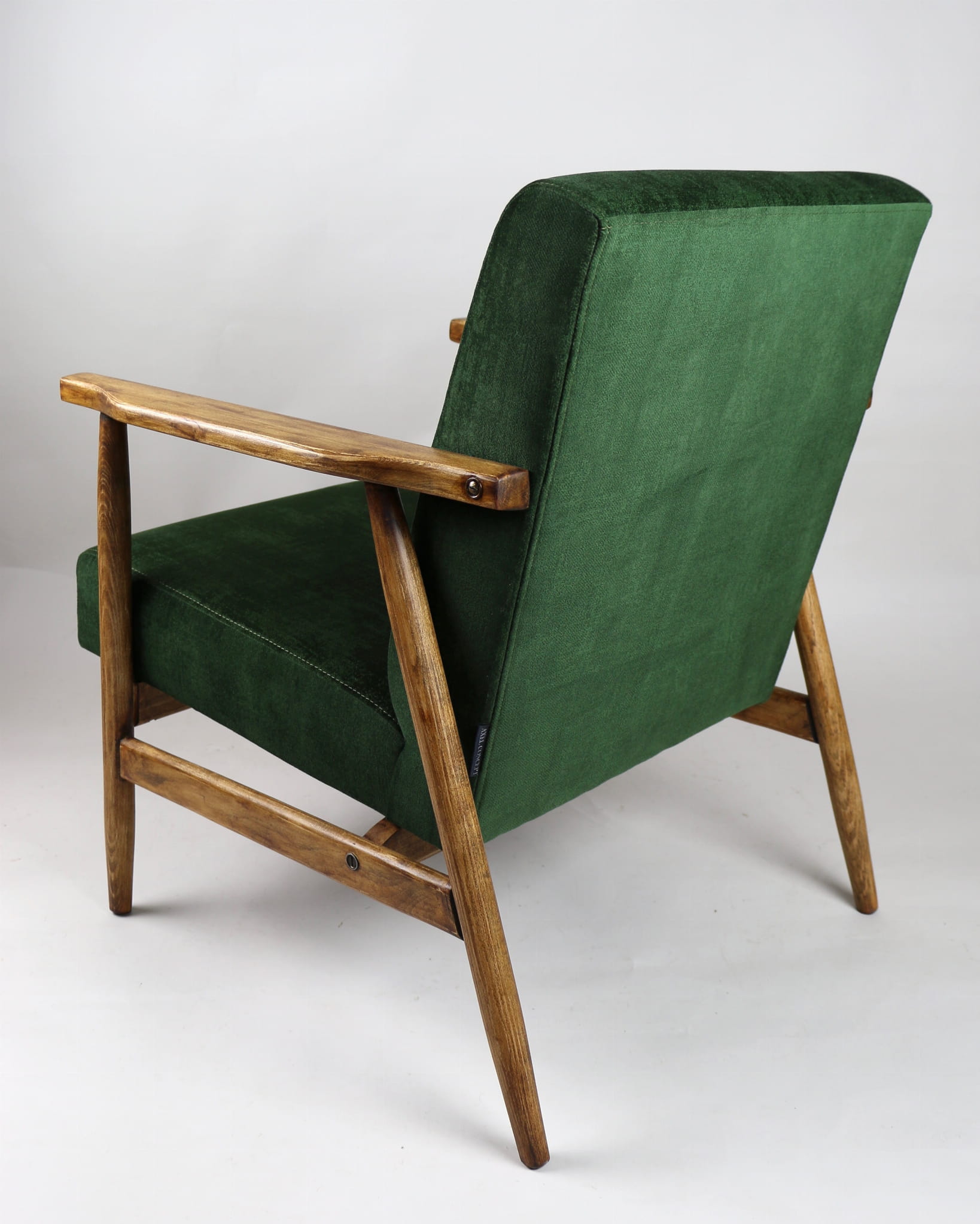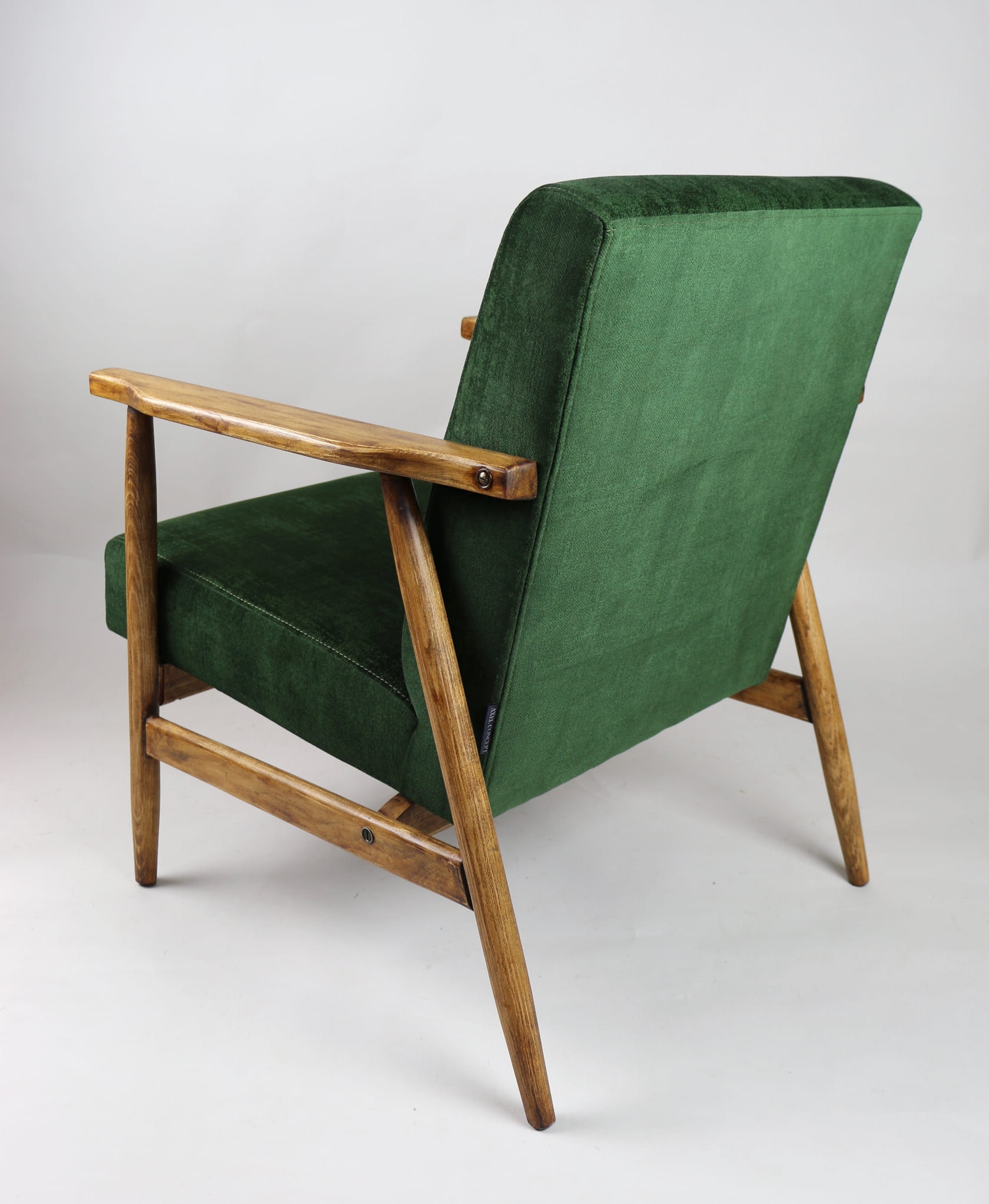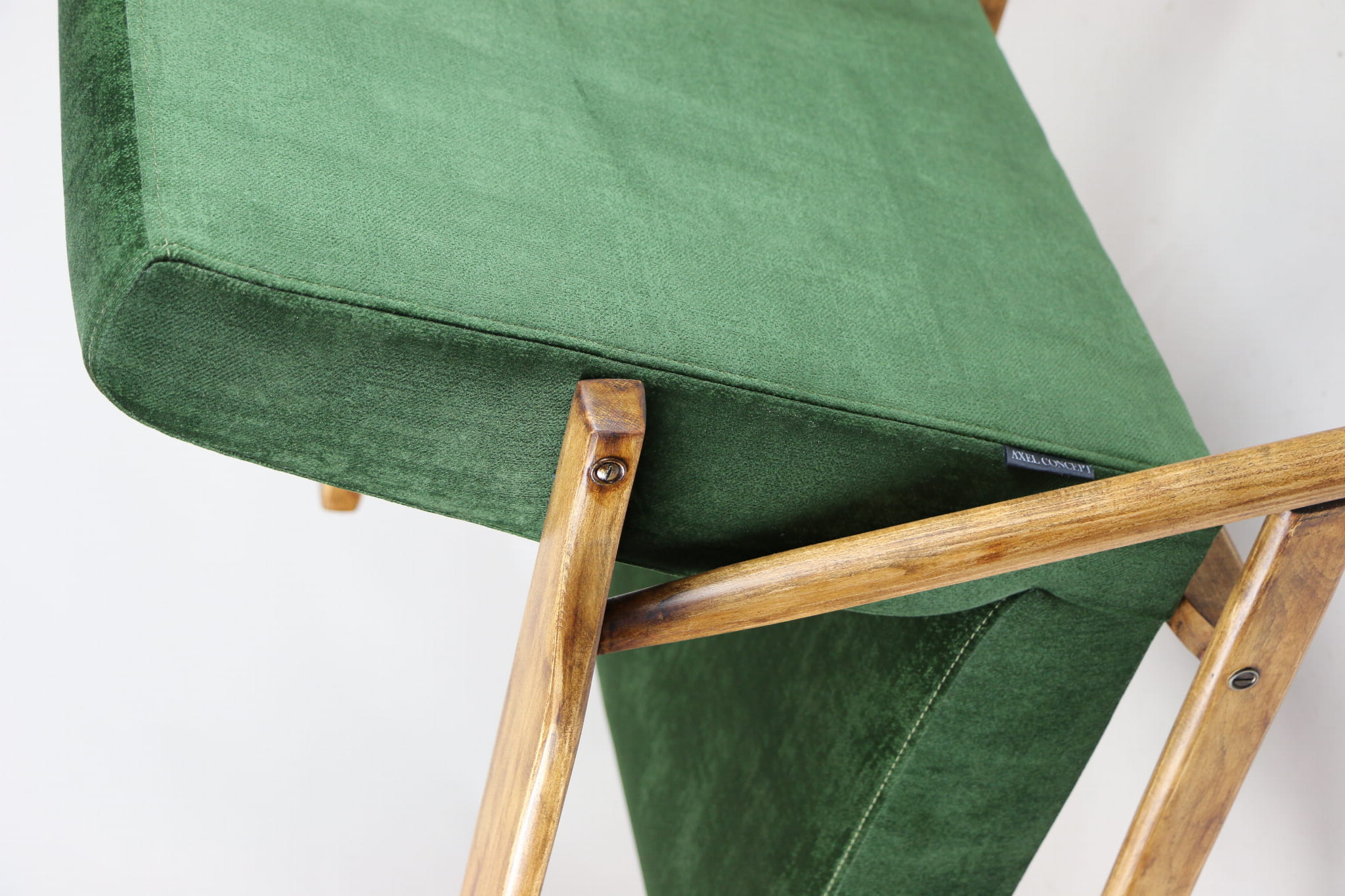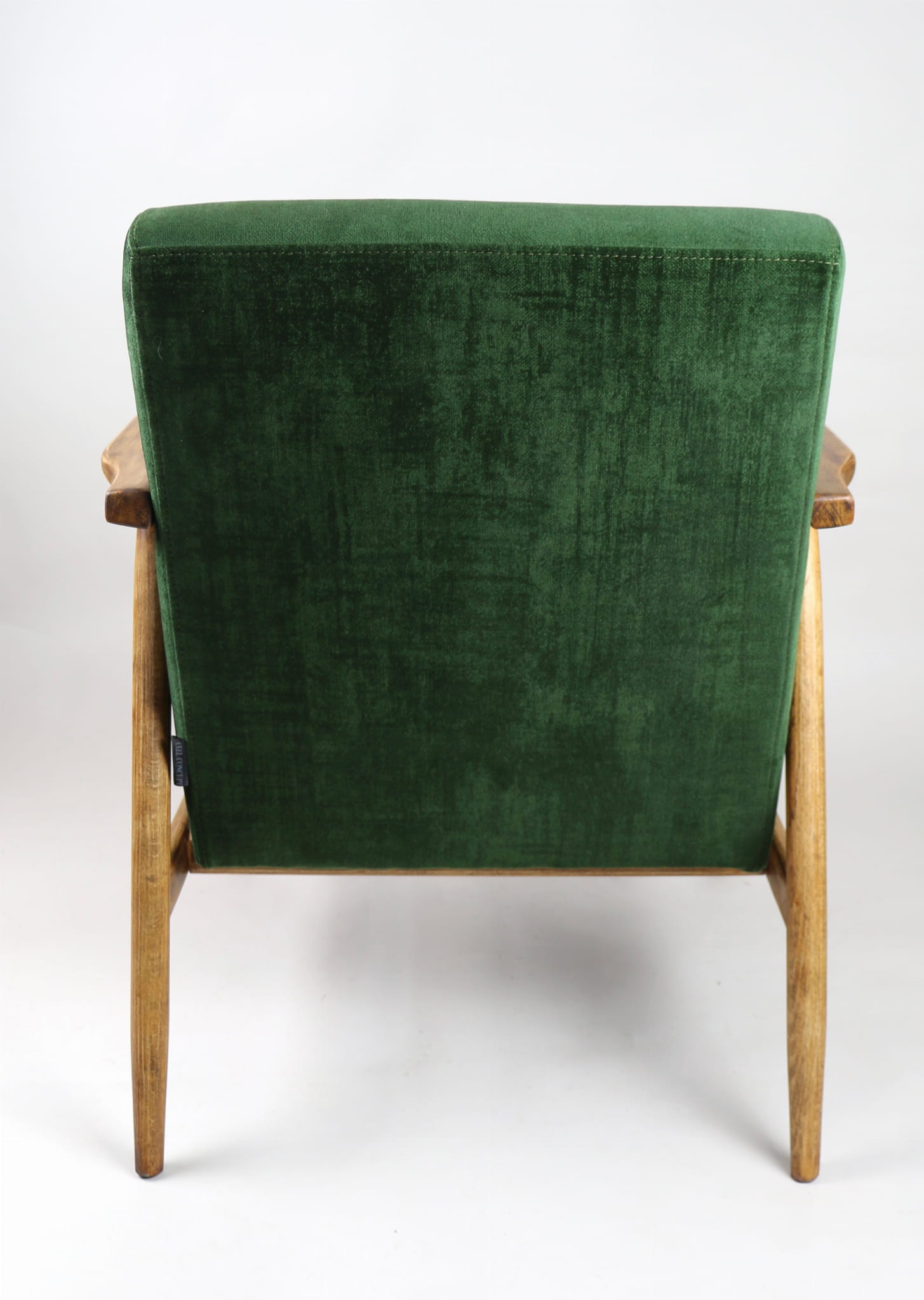 Fotel klasyczny typo śnieżnik został całkowicie odrestaurowany. Zyskał nowe, modne aksamitne obicie w kolorze zielonym z serii welwetów strukturalnych typu chameleon. Stelaż drewniany jest zawoskowany i połączony z podłokietnikami w jasnej kolorystyce drewna .